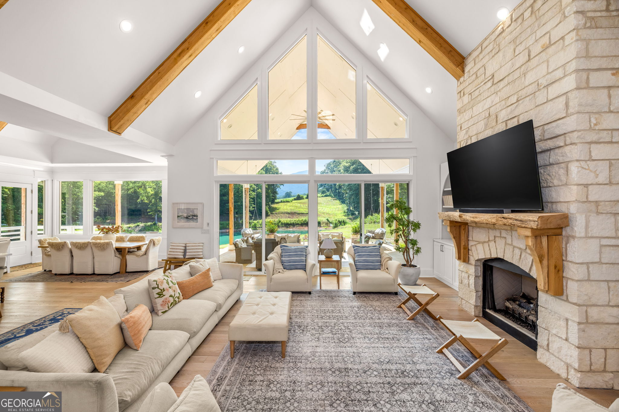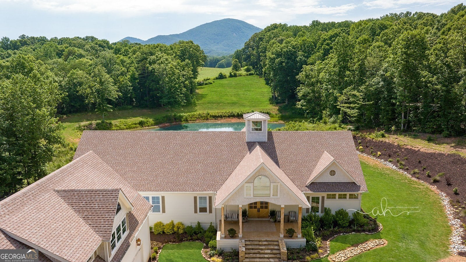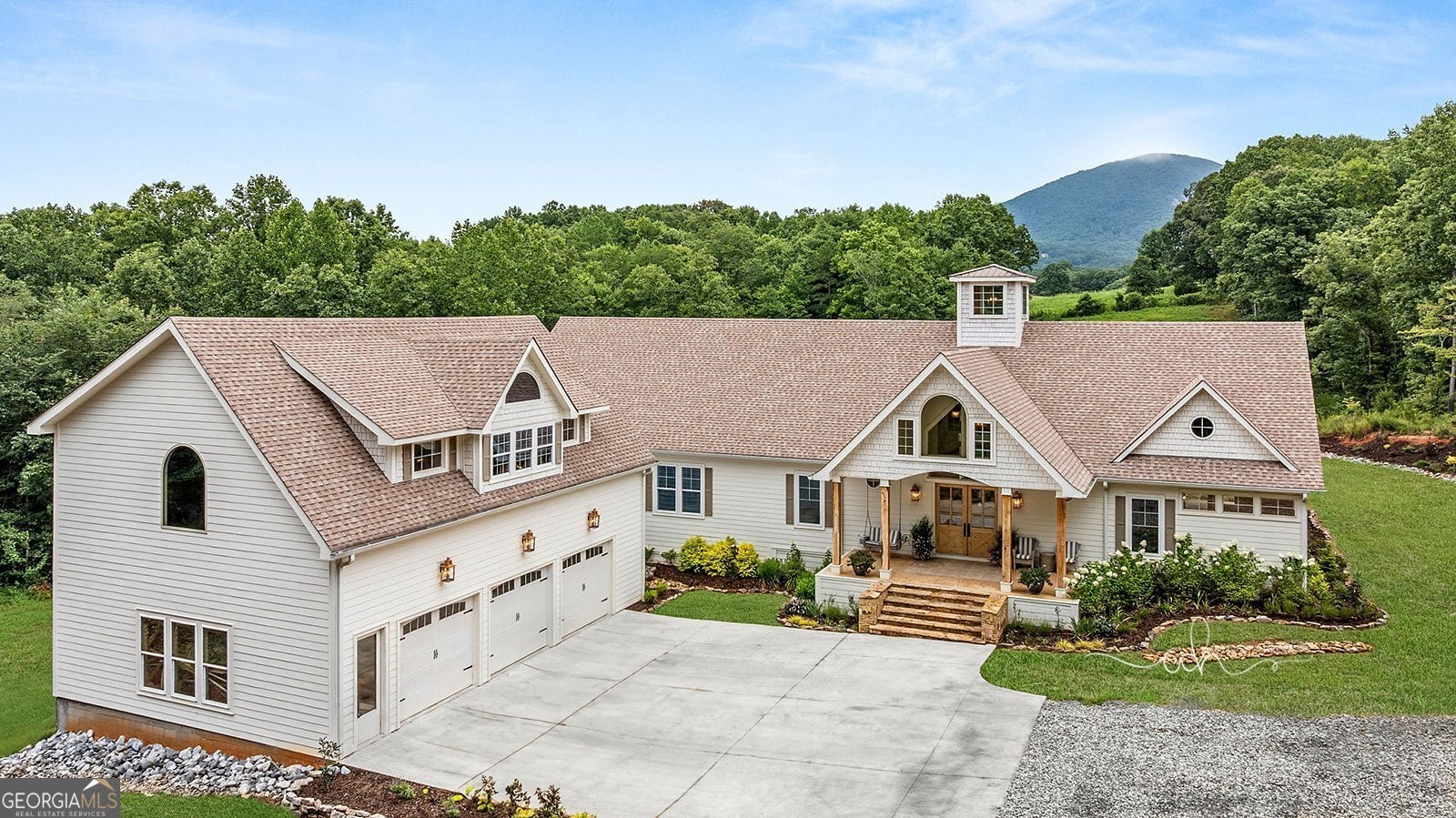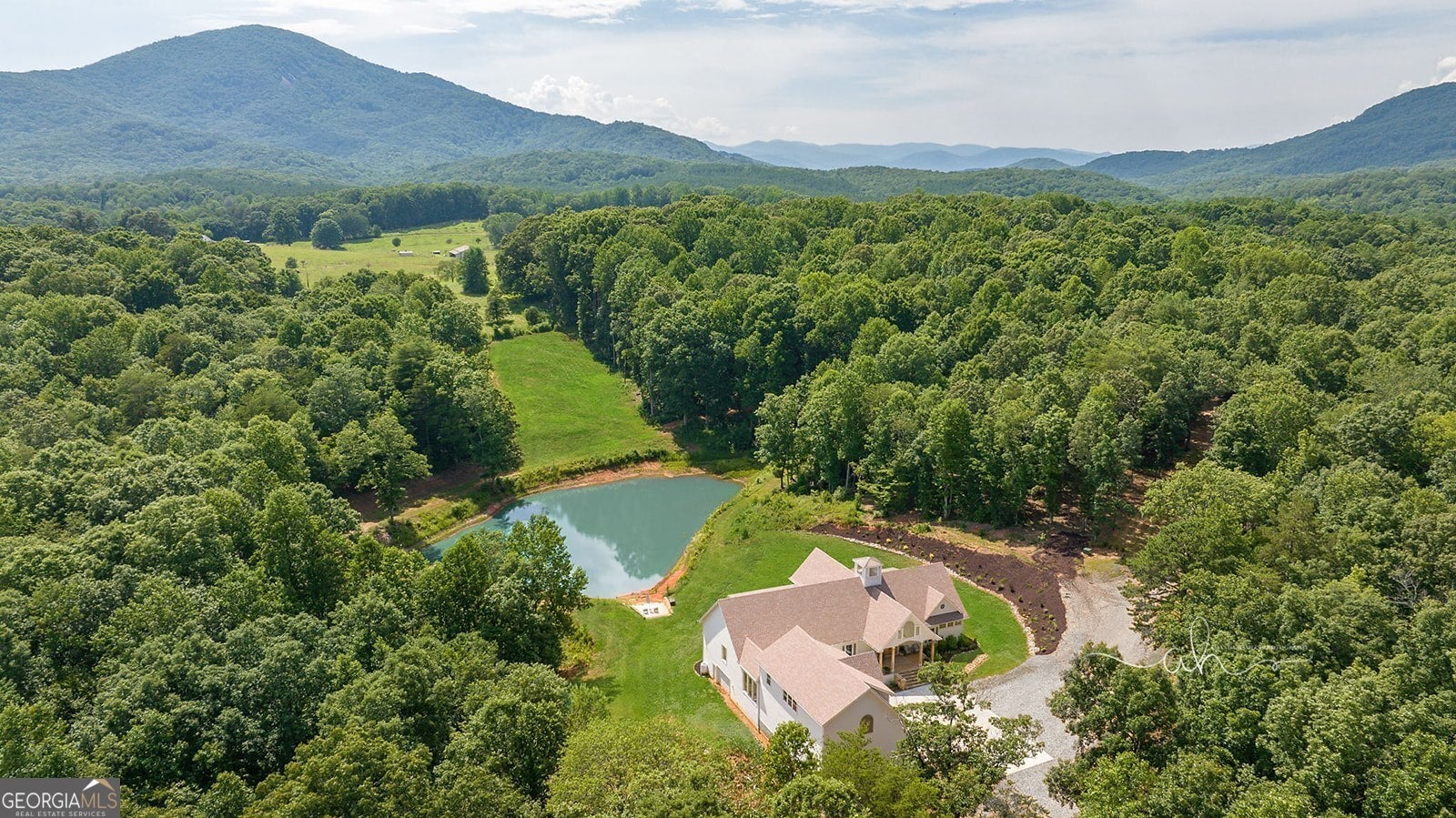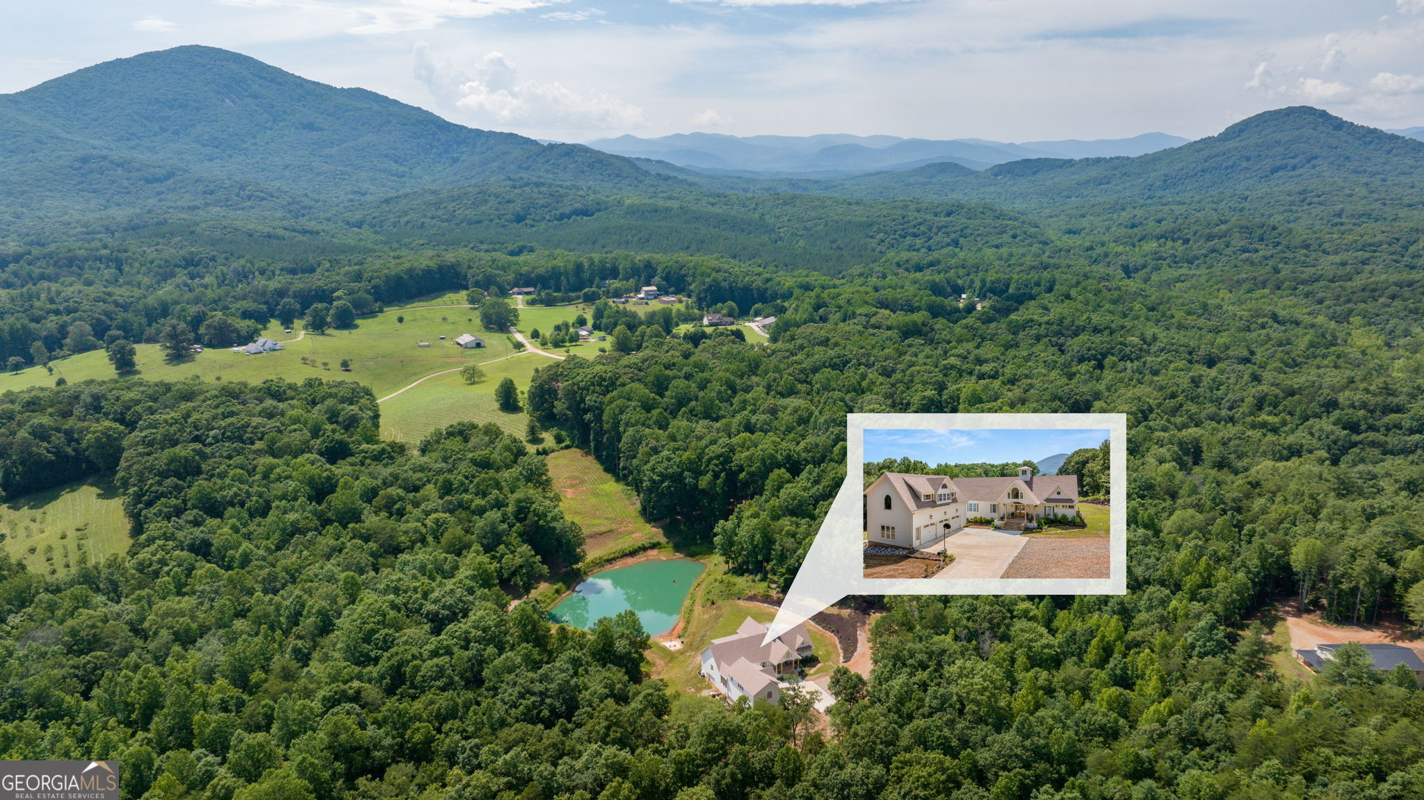 Discover a masterpiece of modern craftsmanship and natural splendor. Perched on 13.21 serene acres, this 2022 custom-built estate offers an experience of refined mountain living with staggering, uninterrupted views of Mt. Yonah from nearly every room. This is not just a home; it is a destination. Step inside to a sprawling single-level layout of 3,708 sqft, where a true open-concept design is taken to new heights. Soaring vaulted ceilings, accented by magnificent white oak beams milled from trees on the estate itself, draw the eye upward. Ten-foot ceilings and eight-foot doors create a sense of grandeur, while a real, functional cupola bathes the great room in glorious natural light. Two stately Texas limestone fireplaces provide a warm and inviting ambiance for quiet evenings or grand-scale entertaining. The luxurious primary suite is a private retreat, offering generous space, comfort, and a spa-like bath designed for ultimate relaxation. Every bedroom, along with the gourmet kitchen and main living area, is perfectly positioned to capture the majestic mountain vistas. A dedicated office provides a tranquil workspace, while the oversized laundry room adds everyday convenience. The expansive covered back porch is the perfect setting to savor your morning coffee or host gatherings against a spectacular natural backdrop. The grounds are a private paradise. Explore your own wooded walking trails, cast a line in the stocked pond, or simply relax to the soothing sounds of a year-round creek. For the hobbyist or collector, the attached 1,400 sqft 3-car garage features a vaulted bonus room with plumbing already in place for a future bathroom, offering limitless potential. An immense 24x36 crawl space with both walk-through and garage-door access provides unparalleled storage solutions. Experience absolute seclusion while remaining conveniently located just 10 minutes from the charms of Helen, Cleveland, and Clarkesville, and a mere 40 minutes from Gainesville. This property represents a rare and remarkable opportunity to own a piece of North Georgia's finest scenery, where luxury design and the tranquility of nature exist in perfect harmony.