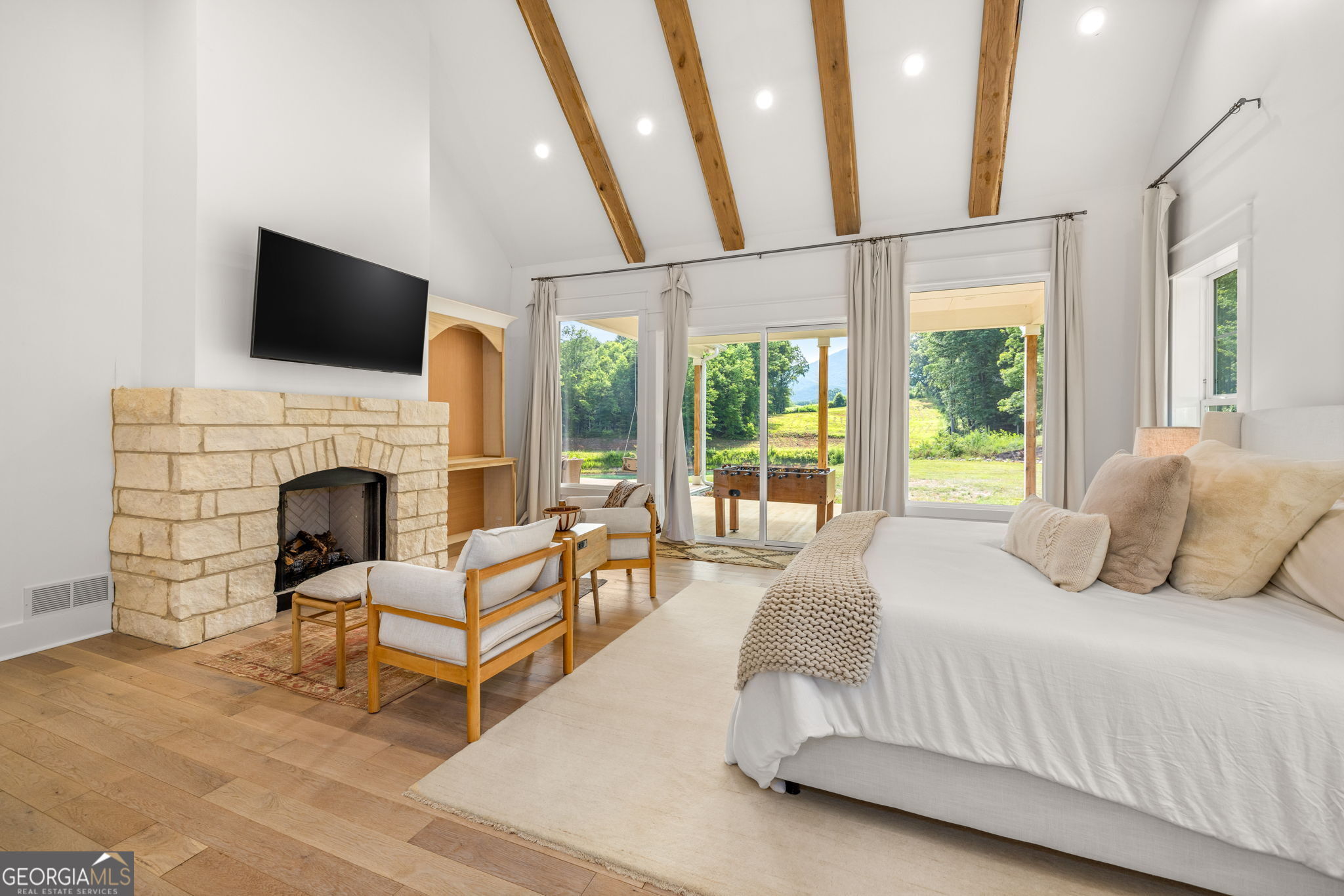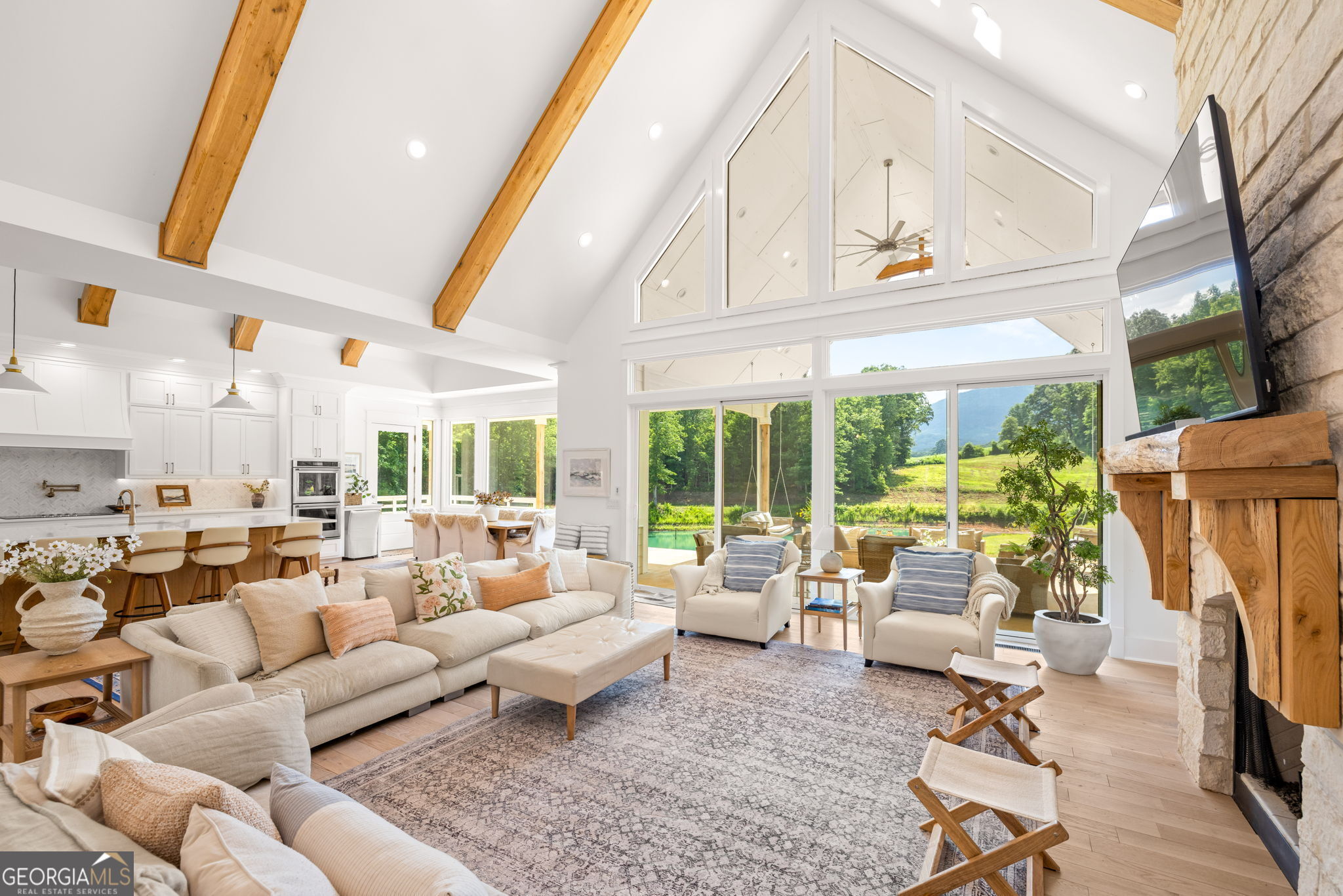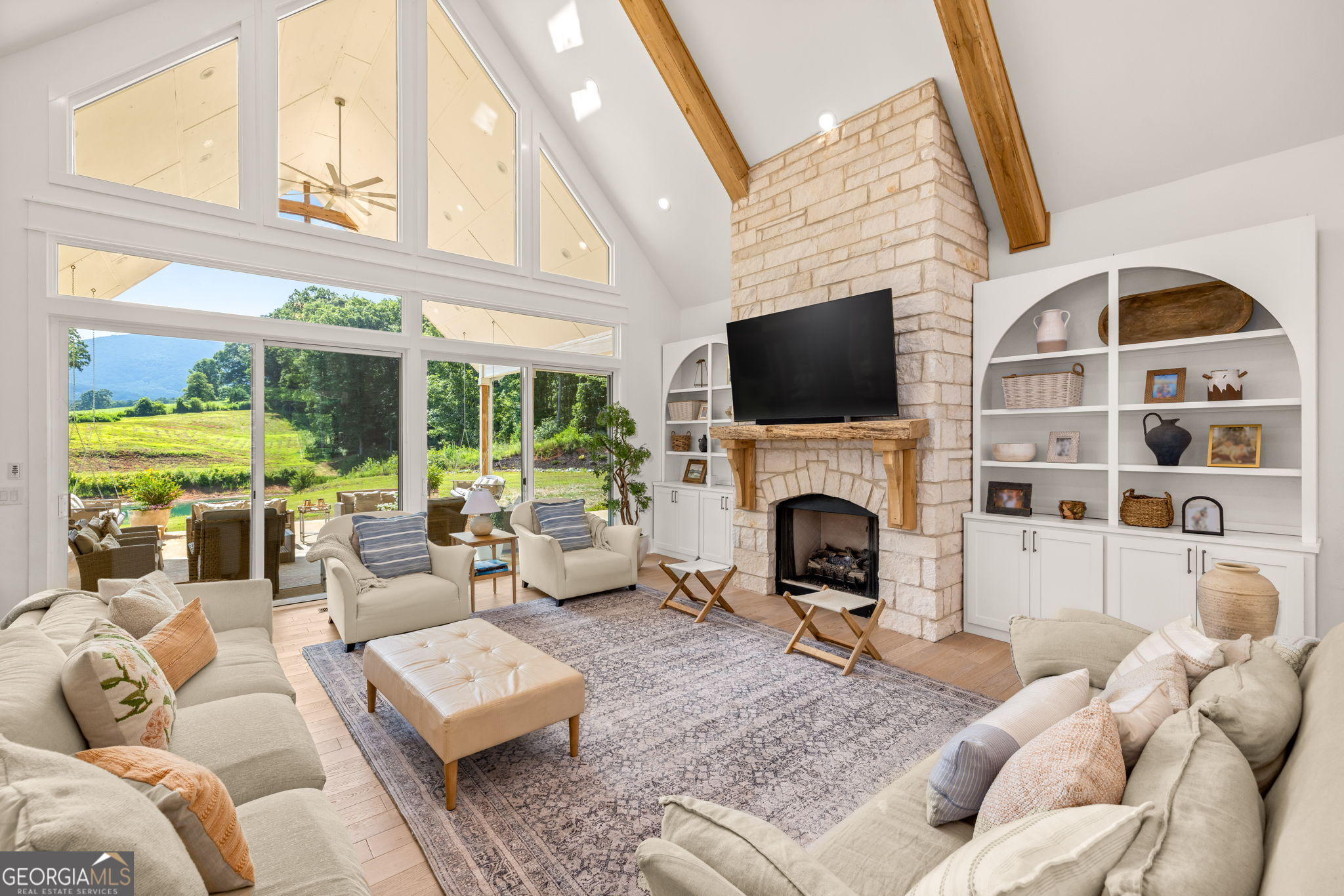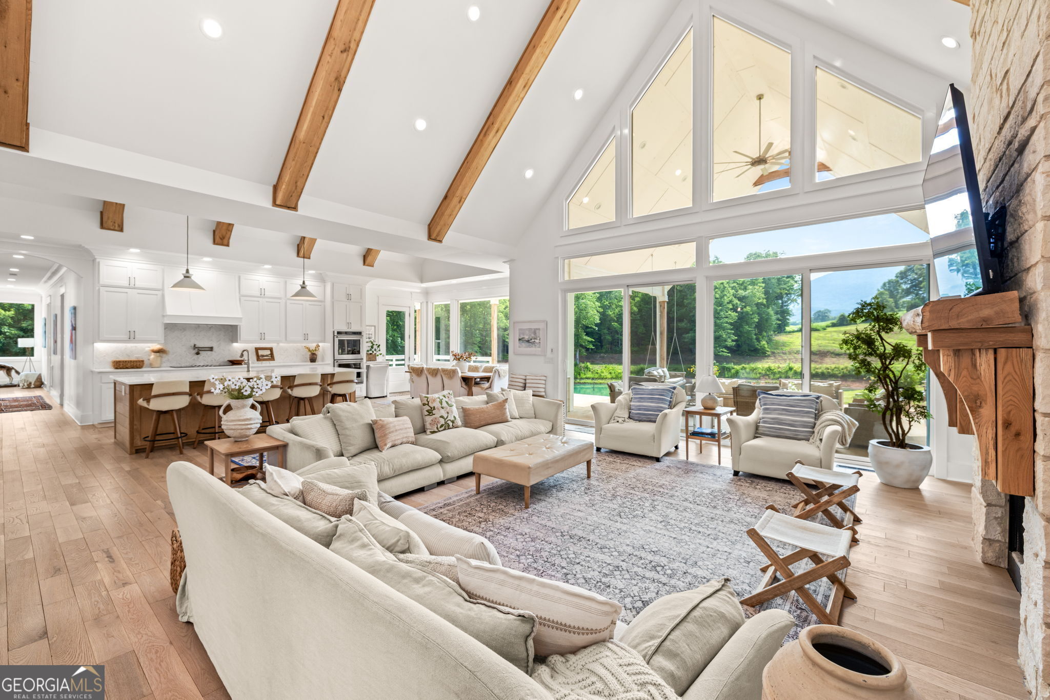 Discover a masterpiece of modern craftsmanship and natural splendor. Perched on 13.21 serene acres, this 2022 custom-built estate offers an experience of refined mountain living with staggering, uninterrupted views of Mt. Yonah from nearly every room. This is not just a home; it is a destination. Step inside to a sprawling single-level layout of 3,708 sqft, where a true open-concept design is taken to new heights. Soaring vaulted ceilings, accented by magnificent white oak beams milled from trees on the estate itself, draw the eye upward. Ten-foot ceilings and eight-foot doors create a sense of grandeur, while a real, functional cupola bathes the great room in glorious natural light. Two stately Texas limestone fireplaces provide a warm and inviting ambiance for quiet evenings or grand-scale entertaining. The luxurious primary suite is a private retreat, offering generous space, comfort, and a spa-like bath designed for ultimate relaxation. Every bedroom, along with the gourmet kitchen and main living area, is perfectly positioned to capture the majestic mountain vistas. A dedicated office provides a tranquil workspace, while the oversized laundry room adds everyday convenience. The expansive covered back porch is the perfect setting to savor your morning coffee or host gatherings against a spectacular natural backdrop. The grounds are a private paradise. Explore your own wooded walking trails, cast a line in the stocked pond, or simply relax to the soothing sounds of a year-round creek. For the hobbyist or collector, the attached 1,400 sqft 3-car garage features a vaulted bonus room with plumbing already in place for a future bathroom, offering limitless potential. An immense 24x36 crawl space with both walk-through and garage-door access provides unparalleled storage solutions. Experience absolute seclusion while remaining conveniently located just 10 minutes from the charms of Helen, Cleveland, and Clarkesville, and a mere 40 minutes from Gainesville. This property represents a rare and remarkable opportunity to own a piece of North Georgia's finest scenery, where luxury design and the tranquility of nature exist in perfect harmony.