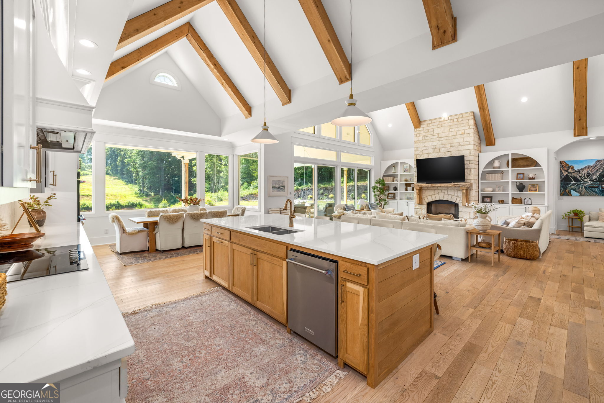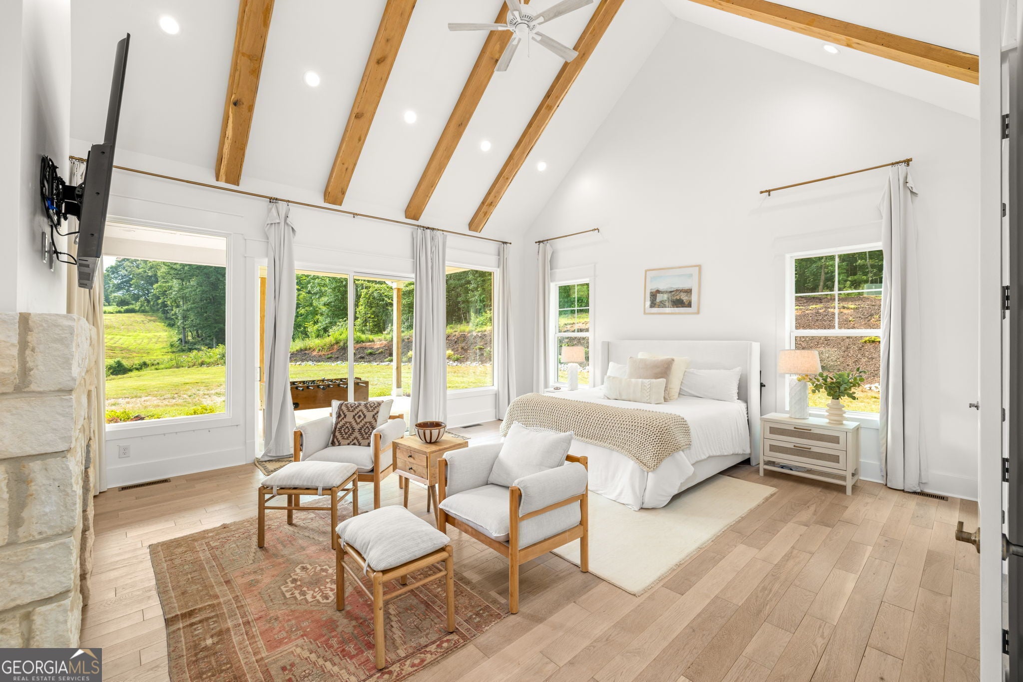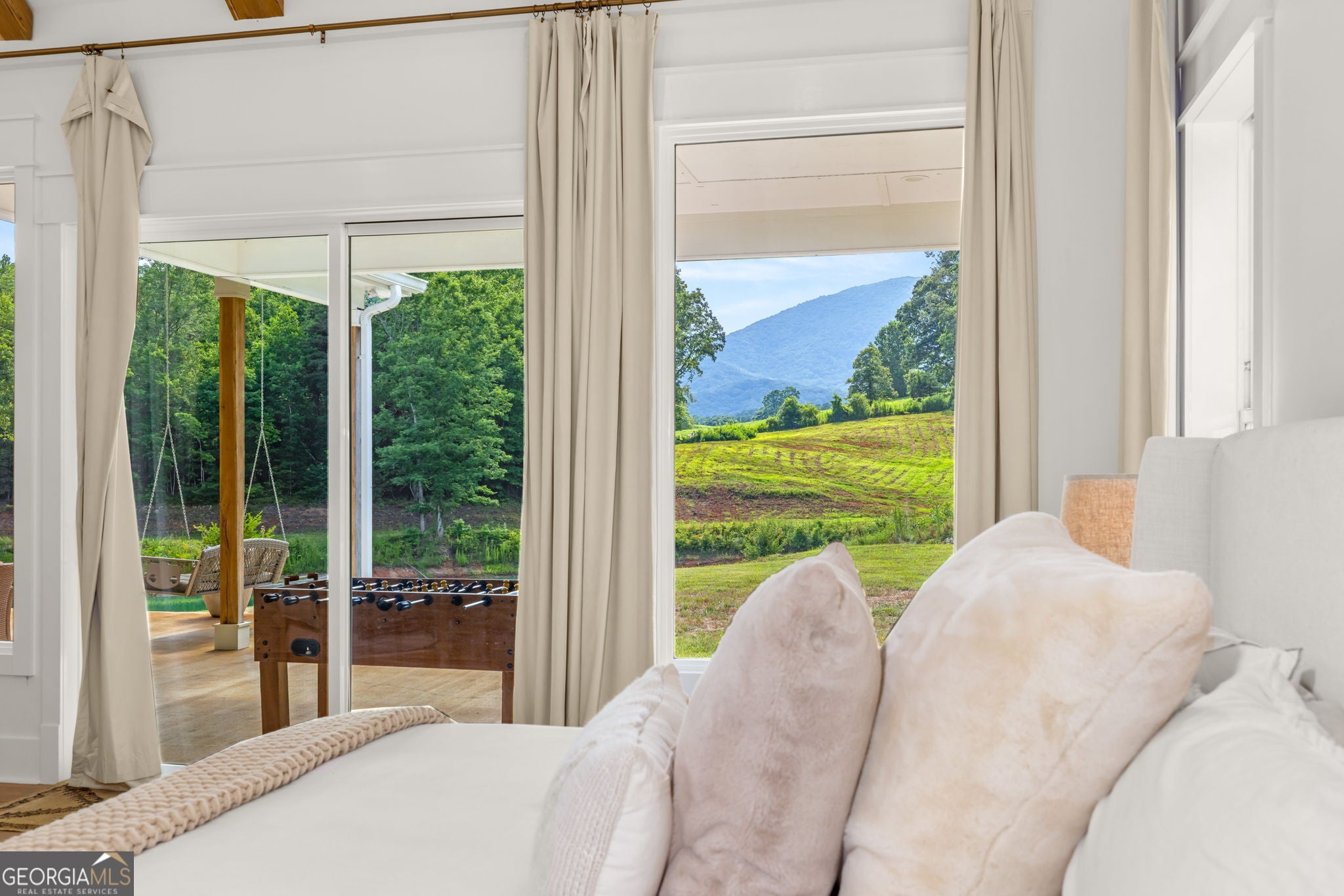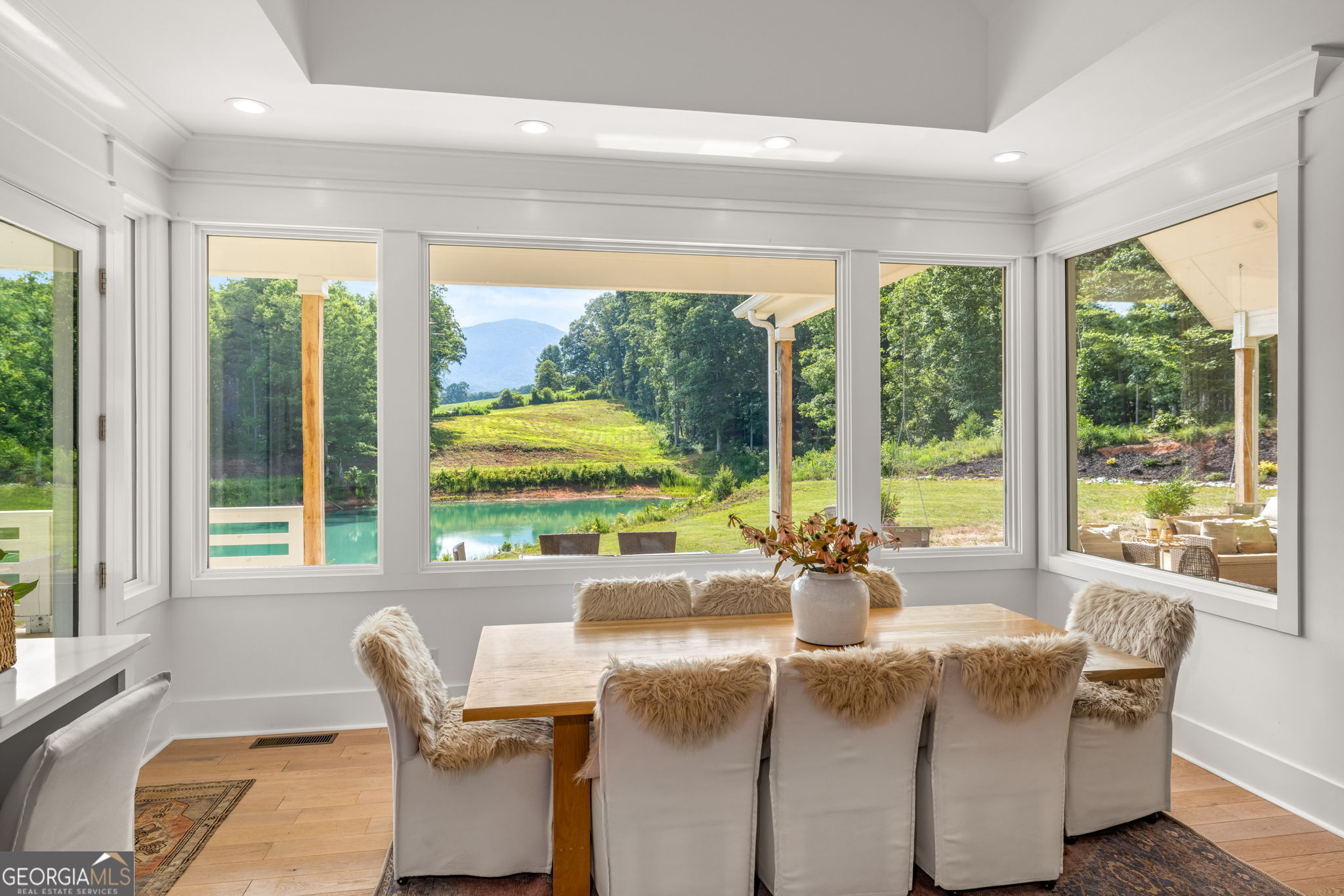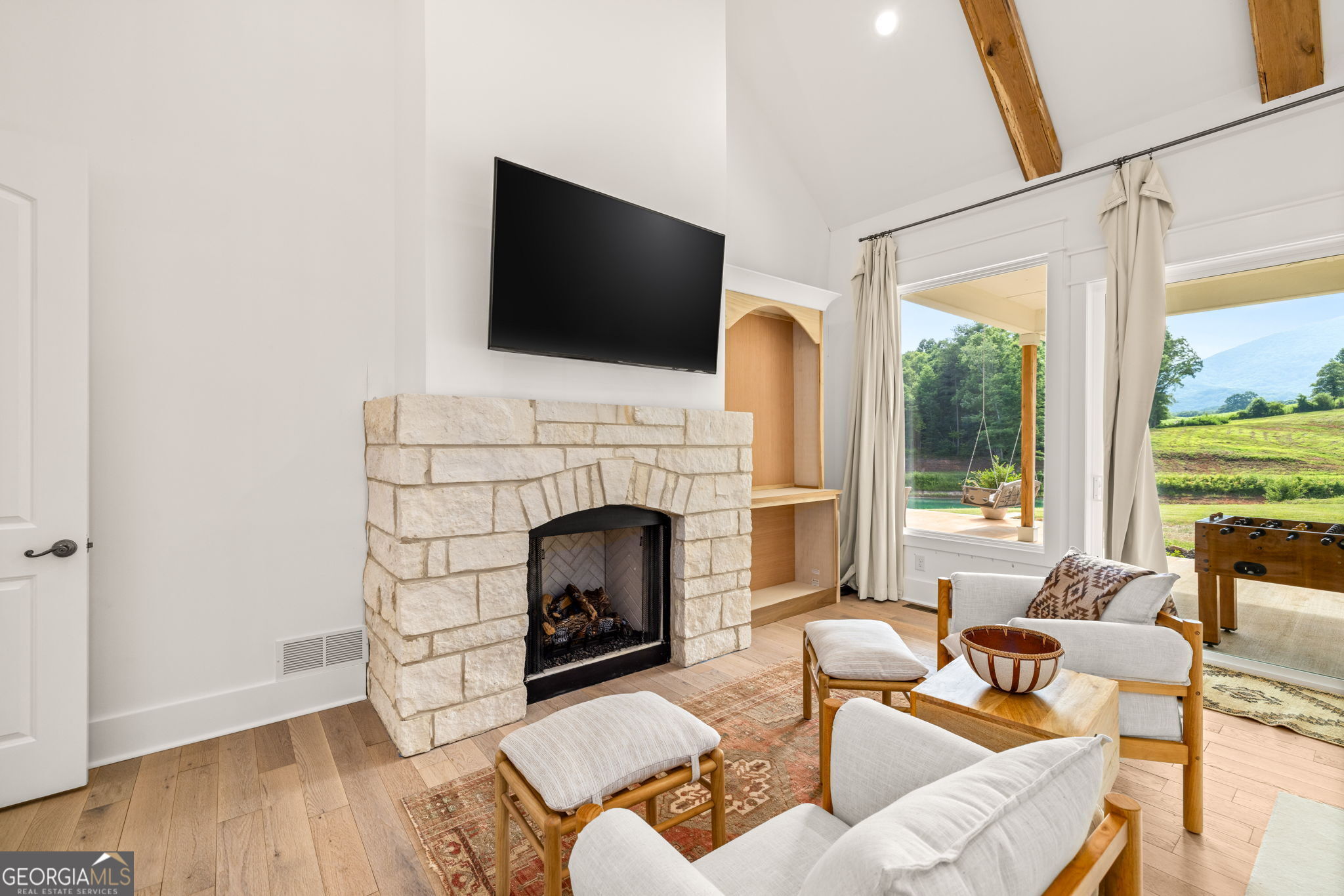 Discover a masterpiece of modern craftsmanship and natural splendor. Perched on 13.21 serene acres, this 2022 custom-built estate offers an experience of refined mountain living with staggering, uninterrupted views of Mt. Yonah from nearly every room. This is not just a home; it is a destination. Step inside to a sprawling single-level layout of 3,708 sqft, where a true open-concept design is taken to new heights. Soaring vaulted ceilings, accented by magnificent white oak beams milled from trees on the estate itself, draw the eye upward. Ten-foot ceilings and eight-foot doors create a sense of grandeur, while a real, functional cupola bathes the great room in glorious natural light. Two stately Texas limestone fireplaces provide a warm and inviting ambiance for quiet evenings or grand-scale entertaining. The luxurious primary suite is a private retreat, offering generous space, comfort, and a spa-like bath designed for ultimate relaxation. Every bedroom, along with the gourmet kitchen and main living area, is perfectly positioned to capture the majestic mountain vistas. A dedicated office provides a tranquil workspace, while the oversized laundry room adds everyday convenience. The expansive covered back porch is the perfect setting to savor your morning coffee or host gatherings against a spectacular natural backdrop. The grounds are a private paradise. Explore your own wooded walking trails, cast a line in the stocked pond, or simply relax to the soothing sounds of a year-round creek. For the hobbyist or collector, the attached 1,400 sqft 3-car garage features a vaulted bonus room with plumbing already in place for a future bathroom, offering limitless potential. An immense 24x36 crawl space with both walk-through and garage-door access provides unparalleled storage solutions. Experience absolute seclusion while remaining conveniently located just 10 minutes from the charms of Helen, Cleveland, and Clarkesville, and a mere 40 minutes from Gainesville. This property represents a rare and remarkable opportunity to own a piece of North Georgia's finest scenery, where luxury design and the tranquility of nature exist in perfect harmony.