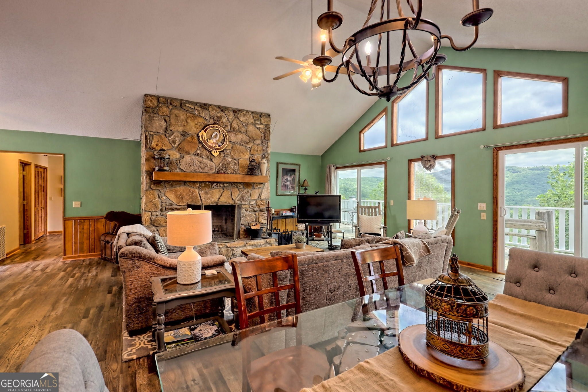 New Price Reduction for this large 4-bedroom, 3-baths move in ready home. It comes complete with all the furnishings, including bedding, towels, lamps, sofas, beds, 5 TVs, dishes, silverware, pans, etc. Seriously, just bring clothes, and a toothbrush. It will be easy to get on the Sky Valley rental market quickly. Come see it today. The original-owner home in Sky Valley, Georgia's highest and coolest city, features phenomenal mountain views. The main floor includes an updated kitchen with stainless steel appliances, breakfast nook with wrap-around windows, separate utility room, primary bedroom and adjoining updated bath with two vanities, and a second bedroom and hall bath. The open-plan kitchen/family room/dining area features a vaulted ceiling, a massive stone wood-burning fireplace and updated LVT flooring. Also, a nice sized laundry room on main floor. Views from every room. The lower floor contains two bedrooms, an updated bath and a large wood-paneled family/game room with a stone wood-burning fireplace. Each floor is served with a full-length deck. All the bedrooms in this home are spacious, with each having a sliding glass door to the enjoy the view and there is lots of storage. With the exception of a few personal and family items, most furnishings will convey. Ready for your family and it has been a successful vacation rental. Sky Valley is located two hours from Atlanta and 15 miles from Highlands, NC, features easily accessible city-maintained paved streets, a semi-private 18-hole, 6900-yard championship golf course at Sky Valley Country Club (membership optional), public water system, police department, garbage collection, volunteer fire department, two churches, pickleball courts and post office. Short-term rentals are allowed in Sky Valley. There is no HOA.