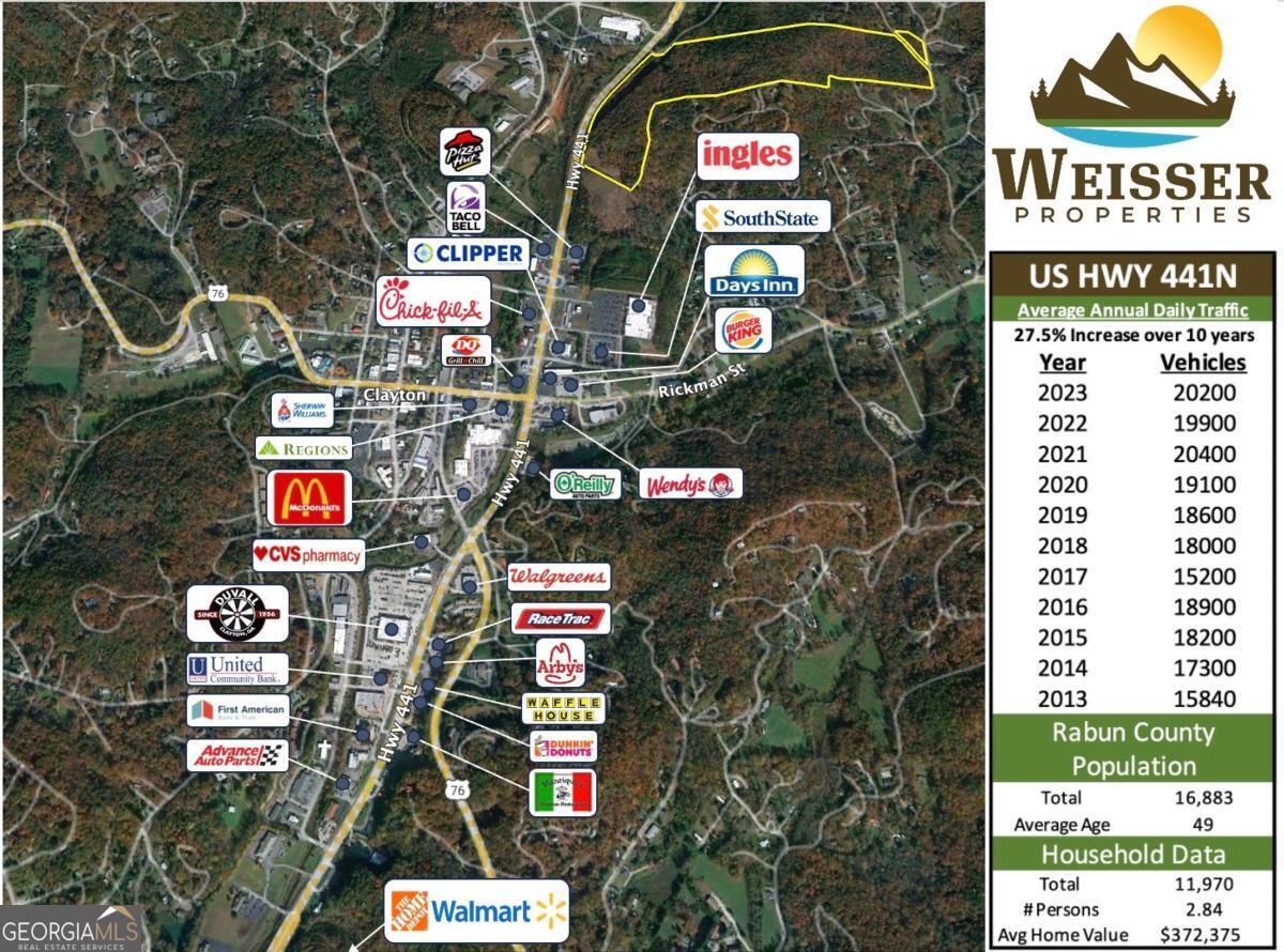 Incredible large tract of land in downtown Clayton with unlimited potential! Land is well-suited for a wide range of commercial development opportunities. This property is unrivaled in its size and location and is a rare find so close to the rapidly growing downtown area of Clayton. This property has over 1500 feet of frontage on Highway 441 which serves as a main artery for those traveling between GA and North Carolina for work, healthcare facilities, commercial business and transport, as well as a main route for tourism, making it one of the most traveled roads in the county. There is a paved drive for easy and smooth ingress and egress on Hwy 441 which makes it ready for development. Don't miss out on this unique find in Rabun County! Zoned residential with easy potential for re-zoing.
