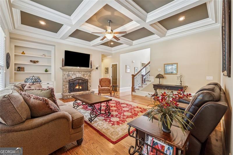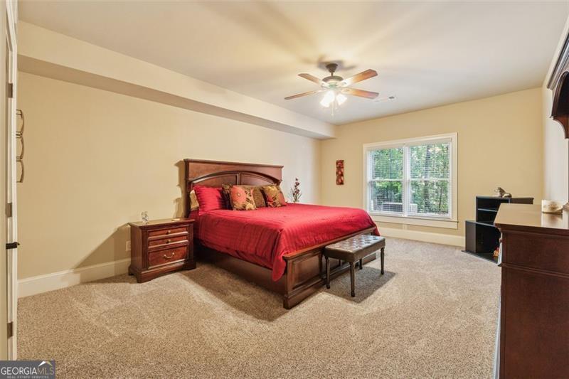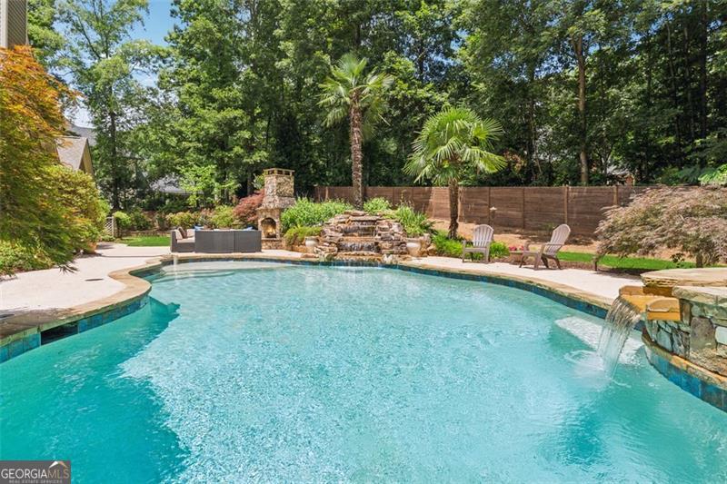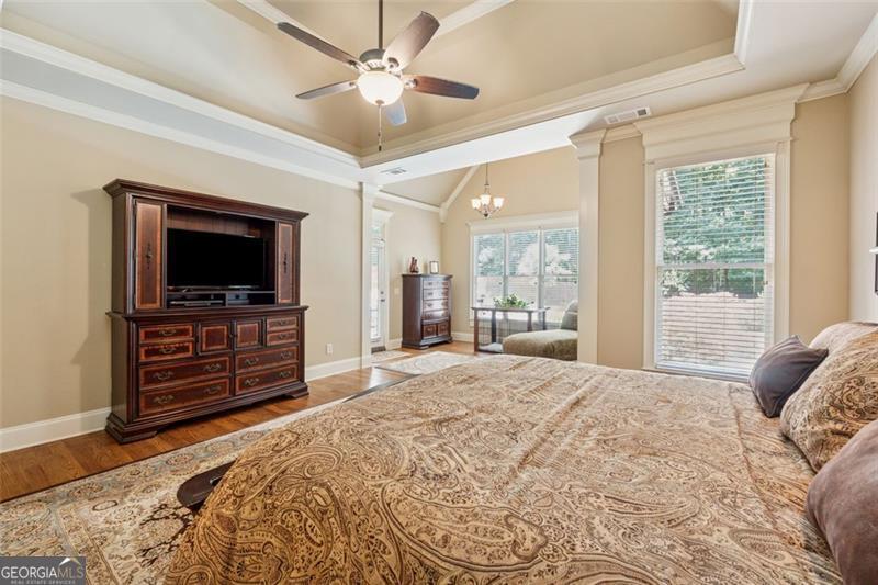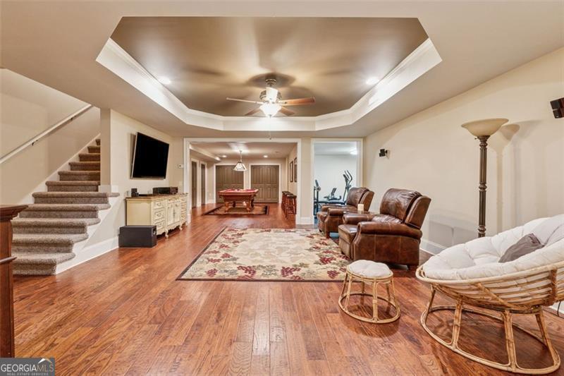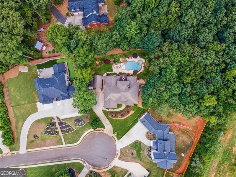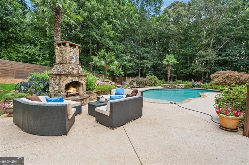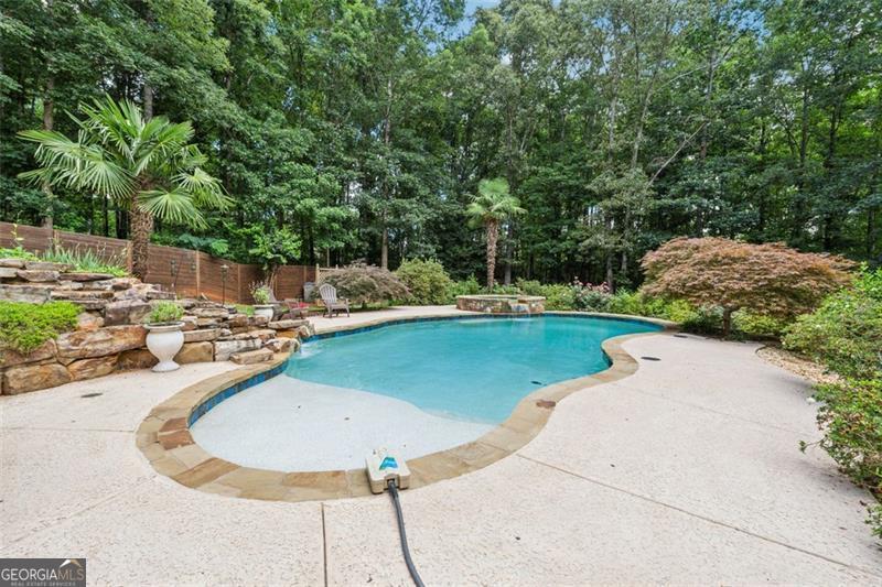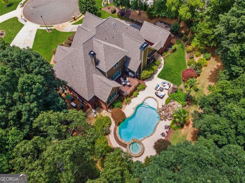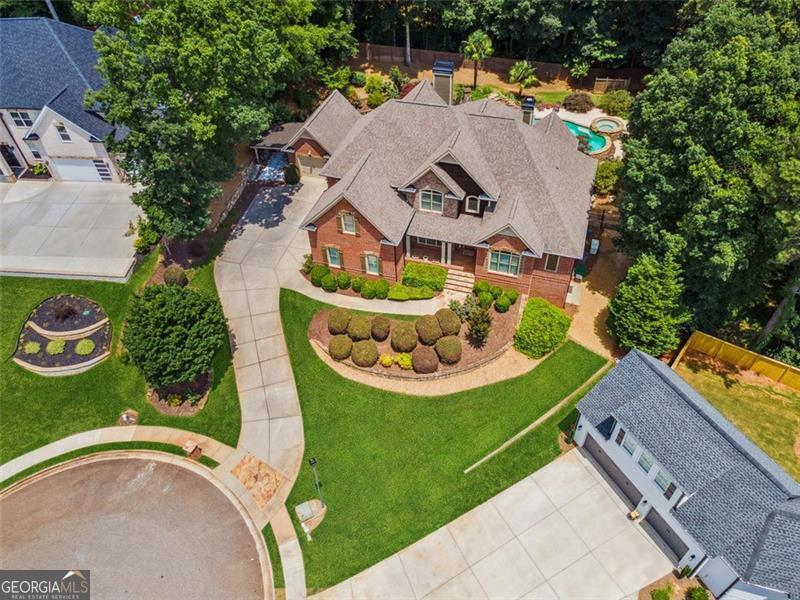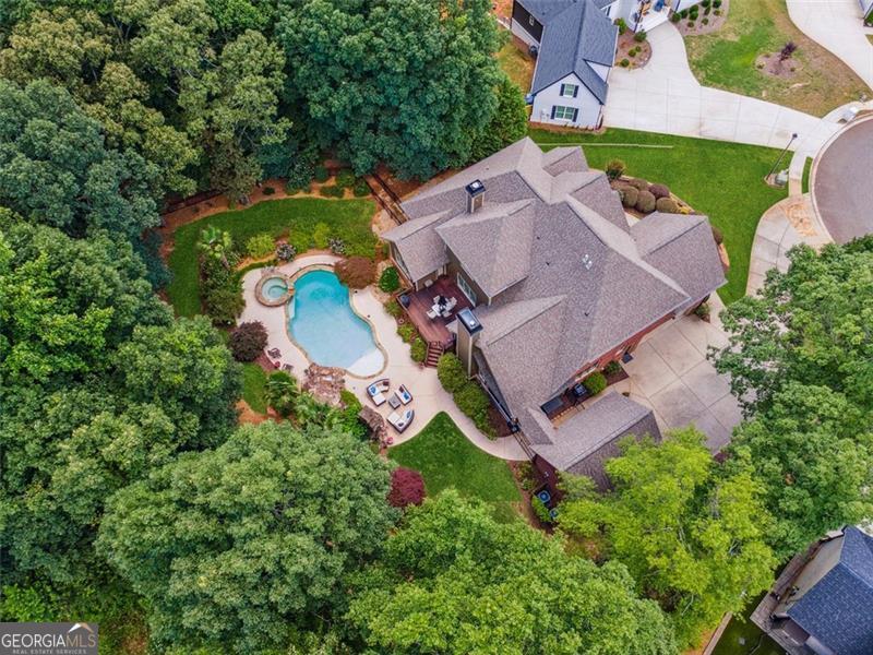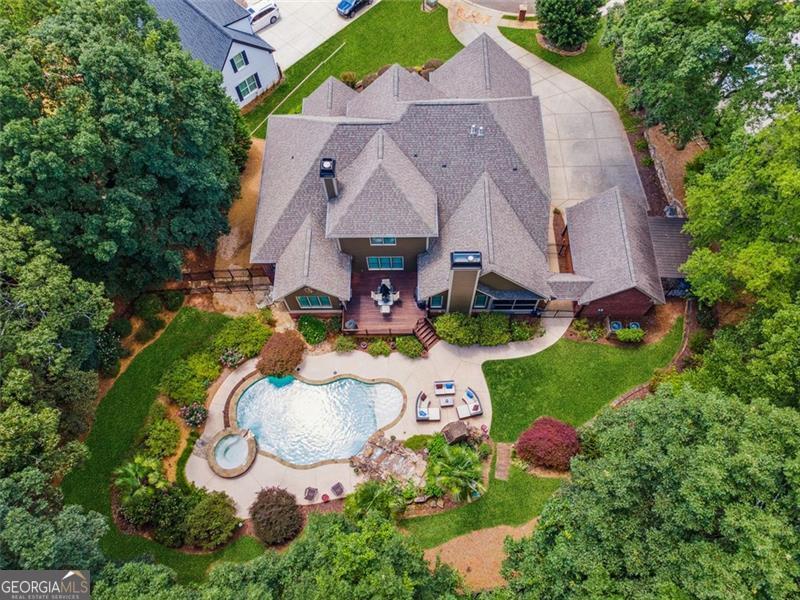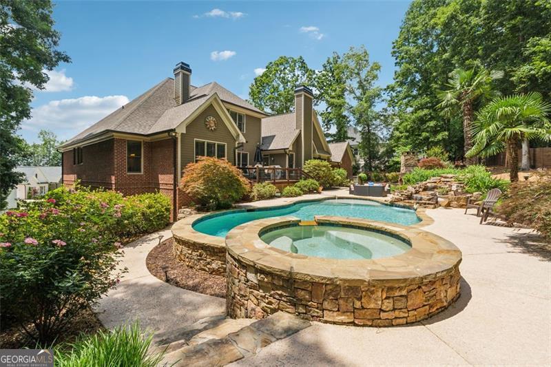 Resort-style luxury in a private enclave, this exquisite estate offers unparalleled elegance, space, and comfort across three impeccably finished levels. From the grand foyer with soaring ceilings, hardwood floors, and a custom tile inlay, every detail reflects thoughtful craftsmanship and refined design. The main level features a spacious primary suite with a sunlit sitting area, access to the deck overlooking the private backyard, and a spa-like ensuite with a custom-tiled shower, soaking tub, granite double vanity, and oversized walk-in closet. A secondary bedroom and full bath, formal dining room with illuminated custom cabinetry, fireside great room with coffered ceiling and custom built-ins, and a stunning kitchen complete this level. The kitchen features custom cabinetry, granite countertops, tile backsplash, walk-in pantry, a sunny breakfast nook, and a fireside keeping room with a vaulted ceiling and access to a screened-in porch just outside. Upstairs offers three generously sized bedrooms, each with its own ensuite, and a versatile media/bonus room. The fully finished terrace level includes a sixth bedroom and full bath with an oversized shower, expansive entertaining spaces with a custom wood bar, home gym, workshop, and abundant storage. Step outside to your own private oasis featuring a sparkling pool, spa, waterfall, patio with outdoor fireplace, and a fenced play area perfect for pets. Ideally located near Mulberry Park with walking trails up Hog Mountain and a paved walk around the lake. Minutes away from Lake Lanier, Chateau Elan Winery, and the Mall of Georgia, skate park, basketball/volleyball courts, softball/baseball fields and library. Additional exceptional features include a carriage house-style garage with an attached carport/storage area, as well as a whole-house generator for added peace of mind and uninterrupted comfort. This home truly has it all and has been well cared for, a must see to appreciate all that it offers. No HOA. Additional 1800 sq. ft. finished space and 757 unfinished on the terrace level.