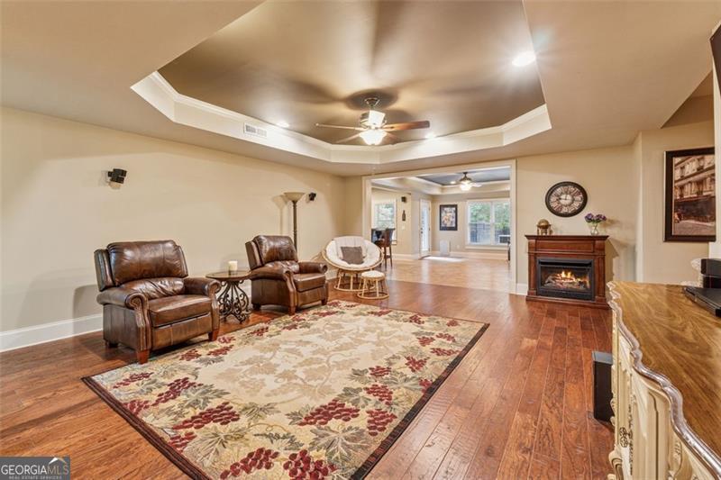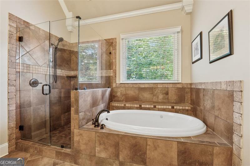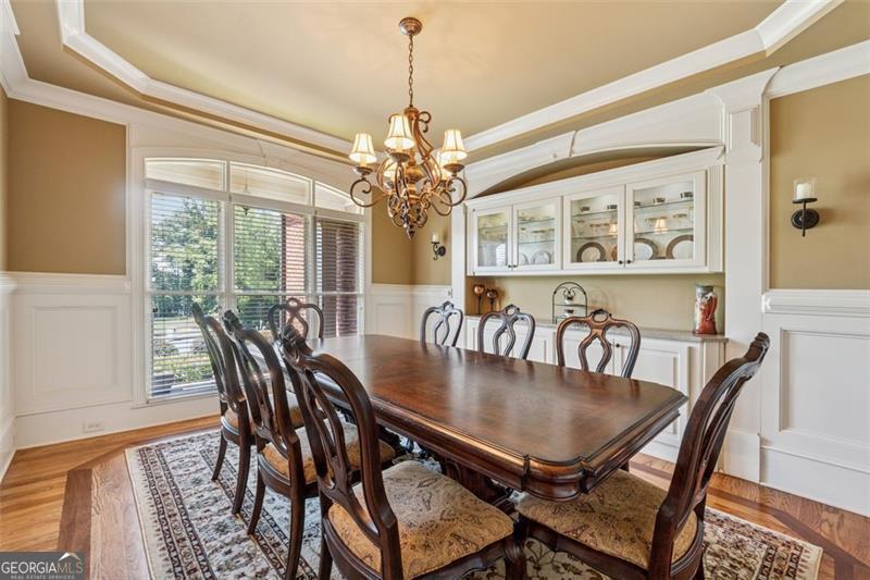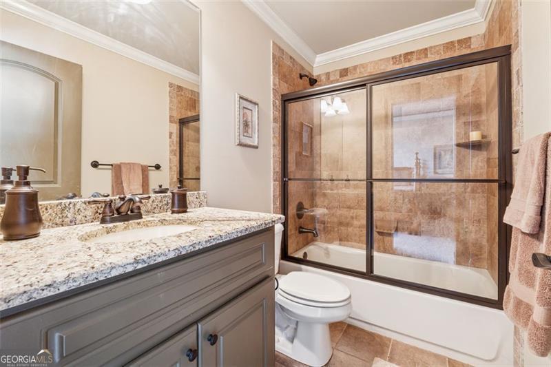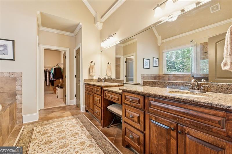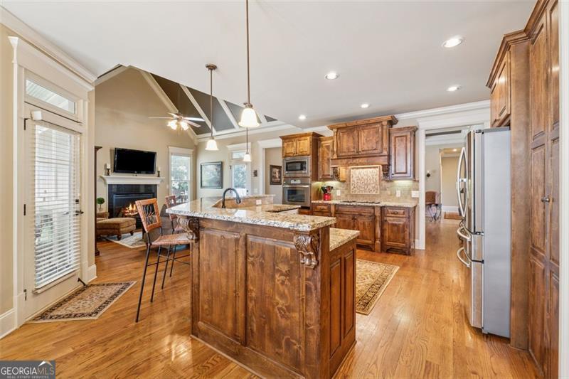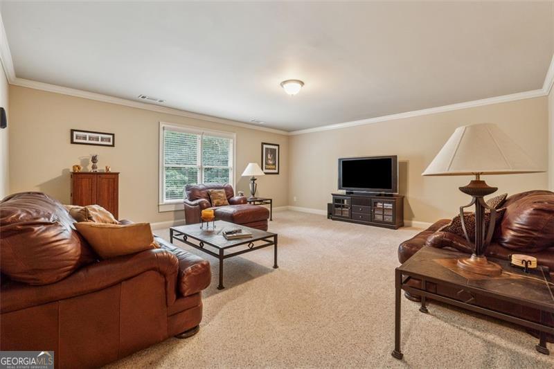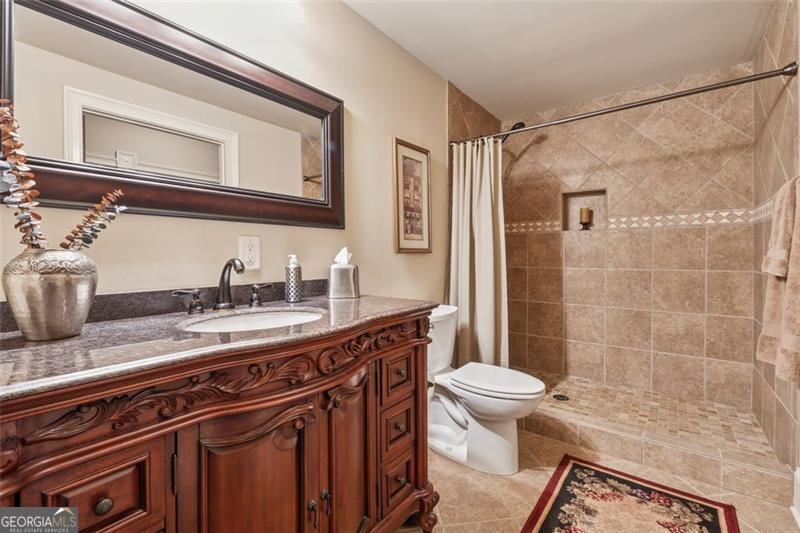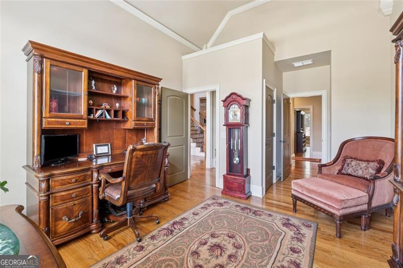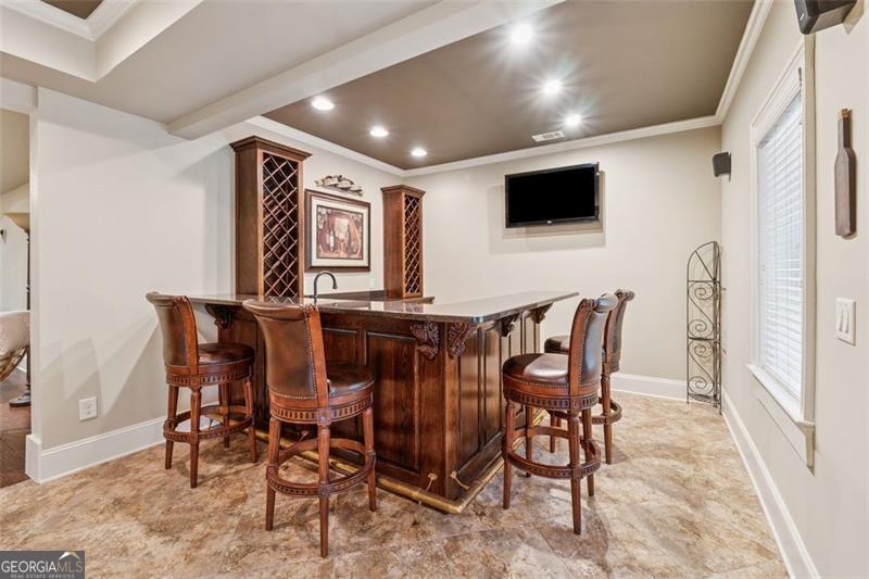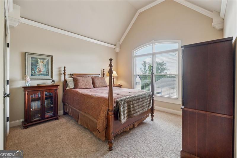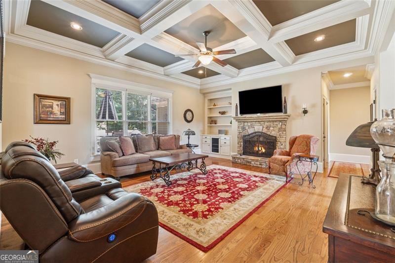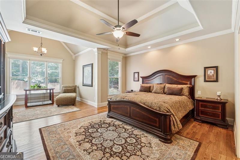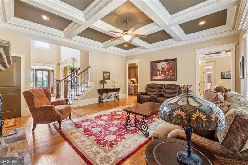 Resort-style luxury in a private enclave, this exquisite estate offers unparalleled elegance, space, and comfort across three impeccably finished levels. From the grand foyer with soaring ceilings, hardwood floors, and a custom tile inlay, every detail reflects thoughtful craftsmanship and refined design. The main level features a spacious primary suite with a sunlit sitting area, access to the deck overlooking the private backyard, and a spa-like ensuite with a custom-tiled shower, soaking tub, granite double vanity, and oversized walk-in closet. A secondary bedroom and full bath, formal dining room with illuminated custom cabinetry, fireside great room with coffered ceiling and custom built-ins, and a stunning kitchen complete this level. The kitchen features custom cabinetry, granite countertops, tile backsplash, walk-in pantry, a sunny breakfast nook, and a fireside keeping room with a vaulted ceiling and access to a screened-in porch just outside. Upstairs offers three generously sized bedrooms, each with its own ensuite, and a versatile media/bonus room. The fully finished terrace level includes a sixth bedroom and full bath with an oversized shower, expansive entertaining spaces with a custom wood bar, home gym, workshop, and abundant storage. Step outside to your own private oasis featuring a sparkling pool, spa, waterfall, patio with outdoor fireplace, and a fenced play area perfect for pets. Ideally located near Mulberry Park with walking trails up Hog Mountain and a paved walk around the lake. Minutes away from Lake Lanier, Chateau Elan Winery, and the Mall of Georgia, skate park, basketball/volleyball courts, softball/baseball fields and library. Additional exceptional features include a carriage house-style garage with an attached carport/storage area, as well as a whole-house generator for added peace of mind and uninterrupted comfort. This home truly has it all and has been well cared for, a must see to appreciate all that it offers. No HOA. Additional 1800 sq. ft. finished space and 757 unfinished on the terrace level.