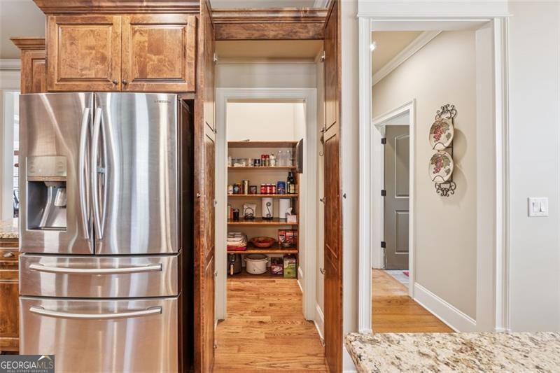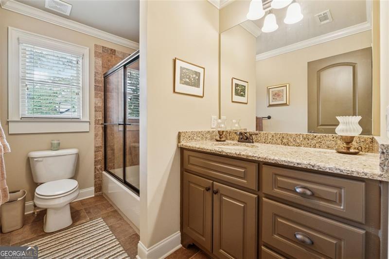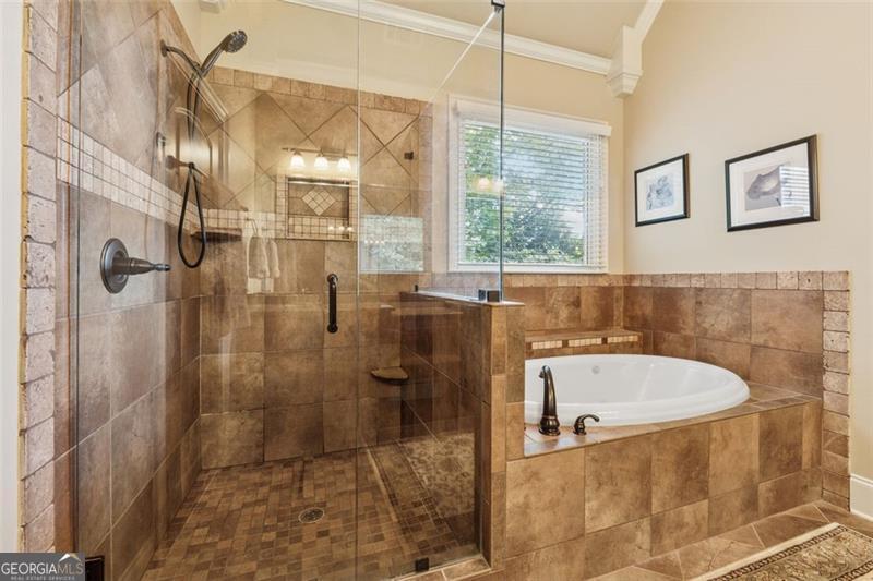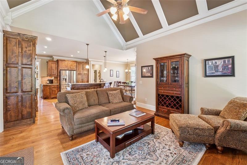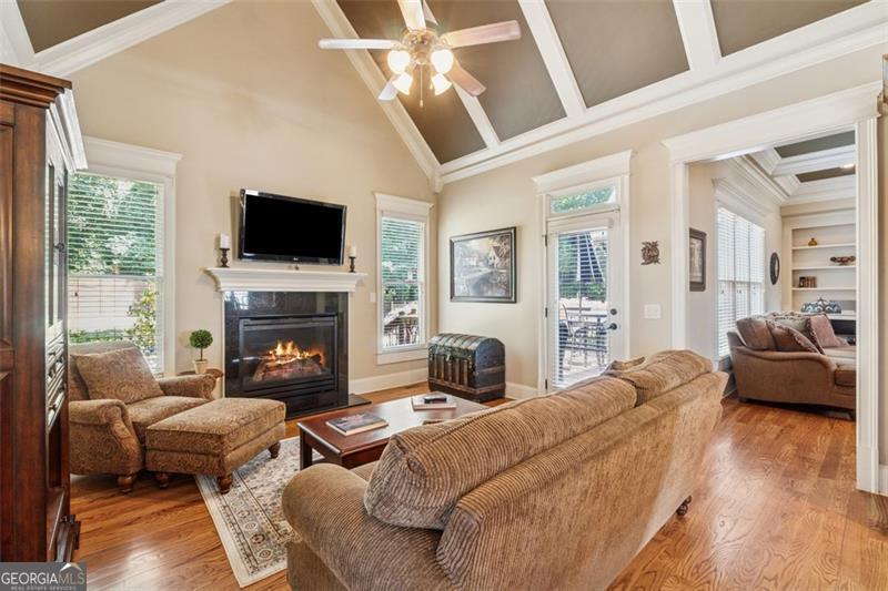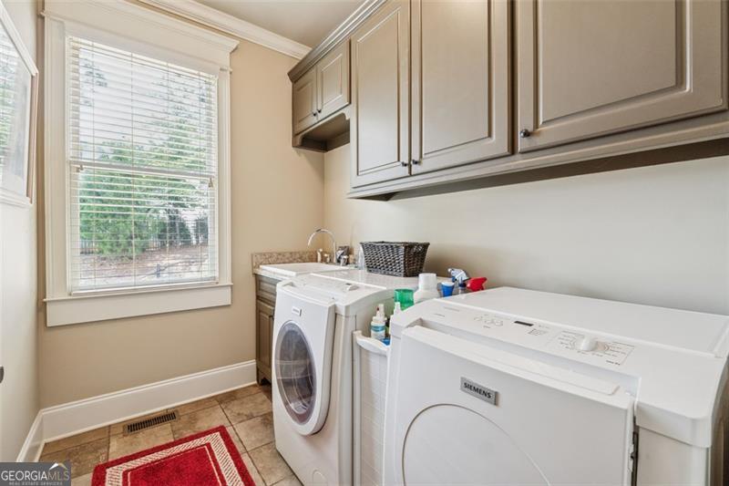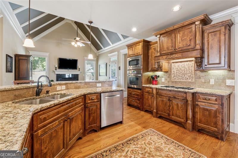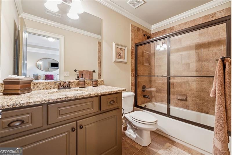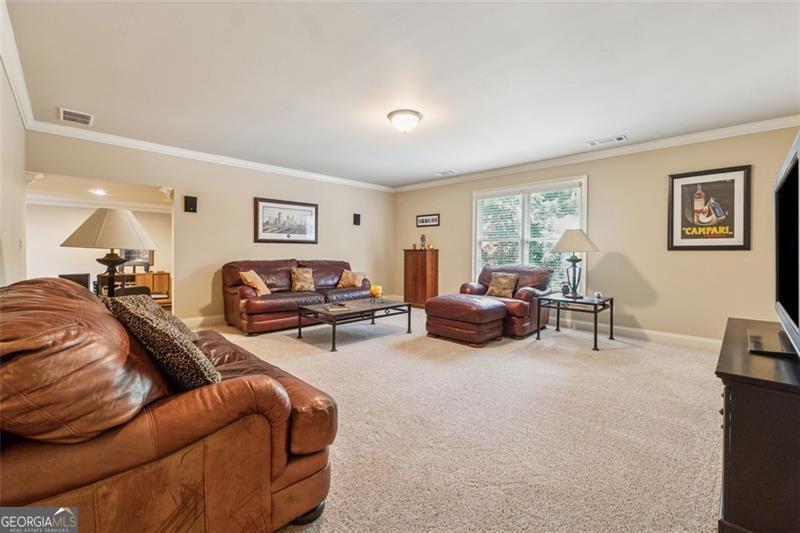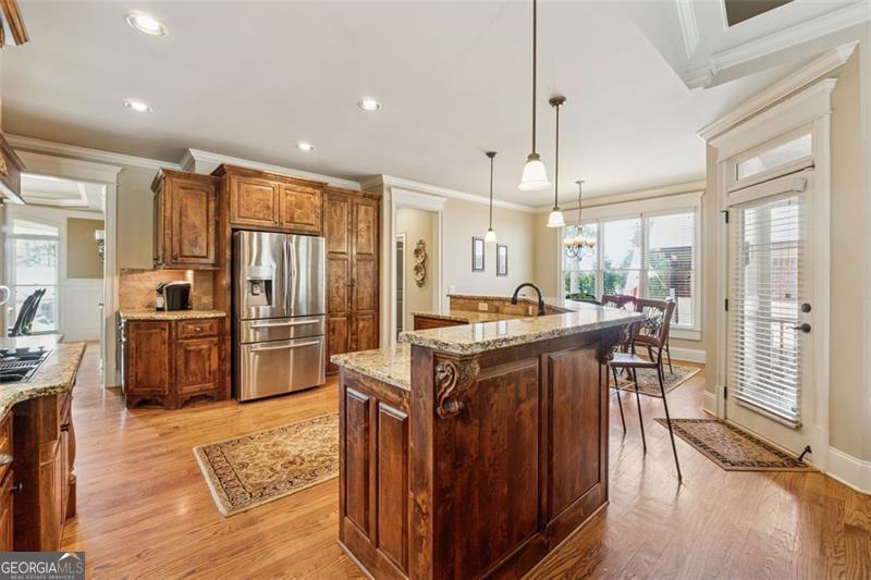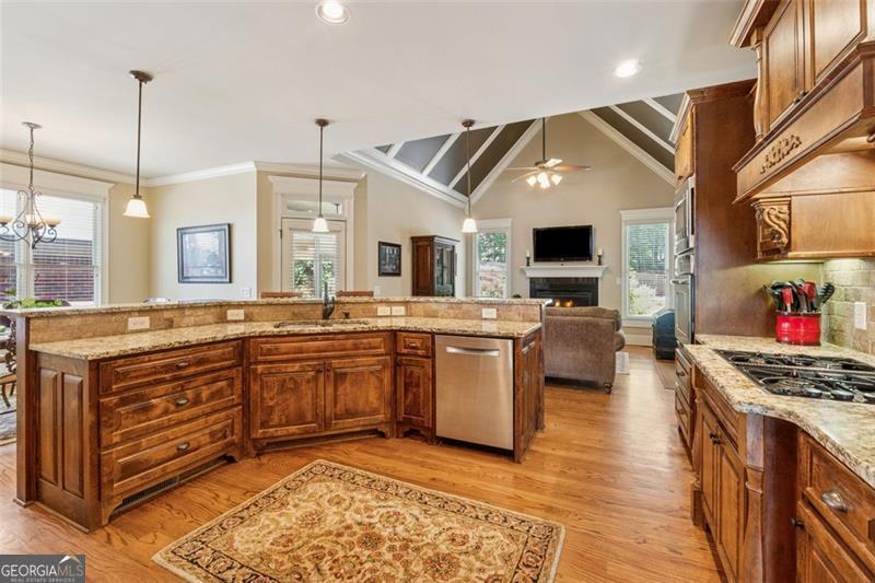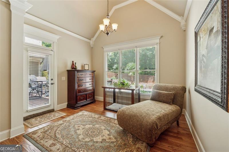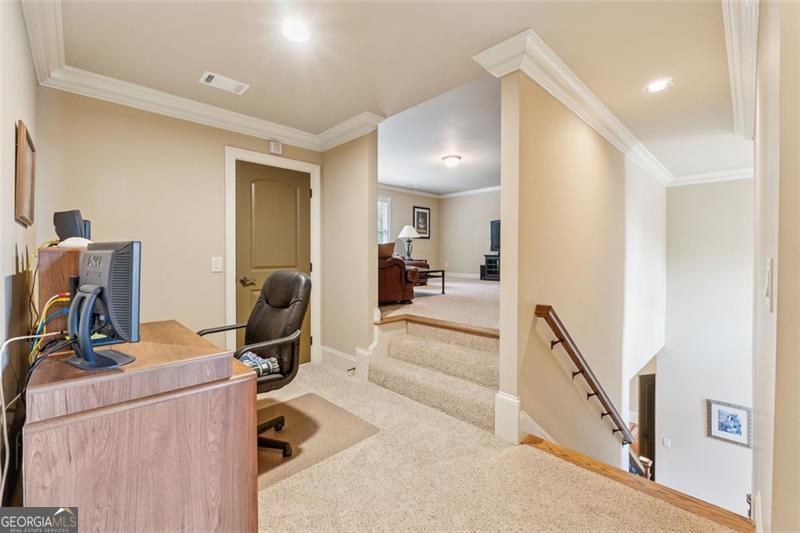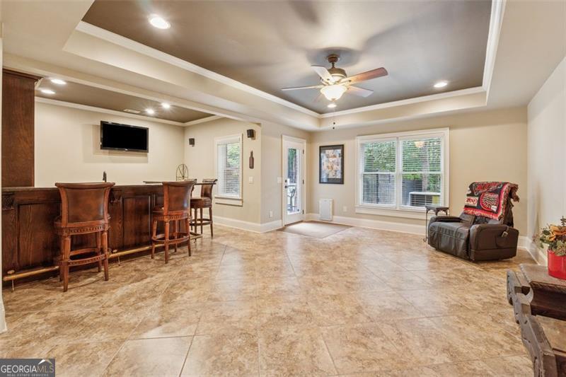 Resort-style luxury in a private enclave, this exquisite estate offers unparalleled elegance, space, and comfort across three impeccably finished levels. From the grand foyer with soaring ceilings, hardwood floors, and a custom tile inlay, every detail reflects thoughtful craftsmanship and refined design. The main level features a spacious primary suite with a sunlit sitting area, access to the deck overlooking the private backyard, and a spa-like ensuite with a custom-tiled shower, soaking tub, granite double vanity, and oversized walk-in closet. A secondary bedroom and full bath, formal dining room with illuminated custom cabinetry, fireside great room with coffered ceiling and custom built-ins, and a stunning kitchen complete this level. The kitchen features custom cabinetry, granite countertops, tile backsplash, walk-in pantry, a sunny breakfast nook, and a fireside keeping room with a vaulted ceiling and access to a screened-in porch just outside. Upstairs offers three generously sized bedrooms, each with its own ensuite, and a versatile media/bonus room. The fully finished terrace level includes a sixth bedroom and full bath with an oversized shower, expansive entertaining spaces with a custom wood bar, home gym, workshop, and abundant storage. Step outside to your own private oasis featuring a sparkling pool, spa, waterfall, patio with outdoor fireplace, and a fenced play area perfect for pets. Ideally located near Mulberry Park with walking trails up Hog Mountain and a paved walk around the lake. Minutes away from Lake Lanier, Chateau Elan Winery, and the Mall of Georgia, skate park, basketball/volleyball courts, softball/baseball fields and library. Additional exceptional features include a carriage house-style garage with an attached carport/storage area, as well as a whole-house generator for added peace of mind and uninterrupted comfort. This home truly has it all and has been well cared for, a must see to appreciate all that it offers. No HOA. Additional 1800 sq. ft. finished space and 757 unfinished on the terrace level.