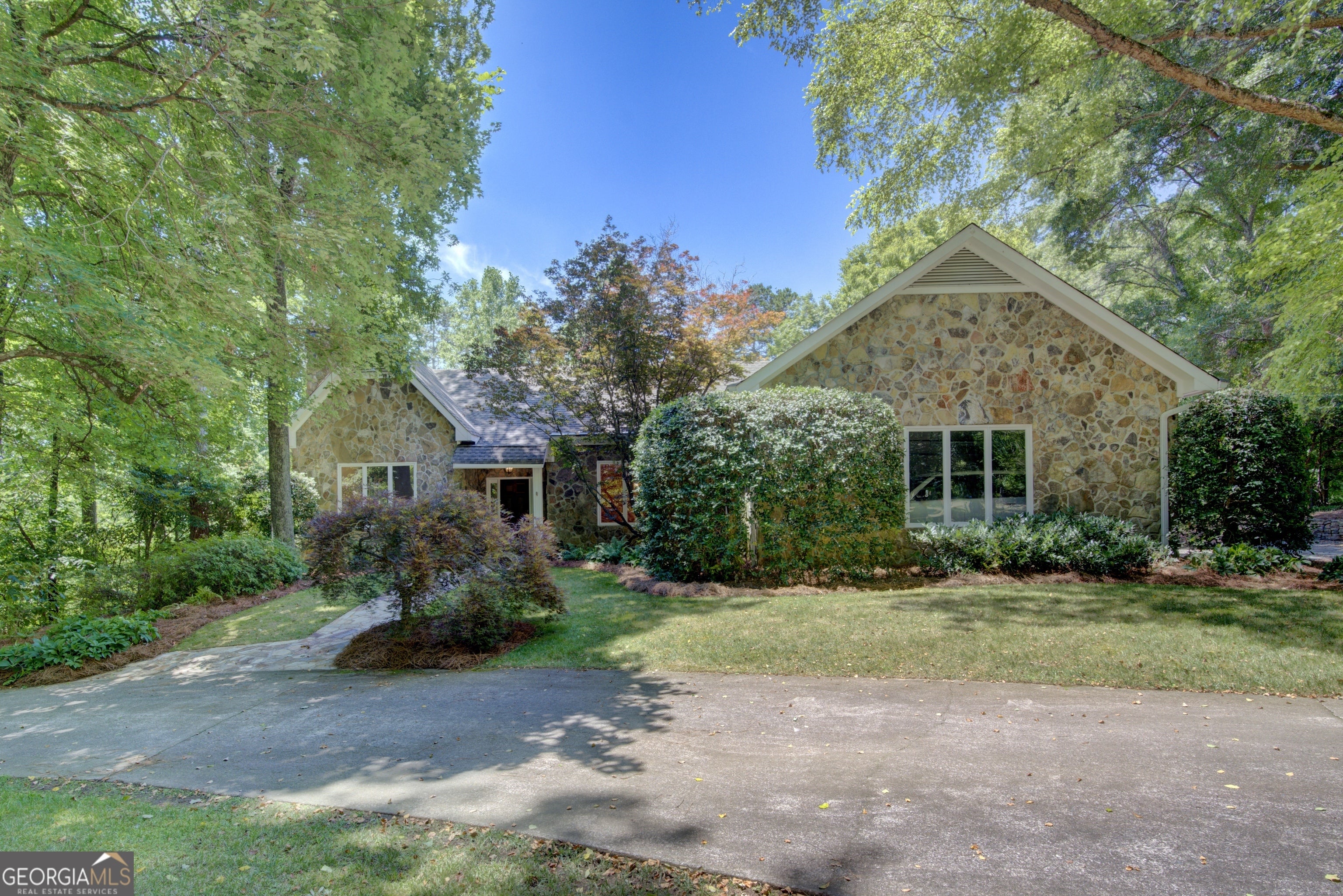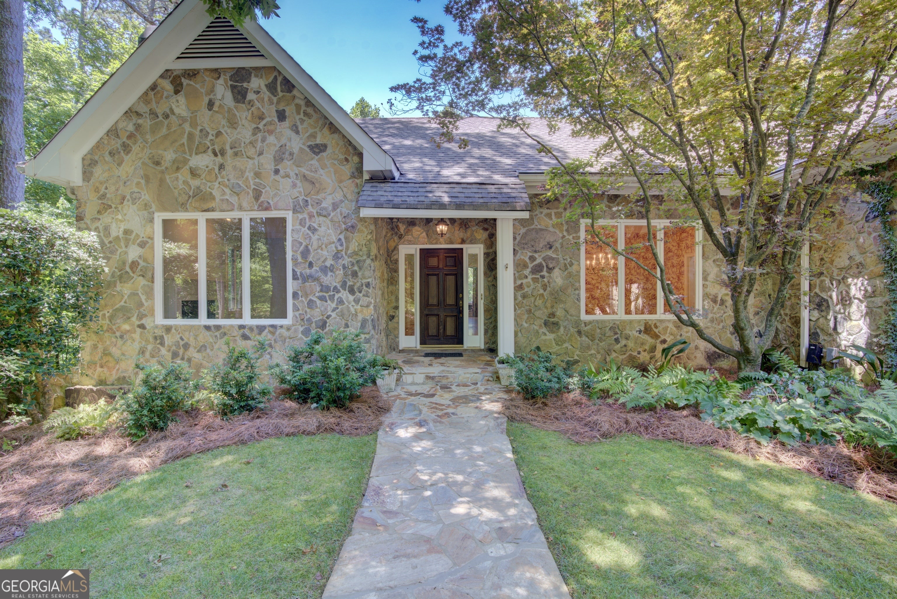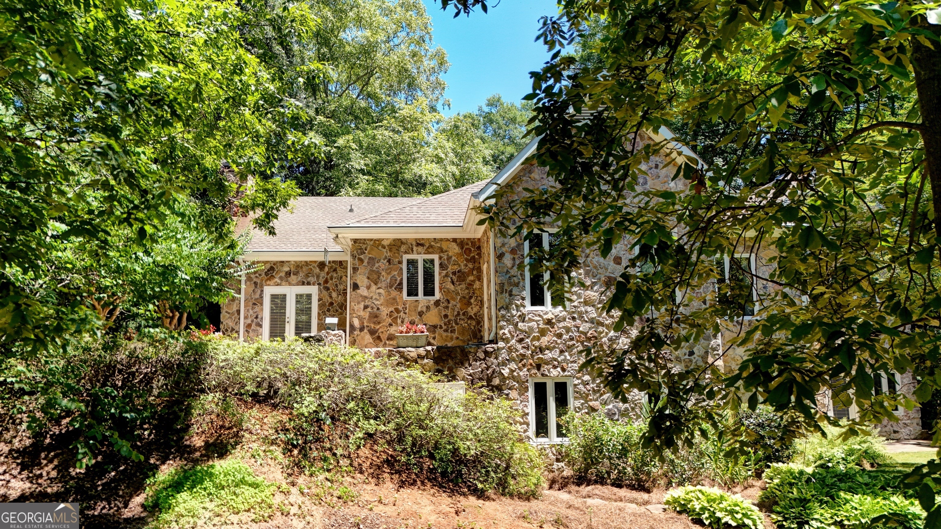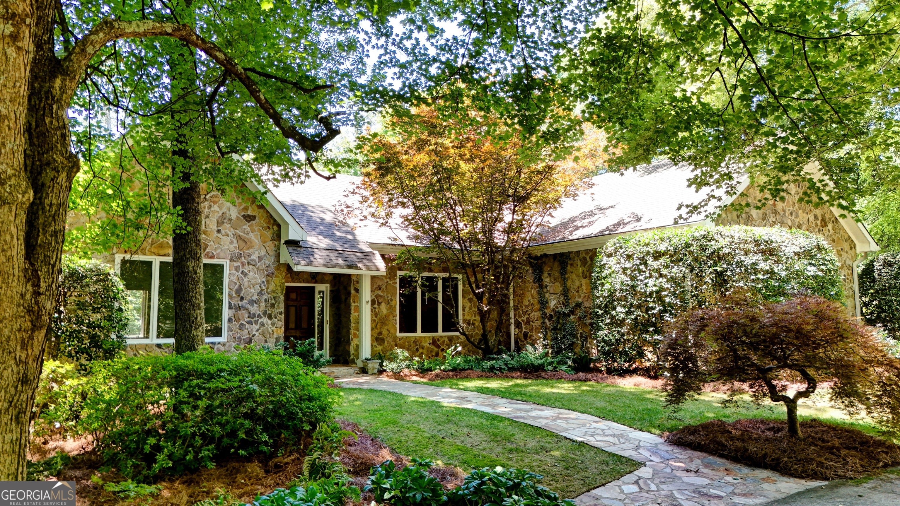 This home exudes warmth, tranquility, and privacy as it's nestled alongside the Etowah River. Imagine enjoying your morning cup of coffee as you sit on the stone patio, listening to the soothing sound of the river and overlooking the shoals of the Etowah River. This unique property offers 230 feet of river frontage and 6.55AC, allowing both plenty of privacy while still getting to enjoy the benefits of the desirable Shoals Ferry neighborhood. The former owner was a master gardener and is evident in the abundant flowers, plants, and thoughtfully planned landscape. Once you enter the lovely stone home, one first notices the gorgeous heart of pine hardwood that runs throughout the main floor and the natural light from the large windows. The main floor features a spacious foyer, large living room, sunroom, executive office, formal dining room, kitchen/family room, walk-in pantry, laundry room, powder room, and primary bedroom. On the terrace level, there are 3 large bedrooms, 2 baths, and a semi-finished bonus room. This rare property will not last long on the market. Book your appointment today!