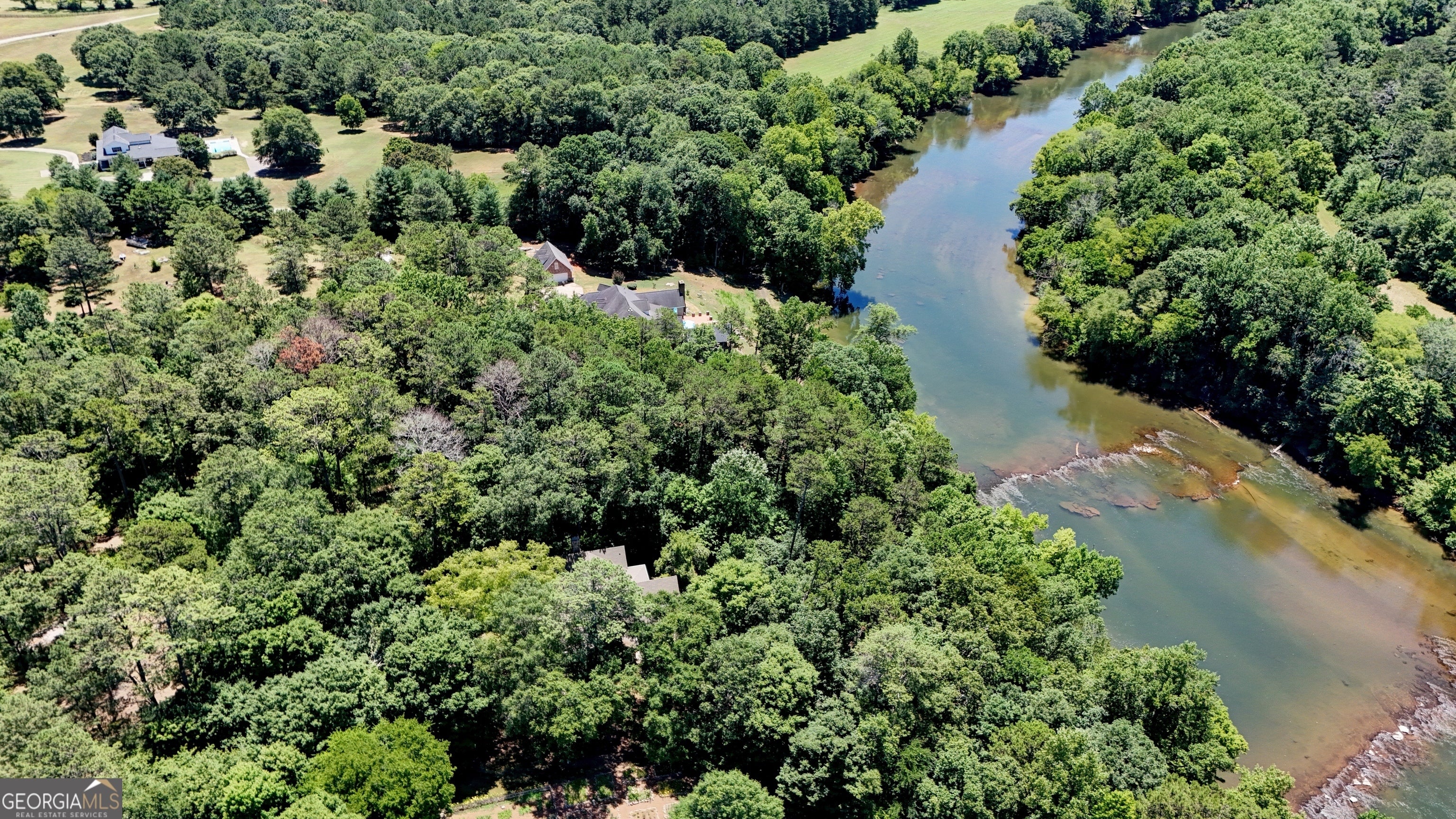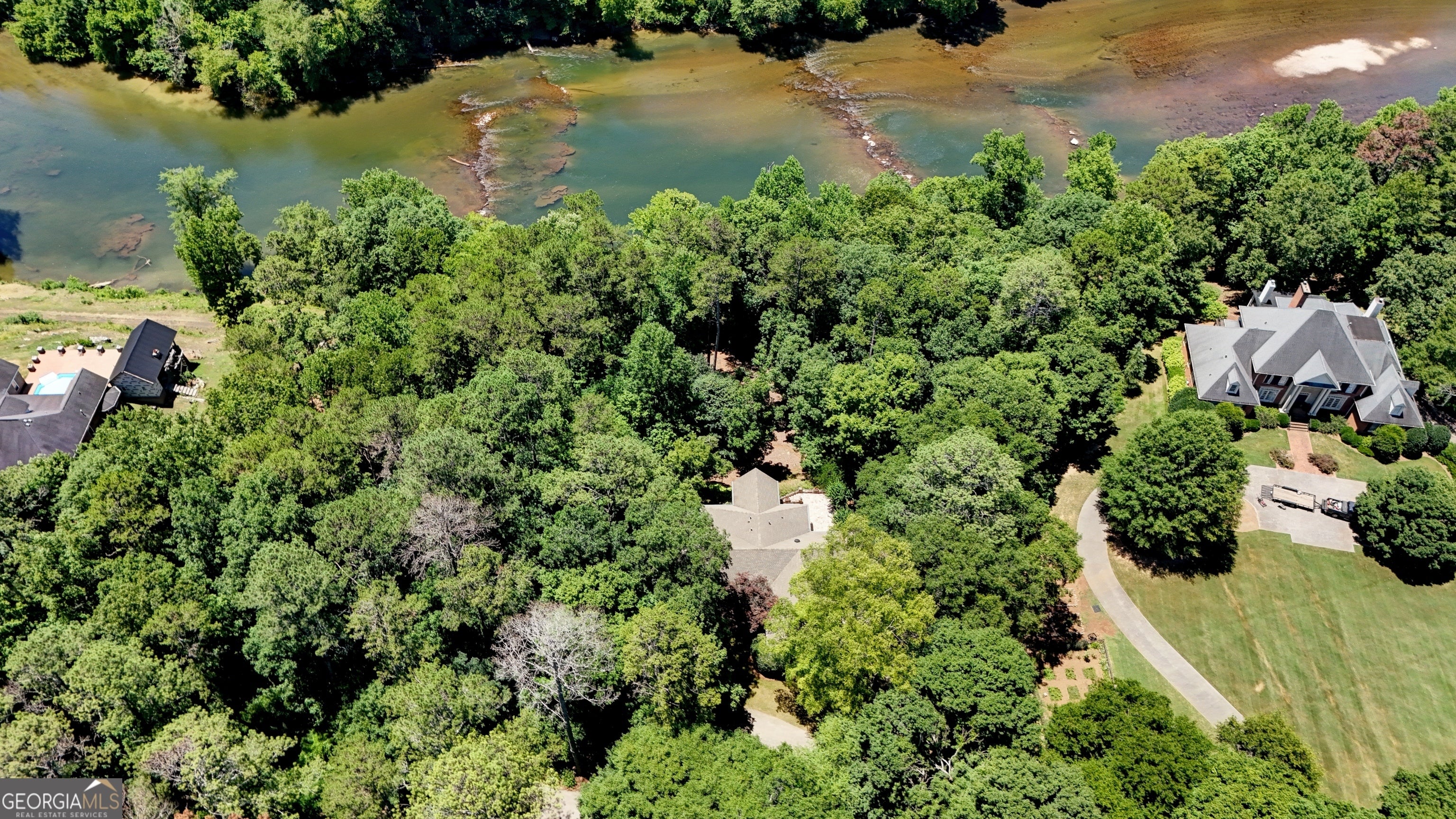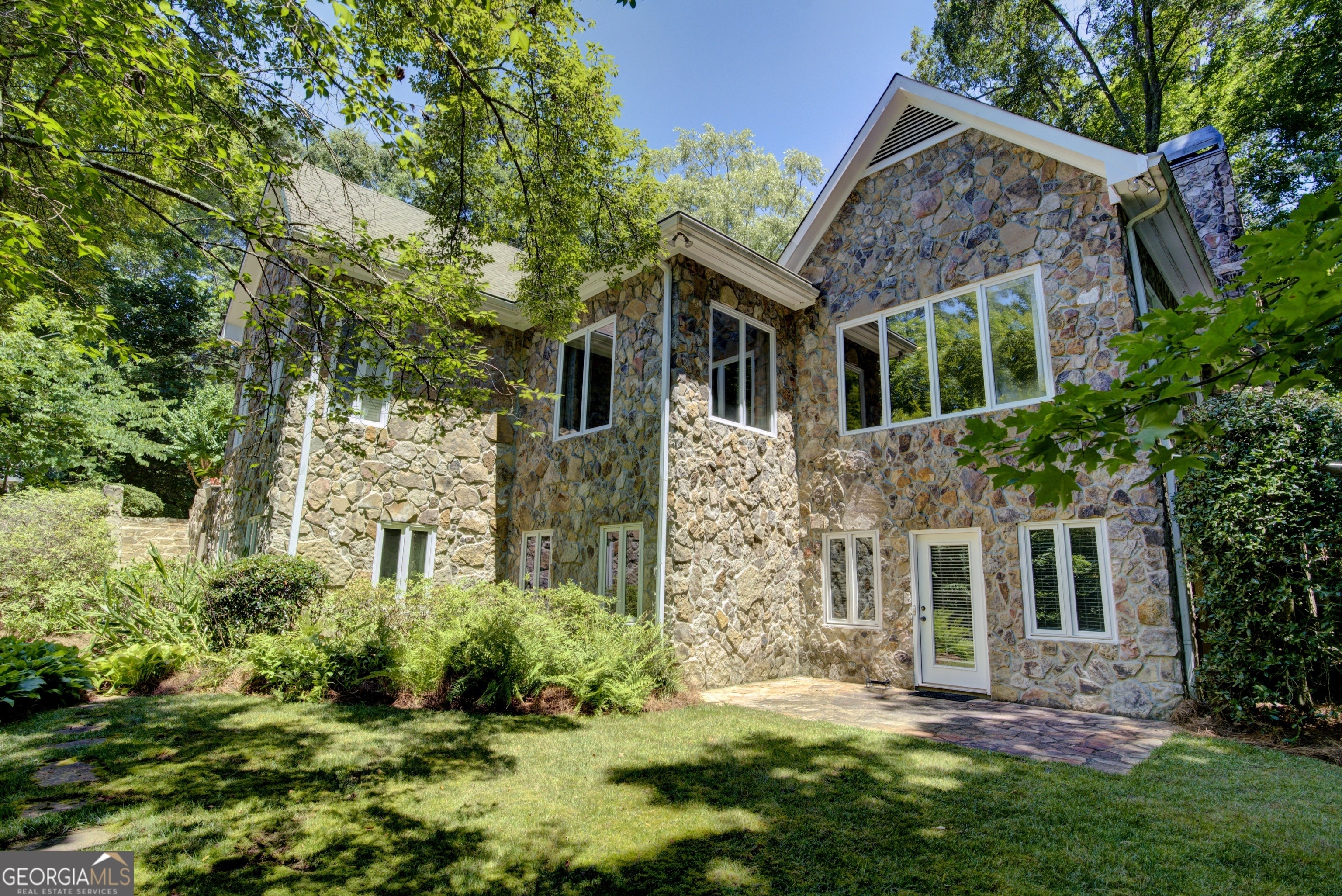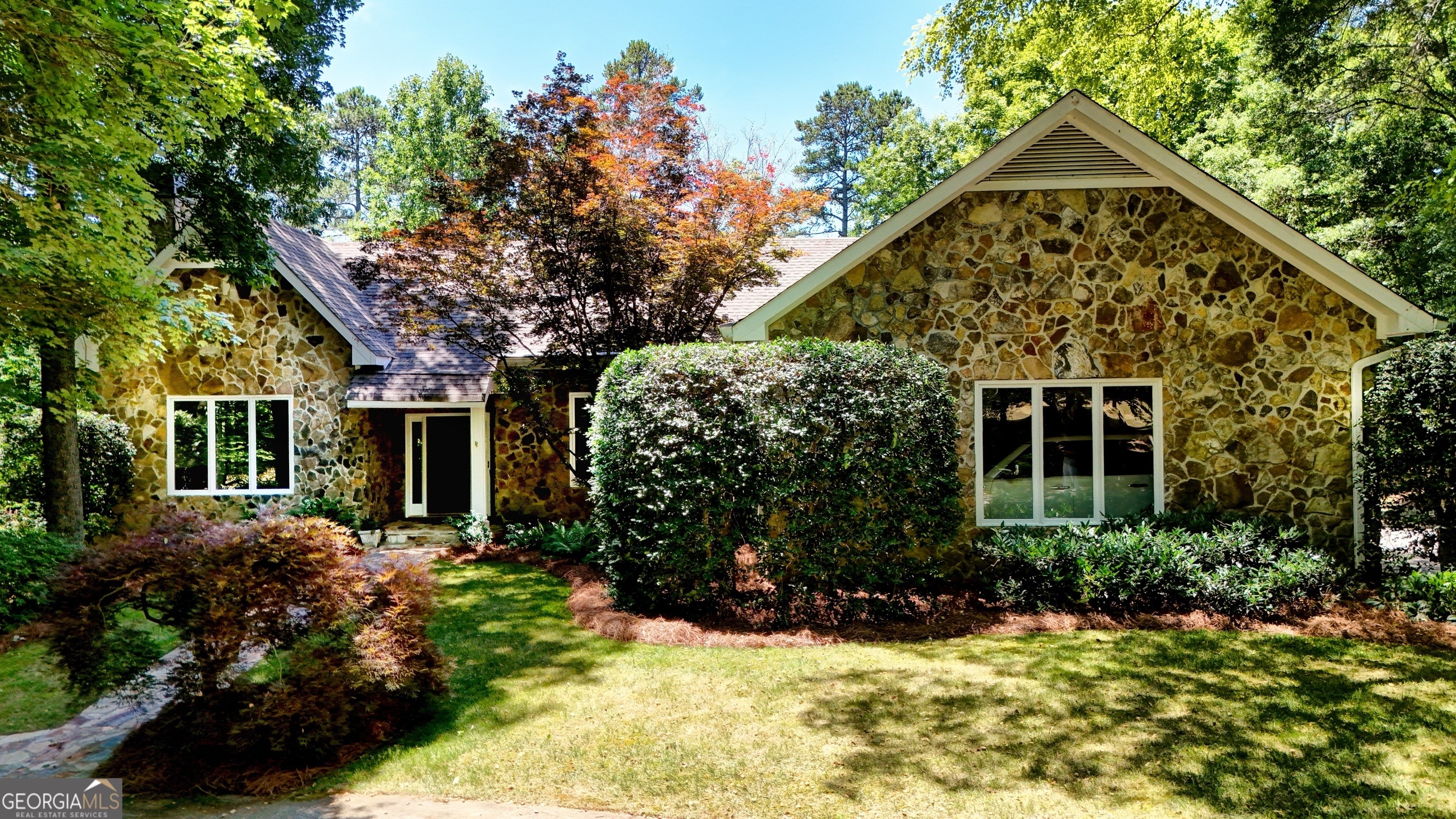 This home exudes warmth, tranquility, and privacy as it's nestled alongside the Etowah River. Imagine enjoying your morning cup of coffee as you sit on the stone patio, listening to the soothing sound of the river and overlooking the shoals of the Etowah River. This unique property offers 230 feet of river frontage and 6.55AC, allowing both plenty of privacy while still getting to enjoy the benefits of the desirable Shoals Ferry neighborhood. The former owner was a master gardener and is evident in the abundant flowers, plants, and thoughtfully planned landscape. Once you enter the lovely stone home, one first notices the gorgeous heart of pine hardwood that runs throughout the main floor and the natural light from the large windows. The main floor features a spacious foyer, large living room, sunroom, executive office, formal dining room, kitchen/family room, walk-in pantry, laundry room, powder room, and primary bedroom. On the terrace level, there are 3 large bedrooms, 2 baths, and a semi-finished bonus room. This rare property will not last long on the market. Book your appointment today!