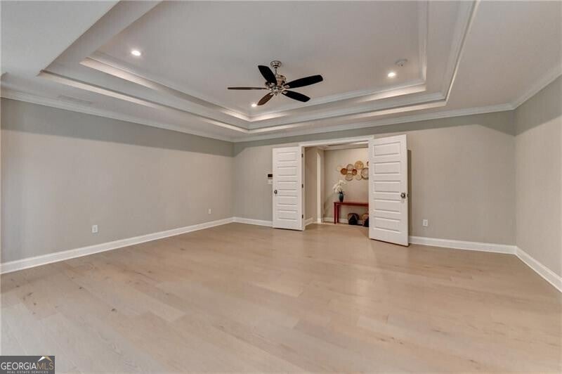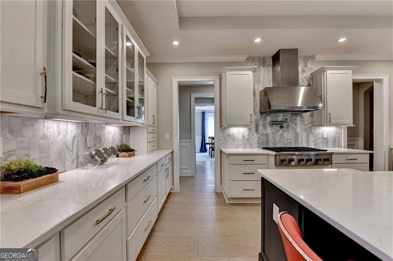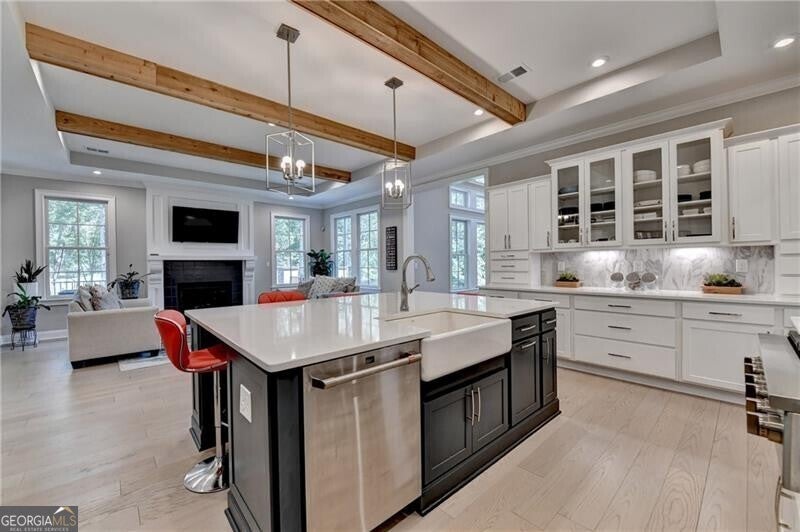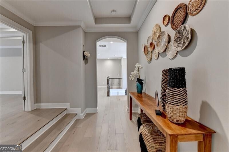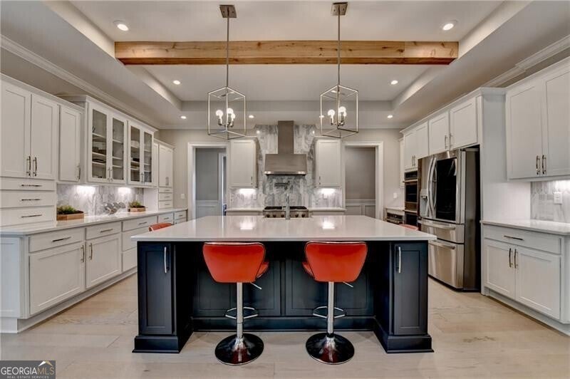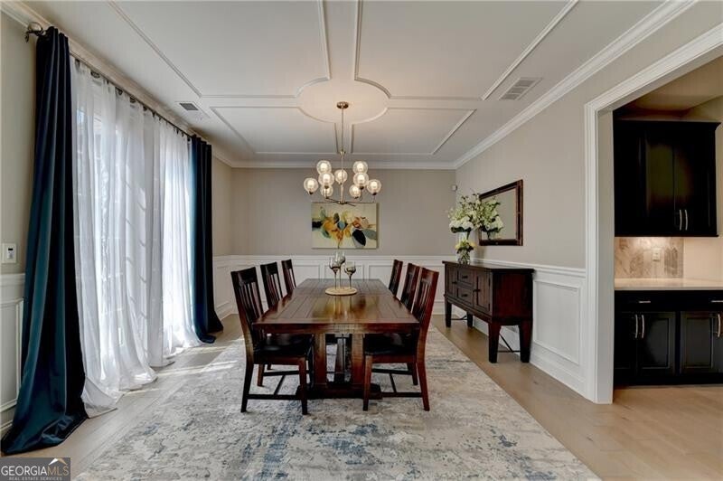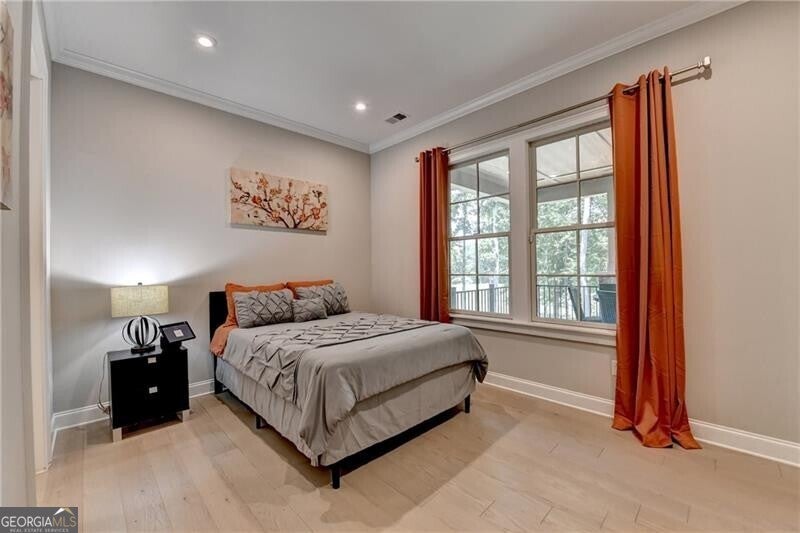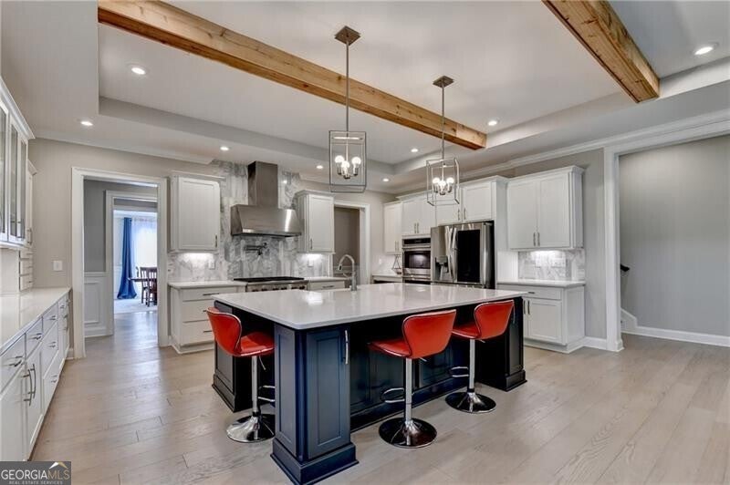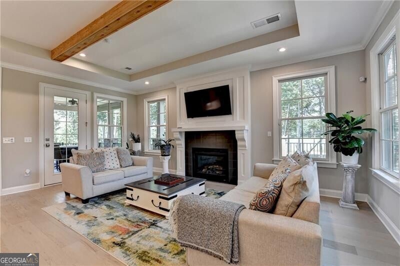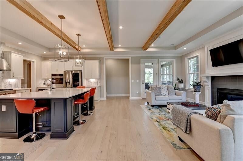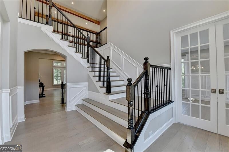 Welcome to this stunning, nearly-new home situated on the 9th fairway of the Rees Jones-designed Echelon Golf Club! Boasting over 8,000 square feet of exquisite finishes, this residence offers space and luxury for everyone. Step into the impressive two-story foyer with a grand staircase and beautiful white oak flooring throughout the main level. To your right, you'll find a spacious home office with glass French doors and a closet for convenient storage. To the left, the banquet-sized dining room provides the perfect setting for memorable gatherings and entertaining. A well-appointed butler's pantry features custom cabinetry and quartz countertops, making it easy to serve friends and family. The chef's kitchen is a true dream, equipped with stainless steel appliances, including a six-burner Cafe gas cooktop, double ovens, built-in microwave, pot filler faucet, and a French door refrigerator. The enormous center island offers ample counter space and seating, while custom-painted cabinetry ensures storage for all your culinary needs. An adjacent walk-in pantry with solid wood shelving provides even more space for your family's essentials. Open to the kitchen is the inviting keeping room, complete with a stone fireplace and tray ceiling. Step out onto the spacious covered composite deck or the open deck ideal for grilling and enjoying breathtaking views of the pristine golf course. The two-story great room features another stone fireplace and soaring glass windows overlooking the fairway. A guest bedroom with a full bath and a powder room are conveniently located on the main level. Upstairs, accessible by one of two staircases, you'll discover four generous bedrooms. The Primary Suite offers a grand entrance, a large bedroom, an elegant sitting room with fireplace, white oak flooring, and a spa-like bath with a glass-enclosed shower, separate soaking tub, dual vanities, and beautiful custom cabinetry with linen storage. One bedroom has a private bath, while the other two share a bath, each with its own vanity. The finished terrace level is perfect for entertaining large groups, featuring an expansive wet bar with dishwasher, under-counter refrigeration, custom cabinetry, quartz countertops, and a full-size refrigerator. Walk out to a deck overlooking the golf course, or enjoy the recently added home theater ideal for sports and movie nights! Echelon Golf Club is ranked 11th out of 400 Georgia courses by Golf Digest, offering players a formidable test of skill across rolling hills, varied elevations, and stunning vistas on its 600-acre property.