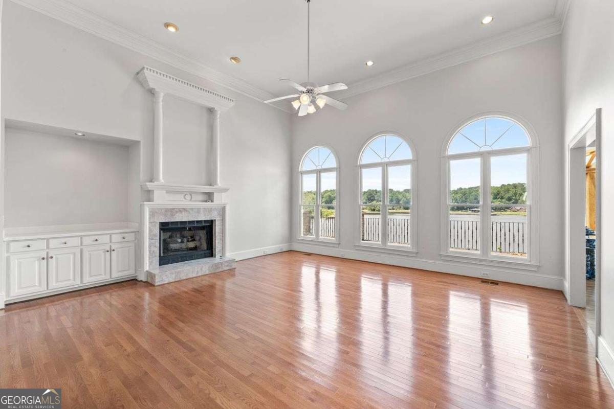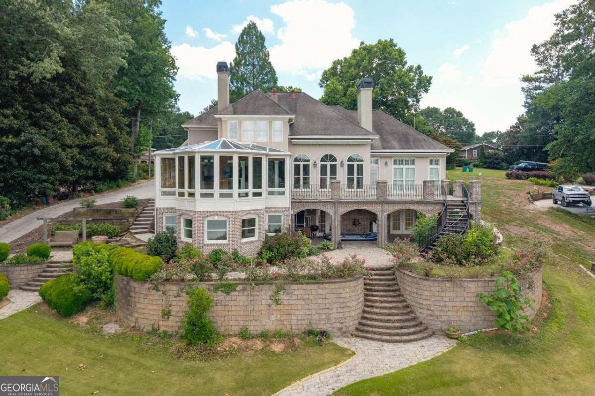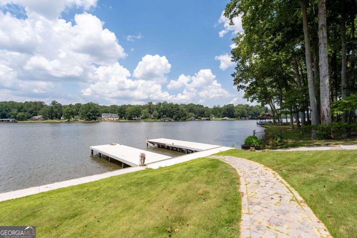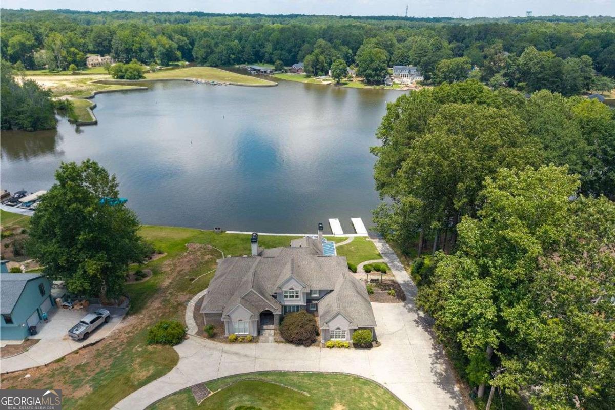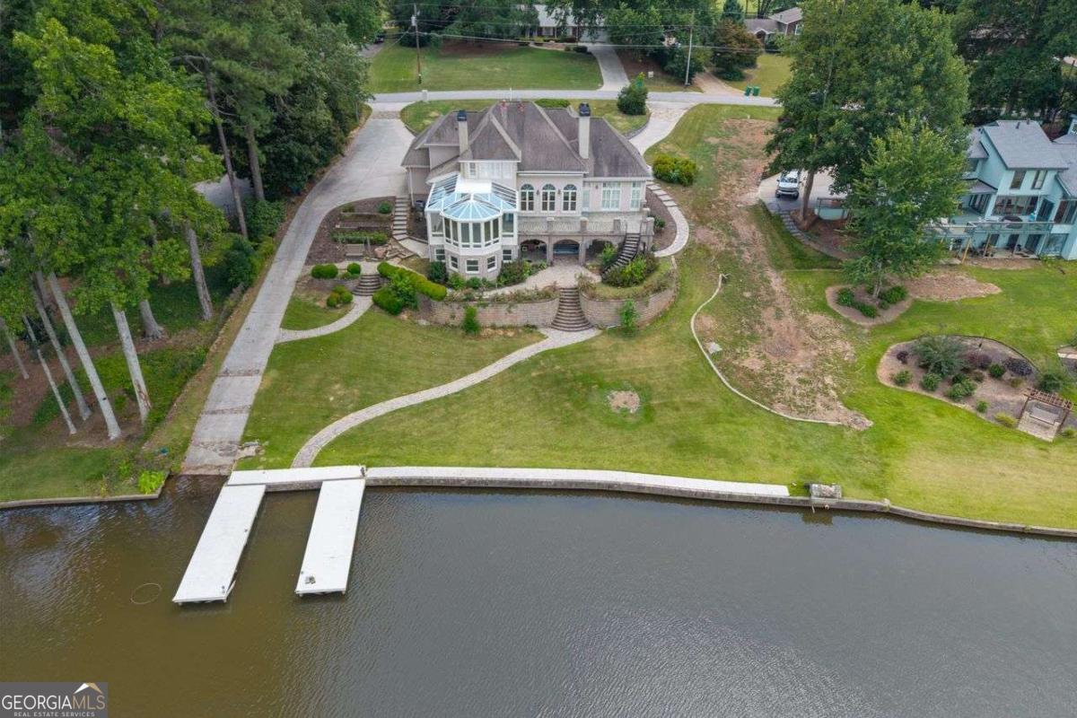 Welcome to a lifestyle of refined elegance and serene waterfront living. Nestled in the highly sought-after Lake Spivey community, this magnificent residence is a masterclass in architectural beauty and sophisticated comfort. From the moment you step into the soaring two-story foyer with its floating staircase and an abundance of natural light, you'll be captivated by the sense of grandeur and grace that defines every inch of this home. Designed for both everyday living and luxurious entertaining, the open-concept eat-in kitchen is a culinary dream featuring gleaming granite countertops, crisp white cabinetry, dual ovens, and a stunning three-sided fireplace that also warms the adjoining custom sunroom. Here, walls of windows frame panoramic lake views, creating a seamless indoor-outdoor ambiance that invites relaxation. The main level showcases thoughtful functionality with a formal dining room, a refined study or office, and a gracious living area - all adorned with fine finishes and classic design elements. The primary suite is a true private retreat with its own fireplace, a spa-inspired ensuite bath boasting double vanities, a soaking garden tub, and a separate glass-enclosed shower. Downstairs, the daylight terrace level offers a spacious additional family room with fireplace, flexible rooms ideal for guest suites, a home gym, or a second office - perfectly suited to your evolving needs. Step outside to your private boat dock and embrace the rare opportunity to own direct access to one of Georgia's most cherished private lakes. Whether you're boating at sunset, entertaining on the water, or simply enjoying the view, every moment here feels like a luxurious escape.