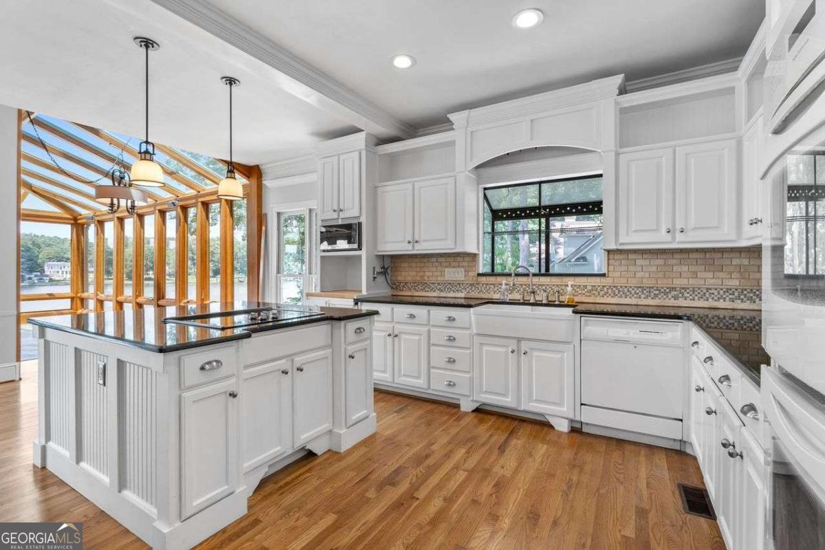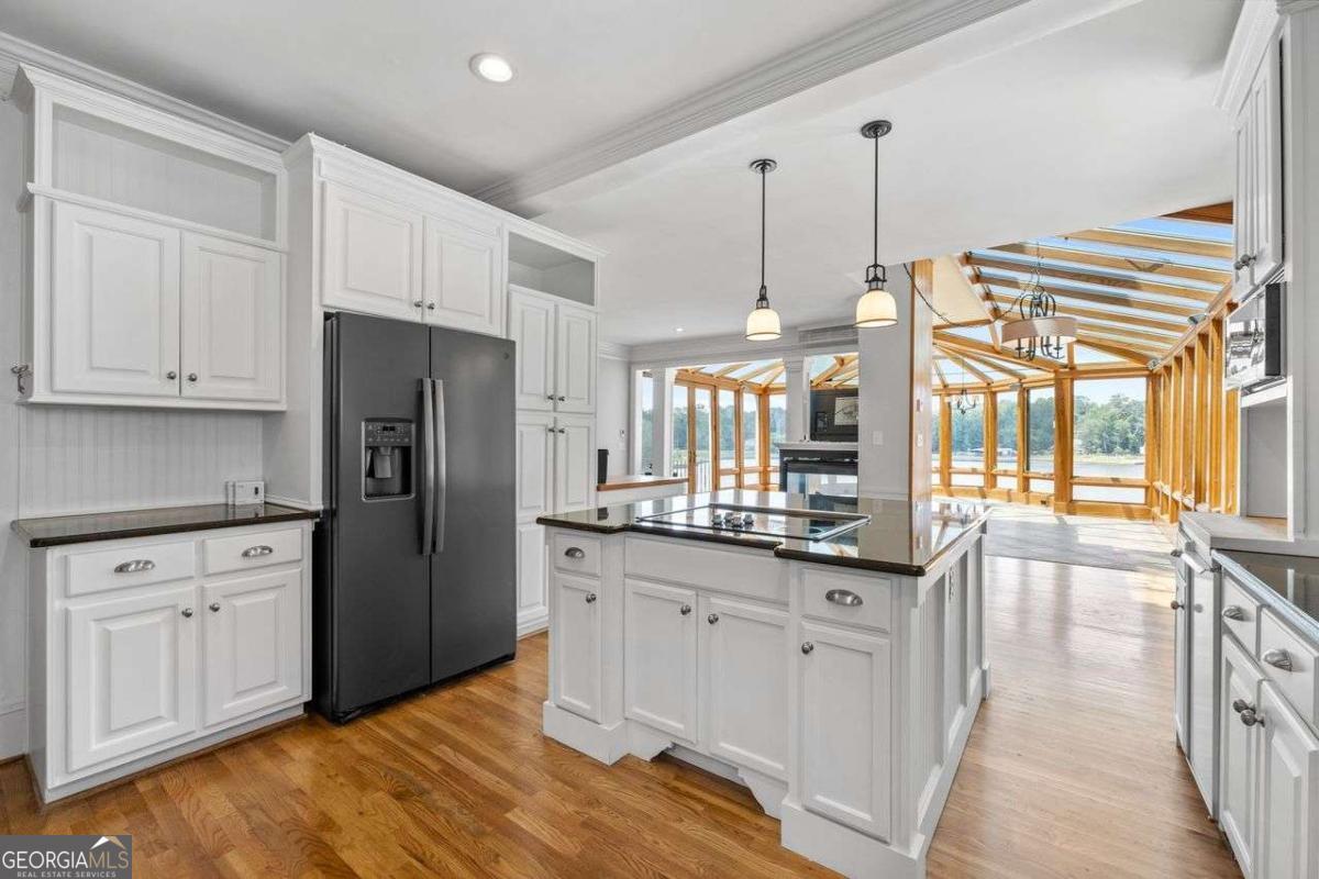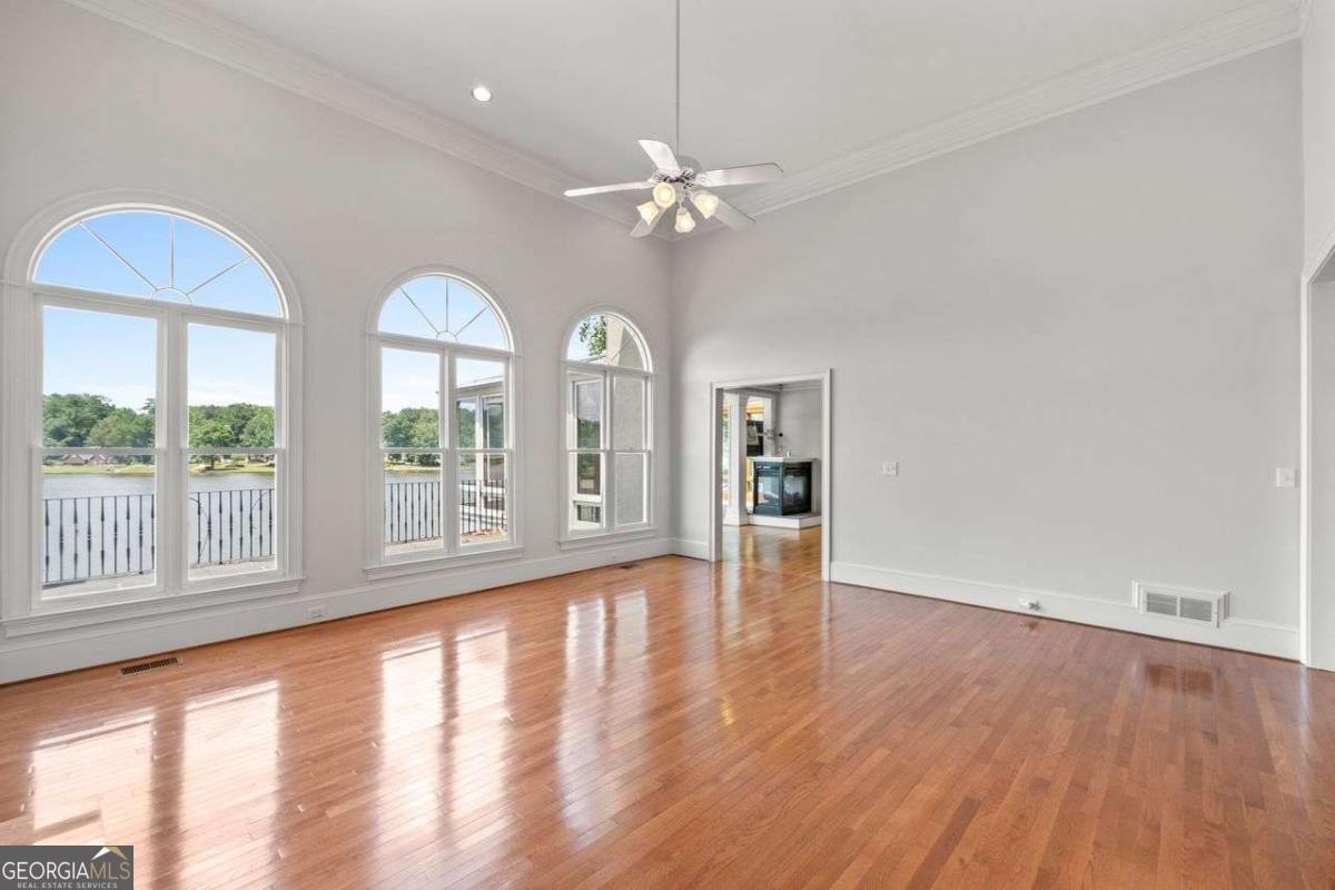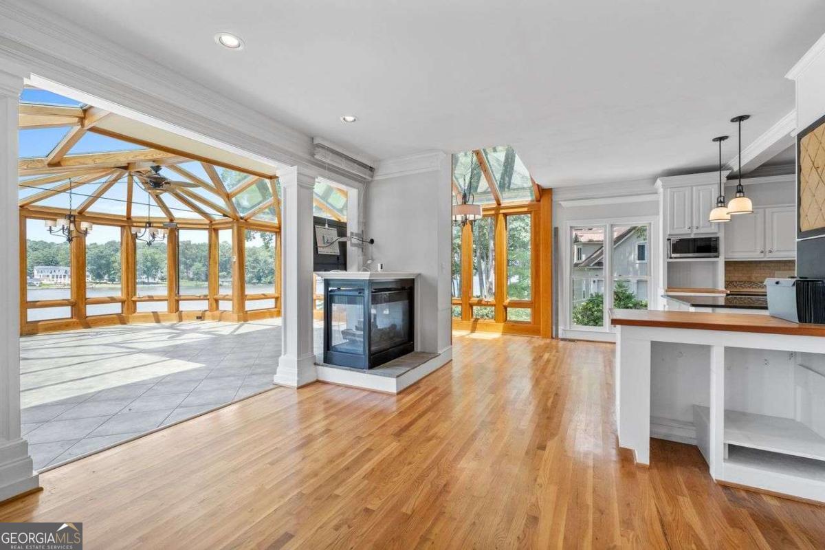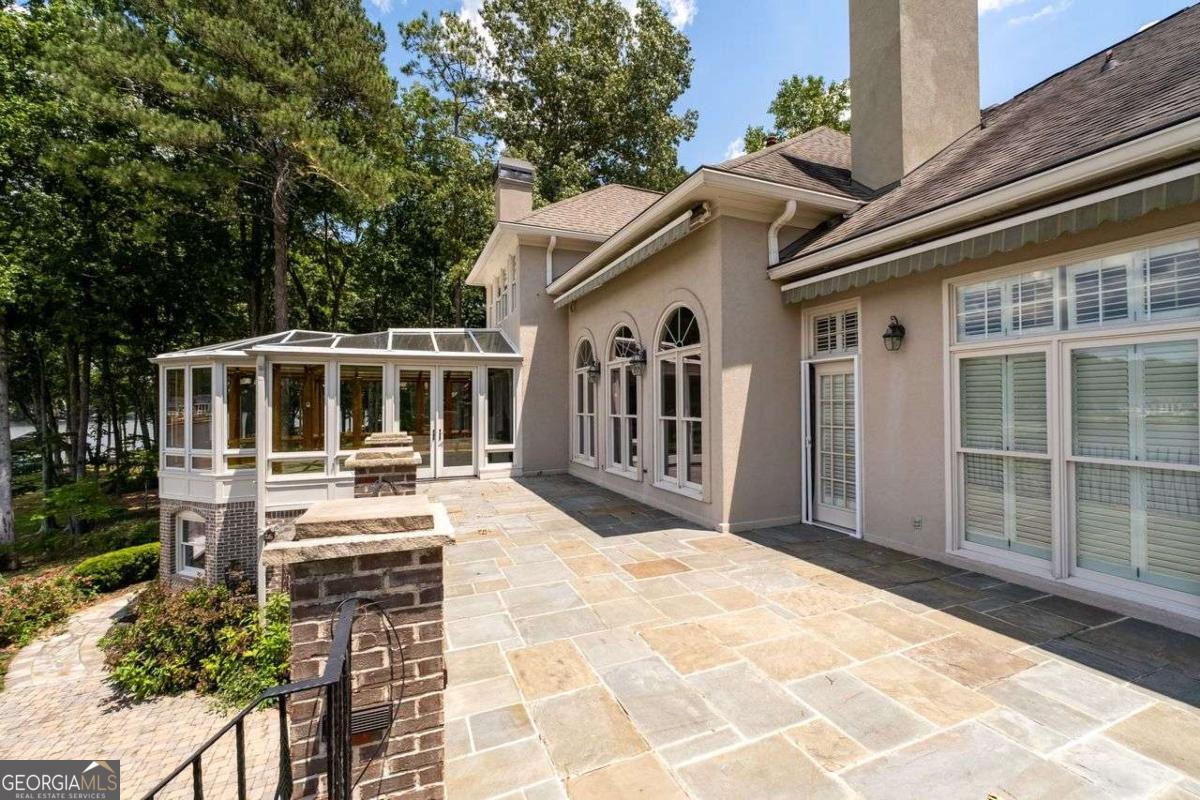 Welcome to a lifestyle of refined elegance and serene waterfront living. Nestled in the highly sought-after Lake Spivey community, this magnificent residence is a masterclass in architectural beauty and sophisticated comfort. From the moment you step into the soaring two-story foyer with its floating staircase and an abundance of natural light, you'll be captivated by the sense of grandeur and grace that defines every inch of this home. Designed for both everyday living and luxurious entertaining, the open-concept eat-in kitchen is a culinary dream featuring gleaming granite countertops, crisp white cabinetry, dual ovens, and a stunning three-sided fireplace that also warms the adjoining custom sunroom. Here, walls of windows frame panoramic lake views, creating a seamless indoor-outdoor ambiance that invites relaxation. The main level showcases thoughtful functionality with a formal dining room, a refined study or office, and a gracious living area - all adorned with fine finishes and classic design elements. The primary suite is a true private retreat with its own fireplace, a spa-inspired ensuite bath boasting double vanities, a soaking garden tub, and a separate glass-enclosed shower. Downstairs, the daylight terrace level offers a spacious additional family room with fireplace, flexible rooms ideal for guest suites, a home gym, or a second office - perfectly suited to your evolving needs. Step outside to your private boat dock and embrace the rare opportunity to own direct access to one of Georgia's most cherished private lakes. Whether you're boating at sunset, entertaining on the water, or simply enjoying the view, every moment here feels like a luxurious escape.