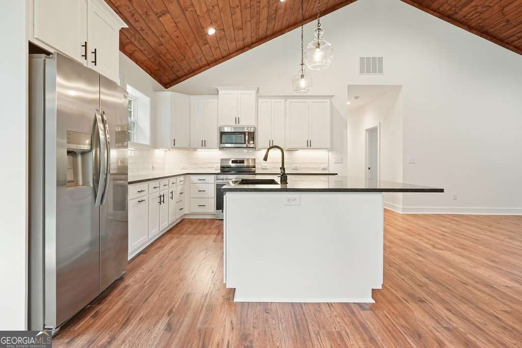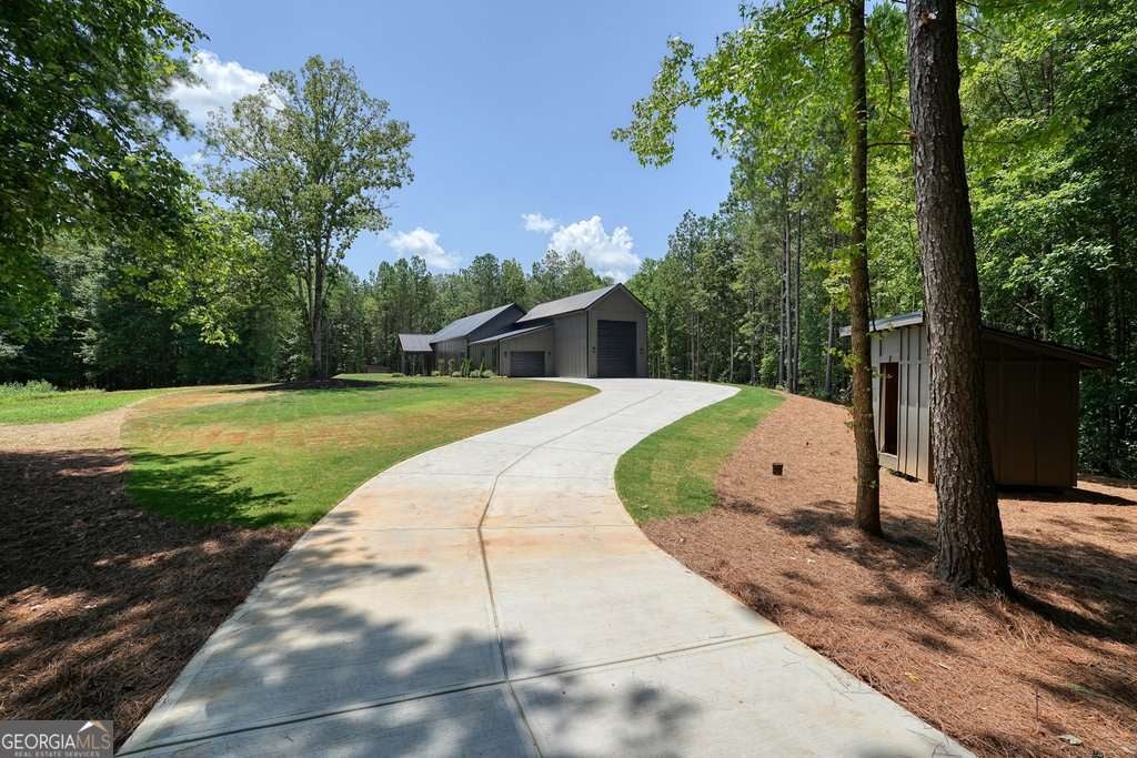 This stunning barndominium sits on 3.71 level acres with no HOA and offers a rare opportunity for a private retreat or future family compound, adjoining four additional lots-two already graded and build-ready, with completed soil reports for all-perfect for future builds, investment potential, or added privacy. (These adjoining lots are available to purchase separately and do not convey with the home.) The single-level home features open-concept living with vaulted ceilings, recessed lighting, and durable laminate flooring, a spacious kitchen with white cabinetry, gorgeous countertops, a large island, and walk-in pantry, plus a custom oversized stained front door that adds natural light and character. The expansive primary suite boasts a spa-like bath with a massive tiled walk-in shower with wall-to-wall bench and double vanity. A main-level laundry includes a utility sink and generous counter space. The oversized attached garage accommodates an RV or motorhome with a 12x16 door, 37-foot depth, and prewired RV plug, while a separate side-entry 1-car garage with opener provides flexibility. Outdoor features include a covered front porch, two detached sheds, landscaped yard, public water, a dug well (pump required), and a backup generator with a 250-gallon propane tank (not currently hooked up).