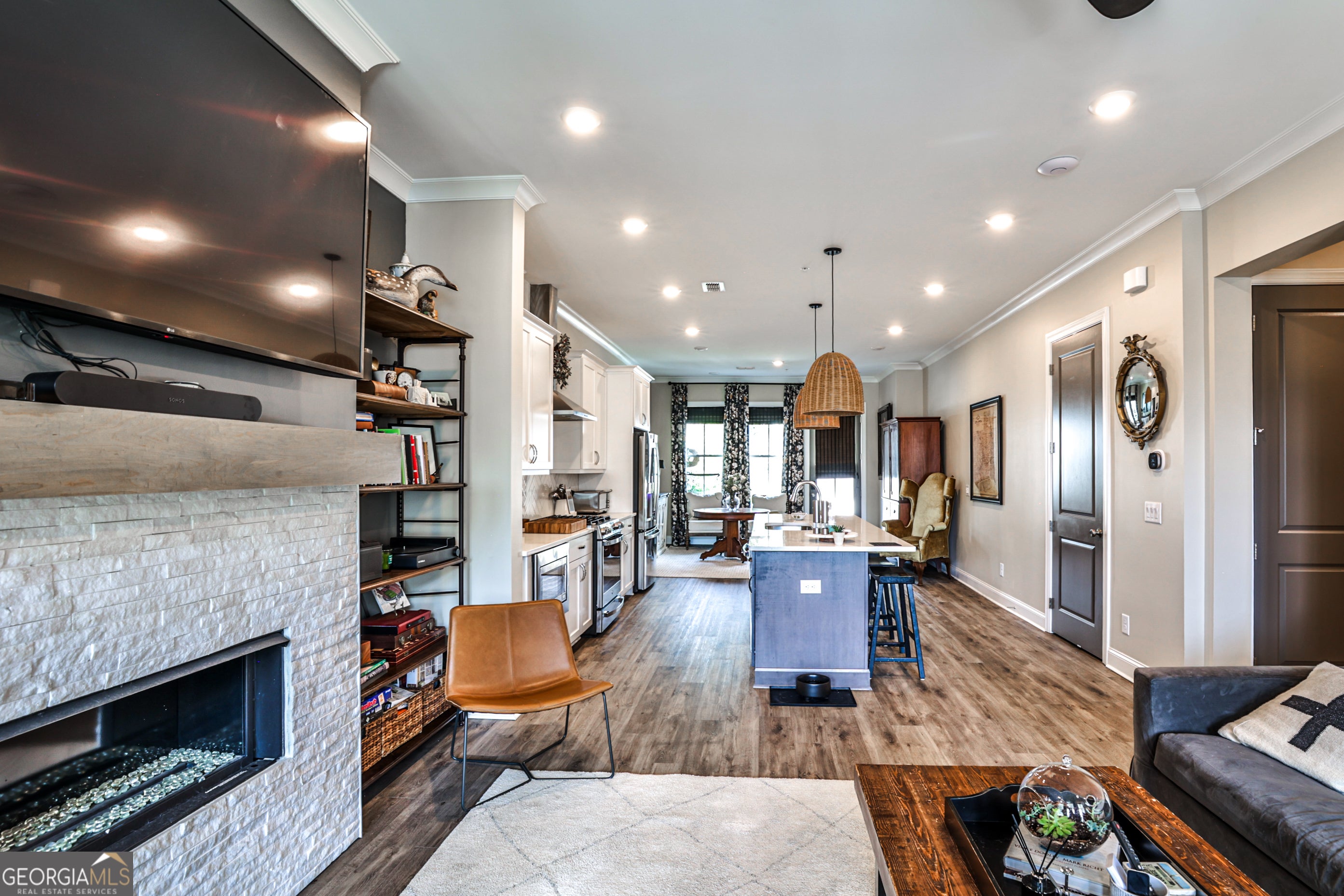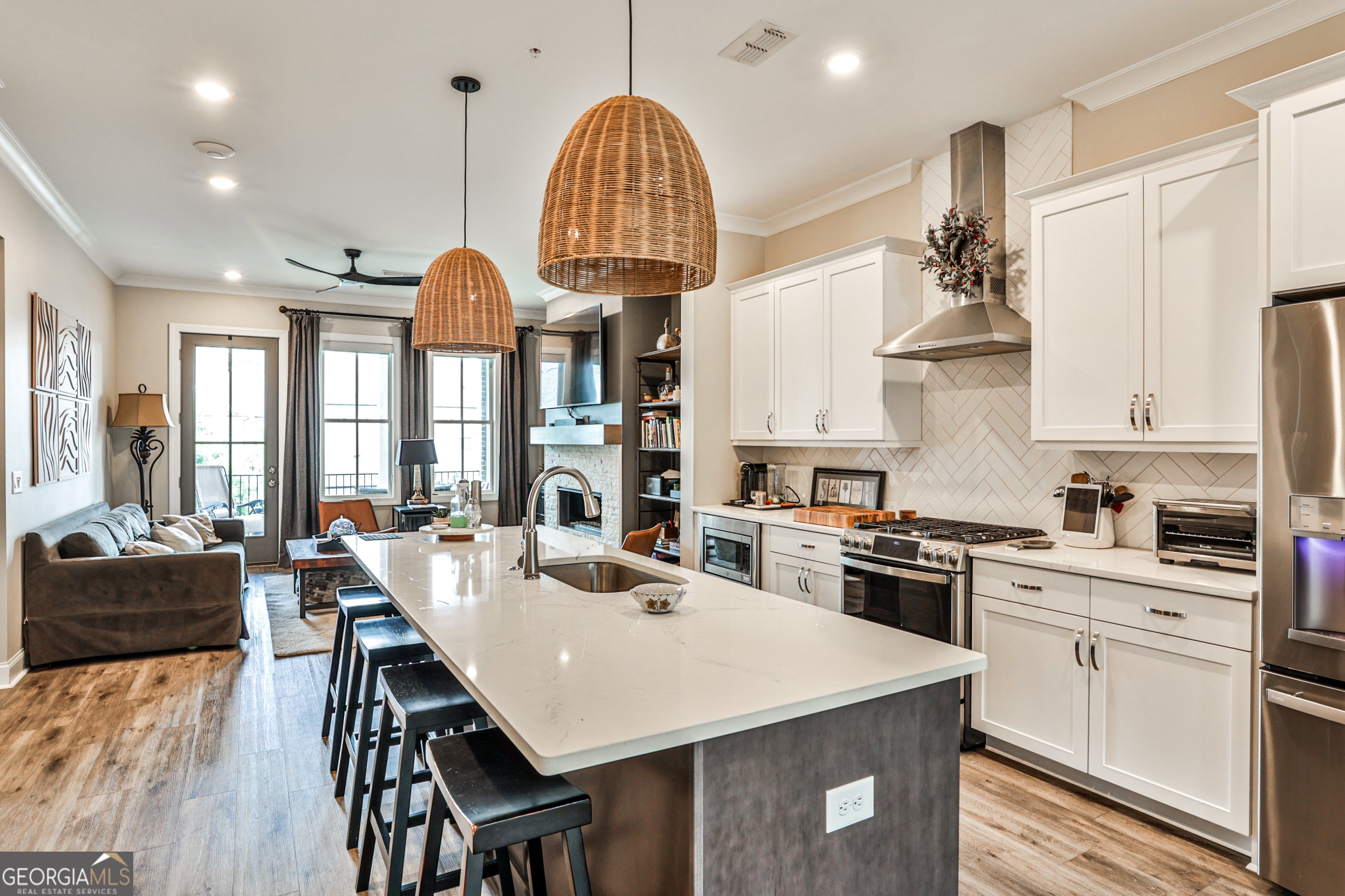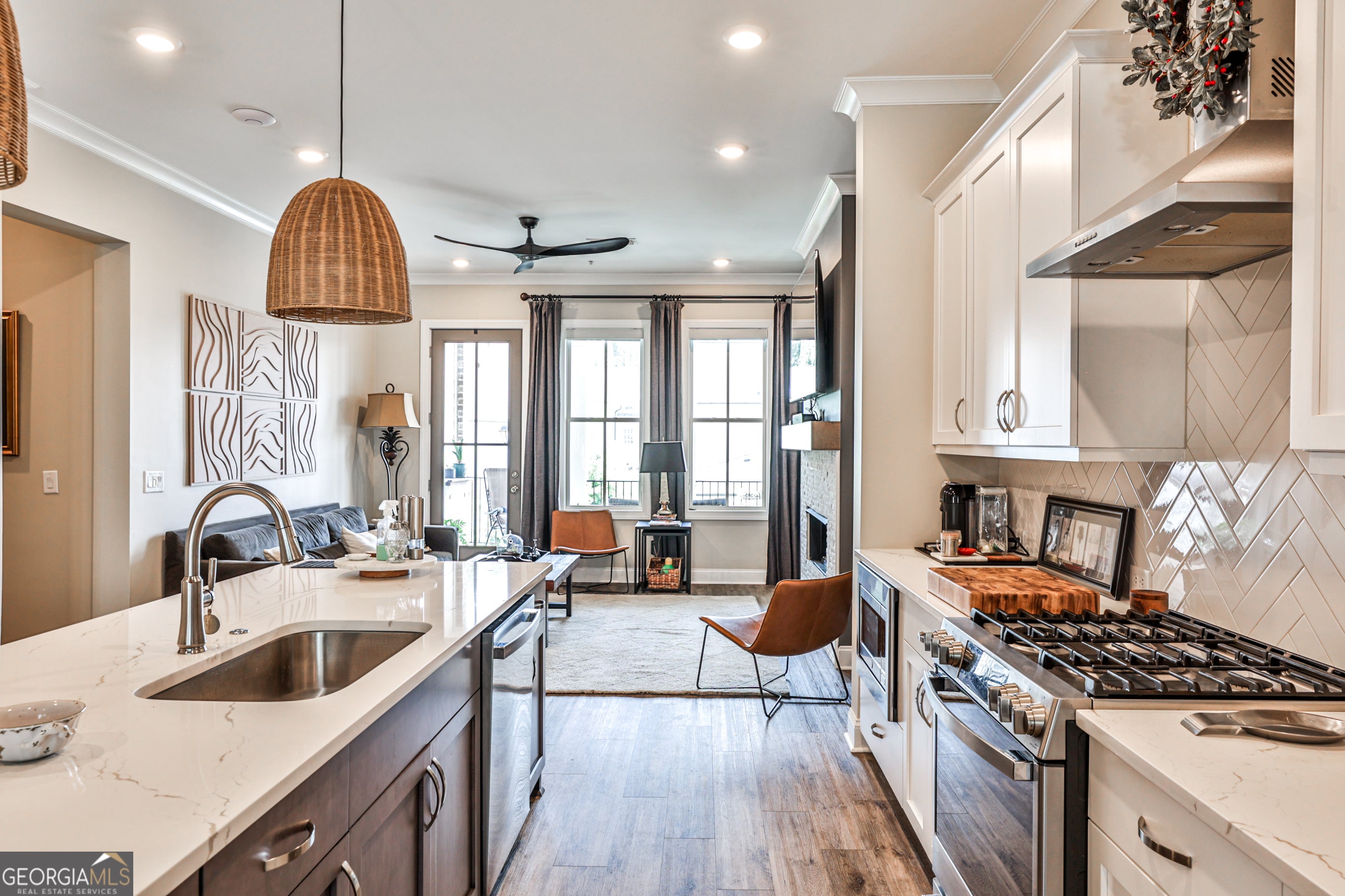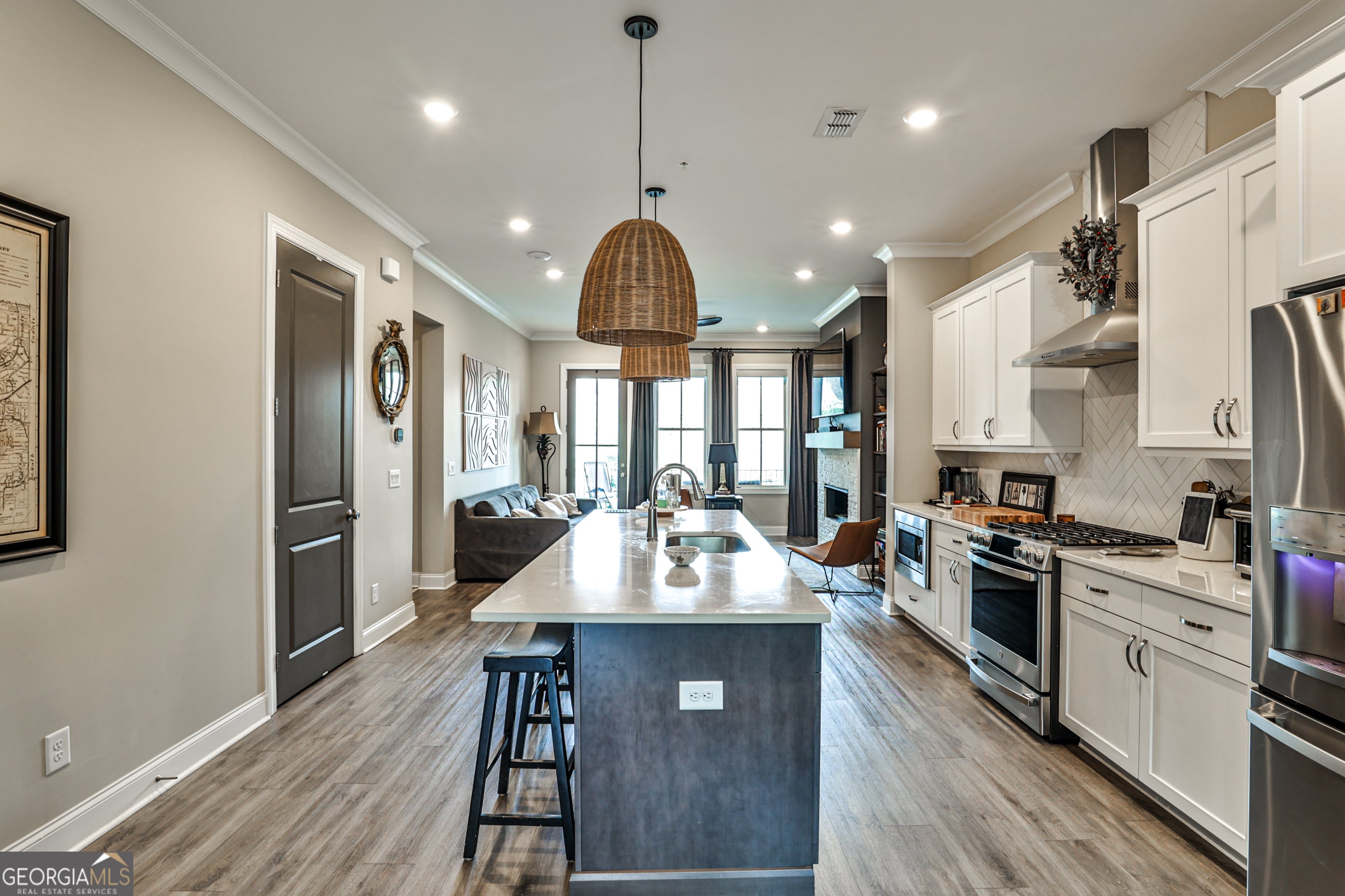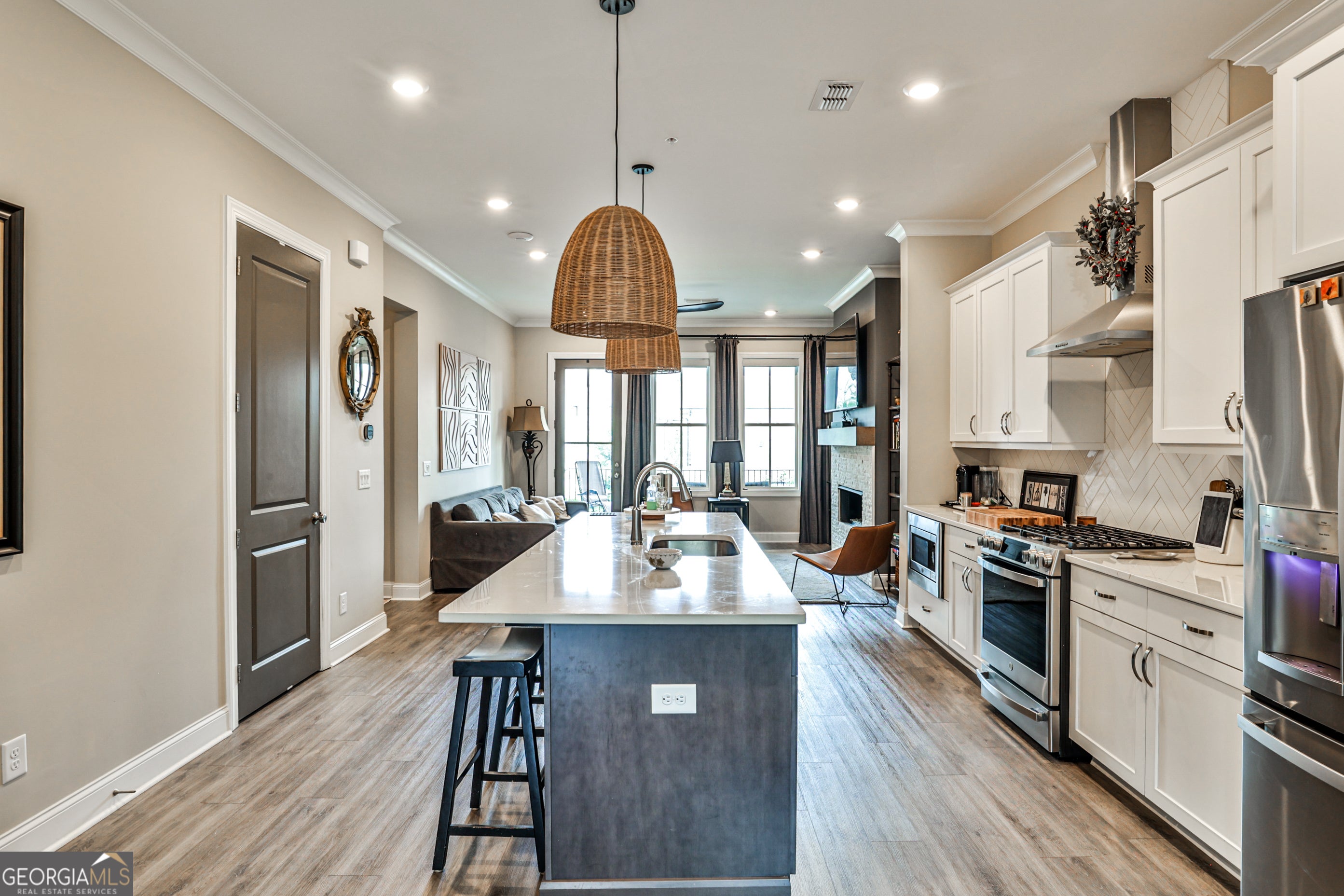 Welcome to 4965 Sealy Circle - a beautifully crafted, move-in ready condo nestled in the prestigious gated community of Waterside in Peachtree Corners. This immaculate 2-bedroom, 2-bath home offers the perfect blend of upscale finishes, functional design, and low-maintenance living - all just minutes from The Forum, top schools, and the scenic Chattahoochee River. Step inside to discover a bright, open-concept floor plan with soaring 10-foot ceilings, oversized windows, and designer touches throughout. The gourmet kitchen is the heart of the home, featuring Cambria Marble countertops, a large island with seating, stainless steel appliances, and a walk-in pantry. The spacious living room flows seamlessly to a private covered patio - perfect for relaxing or entertaining. Waterside is a gated, master-planned community offering luxury amenities including a resort-style pool, clubhouse, fitness center, pickleball courts, walking trails, and direct access to the Chattahoochee River. HOA includes lawn maintenance and exterior upkeep for a lock-and-leave lifestyle. Don't miss your opportunity to live in one of Peachtree Corners' most desirable communities - where nature, luxury, and convenience come together.