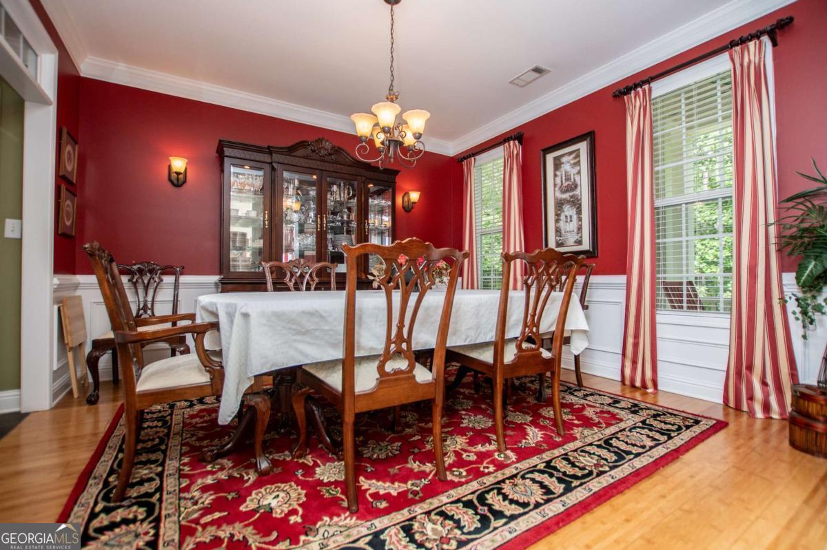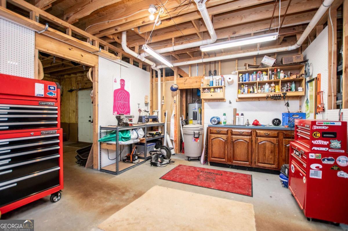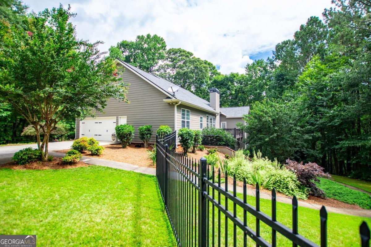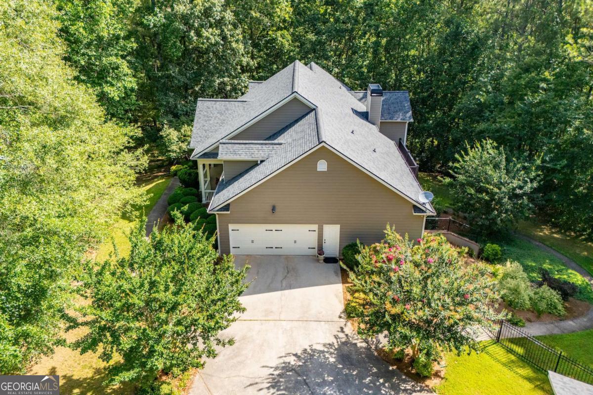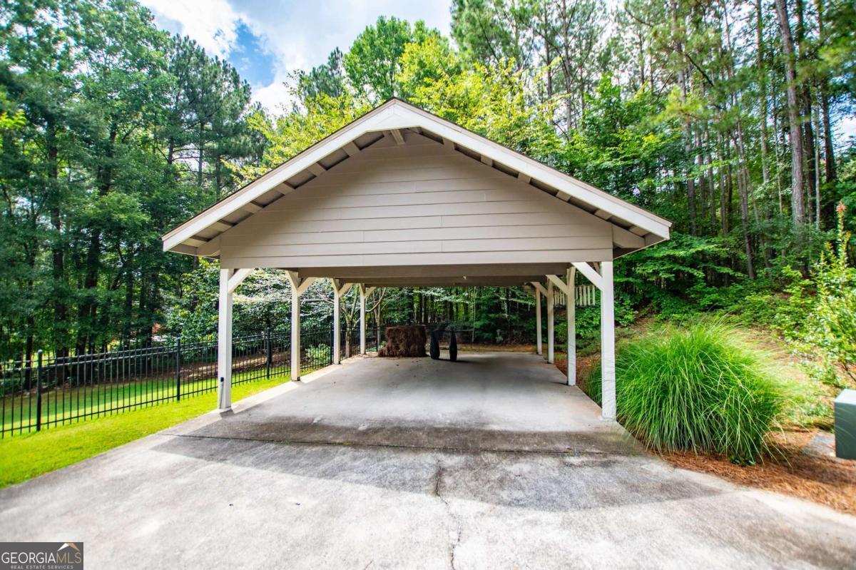Welcome to your dream home-a beautifully designed Frank Betz ranch-style floor plan set on 3 serene and private acres. Tucked away down a long private driveway, this spacious 5-bedroom, 4-bathroom residence offers the perfect blend of comfort, luxury, and functionality. Main level highlights include gorgeous custom hardwood floors and soaring ceilings that create a grand yet inviting atmosphere. The Spacious family room includes a cozy gas fireplace, high ceilings, abundant natural light, and seamless flow to the formal dining room. Chef's kitchen is spacious and well-appointed with a large center island, eat-in breakfast area, and tons of counter and cabinet space-perfect for entertaining. The spacious owner's suite on the main floor encourages you to relax while enjoying a private retreat featuring double vanities, a spa tub, a separate shower, and a walk-in closet. Three Additional Bedrooms and two full baths offer space for family or guests. A walk-in laundry room with a sink on the main floor makes convenience a breeze! The finished basement is a show stopper with a complete family room with custom bar area, game room, home office, an additional guest room, full bath, and tons of storage including a large storm shelter for protection against sever storms and can double as additional storage, a dedicated workshop for DIY projects like wood working, repairs snd crafts and room for landscaping equipment! The outdoor living and features include a relaxing covered front porch, a large back deck for relaxing or entertaining, and a slab below ideal for gatherings or quiet relaxation! The spacious private backyard is fenced for pets, play, or gardening! Enjoy the sound of the bubbling creek along the backside of the property! Additional parking includes an attached 2-car garage and a detached custom-built covered 2 car carport perfect for additional vehicles or equipment! Don't miss this rare opportunity to own a private retreat that feels like a getaway-but with all the comforts of home. Just 10 minutes to I-20, 30 minutes to Downtown ATL or 45 Minutes to Hartsfield/Jackson Airport!