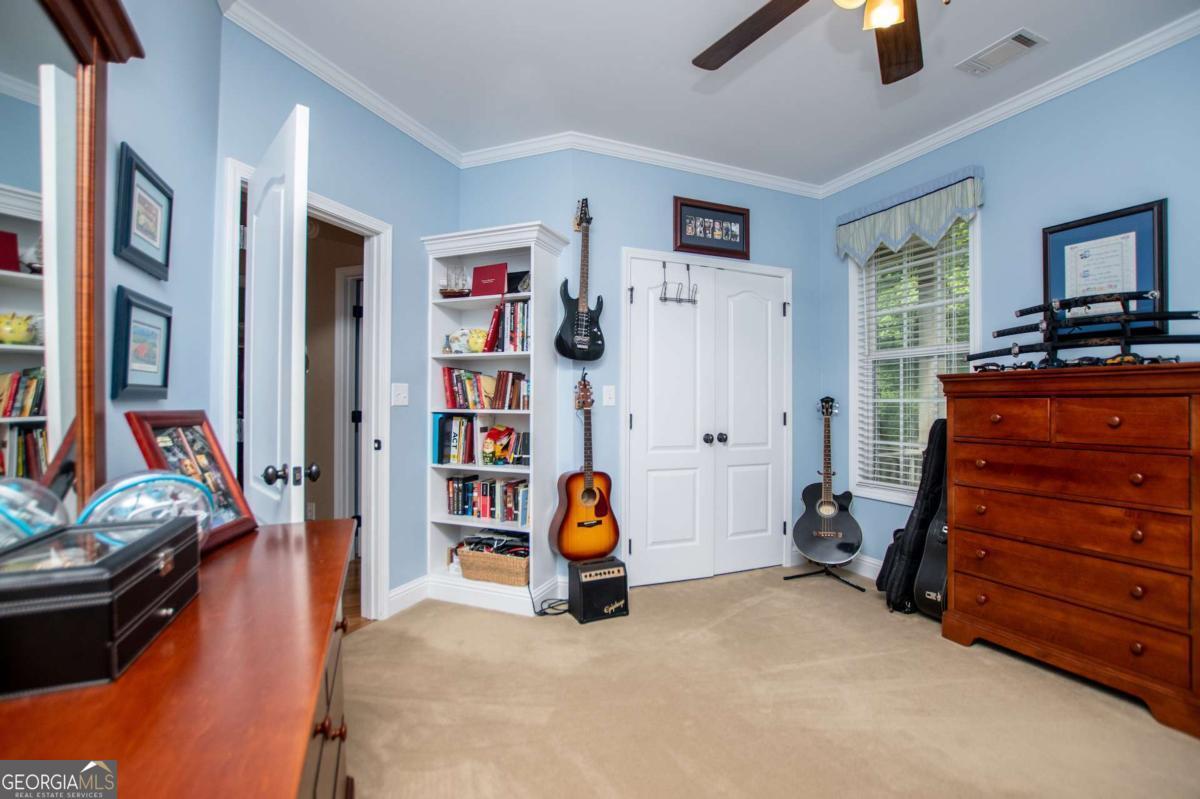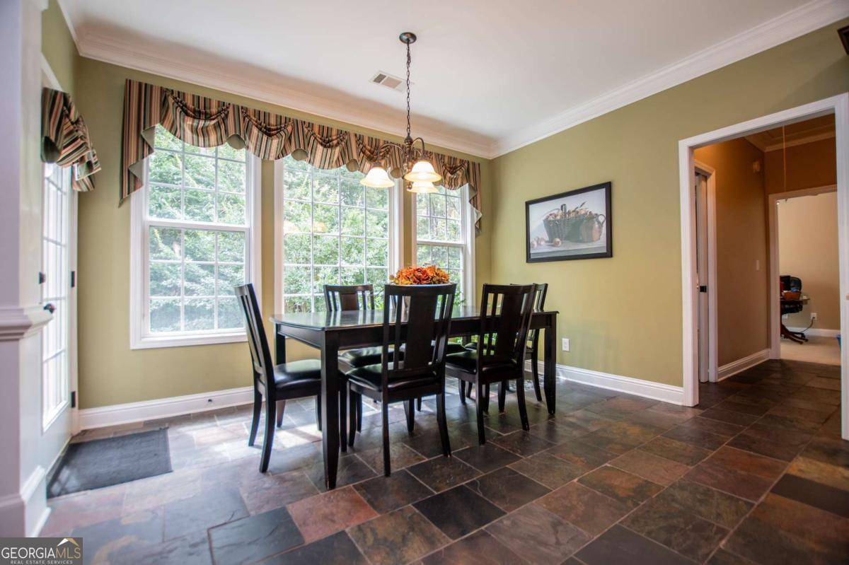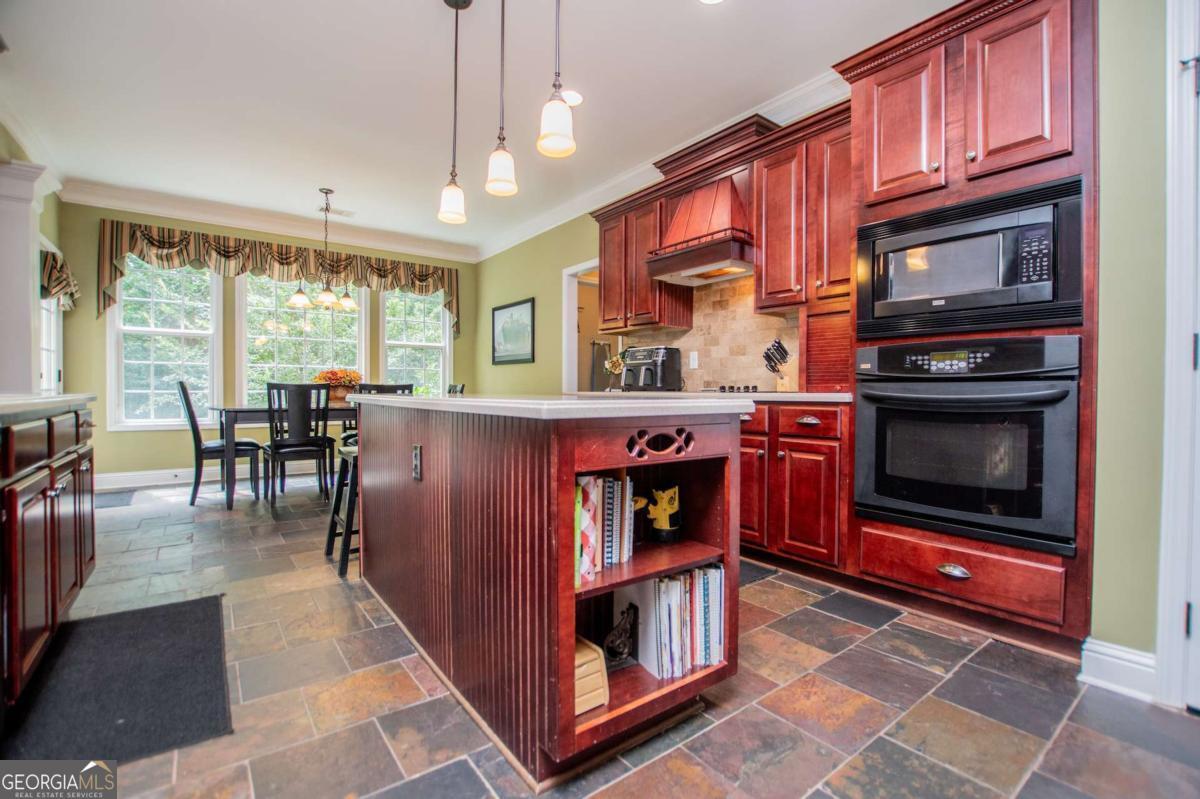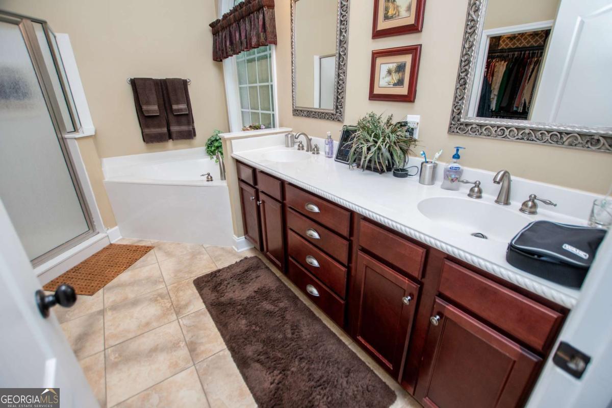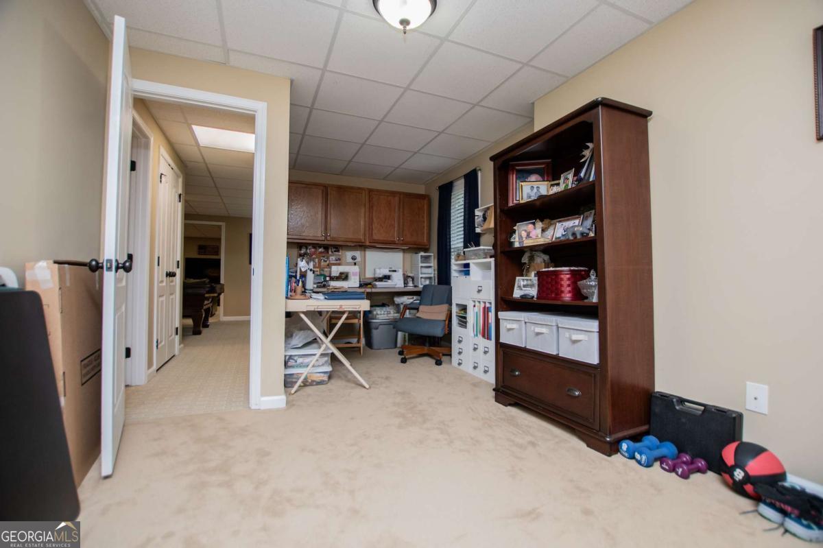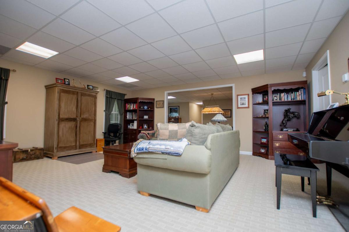 Welcome to your dream home-a beautifully designed Frank Betz ranch-style floor plan set on 3 serene and private acres. Tucked away down a long private driveway, this spacious 5-bedroom, 4-bathroom residence offers the perfect blend of comfort, luxury, and functionality. Main level highlights include gorgeous custom hardwood floors and soaring ceilings that create a grand yet inviting atmosphere. The Spacious family room includes a cozy gas fireplace, high ceilings, abundant natural light, and seamless flow to the formal dining room. Chef's kitchen is spacious and well-appointed with a large center island, eat-in breakfast area, and tons of counter and cabinet space-perfect for entertaining. The spacious owner's suite on the main floor encourages you to relax while enjoying a private retreat featuring double vanities, a spa tub, a separate shower, and a walk-in closet. Three Additional Bedrooms and two full baths offer space for family or guests. A walk-in laundry room with a sink on the main floor makes convenience a breeze! The finished basement is a show stopper with a complete family room with custom bar area, game room, home office, an additional guest room, full bath, and tons of storage including a large storm shelter for protection against sever storms and can double as additional storage, a dedicated workshop for DIY projects like wood working, repairs snd crafts and room for landscaping equipment! The outdoor living and features include a relaxing covered front porch, a large back deck for relaxing or entertaining, and a slab below ideal for gatherings or quiet relaxation! The spacious private backyard is fenced for pets, play, or gardening! Enjoy the sound of the bubbling creek along the backside of the property! Additional parking includes an attached 2-car garage and a detached custom-built covered 2 car carport perfect for additional vehicles or equipment! Don't miss this rare opportunity to own a private retreat that feels like a getaway-but with all the comforts of home. Just 10 minutes to I-20, 30 minutes to Downtown ATL or 45 Minutes to Hartsfield/Jackson Airport!
