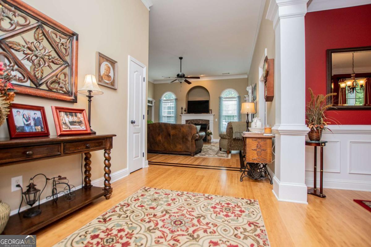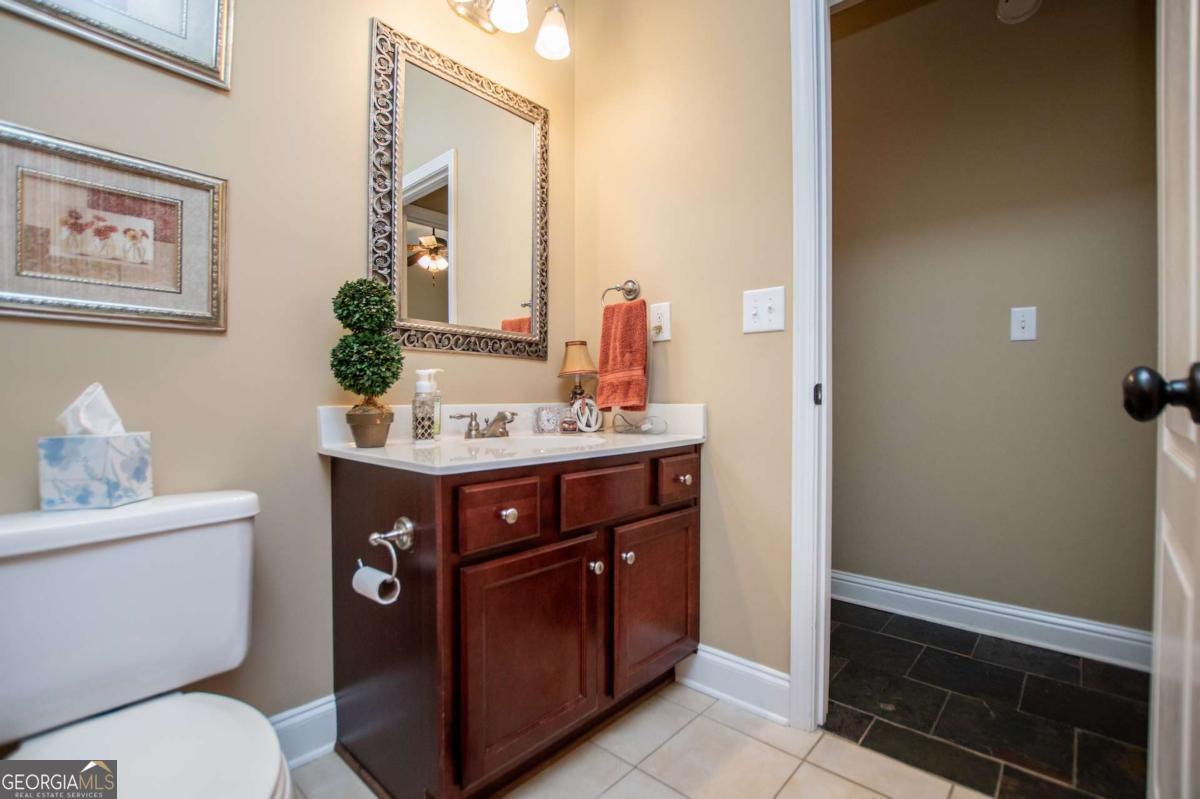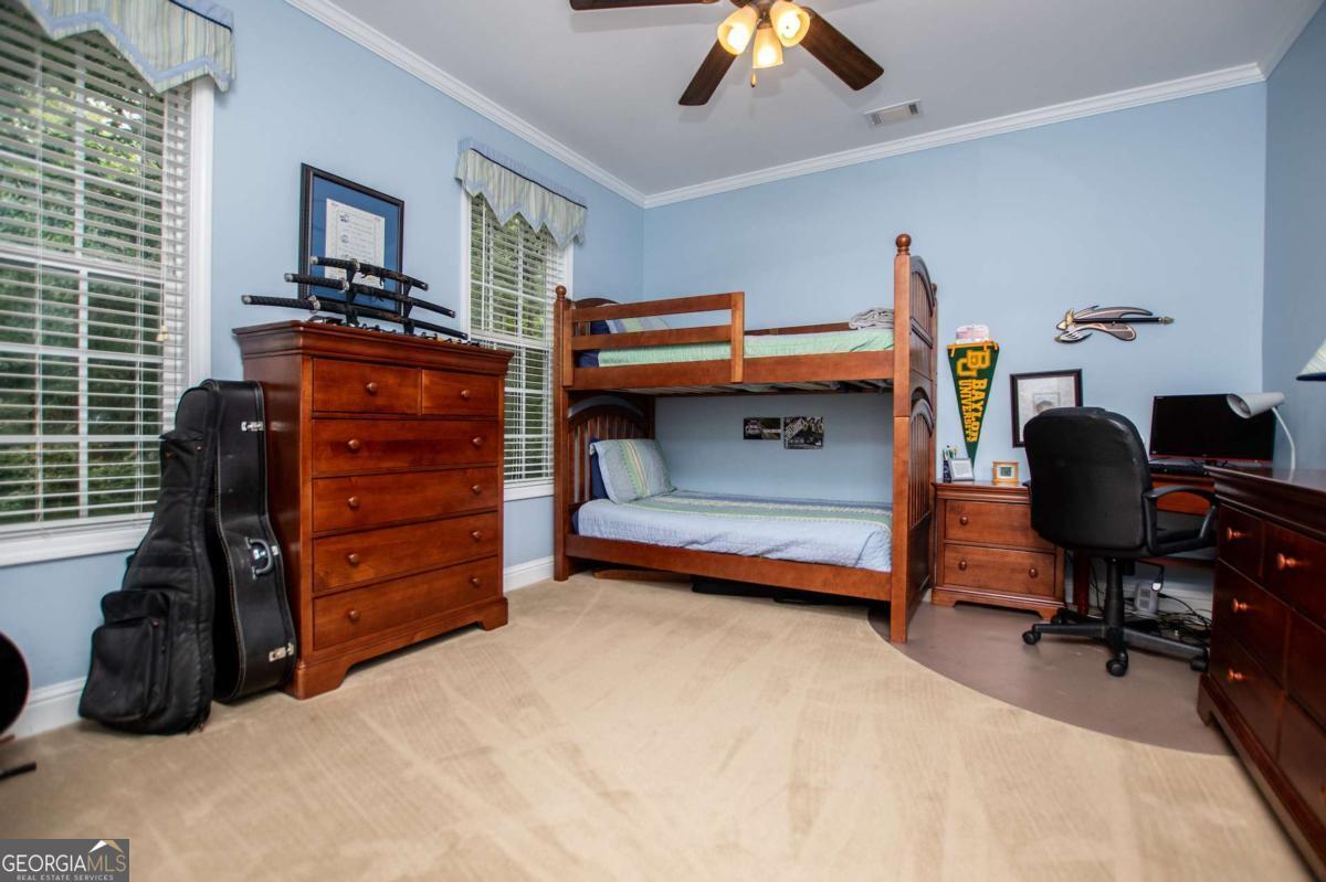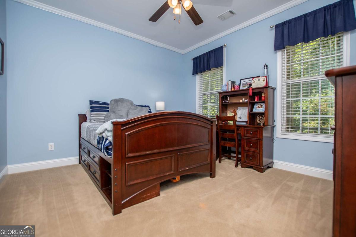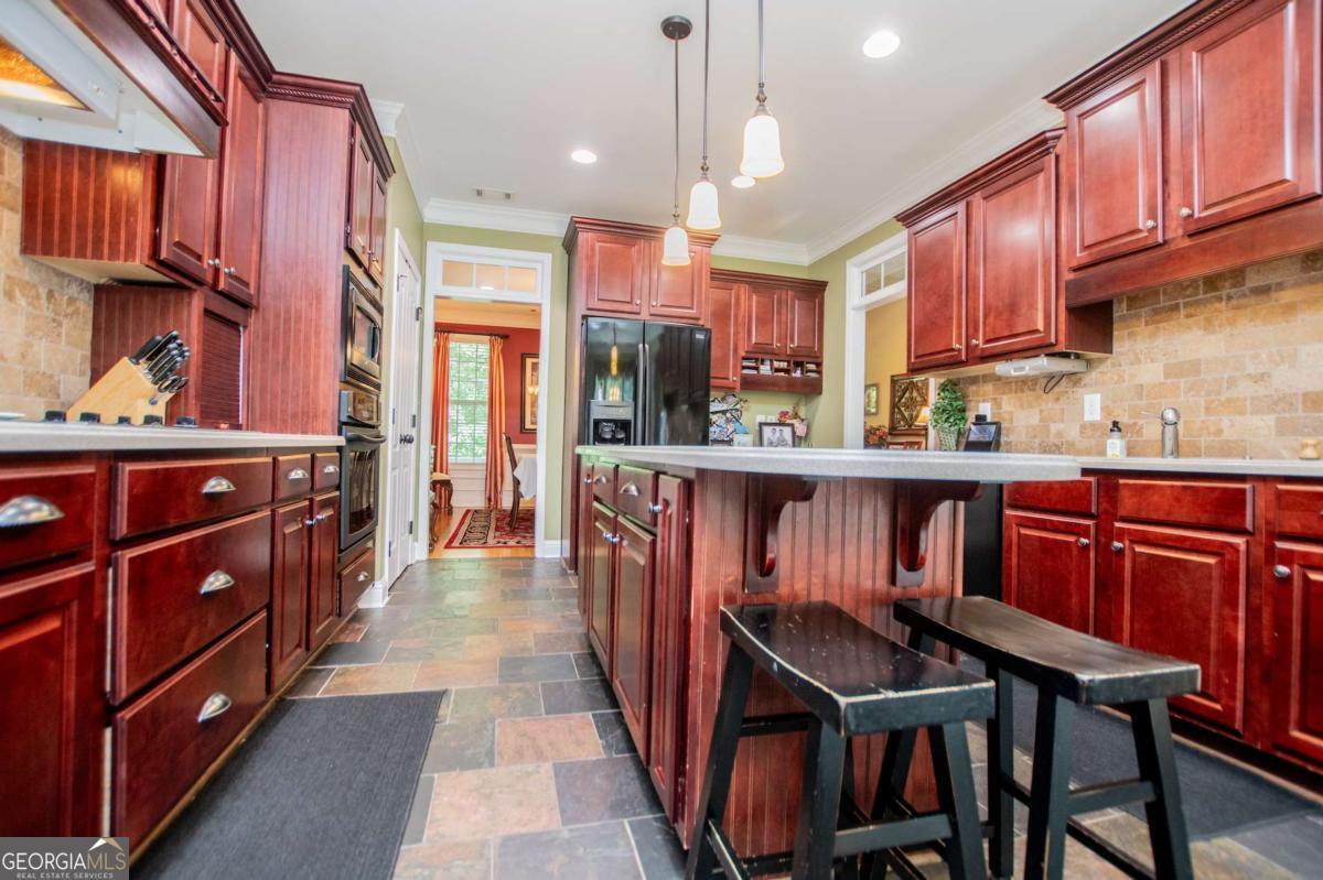 Welcome to your dream home-a beautifully designed Frank Betz ranch-style floor plan set on 3 serene and private acres. Tucked away down a long private driveway, this spacious 5-bedroom, 4-bathroom residence offers the perfect blend of comfort, luxury, and functionality. Main level highlights include gorgeous custom hardwood floors and soaring ceilings that create a grand yet inviting atmosphere. The Spacious family room includes a cozy gas fireplace, high ceilings, abundant natural light, and seamless flow to the formal dining room. Chef's kitchen is spacious and well-appointed with a large center island, eat-in breakfast area, and tons of counter and cabinet space-perfect for entertaining. The spacious owner's suite on the main floor encourages you to relax while enjoying a private retreat featuring double vanities, a spa tub, a separate shower, and a walk-in closet. Three Additional Bedrooms and two full baths offer space for family or guests. A walk-in laundry room with a sink on the main floor makes convenience a breeze! The finished basement is a show stopper with a complete family room with custom bar area, game room, home office, an additional guest room, full bath, and tons of storage including a large storm shelter for protection against sever storms and can double as additional storage, a dedicated workshop for DIY projects like wood working, repairs snd crafts and room for landscaping equipment! The outdoor living and features include a relaxing covered front porch, a large back deck for relaxing or entertaining, and a slab below ideal for gatherings or quiet relaxation! The spacious private backyard is fenced for pets, play, or gardening! Enjoy the sound of the bubbling creek along the backside of the property! Additional parking includes an attached 2-car garage and a detached custom-built covered 2 car carport perfect for additional vehicles or equipment! Don't miss this rare opportunity to own a private retreat that feels like a getaway-but with all the comforts of home. Just 10 minutes to I-20, 30 minutes to Downtown ATL or 45 Minutes to Hartsfield/Jackson Airport!