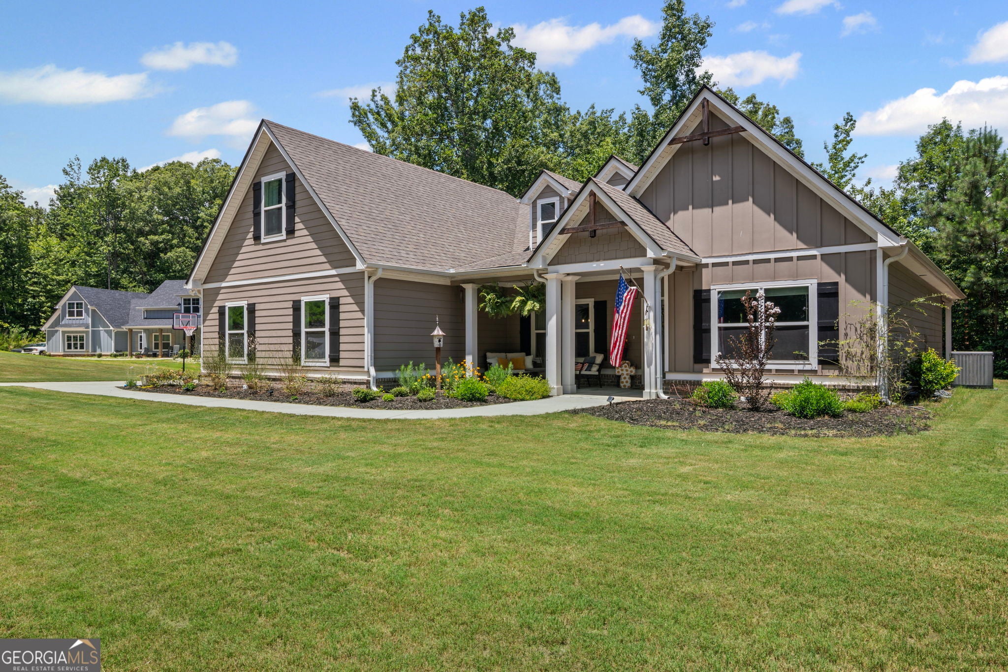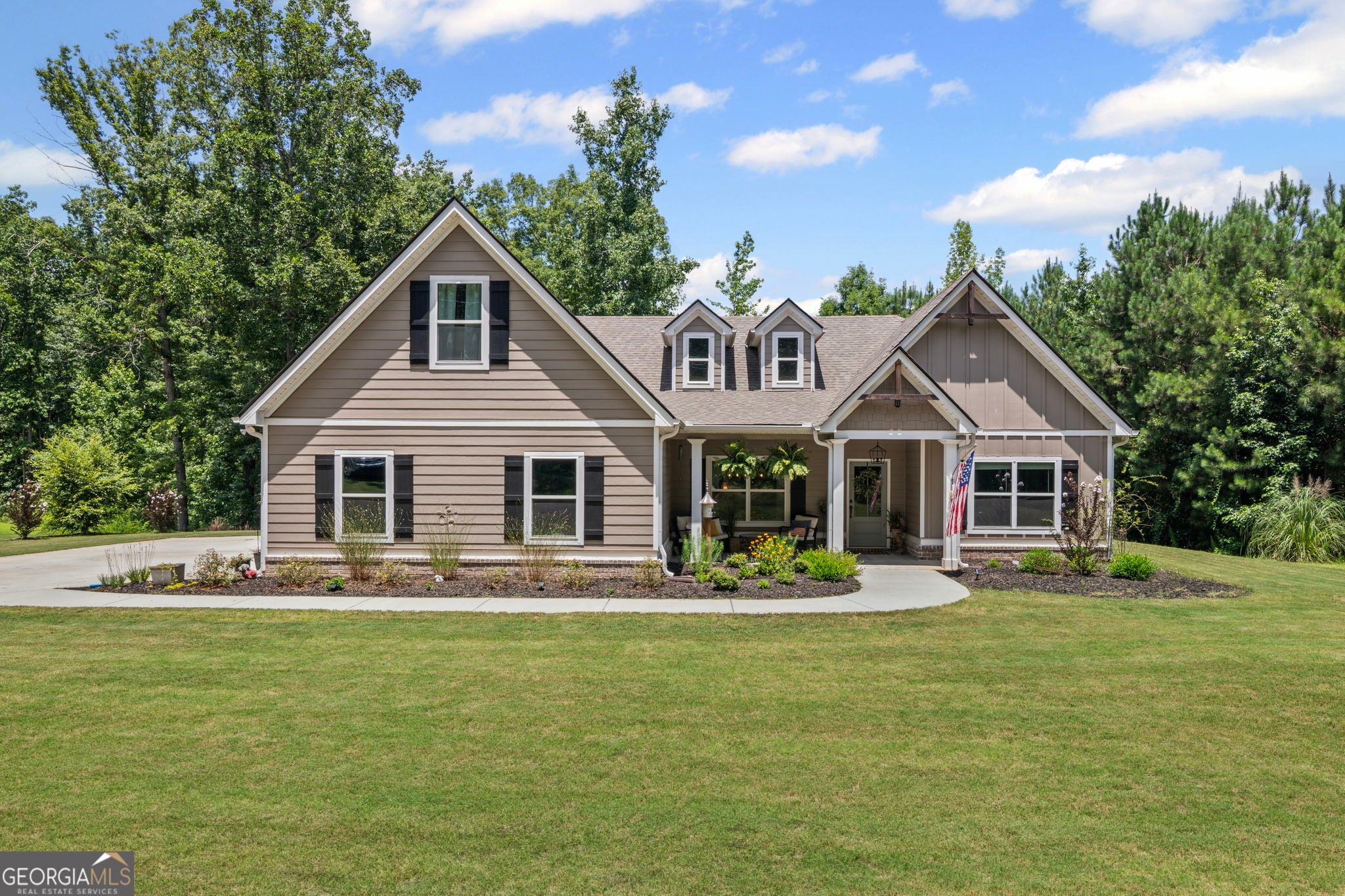 FABULOUS CRAFTSMAN STYLE HOME ON 2.5 ACRE LOT!! Open floor plan with large kitchen w/quartz countertops, tiled backsplash, stainless appliances, large quartz top island w/stainless farm sink, breakfast bar & LVP hardwood flooring. Family room is open to the kitchen w/a trey ceiling w/wood beams & LVP hardwood flooring. Vaulted keeping room w/brick surround fireplace & LVP hardwood flooring. Primary bedroom on main w/walk-in closet. Tiled primary bathroom w/quartz top double vanity, garden tub w/tiled surround, tiled shower w/framed glass. 2 Guest bedrooms on main q/tiled guest bathroom w/quartz top vanity & shower/tub. 3rd Guest bedroom upstairs w/walk-in closet & tiled guest bathroom w/quartz top vanity & shower/tub. 2 Covered porches on the back of the house overlooking private backyard. Covered front porch. Foam insulation . Split bedroom plan. Located in North Coweta County and in top rated school districts! Minutes from I-85!