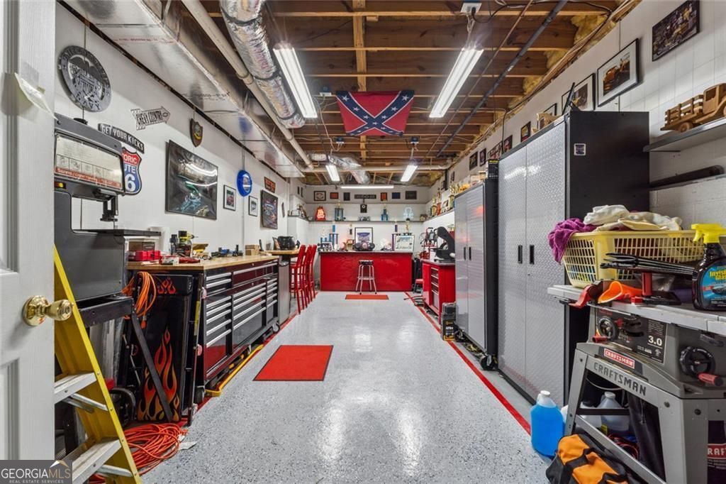 This beautifully maintained home is conveniently located 10 minutes from all the shops and restaurants Hiram has to offer, as well as the Paulding Hospital and the Silver Comet Trail, yet tucked away in a quiet neighborhood off the beaten path with no HOA! The open living spaces are perfect for entertaining, featuring a vaulted ceiling in the Great Room with a stone fireplace, Dining Room with French Doors leading to the large screen porch, and eat-in Kitchen with granite counters, stainless appliances, and a tile backsplash. In the basement you'll find a large bonus room that can be used as a Recreation Room, Theater Room, Home Office, Man Cave, and more. The hard-to-find 3 car garage provides ample space for cars, toys, and more. There's also an oversized workshop room for all the tools and projects! All set on a spacious corner lot with a well-manicured lawn in front and back. Trees on the property behind the home and on the side offer great privacy With newer systems like the HVAC and Roof, this home is move-in ready and very low maintenance! Also includes a spacious 10x16 storage building in the backyard for your lawn equipment, gardening tools, etc.
