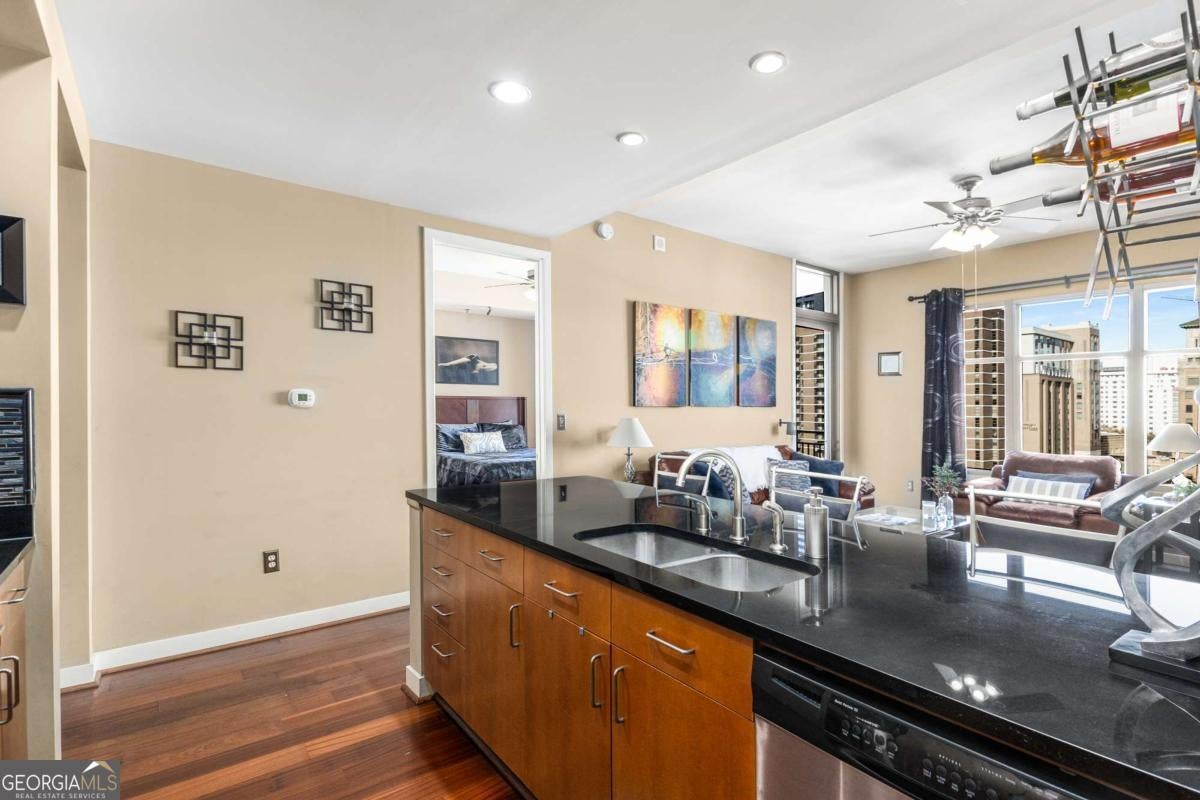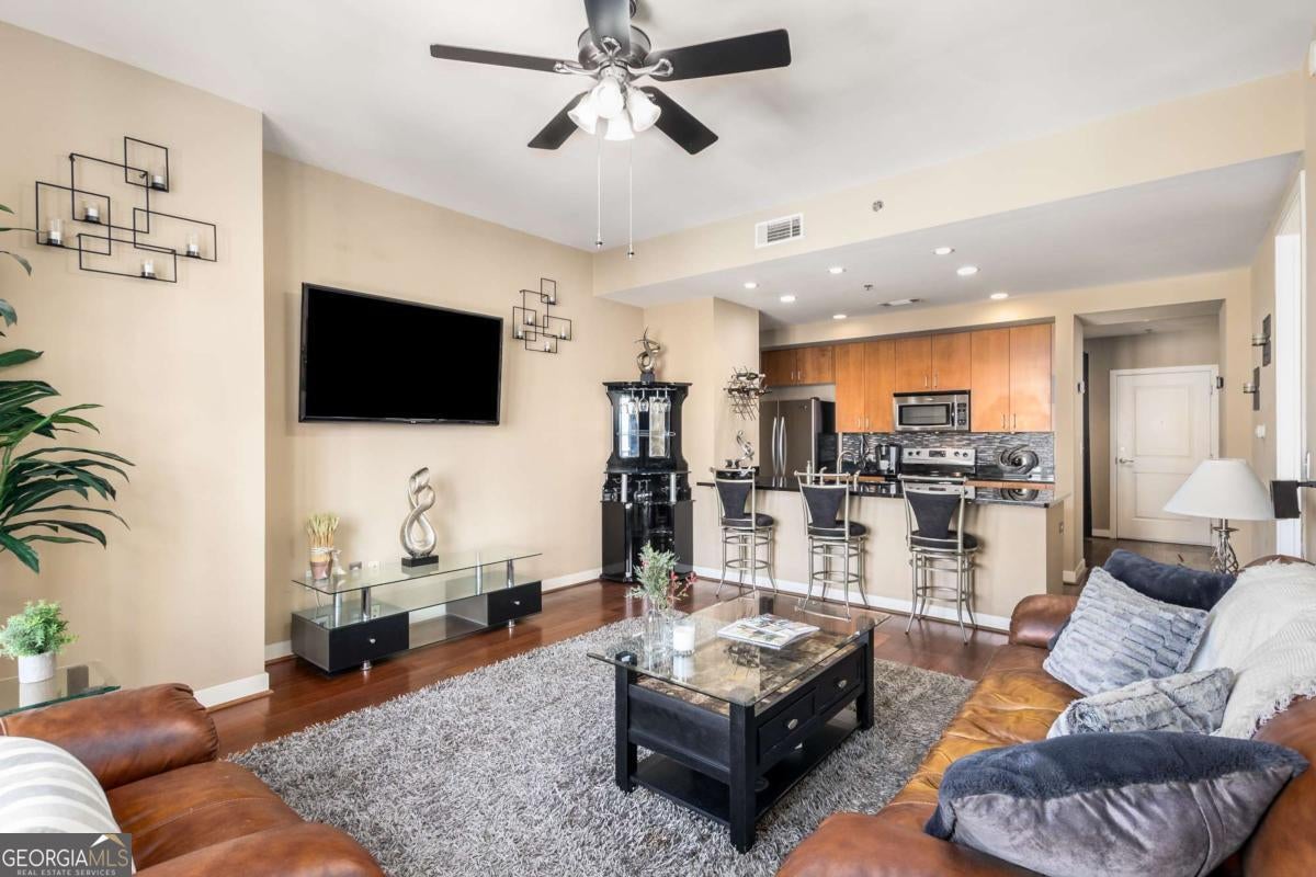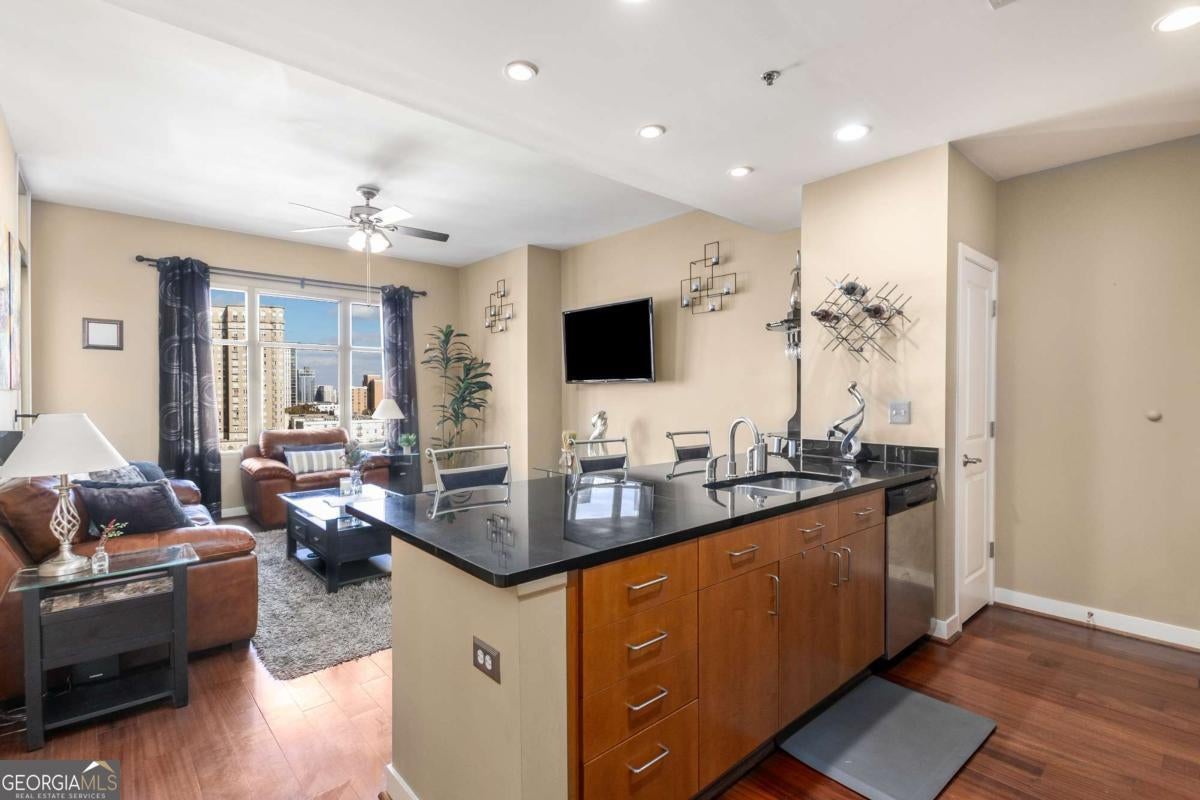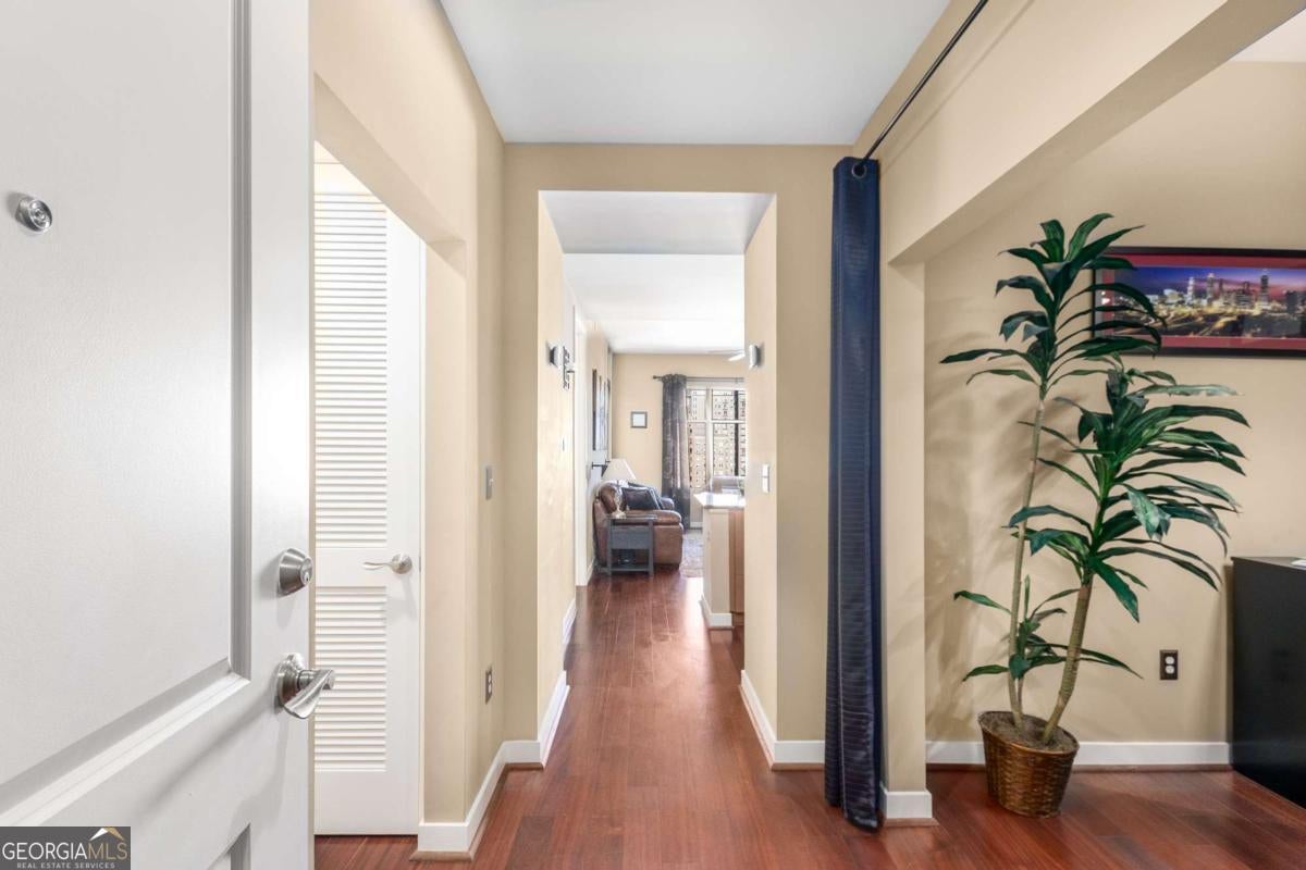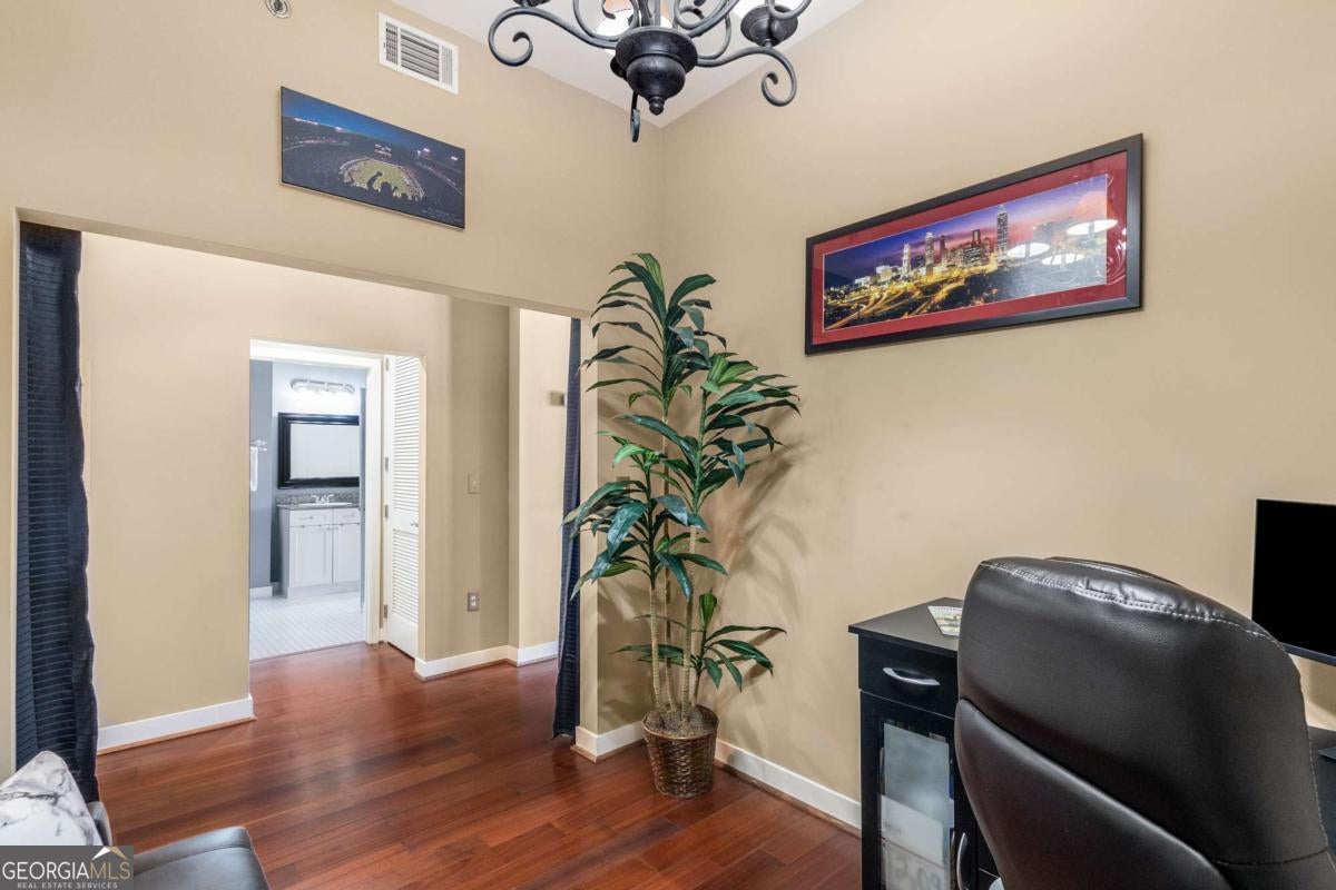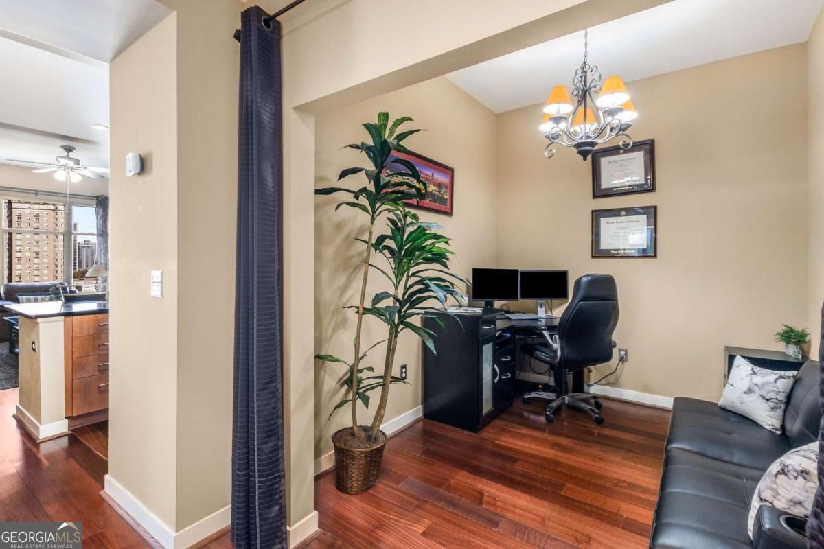 ***Building approved for Conventional Loans*** Highly desirable north-facing, 12th floor 1 bed/1 bath plus den with breathtaking panoramic views in a boutique, luxury high rise located in the heart of all Midtown has to offer. Bright, open living/dining/kitchen floor plan includes 10' ceilings, hardwoods, ceiling fan, granite, SS appliances with potential to add gas cooking, kitchen backsplash, and sizable pantry. Spacious primary suite features floor-to-ceiling windows, ceiling fan, and oversized walk-in closet. Generously-sized den can function as dining room, guest bedroom, or office. Private walk-out balcony with epoxy flooring and panoramic views of the Fox Theatre, Midtown, Stone Mountain, and Piedmont Park. Laundry closet with stackable washer/dryer is conveniently located in the hall. Gated, first level garage parking space adds to the appeal. Top it off with superb 24/7 concierge service, resort-style amenities - seasonally heated saltwater pool, lounge, fitness center & covered grilling area with fireplace. A short walk to GA Tech, entertainment, restaurants, Piedmont Park, Winship Cancer Institute at Emory Midtown, the Beltline, and Ponce City Market with easy access to interstates 75/85 only two blocks away. One of Atlanta's top-rated vegan restaurants is located in the building. This is intown living at its very best!