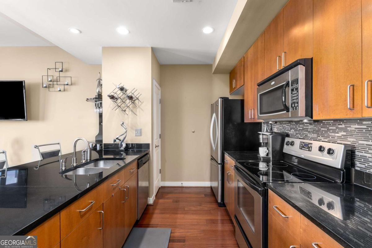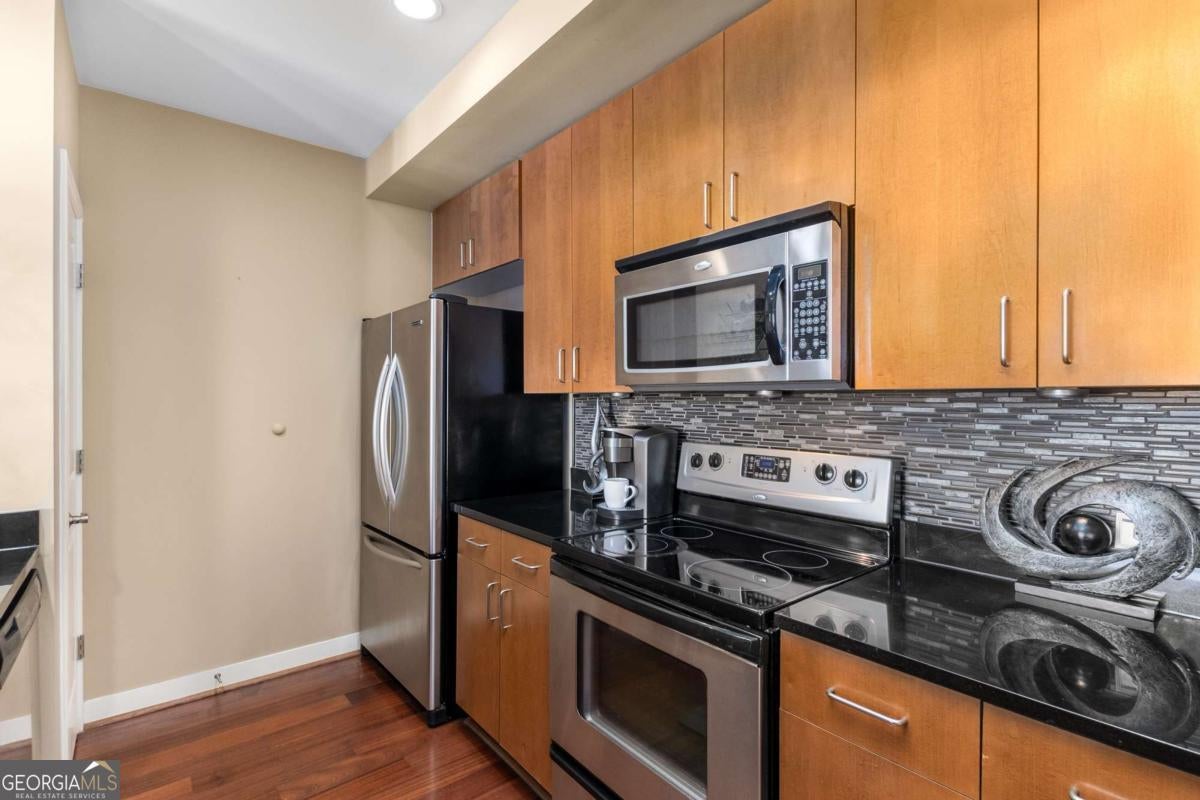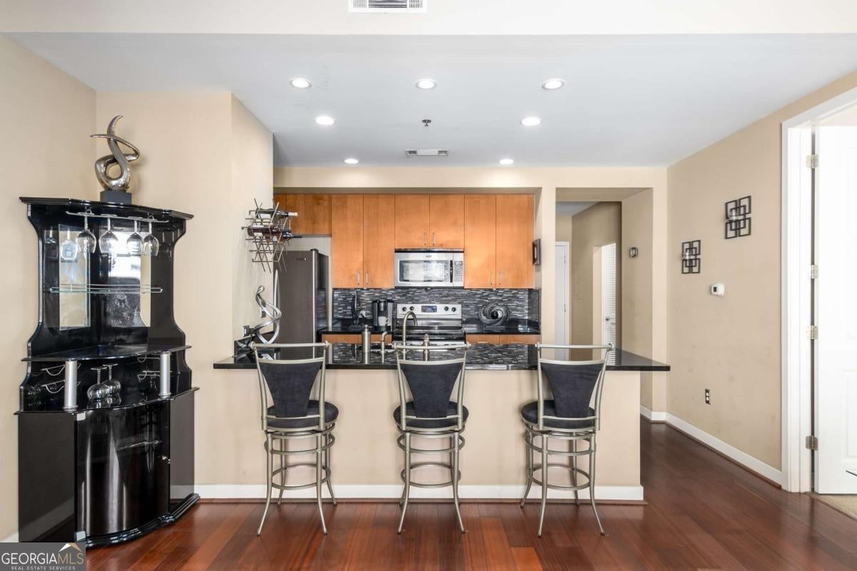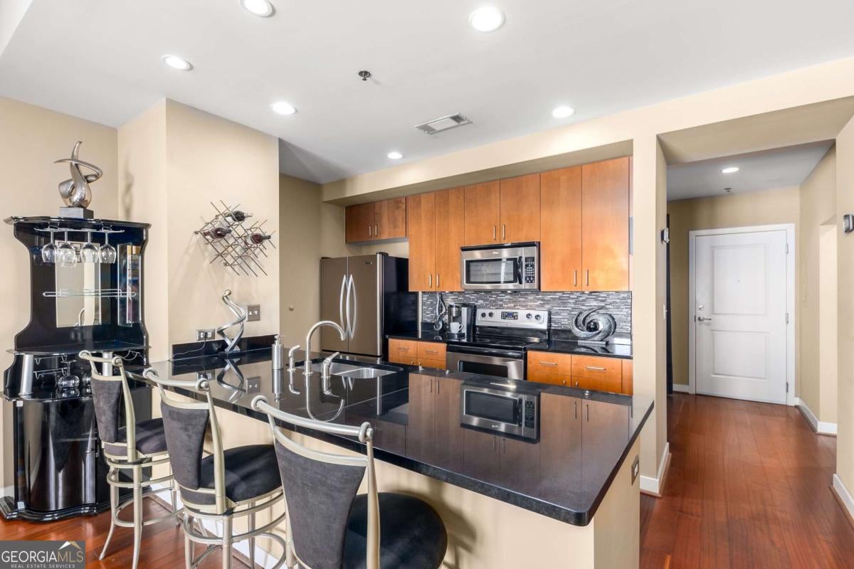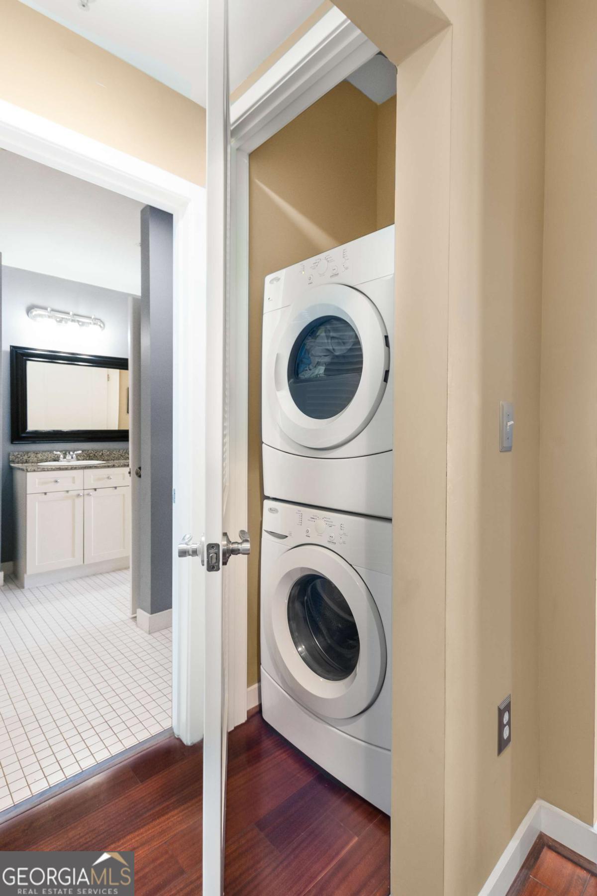 ***Building approved for Conventional Loans*** Highly desirable north-facing, 12th floor 1 bed/1 bath plus den with breathtaking panoramic views in a boutique, luxury high rise located in the heart of all Midtown has to offer. Bright, open living/dining/kitchen floor plan includes 10' ceilings, hardwoods, ceiling fan, granite, SS appliances with potential to add gas cooking, kitchen backsplash, and sizable pantry. Spacious primary suite features floor-to-ceiling windows, ceiling fan, and oversized walk-in closet. Generously-sized den can function as dining room, guest bedroom, or office. Private walk-out balcony with epoxy flooring and panoramic views of the Fox Theatre, Midtown, Stone Mountain, and Piedmont Park. Laundry closet with stackable washer/dryer is conveniently located in the hall. Gated, first level garage parking space adds to the appeal. Top it off with superb 24/7 concierge service, resort-style amenities - seasonally heated saltwater pool, lounge, fitness center & covered grilling area with fireplace. A short walk to GA Tech, entertainment, restaurants, Piedmont Park, Winship Cancer Institute at Emory Midtown, the Beltline, and Ponce City Market with easy access to interstates 75/85 only two blocks away. One of Atlanta's top-rated vegan restaurants is located in the building. This is intown living at its very best!