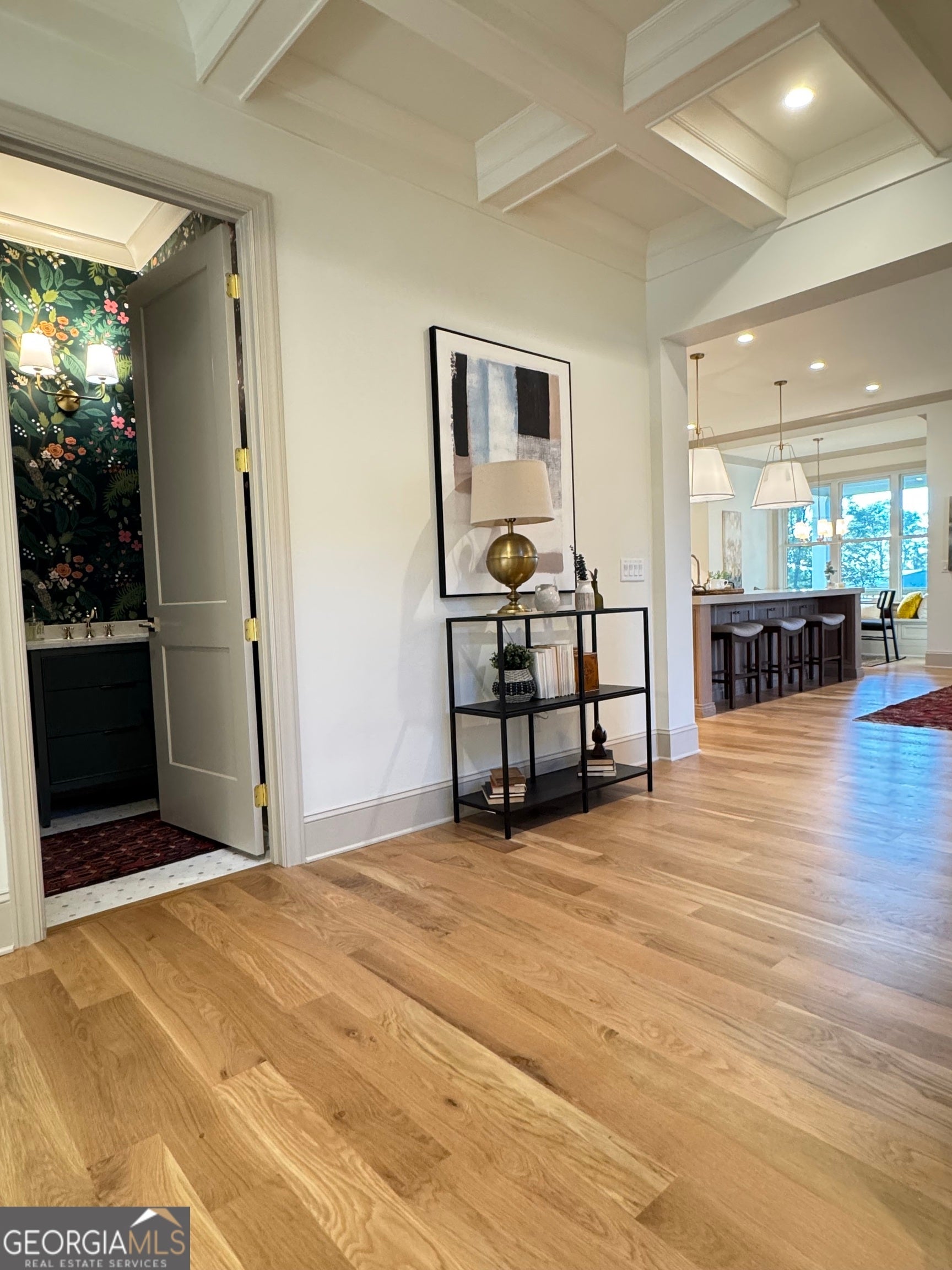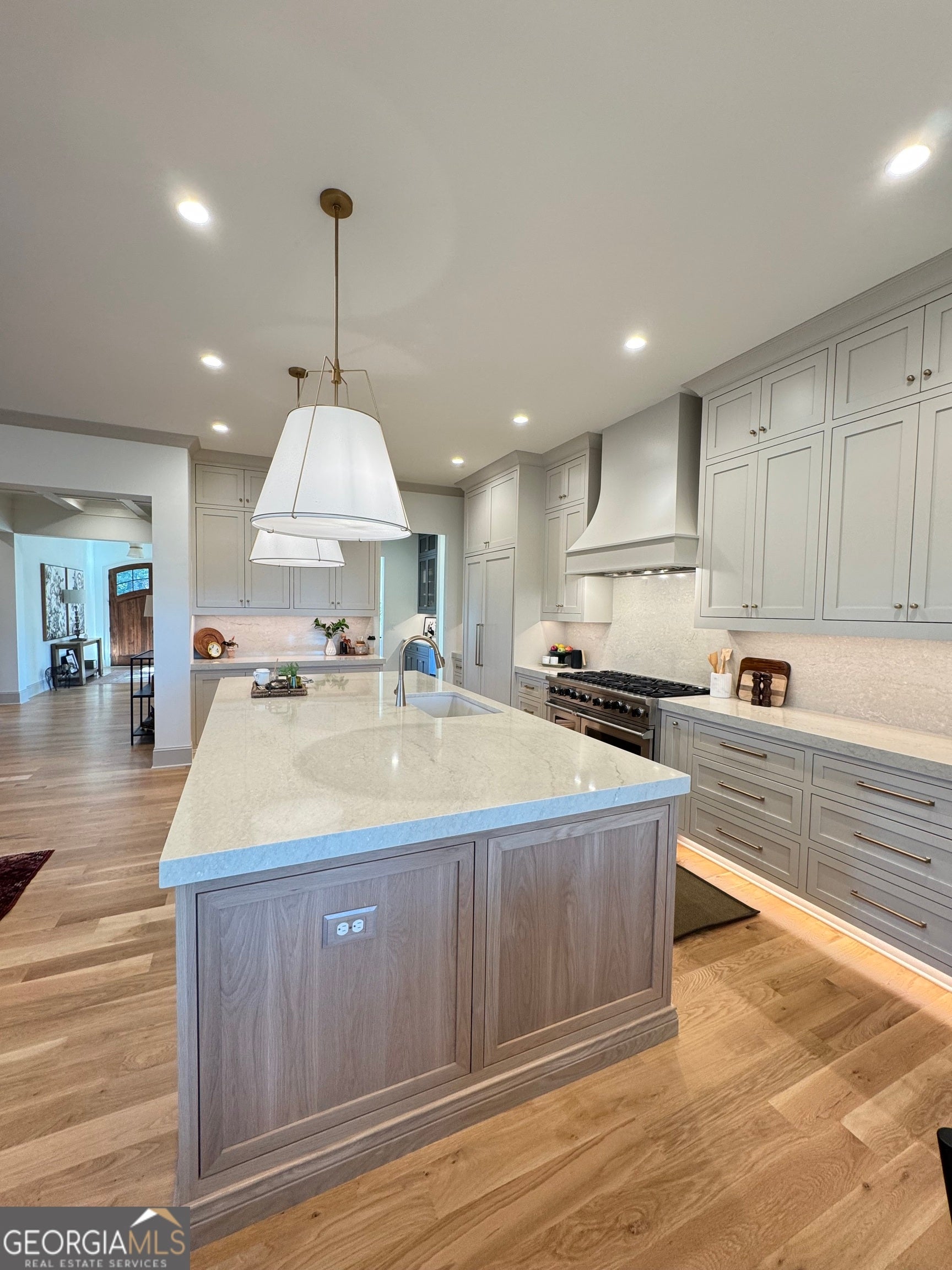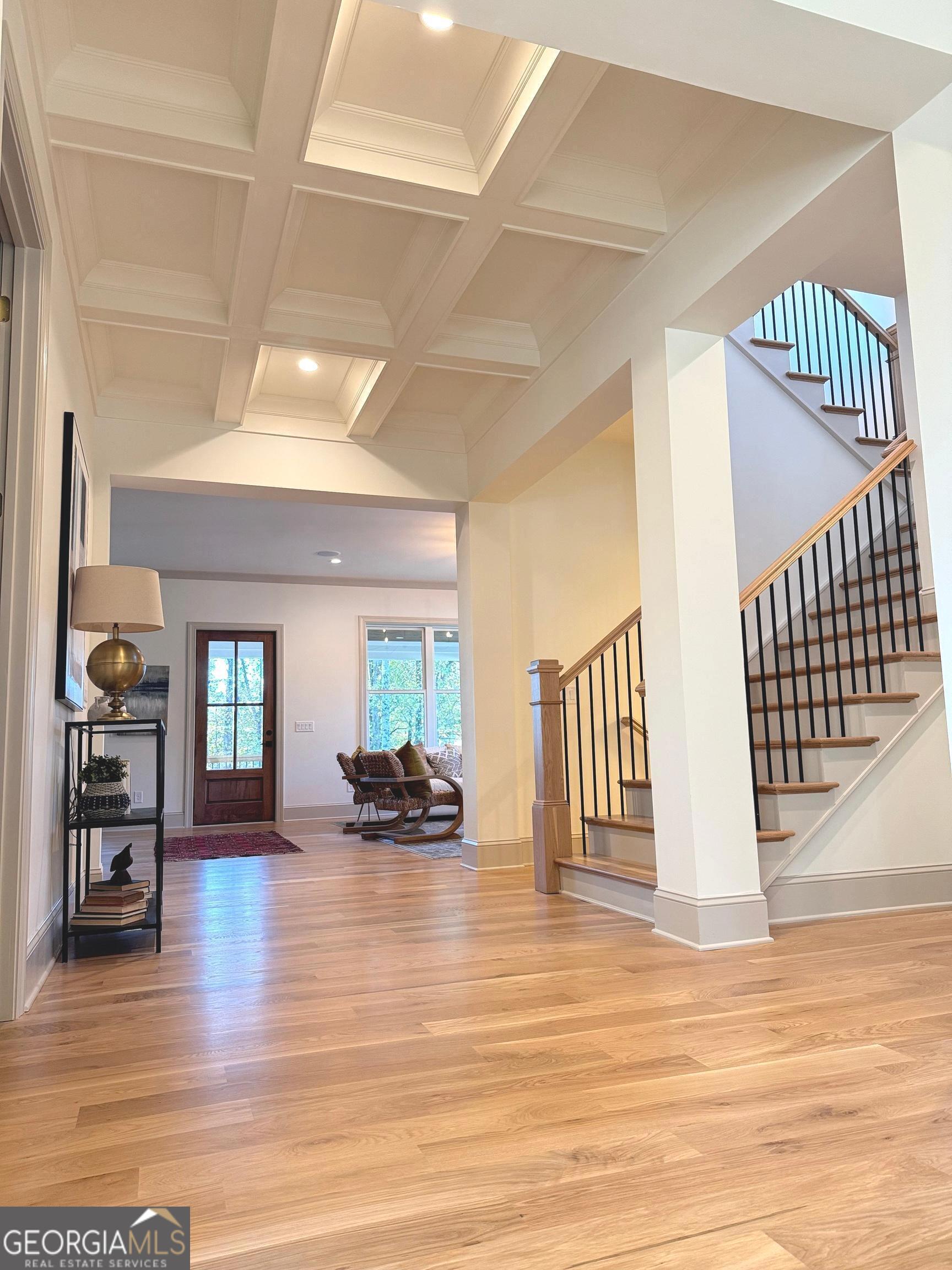 This home is a sanctuary for those with discerning taste seeking to live in a custom home in the rolling hills of Woodstock, Georgia. Set in a private enclave of 5 luxury custom homes, on almost 2 acres, this home is centrally located to Woodstock, Milton, Roswell and minutes from Hickory Flat. Step through the douglas fir entry door and stroll through the coffered ceilings where you are greeted by a chefs kitchen with custom white oak inset cabinetry that stretches to the 10' ceiling and Cambria countertops with full slab backsplash and under cabinet and toe kick lighting. The centerpiece is a 48" Viking range with paneled viking dish and Jenn Air fridge. The custom inset cabinetry continues into the pantry with ample prep space and the elegant butler's pantry where guests drinks can be served from a beverage fridge and a prep sink. A thoughtfully placed full primary on main ensures comfort and convenience for guests who are treated to a full ensuite bathroom and shower wrapped in Emser tile. A custom cast stone fireplace surround wraps a gas fireplace in the spacious living space with surround sound for an impromptu dance party. The back porch welcomes and provides the perfect vantage point to enjoy breathtaking views of the rolling pastures and refreshing breezes. Upstairs, the white oak flooring continues in all bedrooms to where each bedroom has a walk in closet and the two front bedrooms share a jack n jill bath. The primary suite is a retreat with a soaking tub and a spacious custom closet. In the terrace level there is 5.1 surround in both the family room and in the golf simulator/theater room. Underdeck on the terrace patio allows more outdoor living space. A home office will fit perfectly overlooking the serenity of the backyard. The wellness room is appointed with an elkay bottle filler and in ceiling speakers. This exceptional home defines luxury and lifestyle, making it the perfect retreat in Woodstock - where every detail has been meticulously crafted for the ultimate living experience. This home was not built as a spec, but as a custom home and then life happens, so it is hitting the market. Too many upgrades to list in a listing description, please schedule a showing today before it is too late. Listing agent related to seller.