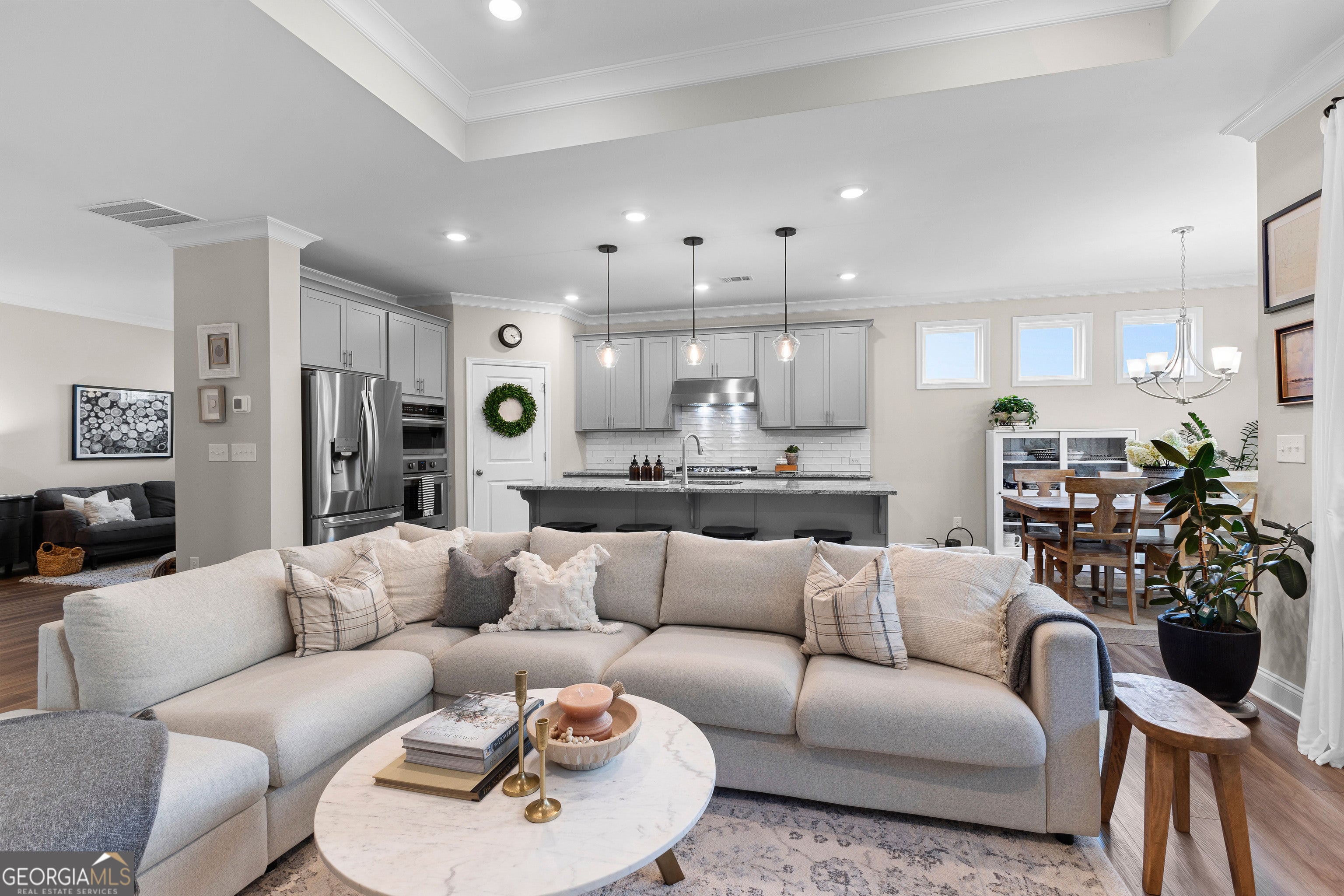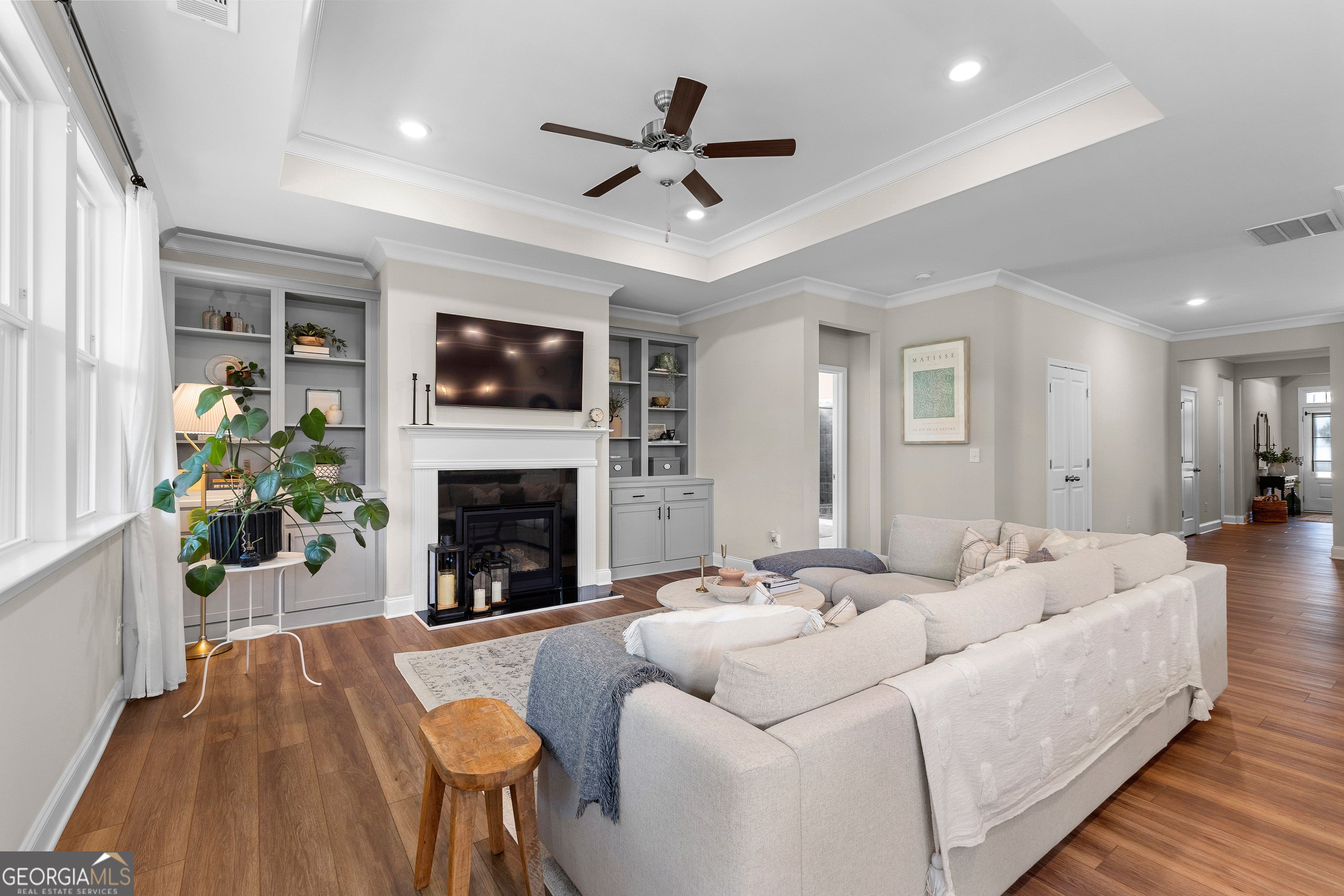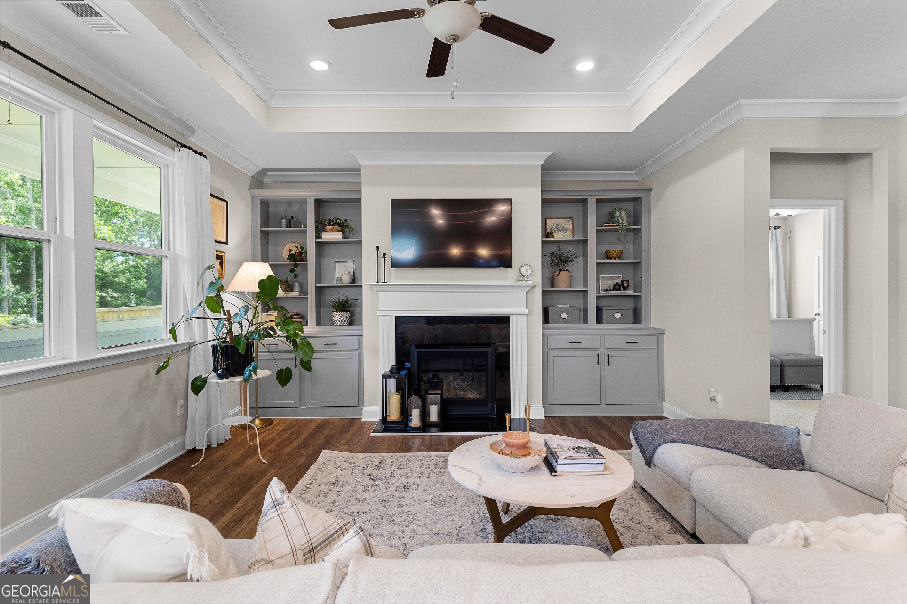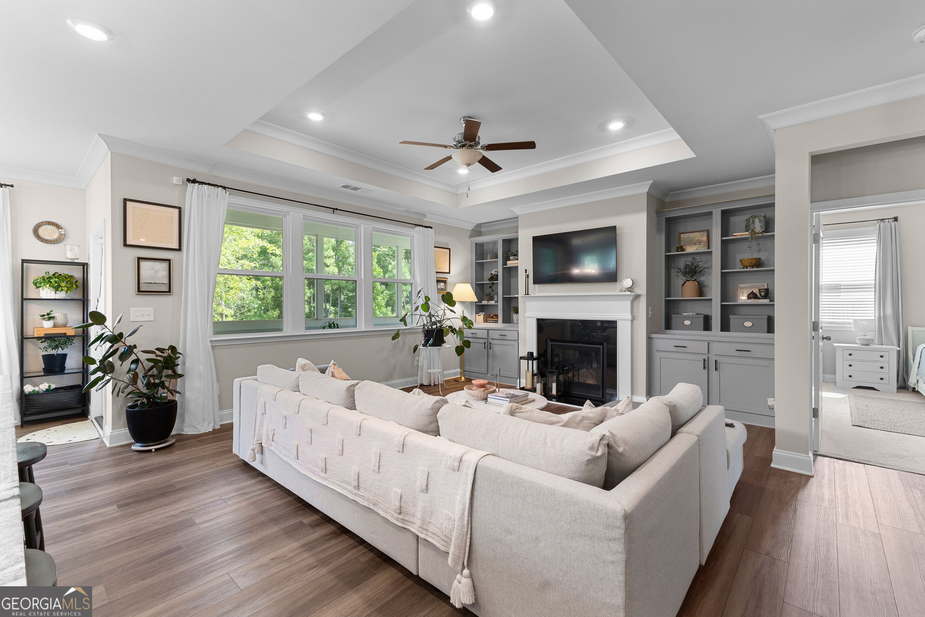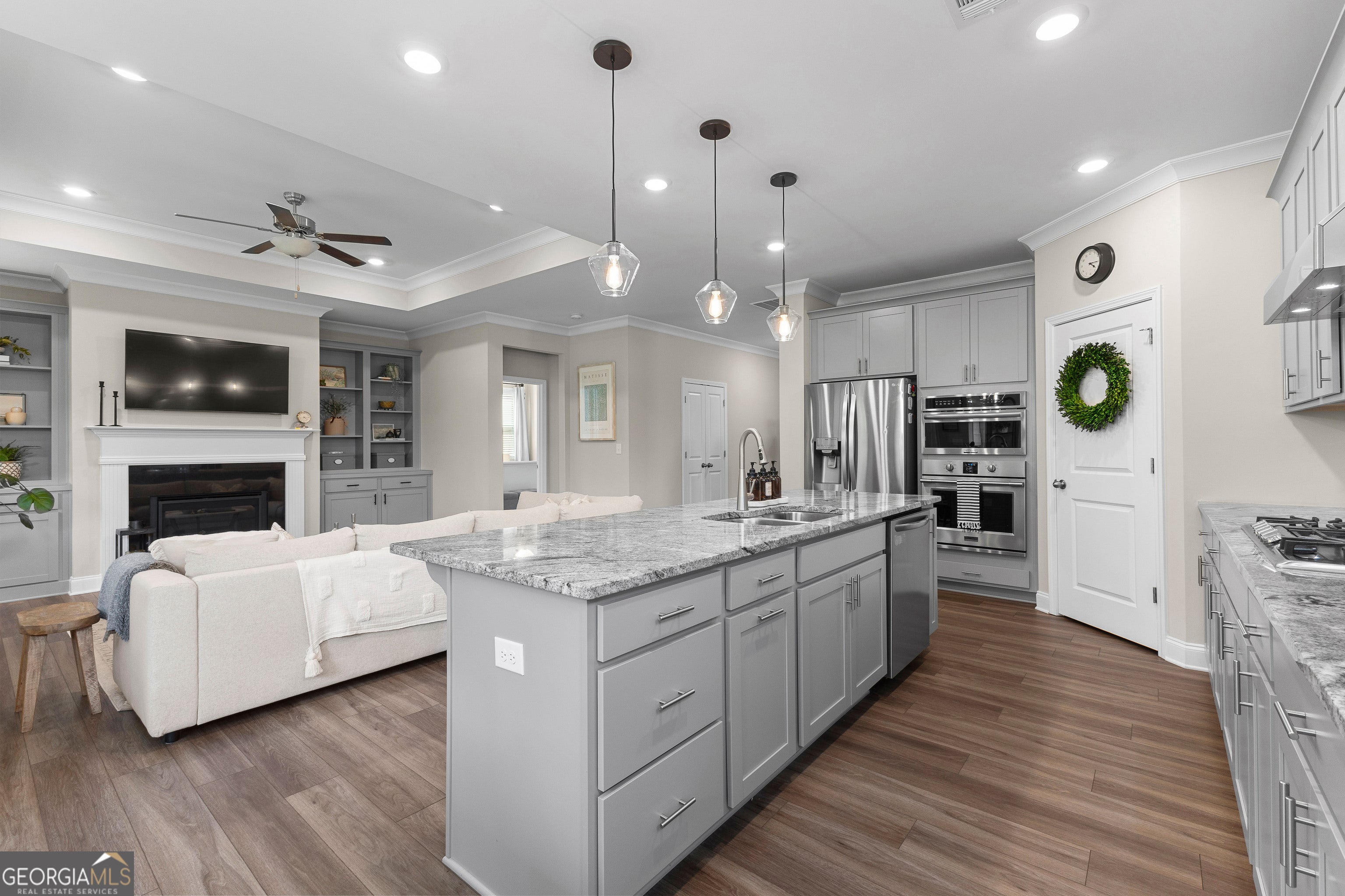 Seller motivated! Welcome to this beautifully maintained 3-bedroom, 2-bath home perfectly situated in one of South Fayette County's most desirable locations-just a short walk to the Summit Point Publix shopping center! Step inside to an open-concept design featuring a gourmet kitchen complete with a wall convection oven, 5-burner gas cooktop, grand island, and cozy breakfast room-all overlooking a spacious living area with recessed lighting and custom built-in bookcases. A flexible front space offers the perfect setting for a formal dining room, home office, or sitting area. The luxurious owner's suite is a true retreat, boasting a private sitting room and direct access to the serene screened-in back porch. The spa-like owner's bath features dual vanities, an oversized fully tiled stand-up shower, and a walk-in closet with direct access to the laundry room for added convenience. Two generously sized guest bedrooms share a beautifully appointed full bath with granite countertops and a tiled tub/shower surround. Enjoy luxury vinyl plank flooring throughout the main living areas and plush carpet in all bedrooms. Enjoy stunning curb appeal and outdoor living with a beautifully landscaped yard, both front and back. Lush greenery, well-maintained plantings, and thoughtful design create a serene, picture-perfect setting ideal for relaxing or entertaining. This home offers an ideal blend of comfort, style, and location-schedule your tour today and discover everything it has to offer!