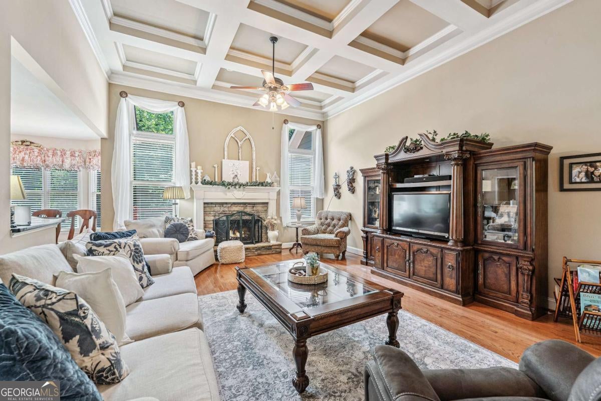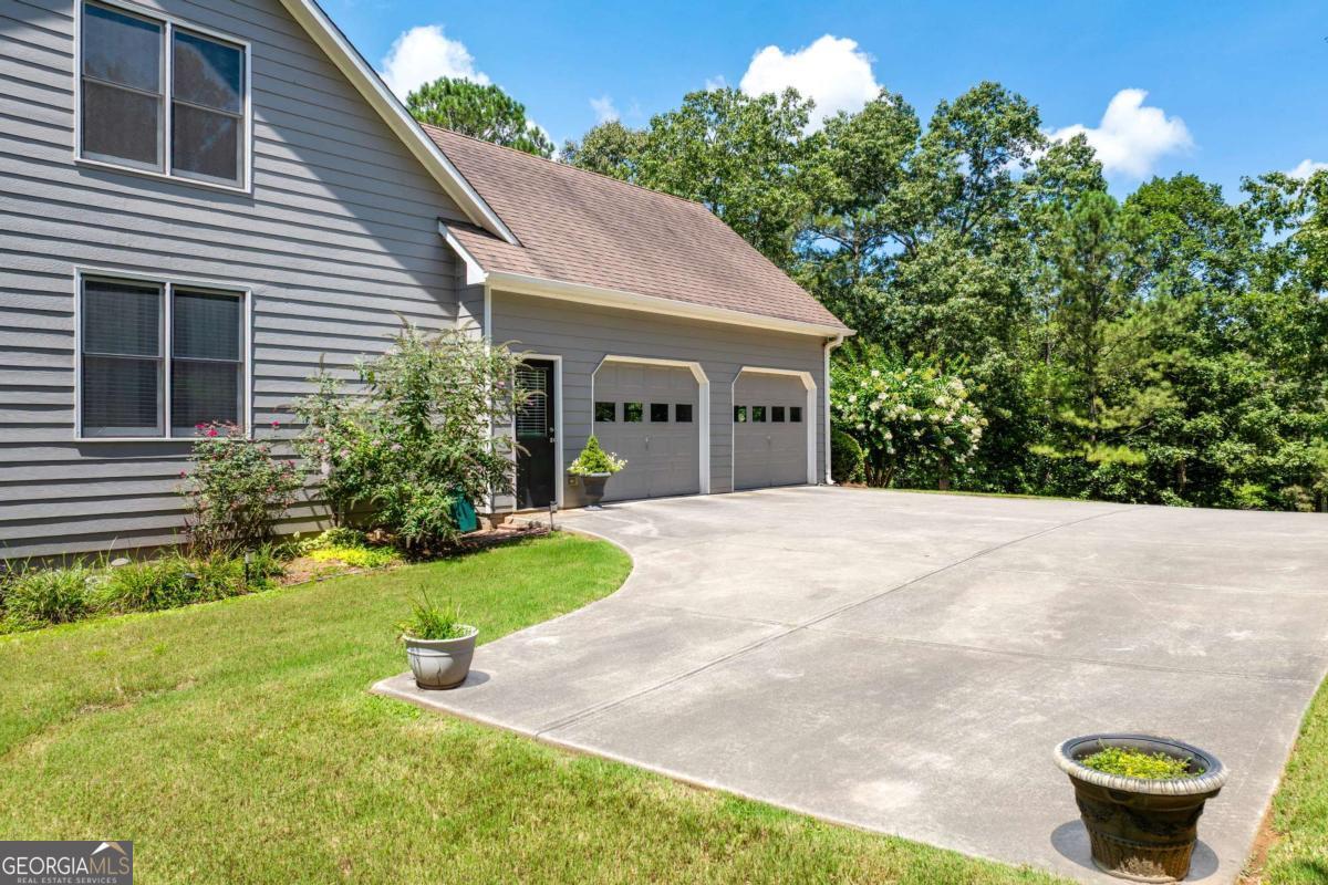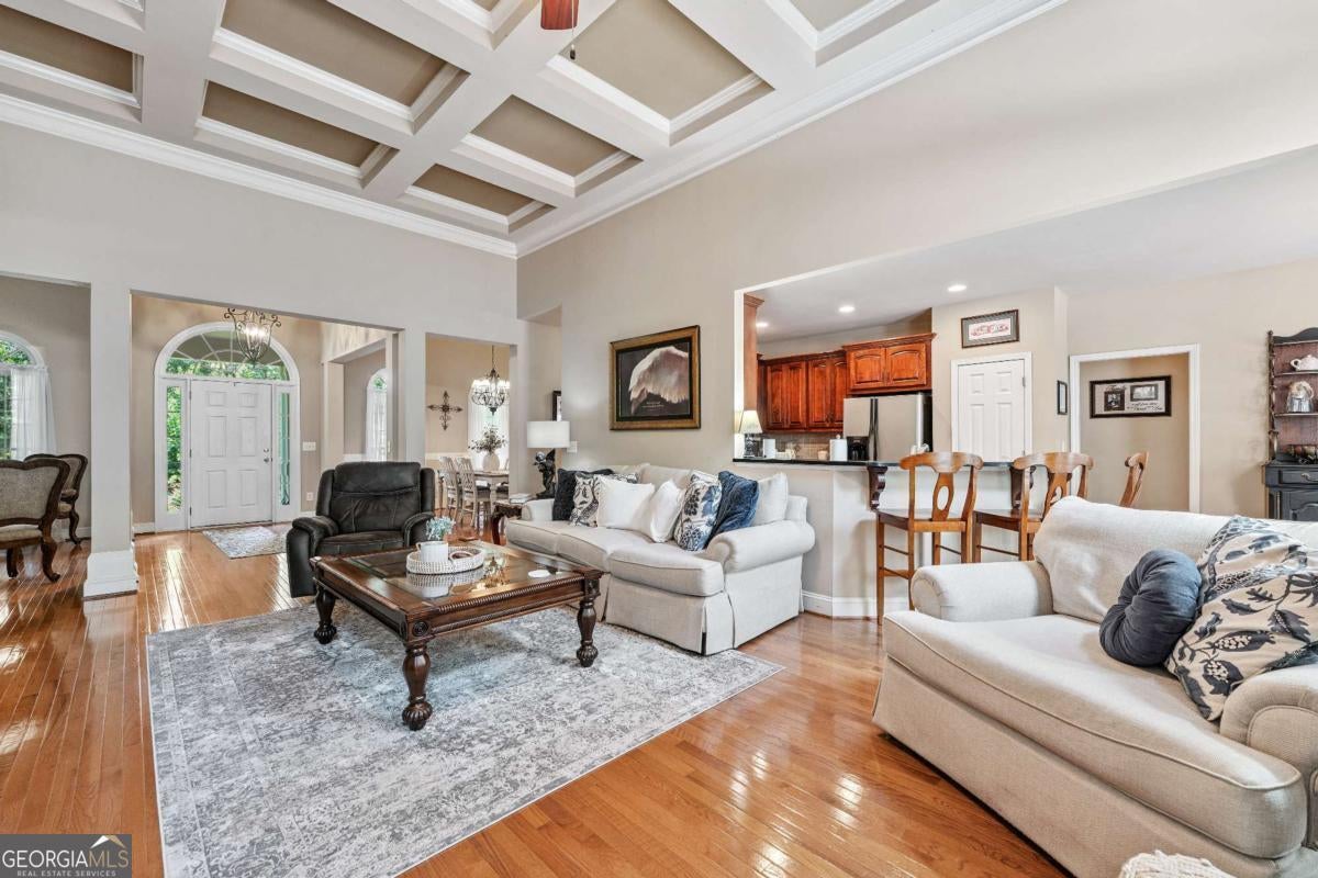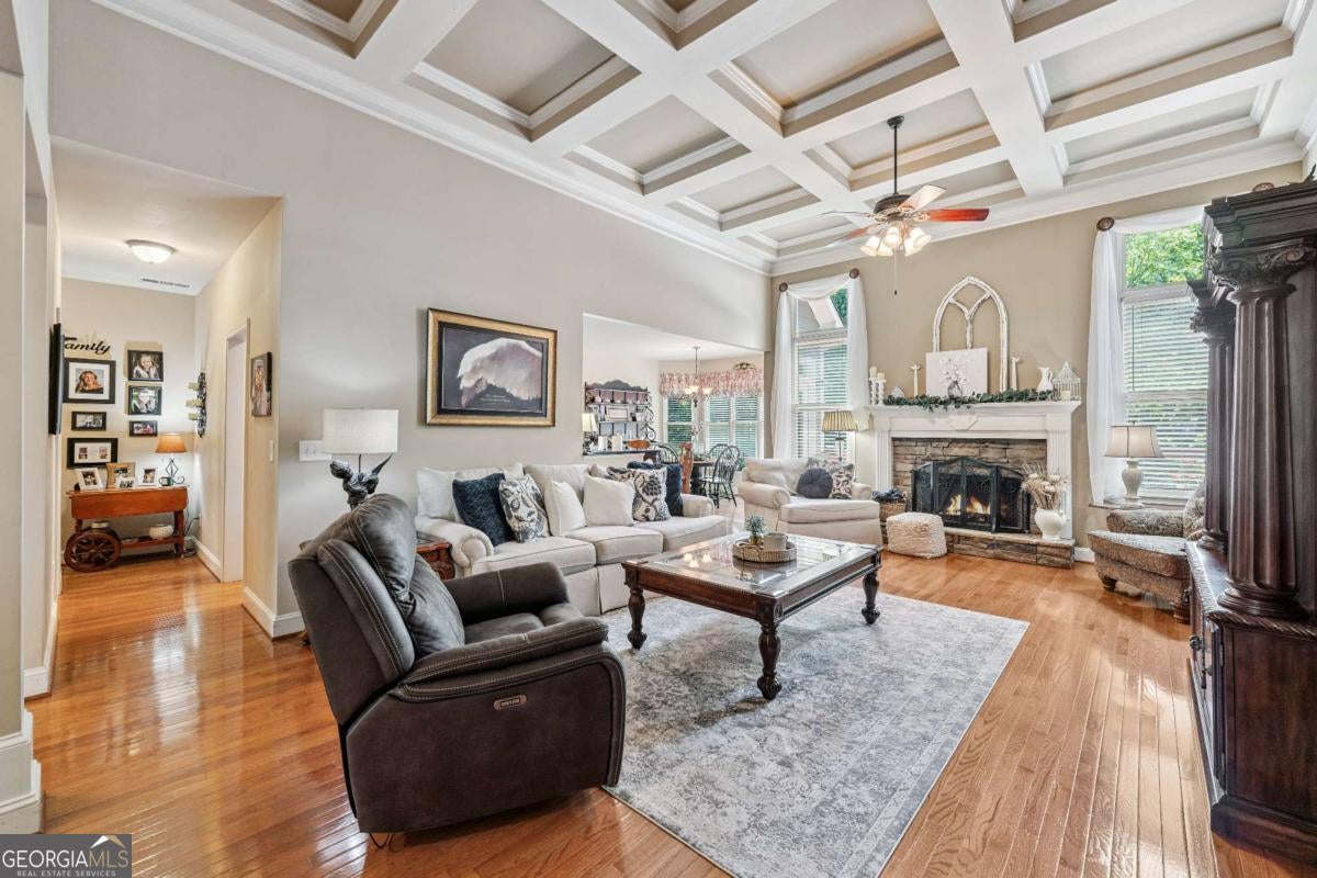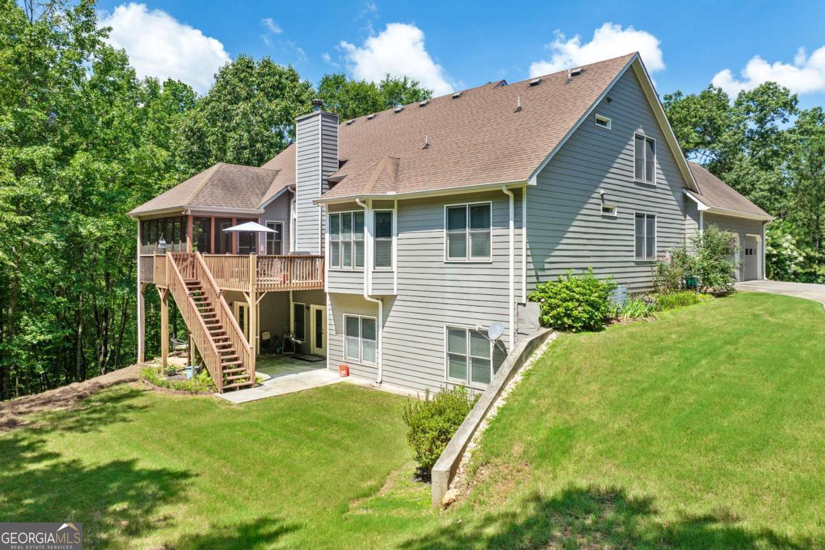 Welcome home to this custom-built 4-bedroom, 3.5-bath, one-owner ranch on a full, unfinished daylight basement situated on a large estate lot backing up to Lake Allatoona. You can walk to the lake and it's only 1 mile to the beach and boat access!! This home features a separate dining room, office/formal living room, and family room with soaring gorgeous coffered ceilings and a stone fireplace, open to a breakfast room and gourmet kitchen with granite countertops, stainless steel appliances, and plenty of storage. The primary suite on the main includes a vaulted tray ceiling and a beautifully updated ensuite bath with double vanity, separate whirlpool tub, glass shower, and a large closet. A sun porch/screened porch and sundeck are just off the master. Two additional bedrooms and a full bath are on the main floor and the fourth bedroom and full bath are upstairs, along with easy attic storage access. Access to the upstairs bedroom is just off the laundry area where a private staircase leads up. The main-level laundry room includes a sink and built-in cabinetry for added convenience. An extra-large two-car garage with side entry door offers easy access, and ample driveway parking offers convenience for family and guests. Additional features include hardwood floors, beautiful crown molding, plus a LARGE unfinished basement stubbed for a bath with a fantastic layout for future finishing. The basement also features two sets of French doors and two breaker boxes. Privately situated on a manicured lot with mature trees and a welcoming rocking chair front porch, this home is just minutes from Lake Allatoona, Sweetwater Creek State Park, Big Door Vineyards, and all the amenities Cherokee County has to offer.