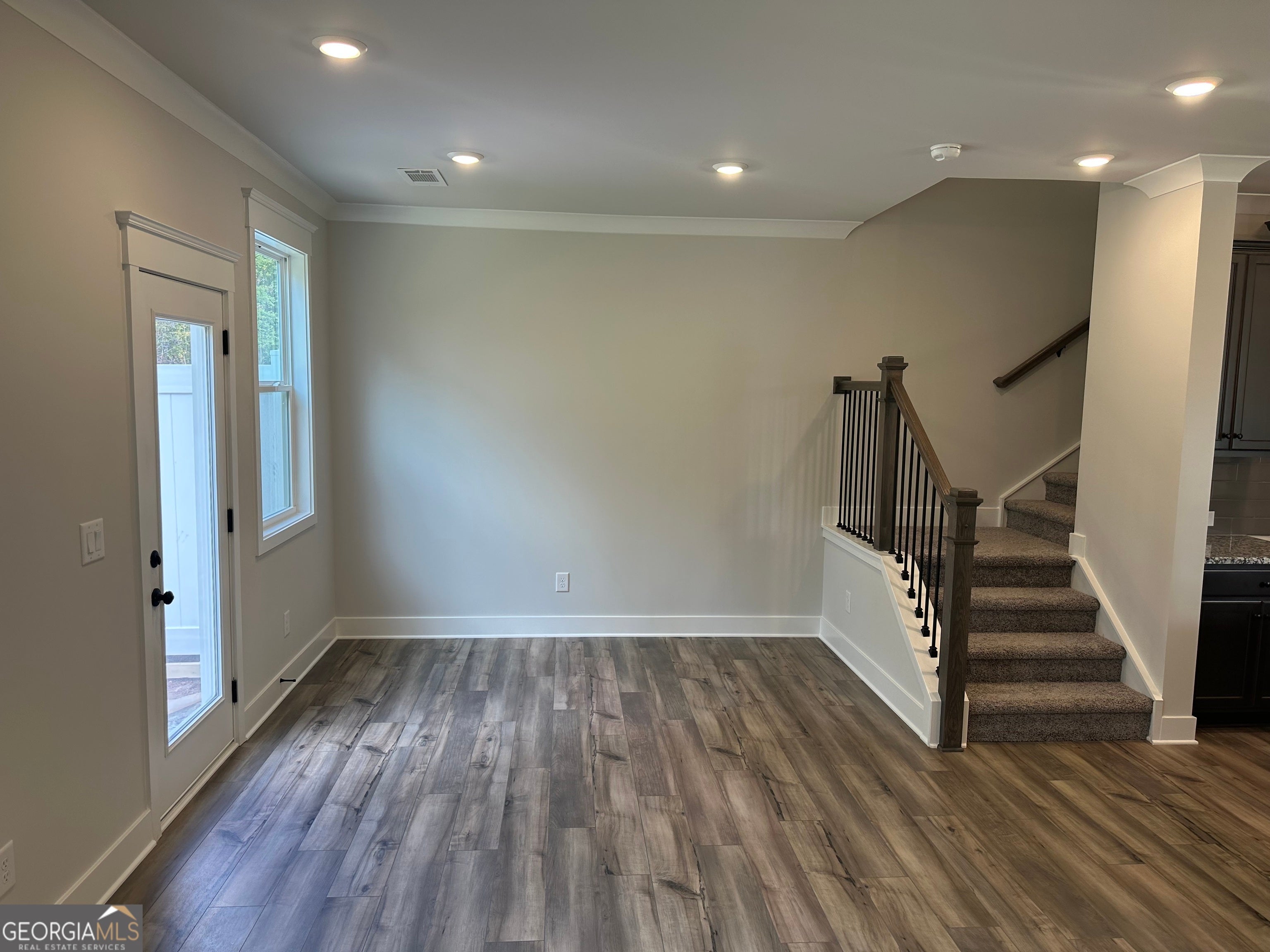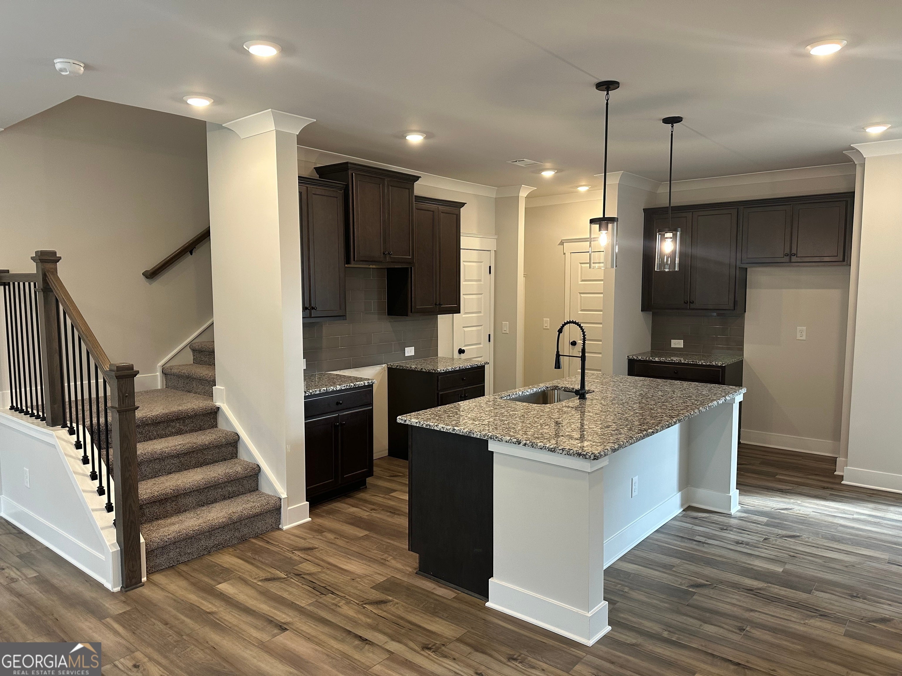 Durham This thoughtfully designed 4-bedroom, 2.5-bath end-unit townhome features a spacious open-concept layout and a private 2-car garage. Sits on a private wooded lot. The main level features a welcoming foyer, a great room with a 50" Allusion Slim electric fireplace, and a modern kitchen equipped with 42" cabinets, a tile backsplash, a center island with barstool seating, stainless steel appliances, and a walk-in pantry. A mudroom off the garage provides a convenient drop zone for everyday use. Upstairs has a laundry room and four well-appointed bedrooms. The primary suite features a walk-in closet and a luxurious en-suite bath with a 7' tiled shower with dual shower heads and frameless glass! Additional features include an elegant trim package, a WiFi-enabled garage door opener, and a smart home system for added convenience. Located approximately one mile from the University of North Georgia's Gainesville campus, this community provides easy access to I-985, downtown Gainesville, shopping, and dining. Home is under construction. Interior photos are stock images for illustration purposes only. Contact the listing agent for details on current incentives!