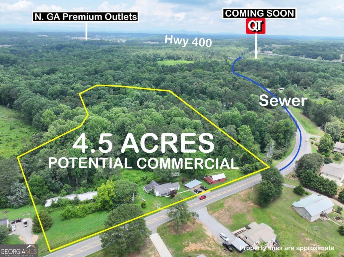 Prime opportunity to own 4.5 acres of highly visible potential commercial land featuring an impressive 463 feet of road frontage. Located just minutes from the North Georgia Premium Outlets, Hwy 400, and the upcoming QT, this property offers outstanding development potential in a rapidly growing area. A 3 bedroom, 1 bathroom home sits on the land and could be renovated for office or rental use. Sewer is nearby, and the county has confirmed it can be connected, making this a strong candidate for future commercial use or investment.