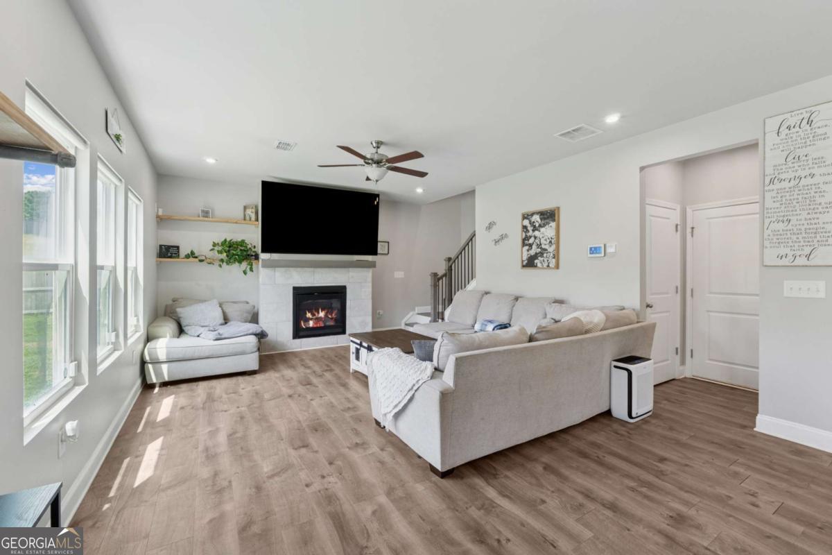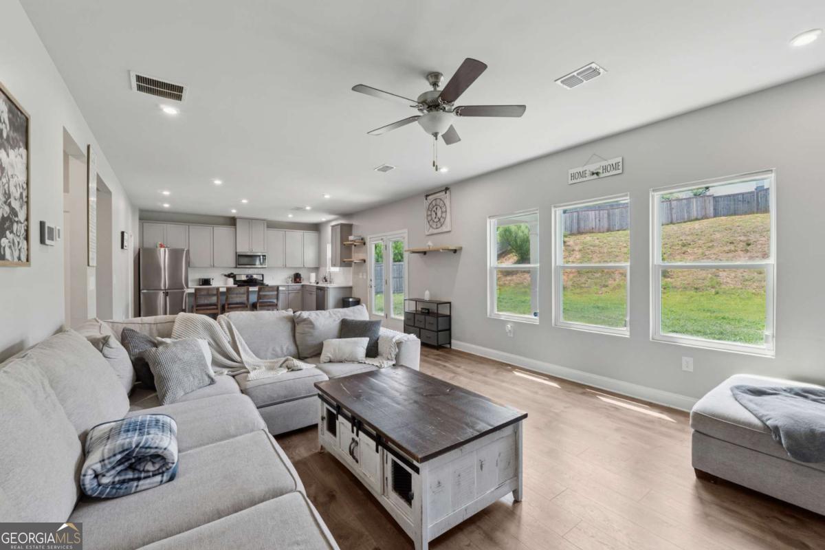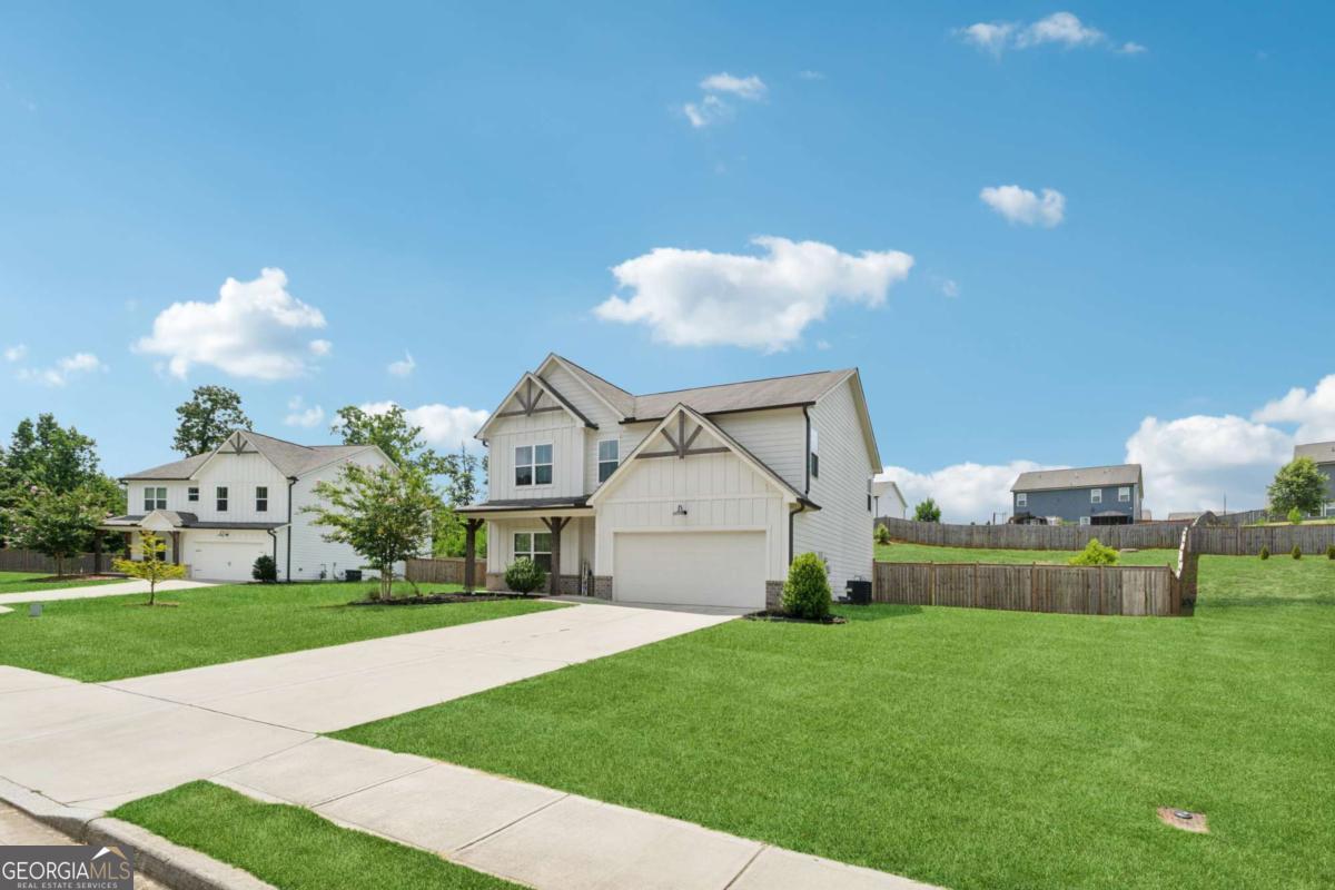 Welcome to this beautifully upgraded and energy-efficient 5 bedroom, 3 bathroom home nestled in the heart of Acworth, GA and just built in 2020. Situated on a premium, level lot, this residence boasts over 2,300 square feet of thoughtfully designed open concept living space, complete with more than $50,000 in upgrades. From the moment you arrive, you'll be impressed by the inviting curb appeal, highlighted by a charming front porch and a two-car garage. Step inside to discover luxury vinyl plank flooring throughout the main level, and a bedroom or dedicated office space ideal for remote work or quiet study on the main level. The open floor plan effortlessly connects the living, dining, and kitchen areas, creating an ideal space for entertaining. The cozy family room is centered around an upscale fireplace flanked by custom built-in shelving and topped with a beautiful wood mantle. The chef-inspired kitchen is a true showstopper, featuring an oversized island, white cabinetry, quartz countertops, stainless steel Whirlpool and KitchenAid appliances, a white subway tile backsplash, and stylish fixtures. A spacious dining area flows to the covered back patio, perfect for relaxing evenings or weekend gatherings. Upstairs, a large loft offers flexible living space for a media room, playroom, or secondary family area. Generously sized secondary bedrooms and a full bathroom with double vanities and a tub/shower combo ensure comfort and convenience for family or guests. The oversized primary suite is a peaceful retreat, complete with a spa-like ensuite featuring double vanities, a soaking tub, a frameless glass shower, and a large walk-in closet. Additional highlights include a fully fenced backyard, updated lighting throughout, and thoughtful design details at every turn. Built with energy efficiency in mind, this Energy Star and EPA Indoor AirPlus certified home. Located just minutes from top-rated schools, shopping, dining, parks, and trails, this move-in ready home is a rare find in a prime Acworth location. Brookstone Golf & Country Club offers optional Swim/Tennis membership for residents of Brookstone West along with swim team, onsite restaurant and pickleball courts. Top rated amenities at your convenience-making this not just a home, but a lifestyle. Top rated schools await you. Just minutes to Downtown Acworth, Lake Allatoona and Lake Point Sports Complex. YMCA just 10 minutes away. Pitner Park just around the corner with mountain bike trails and walking trails.