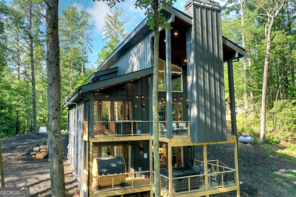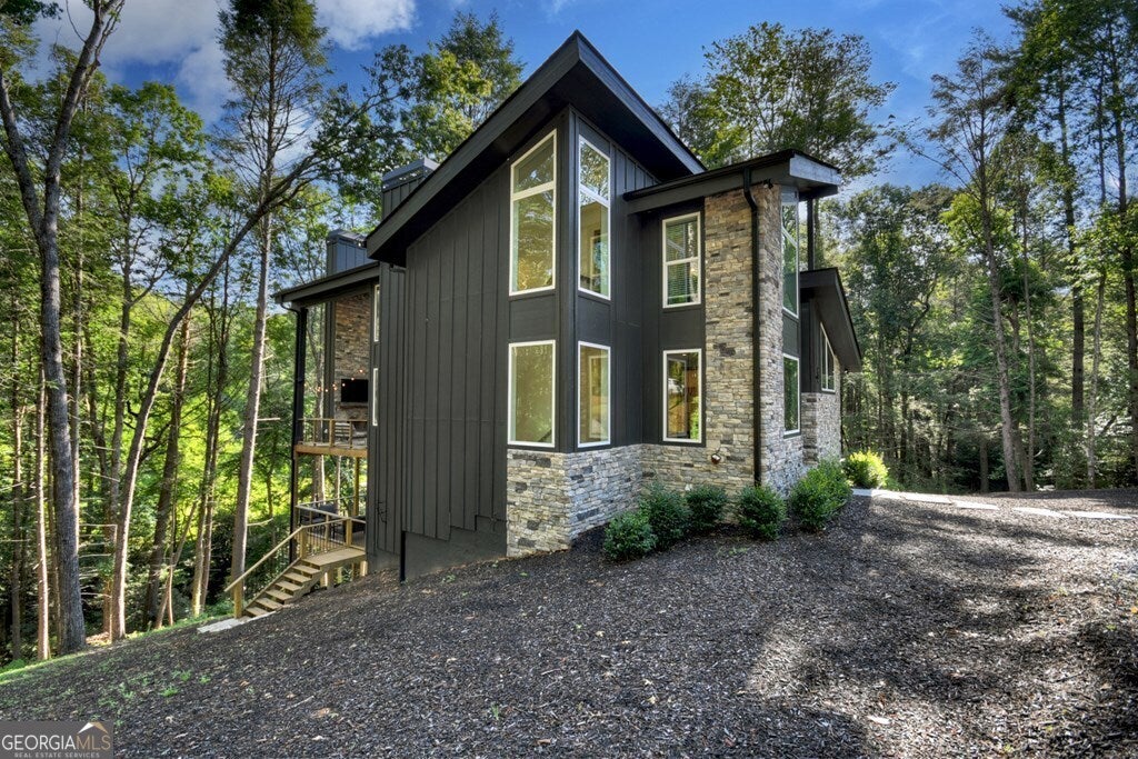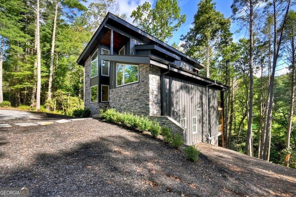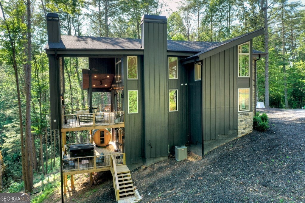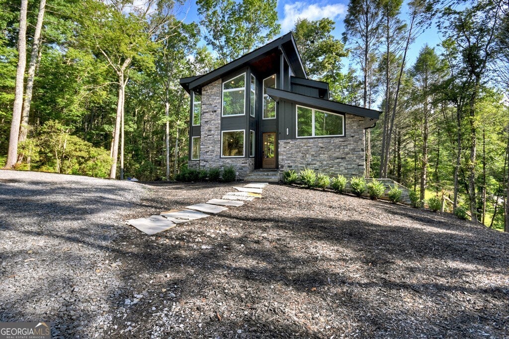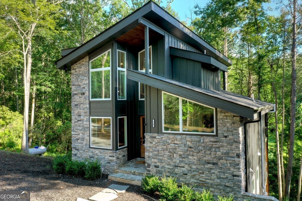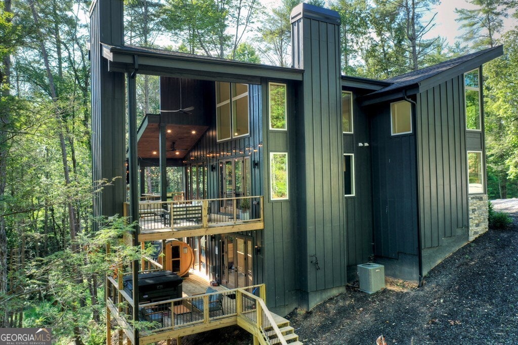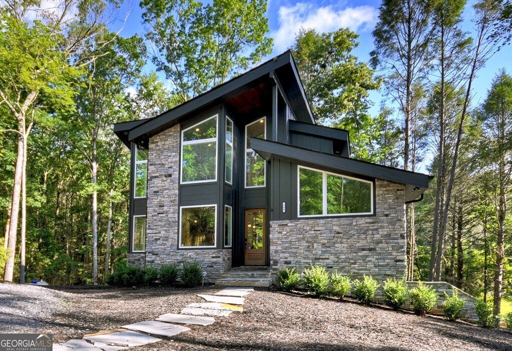 YOUR CREEK FRONT MOUNTAIN OASIS ~ This contemporary 4BR, 3.5 mountain home is nestled in the heart of the Aska Adventure Area near the Toccoa River, Lake Blue Ridge, hiking & mtn. biking trails, trophy trout fishing, thousands of U.S.F.S protected wilderness surrounding & more. Situated on 2.15 beautiful wooded acres overlooking & listening to the cascading creek frontage below totaling 565' of frontage. Custom luxury finishes throughout including gourmet kitchen, custom cabinetry, custom walk in tile showers, stainless appliances, custom lighting & plumbing fixtures & more. All BR's are ensuites w/ upstairs ensuite featuring add. Sitting/office area. Open easy living floor plan that features large island/bar in kitchen offering workspace & seating great for entertaining. Soaring cathedral ceilings throughout w/ lots of glass & windows allowing you to enjoy the great outdoors. Modern style gas log fireplace in the main level living room & in basement Rec Rm/Den in addition to outdoor fireplace on porch overlooking this picture perfect setting. Two levels of covered porches on front of home w/ terrace level porch featuring hot tub & sauna. Finished basement features additional living quarters with 2 BR's & BA with Rec Rm/Den & complete custom wet bar that is a show stopper! Great location for future garage w/ lots of parking on all paved road frontage
