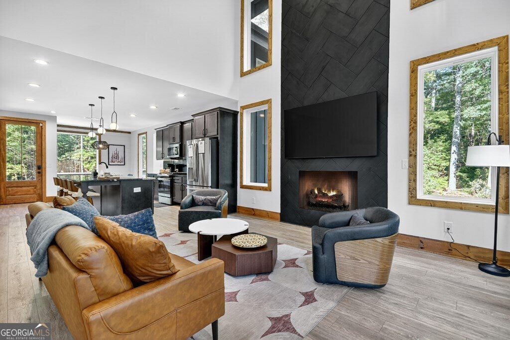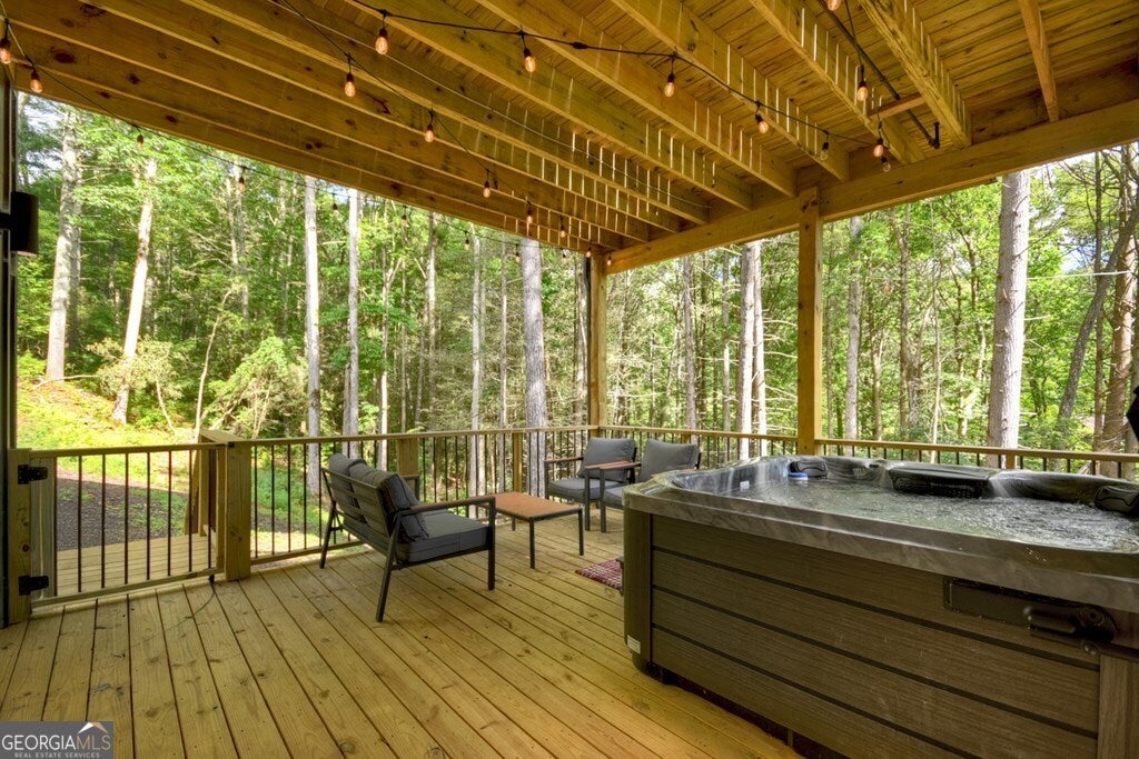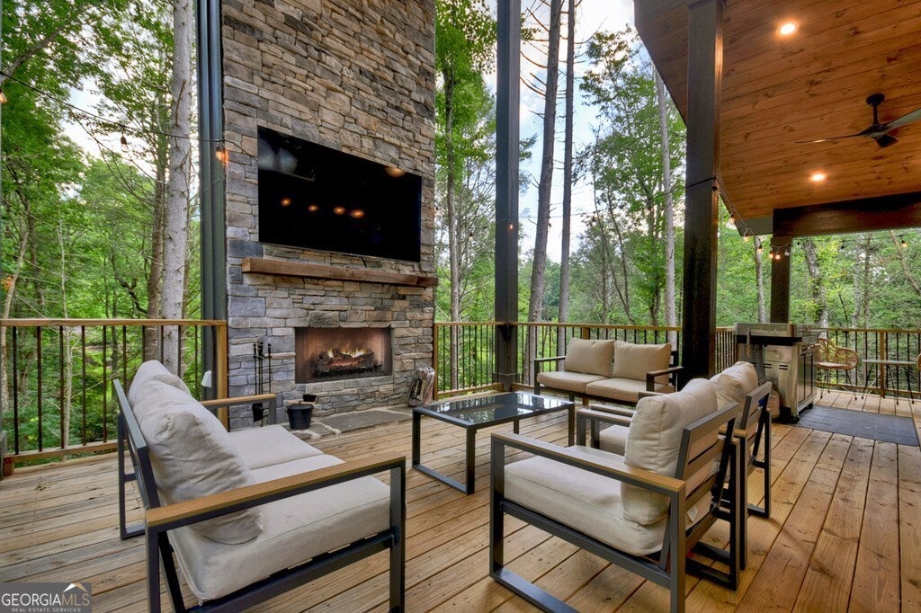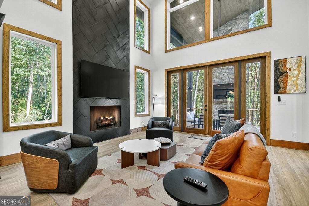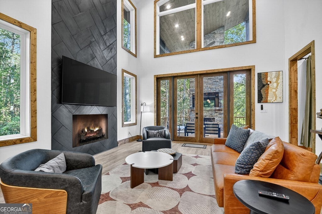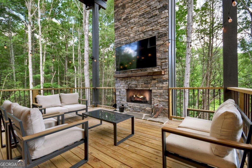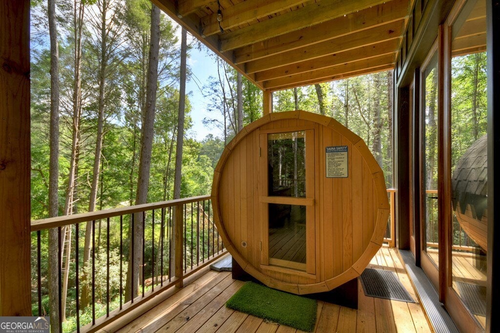 YOUR CREEK FRONT MOUNTAIN OASIS ~ This contemporary 4BR, 3.5 mountain home is nestled in the heart of the Aska Adventure Area near the Toccoa River, Lake Blue Ridge, hiking & mtn. biking trails, trophy trout fishing, thousands of U.S.F.S protected wilderness surrounding & more. Situated on 2.15 beautiful wooded acres overlooking & listening to the cascading creek frontage below totaling 565' of frontage. Custom luxury finishes throughout including gourmet kitchen, custom cabinetry, custom walk in tile showers, stainless appliances, custom lighting & plumbing fixtures & more. All BR's are ensuites w/ upstairs ensuite featuring add. Sitting/office area. Open easy living floor plan that features large island/bar in kitchen offering workspace & seating great for entertaining. Soaring cathedral ceilings throughout w/ lots of glass & windows allowing you to enjoy the great outdoors. Modern style gas log fireplace in the main level living room & in basement Rec Rm/Den in addition to outdoor fireplace on porch overlooking this picture perfect setting. Two levels of covered porches on front of home w/ terrace level porch featuring hot tub & sauna. Finished basement features additional living quarters with 2 BR's & BA with Rec Rm/Den & complete custom wet bar that is a show stopper! Great location for future garage w/ lots of parking on all paved road frontage