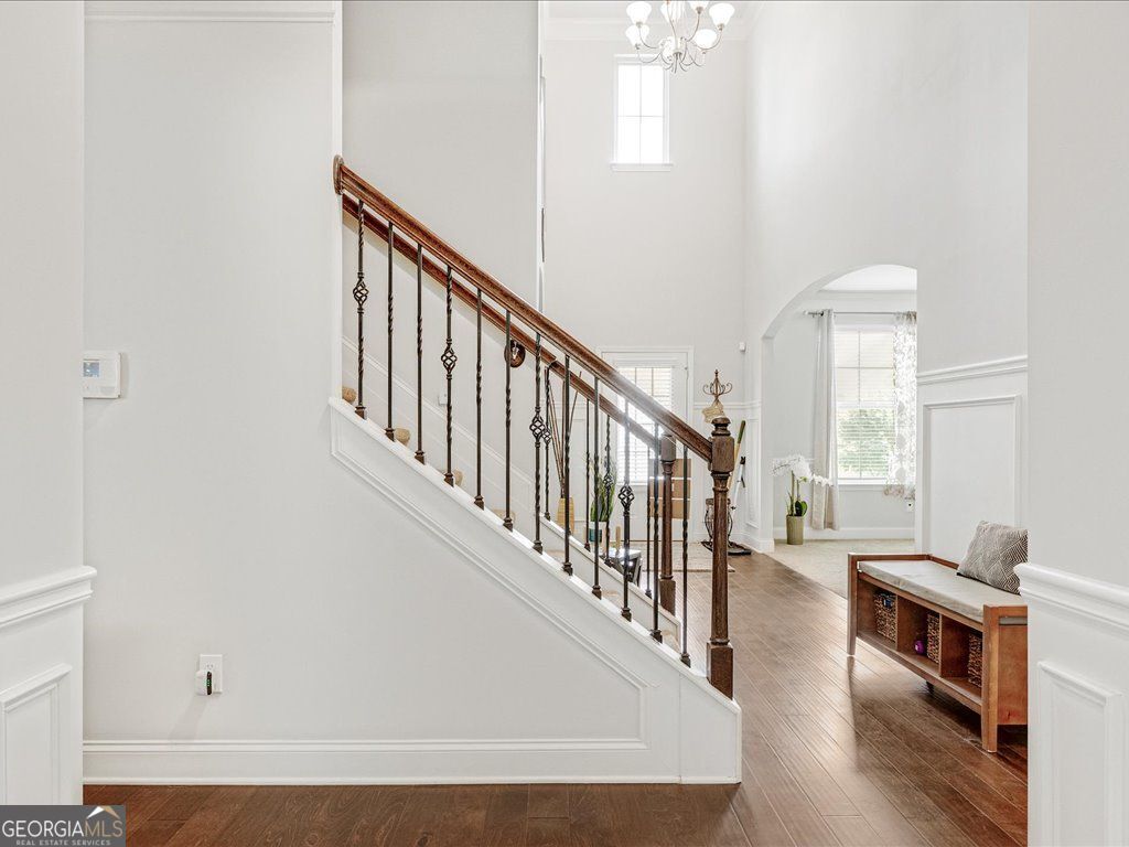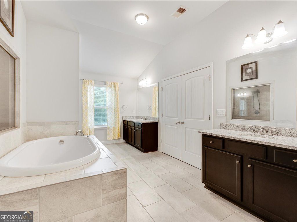 - Interior FeaturesHigh Ceilings, Double Vanity, Tray Ceiling(s), Two Story Foyer, Separate Shower, Pulldown Attic Stairs, Tile Bath, Walk-In Closet(s), Soaking Tub, Split Bedroom Plan, Vaulted Ceiling(s)