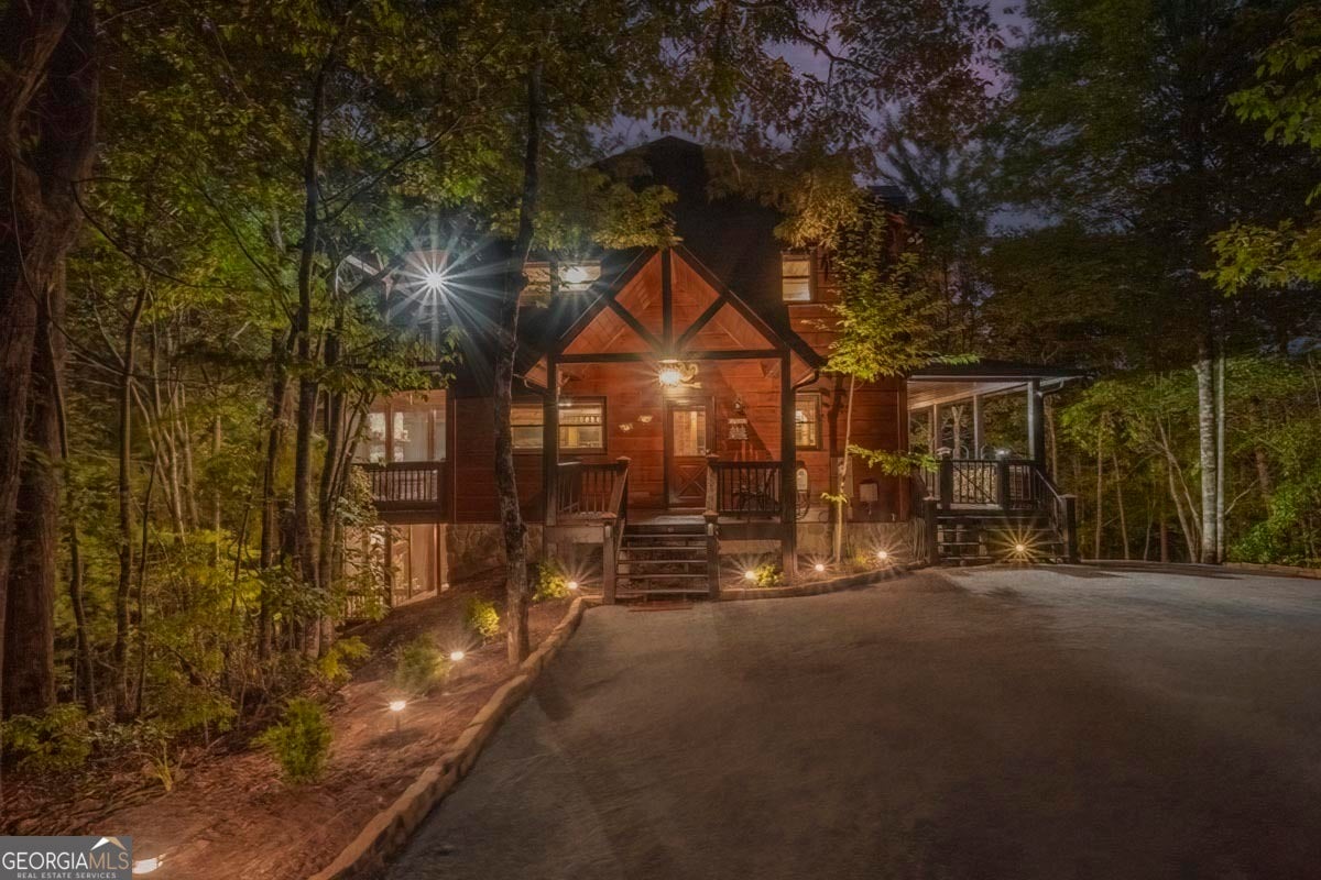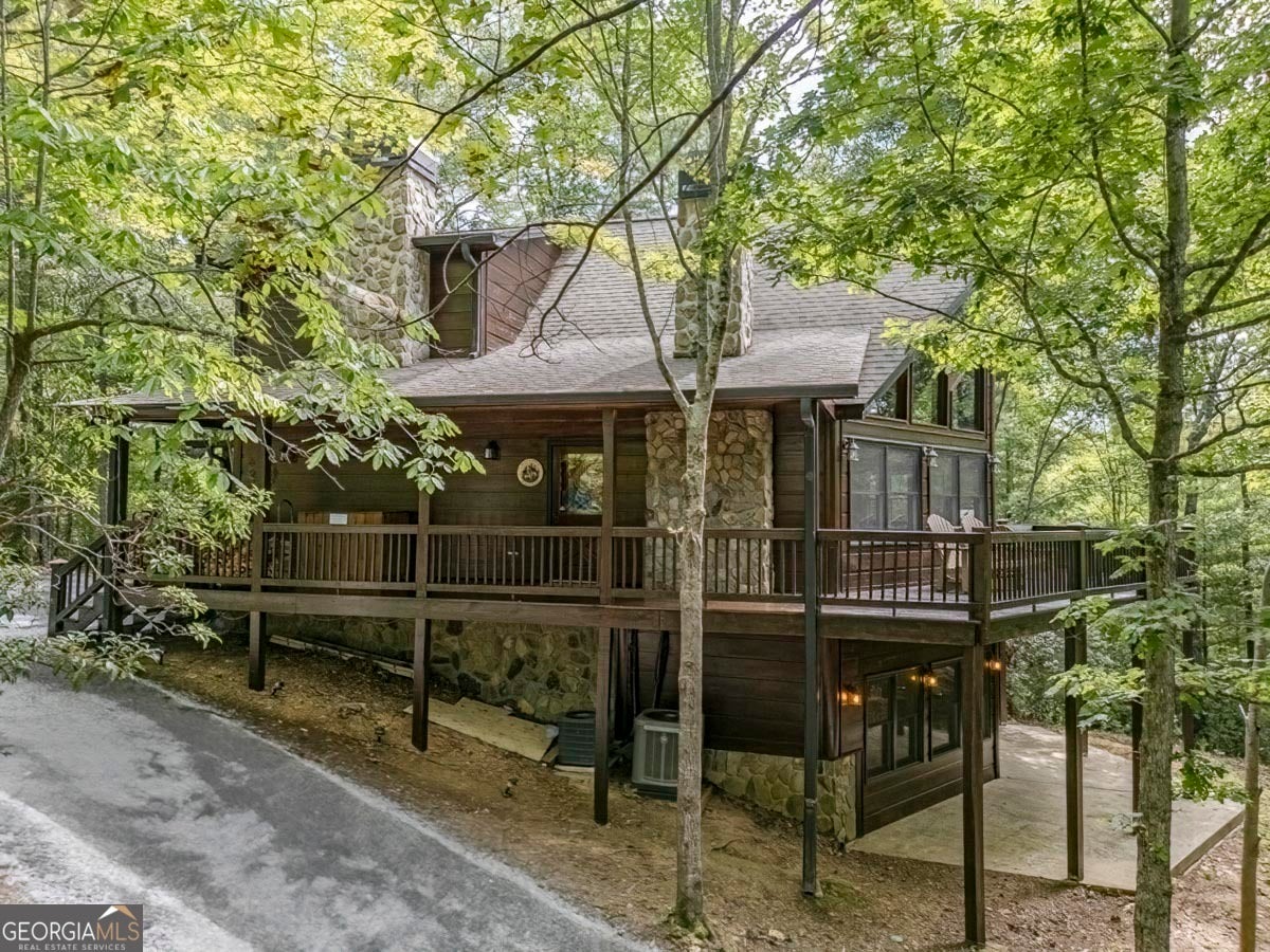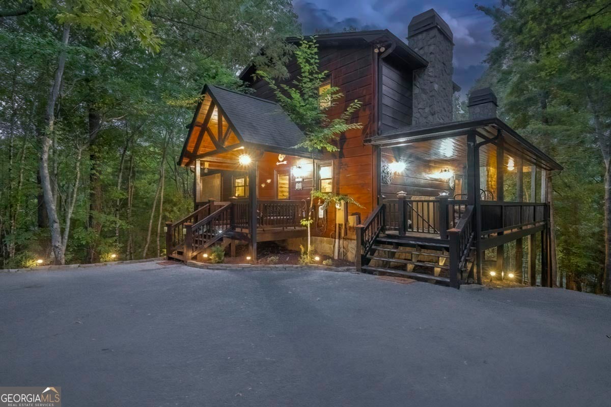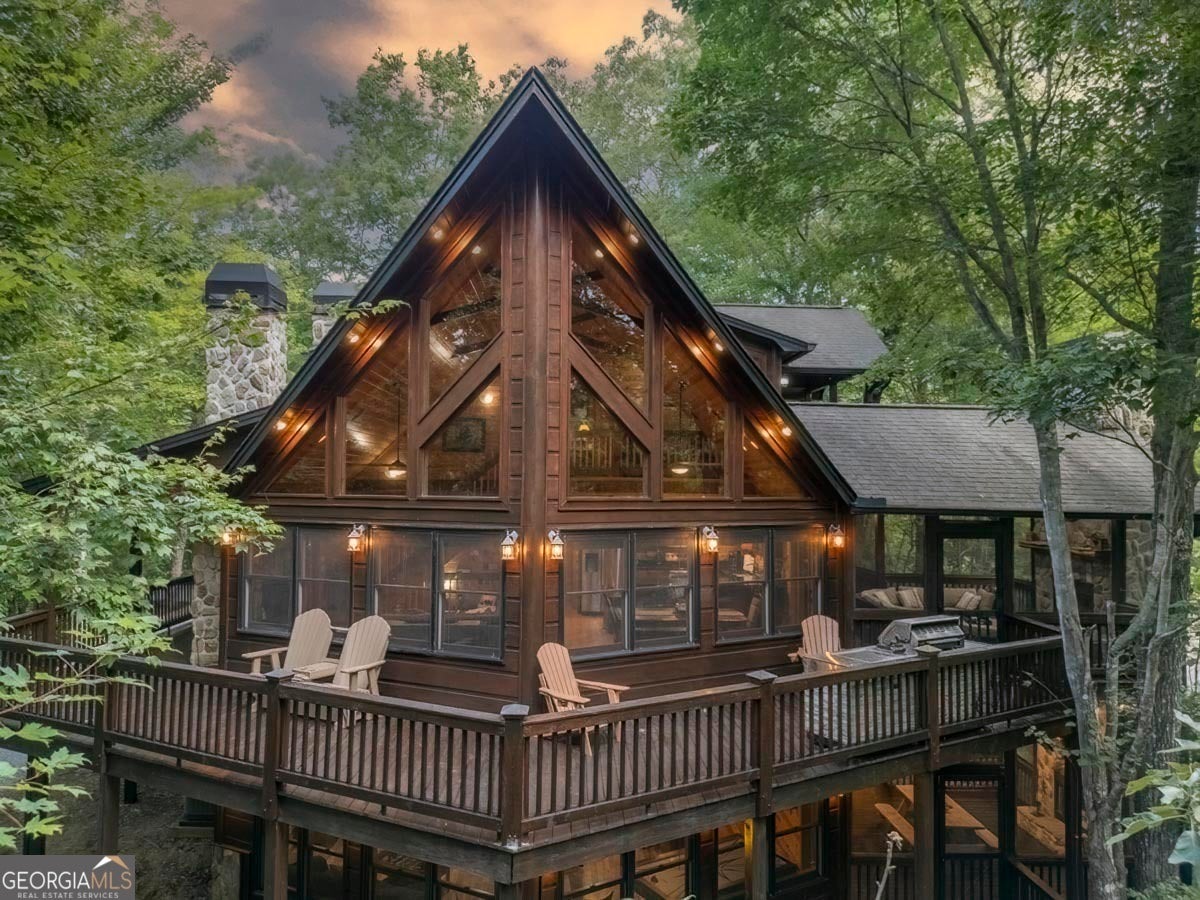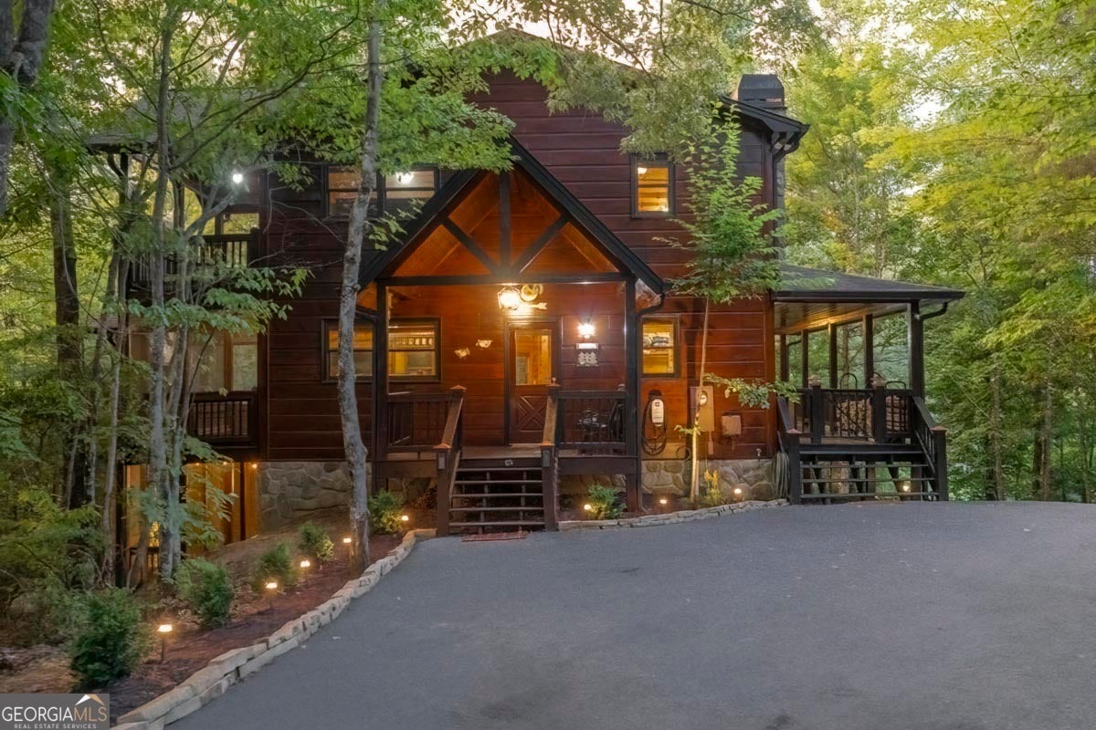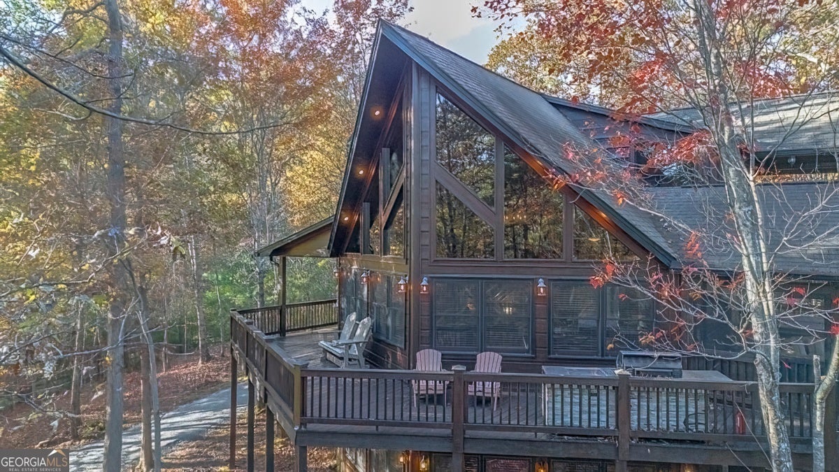 Enjoy the stunning display of colors this autumn in the North Georgia Mountains in this dramatic prow-front cabin located in the community of Mountain Tops!! All paved roads, quick and easy access to Highway 515, and the downtown area of Blue Ridge. This chalet design allows for seamless indoor/outdoor living with its expansive wraparound decks and two exterior fireplaces. It takes full advantage of its wooded setting. The floor-to-ceiling windows span multiple stories, flooding the great room with natural light-a nicely-appointed kitchen with granite counters, and newer Whirlpool stainless steel appliances. The main level outdoor fireplace porch is a thoughtfully-designed space that blends the comforts of home with the beauty of the outdoors: centered around a charming, stacked stone wood-burning fireplace, and access to the open sun deck and grilling area-all-inclusive oversized master suite with private balcony and vaulted ceiling. The master bath includes dual sinks, a jetted tub, a walk-in closet, and custom rock work with a cozy gas fireplace. The finished terrace level, AKA the game room, is the place to be. Featuring a full-size air hockey and pool table, wet bar, and classic arcade games, and access to the lower screened porch with hot tub and outdoor fireplace, plus additional sleeping quarters and full bath. If you can't enjoy the property year-round, no worries- this property has a proven track record as a short-term rental. Being sold turnkey with limited exclusions. Additional features: entire cabin and decks recently stained, ample parking, paved semi-circular driveway with new topcoat. 15x20 shed, security system, built-in speakers and outdoor lighting and space to fence in for pets. Welcome home to 417 South Dream Catcher!!