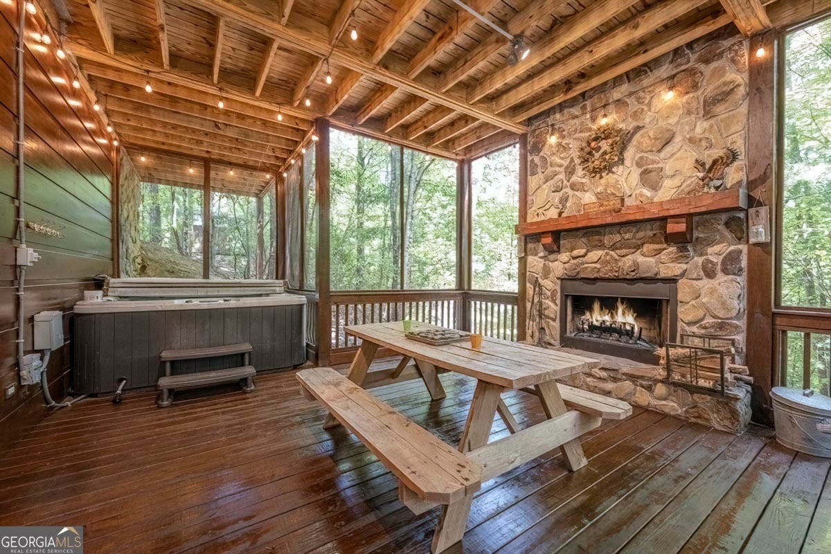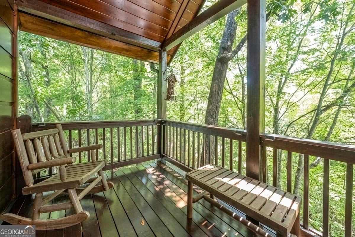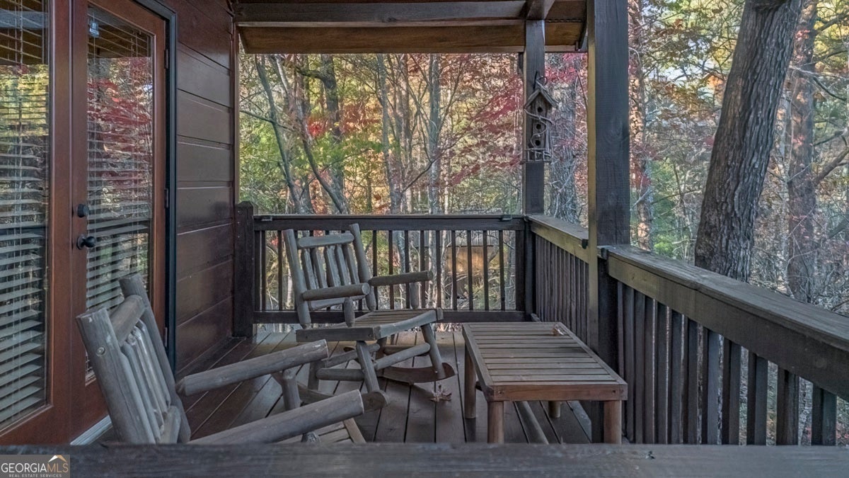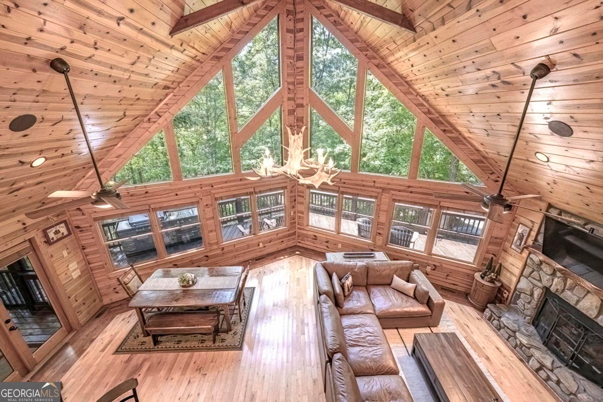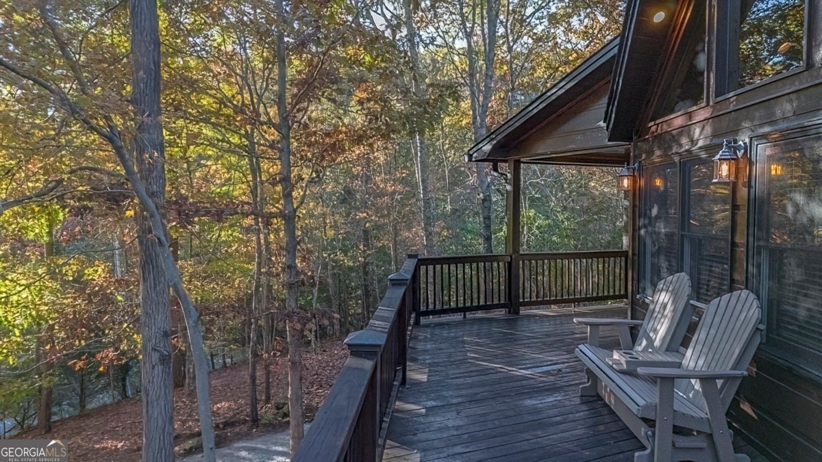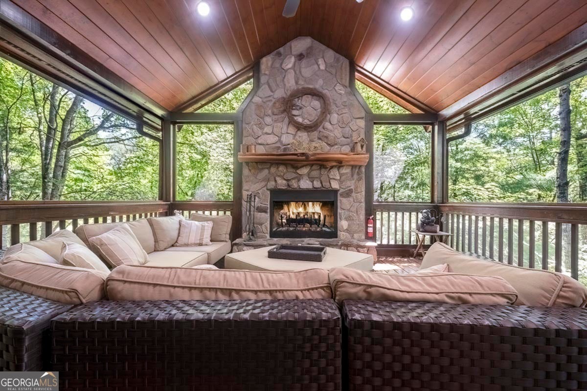 Enjoy the stunning display of colors this autumn in the North Georgia Mountains in this dramatic prow-front cabin located in the community of Mountain Tops!! All paved roads, quick and easy access to Highway 515, and the downtown area of Blue Ridge. This chalet design allows for seamless indoor/outdoor living with its expansive wraparound decks and two exterior fireplaces. It takes full advantage of its wooded setting. The floor-to-ceiling windows span multiple stories, flooding the great room with natural light-a nicely-appointed kitchen with granite counters, and newer Whirlpool stainless steel appliances. The main level outdoor fireplace porch is a thoughtfully-designed space that blends the comforts of home with the beauty of the outdoors: centered around a charming, stacked stone wood-burning fireplace, and access to the open sun deck and grilling area-all-inclusive oversized master suite with private balcony and vaulted ceiling. The master bath includes dual sinks, a jetted tub, a walk-in closet, and custom rock work with a cozy gas fireplace. The finished terrace level, AKA the game room, is the place to be. Featuring a full-size air hockey and pool table, wet bar, and classic arcade games, and access to the lower screened porch with hot tub and outdoor fireplace, plus additional sleeping quarters and full bath. If you can't enjoy the property year-round, no worries- this property has a proven track record as a short-term rental. Being sold turnkey with limited exclusions. Additional features: entire cabin and decks recently stained, ample parking, paved semi-circular driveway with new topcoat. 15x20 shed, security system, built-in speakers and outdoor lighting and space to fence in for pets. Welcome home to 417 South Dream Catcher!!