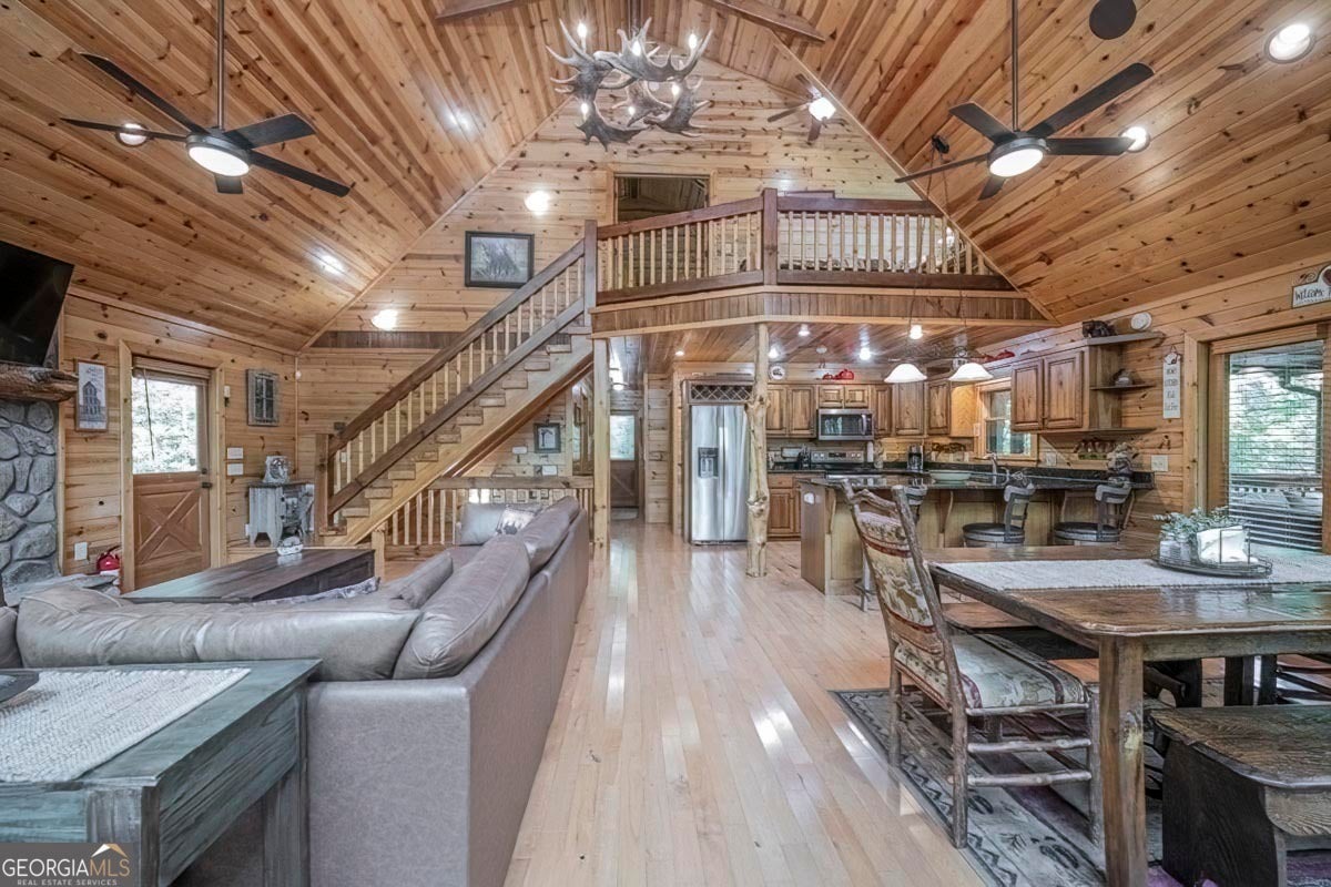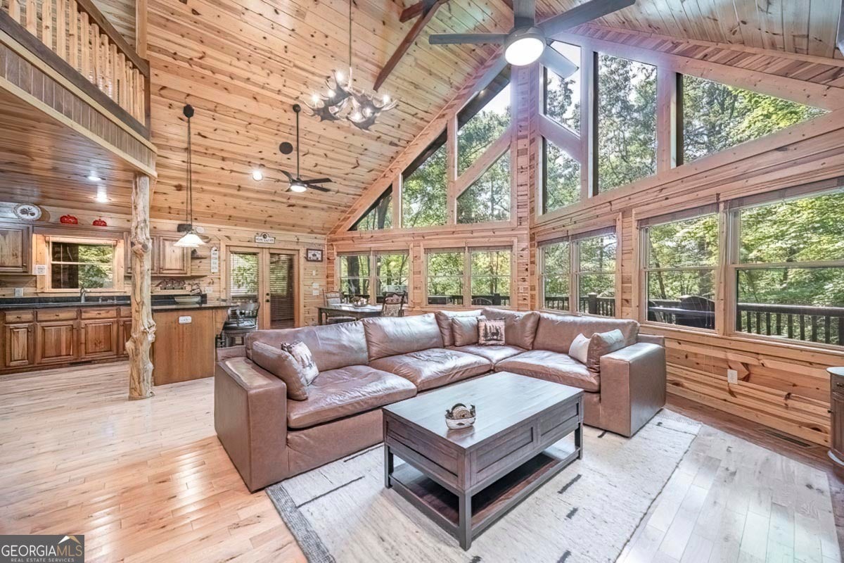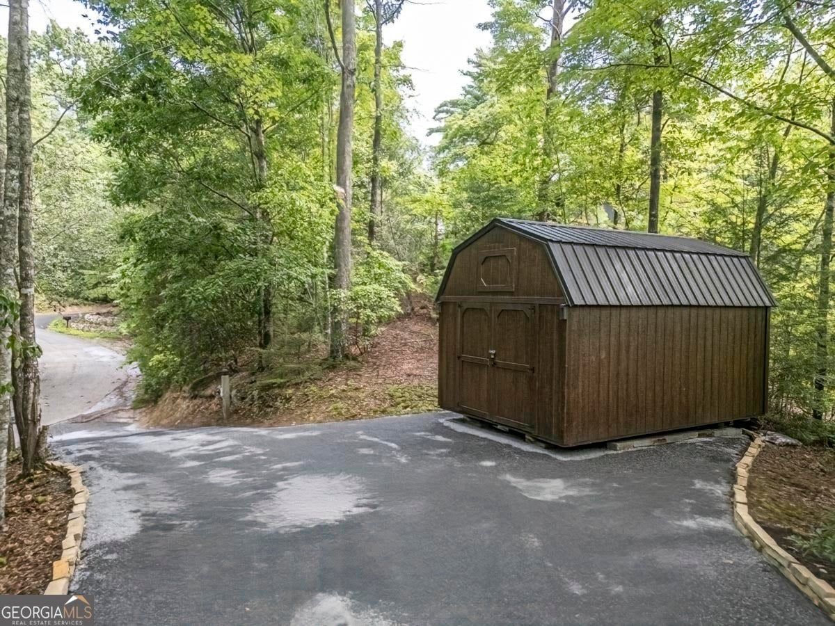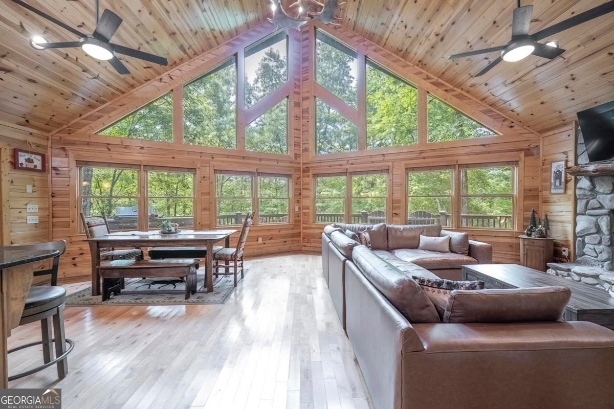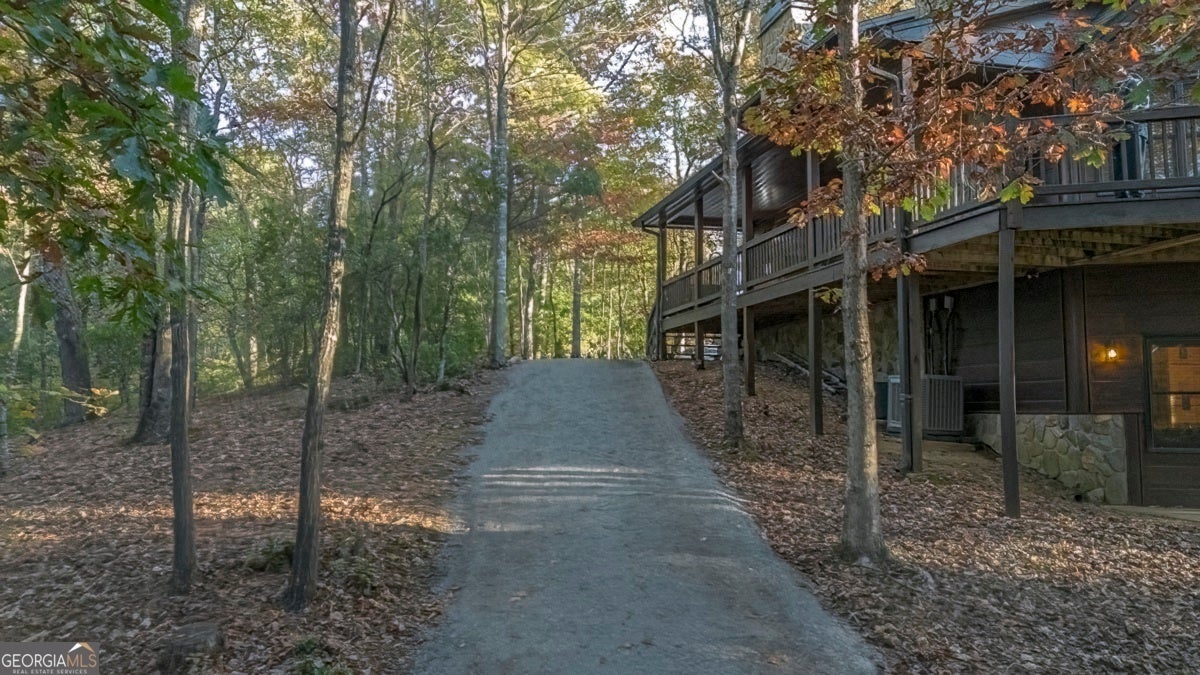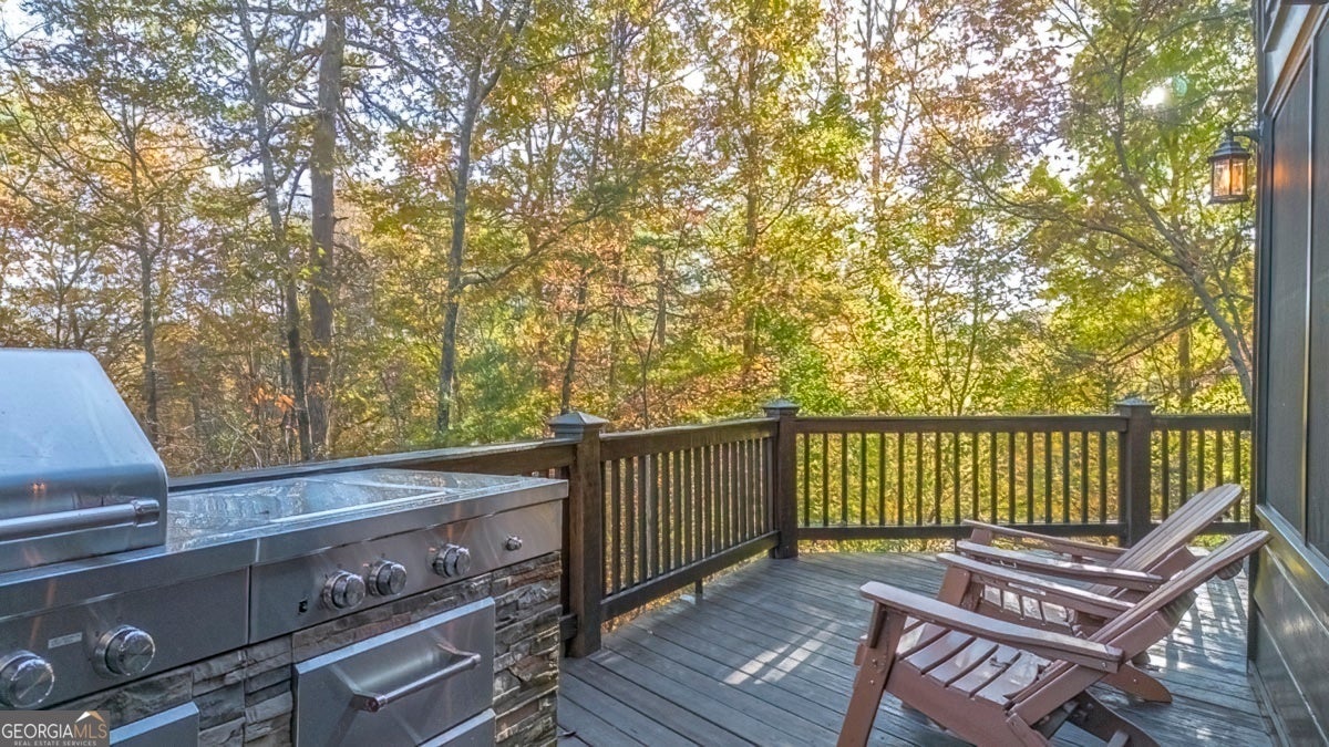 Enjoy the stunning display of colors this autumn in the North Georgia Mountains in this dramatic prow-front cabin located in the community of Mountain Tops!! All paved roads, quick and easy access to Highway 515, and the downtown area of Blue Ridge. This chalet design allows for seamless indoor/outdoor living with its expansive wraparound decks and two exterior fireplaces. It takes full advantage of its wooded setting. The floor-to-ceiling windows span multiple stories, flooding the great room with natural light-a nicely-appointed kitchen with granite counters, and newer Whirlpool stainless steel appliances. The main level outdoor fireplace porch is a thoughtfully-designed space that blends the comforts of home with the beauty of the outdoors: centered around a charming, stacked stone wood-burning fireplace, and access to the open sun deck and grilling area-all-inclusive oversized master suite with private balcony and vaulted ceiling. The master bath includes dual sinks, a jetted tub, a walk-in closet, and custom rock work with a cozy gas fireplace. The finished terrace level, AKA the game room, is the place to be. Featuring a full-size air hockey and pool table, wet bar, and classic arcade games, and access to the lower screened porch with hot tub and outdoor fireplace, plus additional sleeping quarters and full bath. If you can't enjoy the property year-round, no worries- this property has a proven track record as a short-term rental. Being sold turnkey with limited exclusions. Additional features: entire cabin and decks recently stained, ample parking, paved semi-circular driveway with new topcoat. 15x20 shed, security system, built-in speakers and outdoor lighting and space to fence in for pets. Welcome home to 417 South Dream Catcher!!