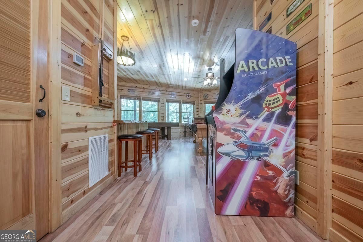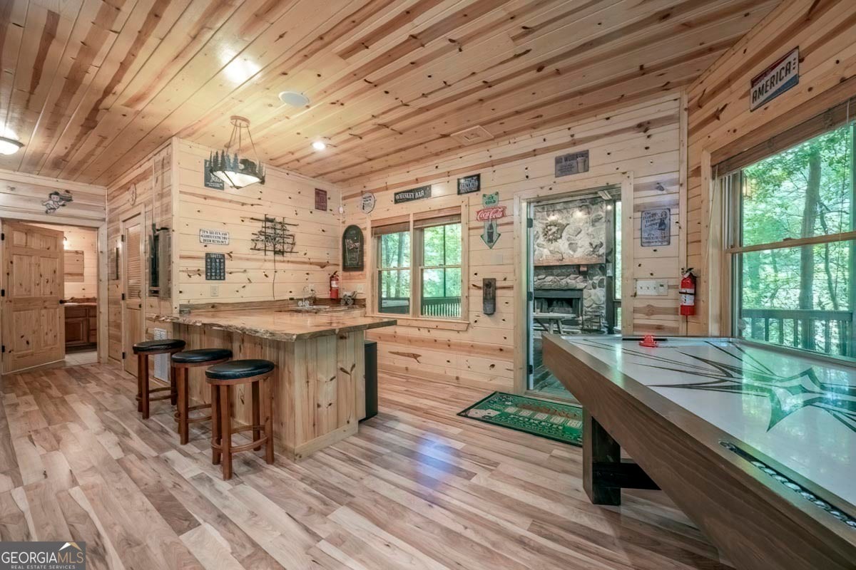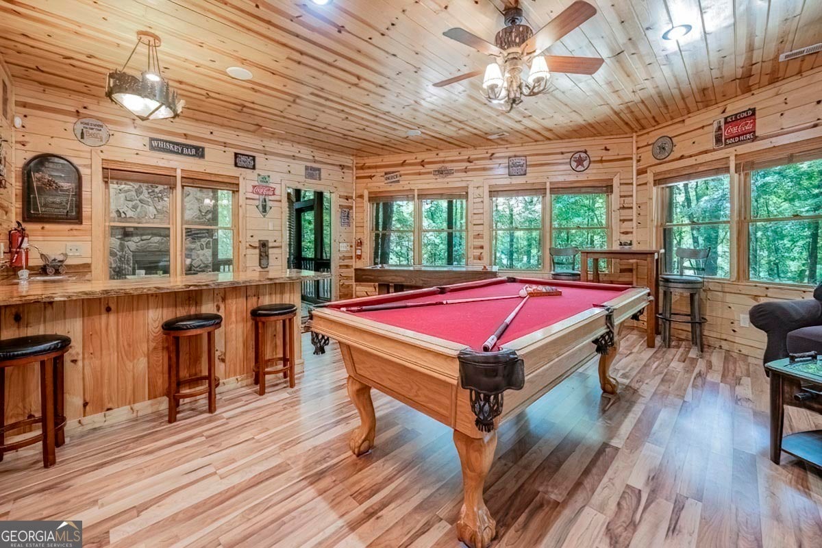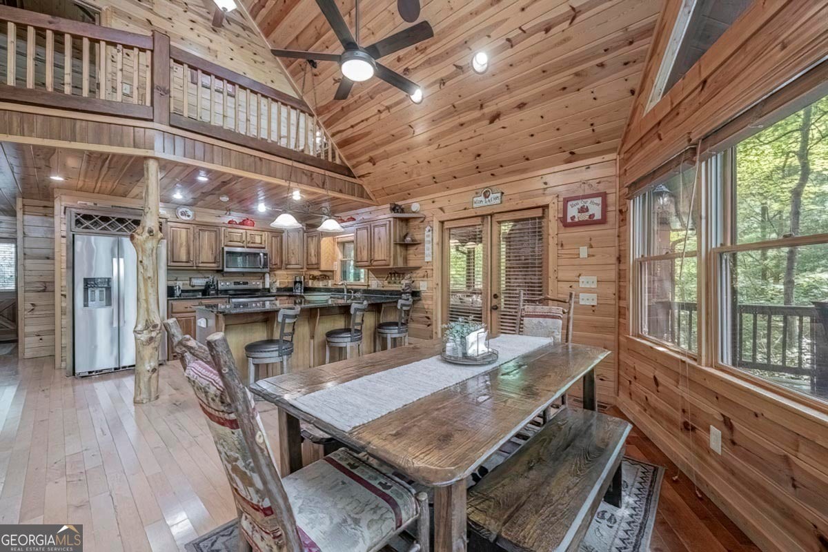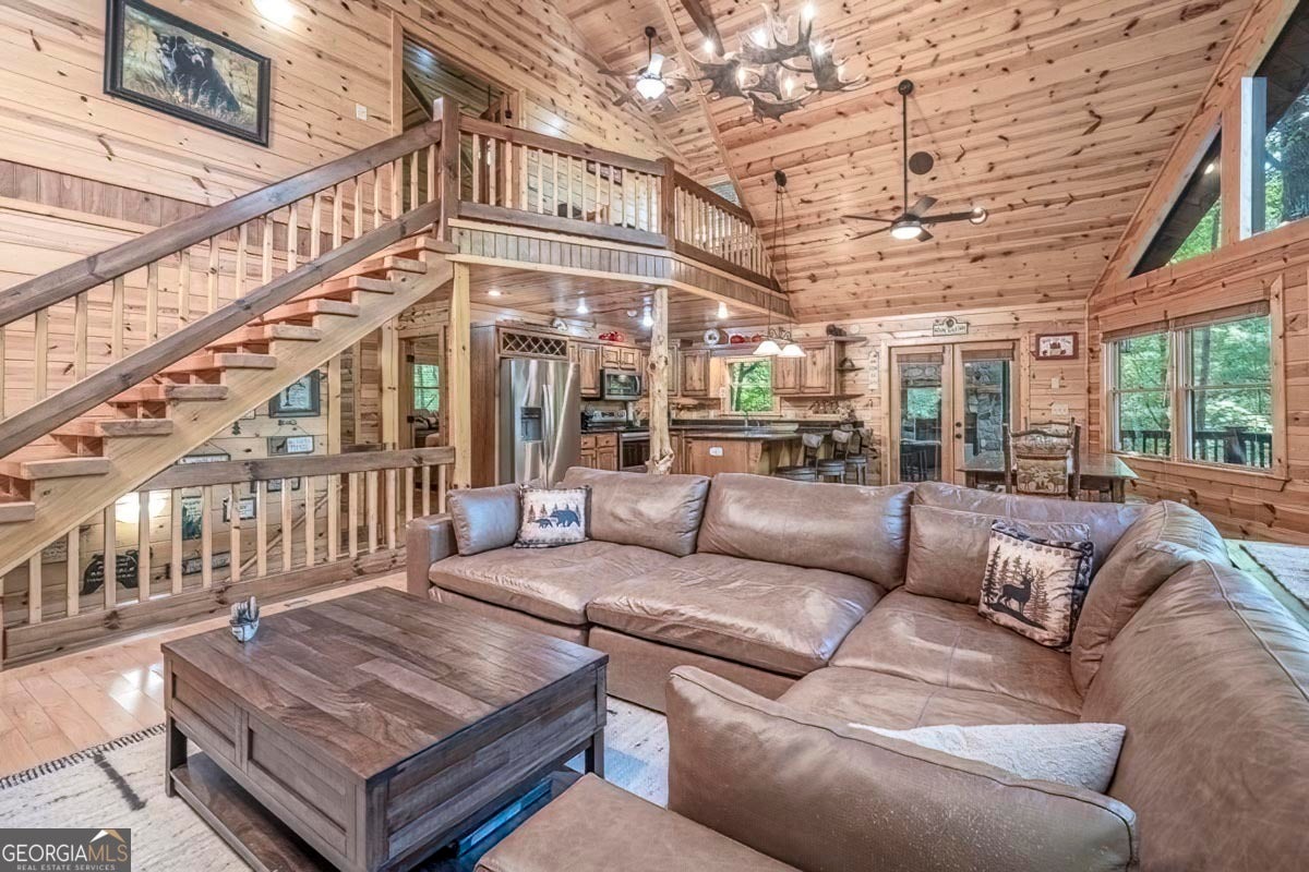 Enjoy the stunning display of colors this autumn in the North Georgia Mountains in this dramatic prow-front cabin located in the community of Mountain Tops!! All paved roads, quick and easy access to Highway 515, and the downtown area of Blue Ridge. This chalet design allows for seamless indoor/outdoor living with its expansive wraparound decks and two exterior fireplaces. It takes full advantage of its wooded setting. The floor-to-ceiling windows span multiple stories, flooding the great room with natural light-a nicely-appointed kitchen with granite counters, and newer Whirlpool stainless steel appliances. The main level outdoor fireplace porch is a thoughtfully-designed space that blends the comforts of home with the beauty of the outdoors: centered around a charming, stacked stone wood-burning fireplace, and access to the open sun deck and grilling area-all-inclusive oversized master suite with private balcony and vaulted ceiling. The master bath includes dual sinks, a jetted tub, a walk-in closet, and custom rock work with a cozy gas fireplace. The finished terrace level, AKA the game room, is the place to be. Featuring a full-size air hockey and pool table, wet bar, and classic arcade games, and access to the lower screened porch with hot tub and outdoor fireplace, plus additional sleeping quarters and full bath. If you can't enjoy the property year-round, no worries- this property has a proven track record as a short-term rental. Being sold turnkey with limited exclusions. Additional features: entire cabin and decks recently stained, ample parking, paved semi-circular driveway with new topcoat. 15x20 shed, security system, built-in speakers and outdoor lighting and space to fence in for pets. Welcome home to 417 South Dream Catcher!!