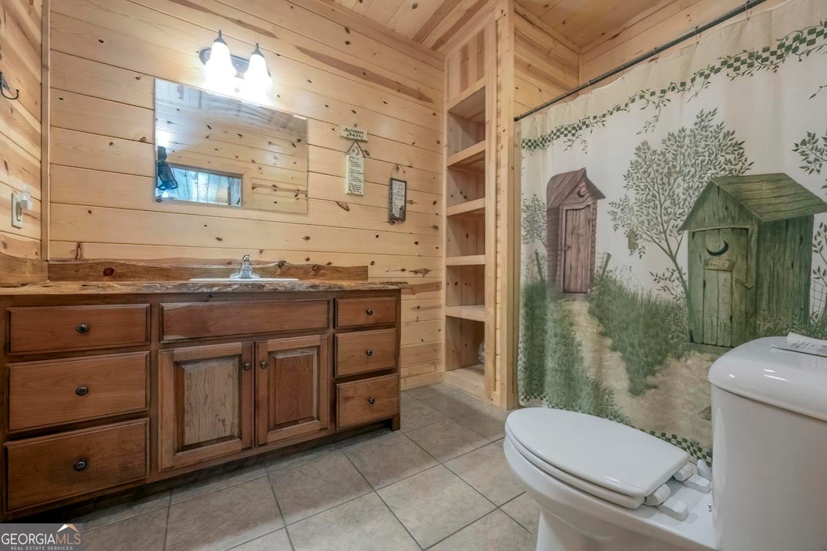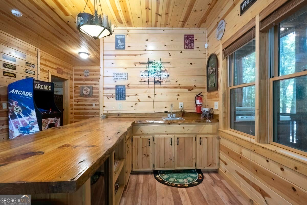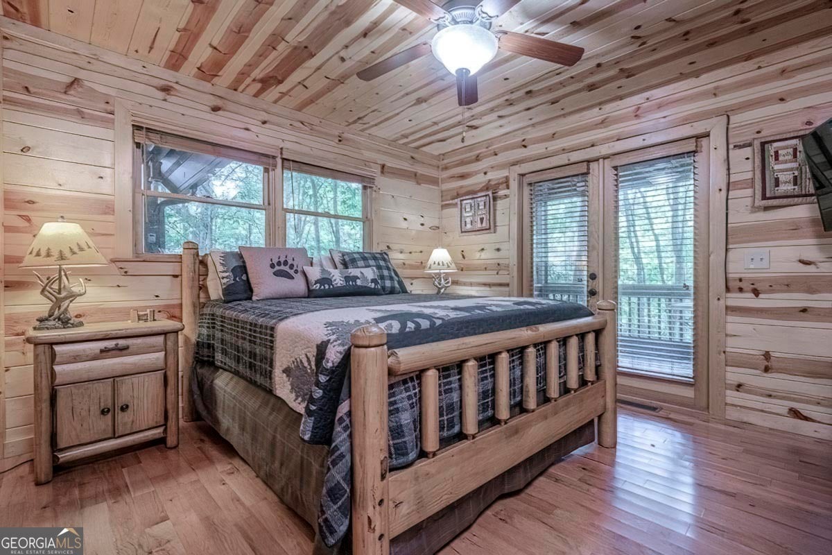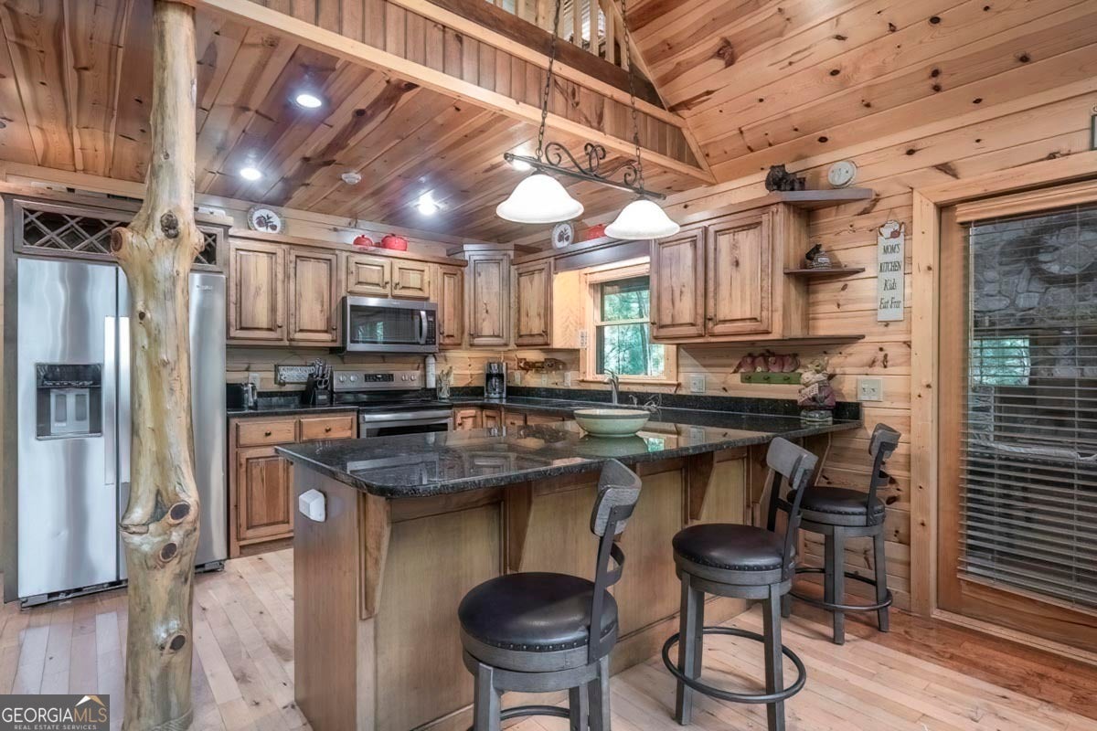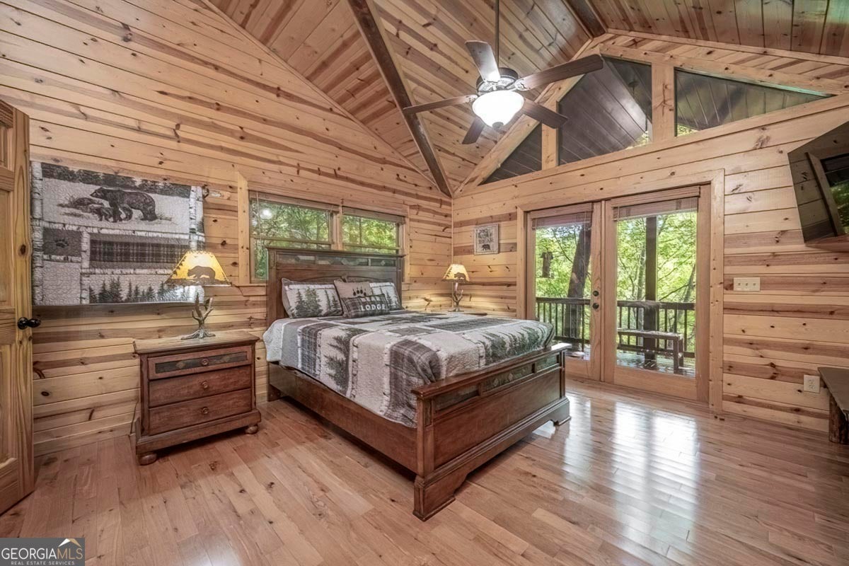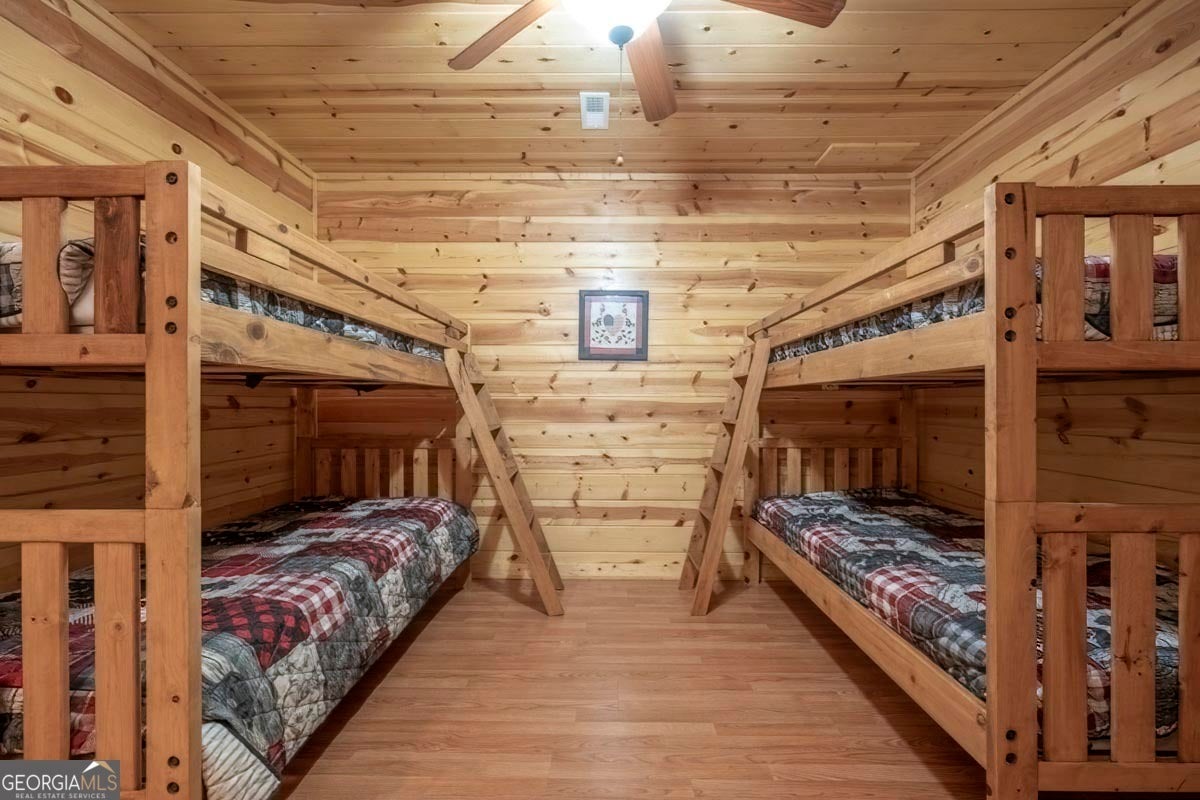 Enjoy the stunning display of colors this autumn in the North Georgia Mountains in this dramatic prow-front cabin located in the community of Mountain Tops!! All paved roads, quick and easy access to Highway 515, and the downtown area of Blue Ridge. This chalet design allows for seamless indoor/outdoor living with its expansive wraparound decks and two exterior fireplaces. It takes full advantage of its wooded setting. The floor-to-ceiling windows span multiple stories, flooding the great room with natural light-a nicely-appointed kitchen with granite counters, and newer Whirlpool stainless steel appliances. The main level outdoor fireplace porch is a thoughtfully-designed space that blends the comforts of home with the beauty of the outdoors: centered around a charming, stacked stone wood-burning fireplace, and access to the open sun deck and grilling area-all-inclusive oversized master suite with private balcony and vaulted ceiling. The master bath includes dual sinks, a jetted tub, a walk-in closet, and custom rock work with a cozy gas fireplace. The finished terrace level, AKA the game room, is the place to be. Featuring a full-size air hockey and pool table, wet bar, and classic arcade games, and access to the lower screened porch with hot tub and outdoor fireplace, plus additional sleeping quarters and full bath. If you can't enjoy the property year-round, no worries- this property has a proven track record as a short-term rental. Being sold turnkey with limited exclusions. Additional features: entire cabin and decks recently stained, ample parking, paved semi-circular driveway with new topcoat. 15x20 shed, security system, built-in speakers and outdoor lighting and space to fence in for pets. Welcome home to 417 South Dream Catcher!!