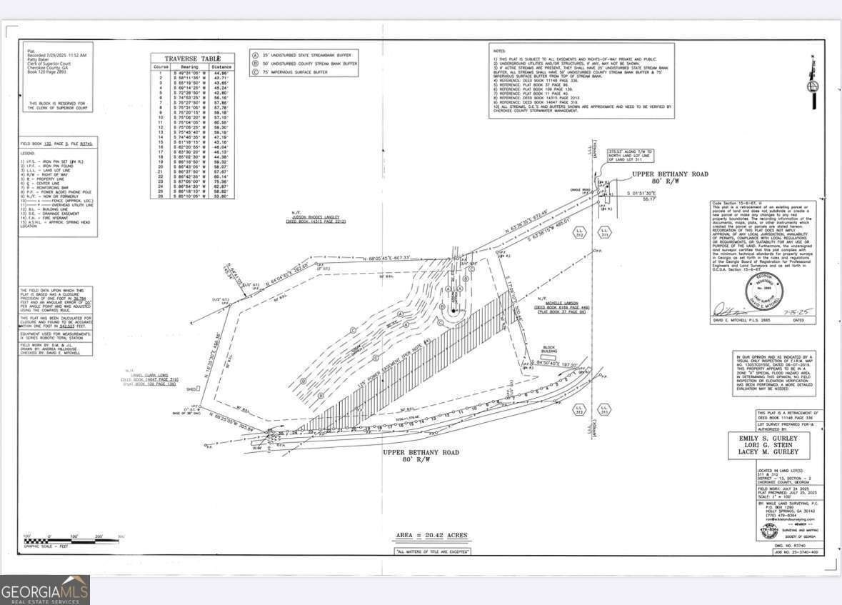 WOW! 20.42AC +/- IN CHEROKEE COUNTY! Great Location minutes north of Riverstone Pkwy/Canton Hwy. 5 in Ball Ground, GA. This property presents a Terrific Opportunity for a variety of uses-from building your Dream Home to creating a potential family compound or farm in the country, all while being close enough for the conveniences of Canton or the Charming Downtown Ball Ground! Public CCWSA Water and Amicola EMC at the road. Owners just recorded a 07/2025 NEW PLAT. Looking at the plat you can easily see where several homes/etc. could possibly be built by working around the easements. The builder could consider placing a spec home on the right side and then building houses on the left side of the stream/easements, possibly using a shared driveway that would allow each home to access it. SO MANY OPTIONS AND OPPORTUNITIES!!!!