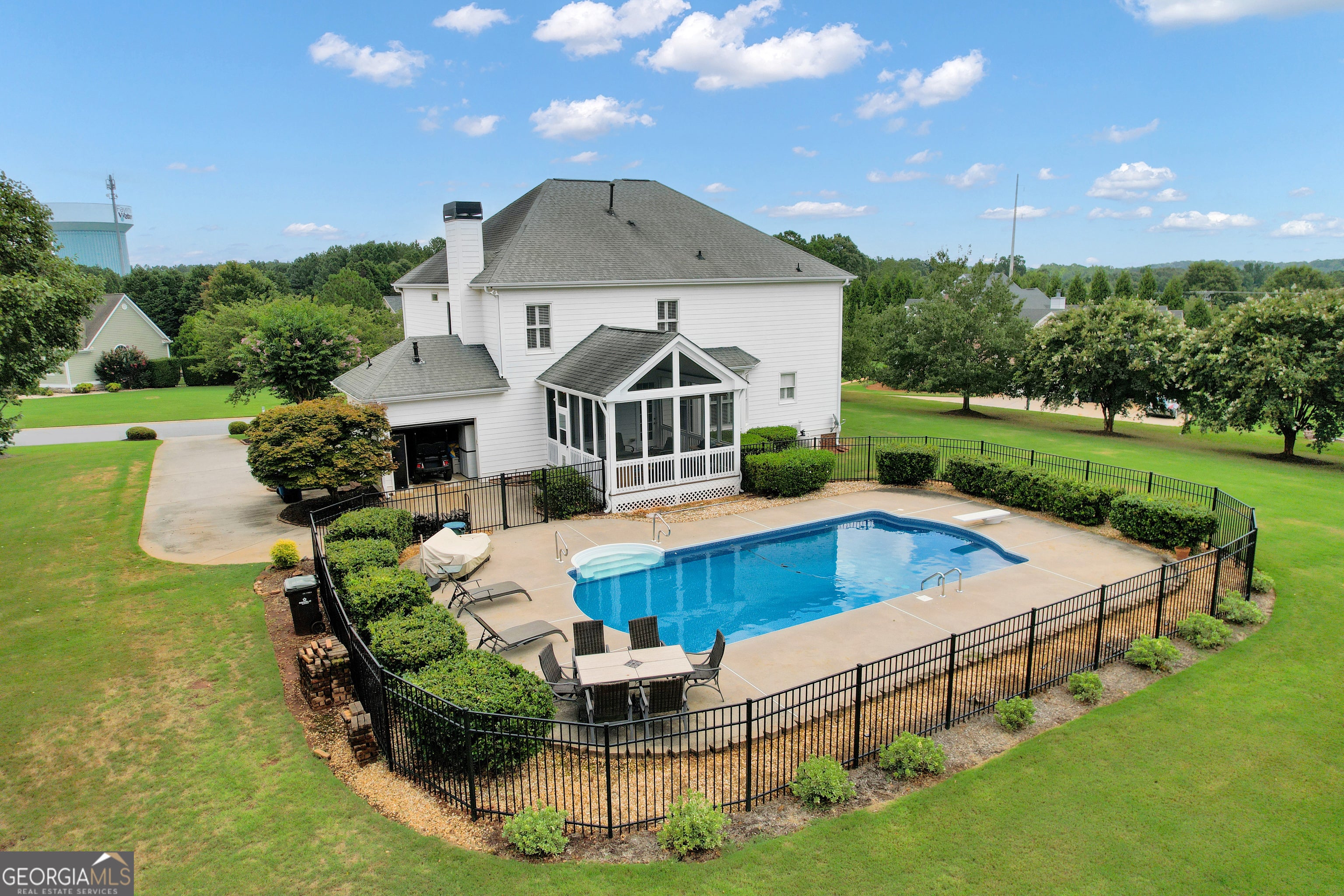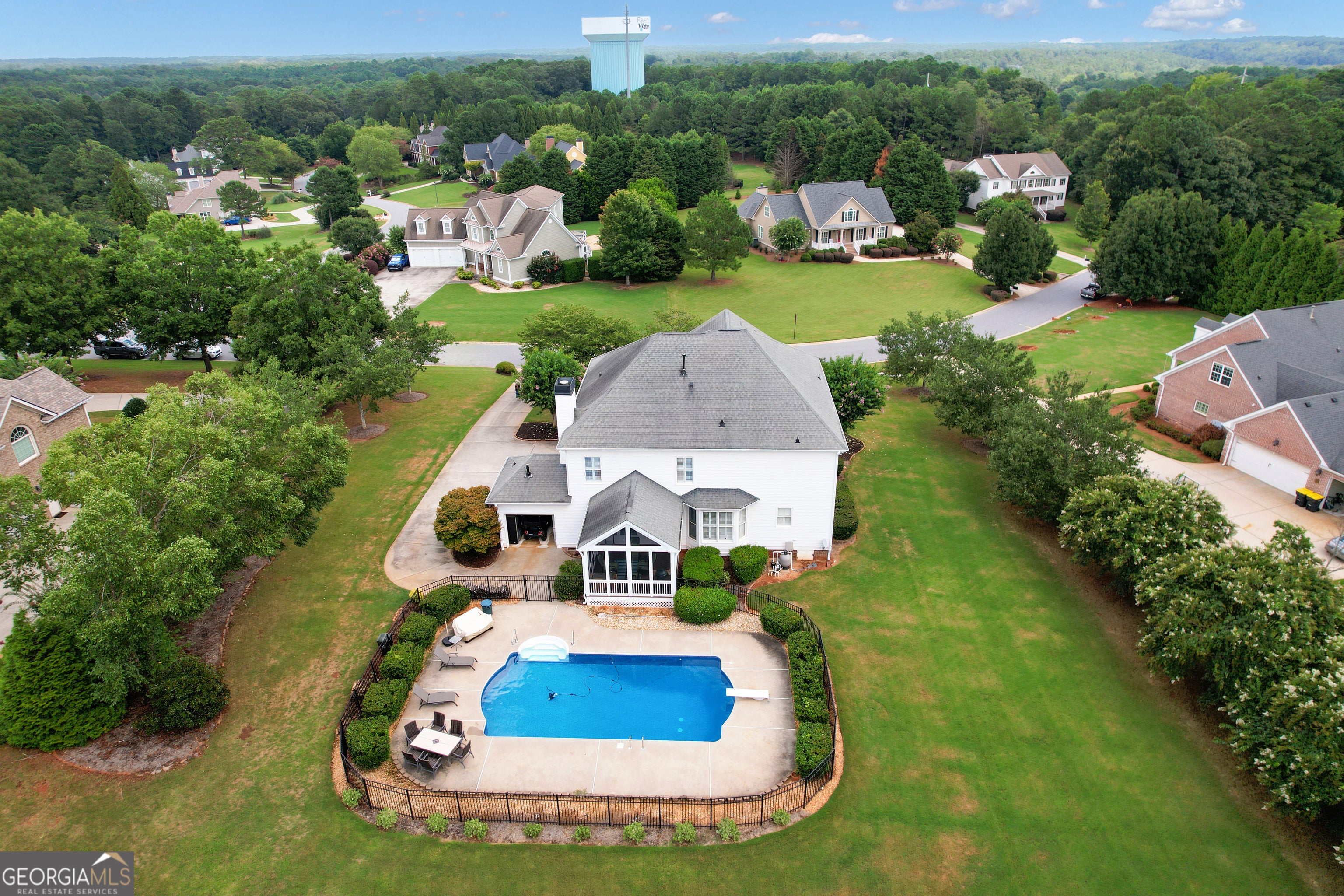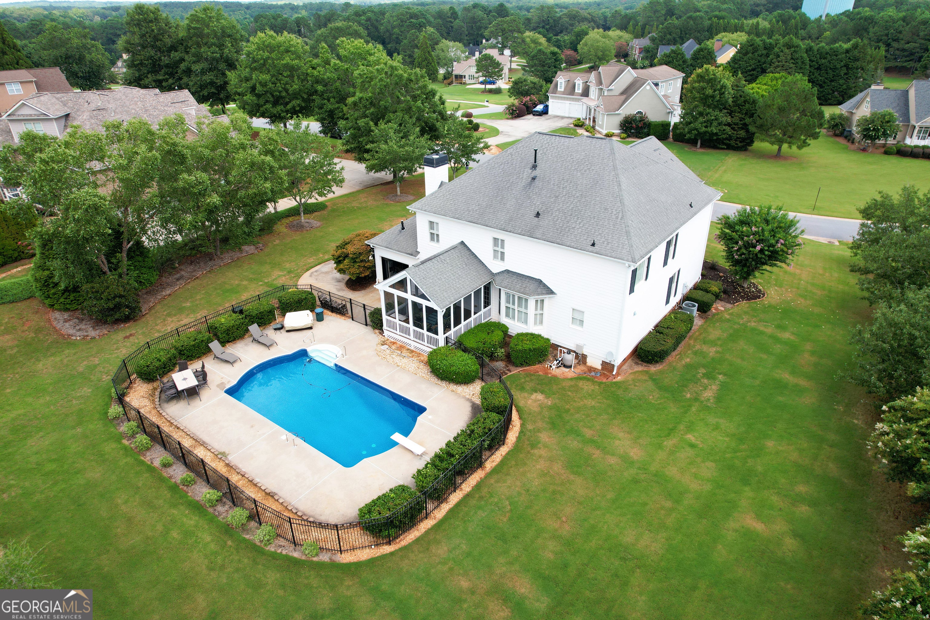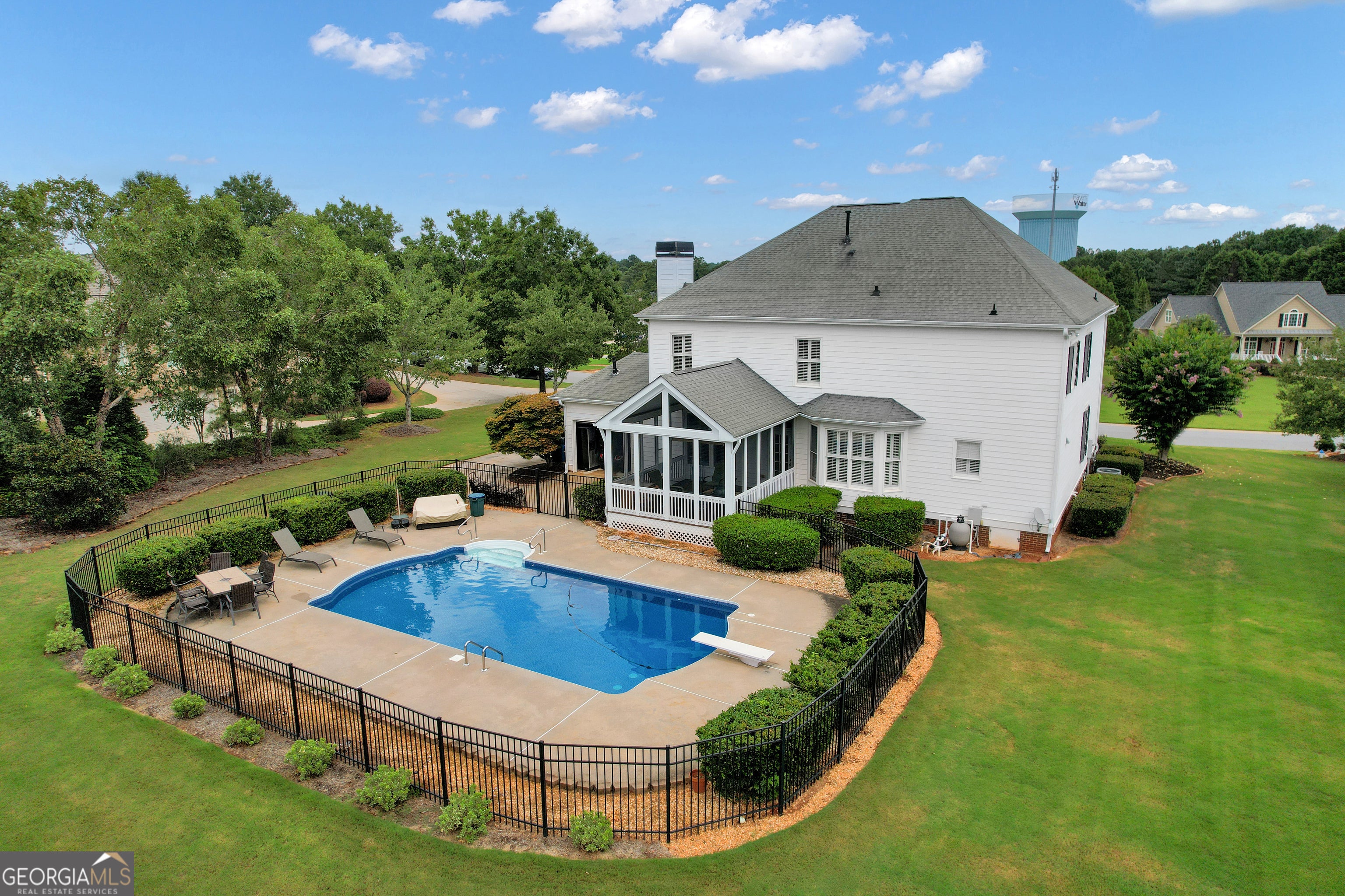 **NEW ROOF, GORGEOUS SALT WATER POOL, & AMAZING FLAT BACKYARD!!! Southern Charm Meets Modern Luxury in Sought-After Maple Shade!!! Set on a rare 1.2-acre flat lot in the prestigious Maple Shade subdivision, this beautifully upgraded Colonial-style home with hardi-plank siding & BRAND NEW ROOF (Sept 2025) offers timeless curb appeal and modern conveniences in one of Peachtree City's highest elevation points. Just minutes from Hartsfield-Jackson Airport, Trilith Studios, the U.S. Soccer Federation Training Center, and The Avenue Peachtree City, this home provides both privacy and premier access. The open and thoughtfully designed floor plan welcomes you with hardwood floors throughout the main level, rich crown molding, plantation shutters, and custom trim work. The gourmet chef's kitchen features granite countertops, custom cabinetry, under-cabinet lighting, 4-burner gas cooktop, double convection ovens, Bosch refrigerator (2024), large island, and a sink overlooking the peaceful backyard. It opens seamlessly into the spacious family room with a gas-start, wood-burning stacked stone fireplace, built-in cabinetry, and recessed lighting-ideal for entertaining or relaxing. A formal dining room with wainscoting seats eight comfortably, while a private office/den with French doors and a coffered ceiling makes working from home a breeze. Upstairs, a large loft/media room with built-ins leads to the upper balcony and offers an additional gathering space. The second floor boasts four spacious bedrooms with ceiling fans and three full bathrooms. The luxurious owner's suite includes a sitting area, trey ceiling, double-door entry, dual walk-in closets with built-ins, and a spa-like bath with jetted tub, frameless glass shower, and dual vanities. Two bedrooms share a Jack-and-Jill bath, while the fourth has its own en-suite-perfect for guests or teens. The upstairs laundry room with built-ins and retractable ironing board provides easy access. Ample storage is provided with two large linen closets and pull-down attic access as well. Enjoy year-round outdoor living with a vaulted screened-in porch overlooking a saltwater pool with a new liner and salt cell (2025), 9-ft depth with diving board, and smart timer/app-controlled pump and lighting. Additional features include a golf cart garage with tiled, climate-controlled half bath, irrigation system with 12 zones, invisible fence, Rinnai tankless water heater, and an insulated 2-car garage with overhead storage and a brand-new garage door (2024). Zoned for top Fayette County schools and directly connected to Peachtree City's golf cart path system, this home is a rare opportunity to enjoy luxury, space, and community in one of the Southside's most coveted neighborhoods. ***BACK ON MARKET - BUYER FINANCING FELL THROUGH***
