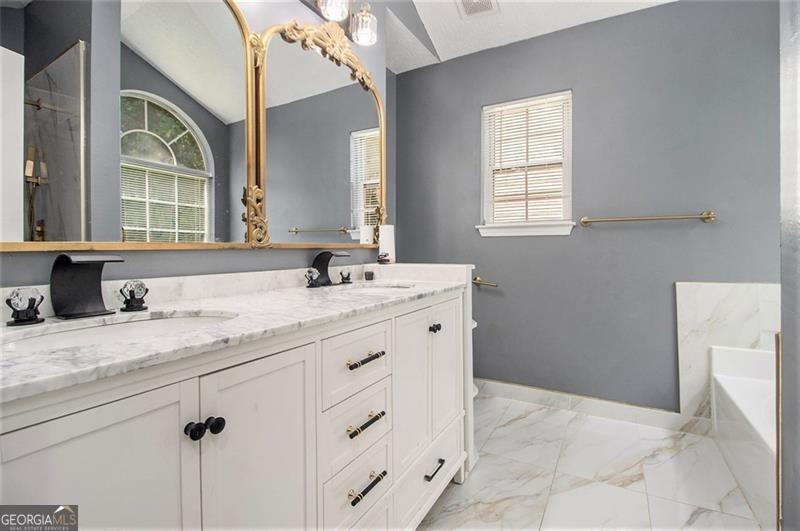 - Interior FeaturesDouble Vanity, Soaking Tub, Pulldown Attic Stairs, Split Foyer, Rear Stairs, Separate Shower, Vaulted Ceiling(s)