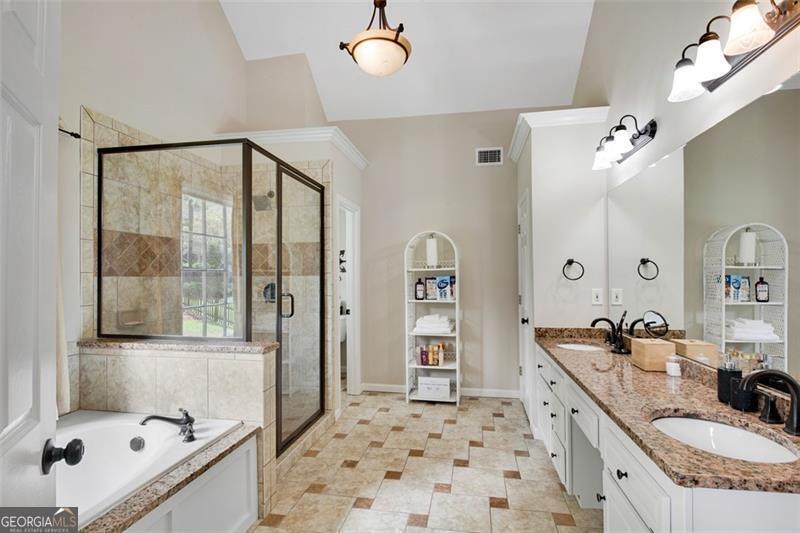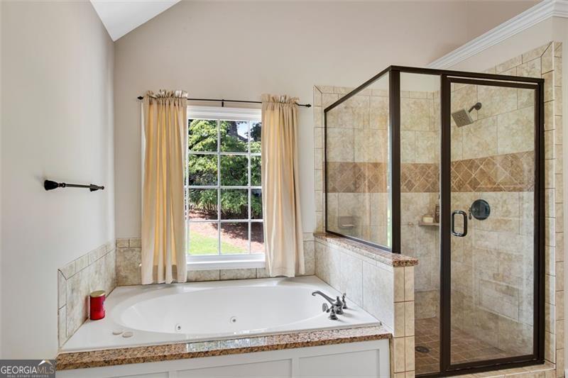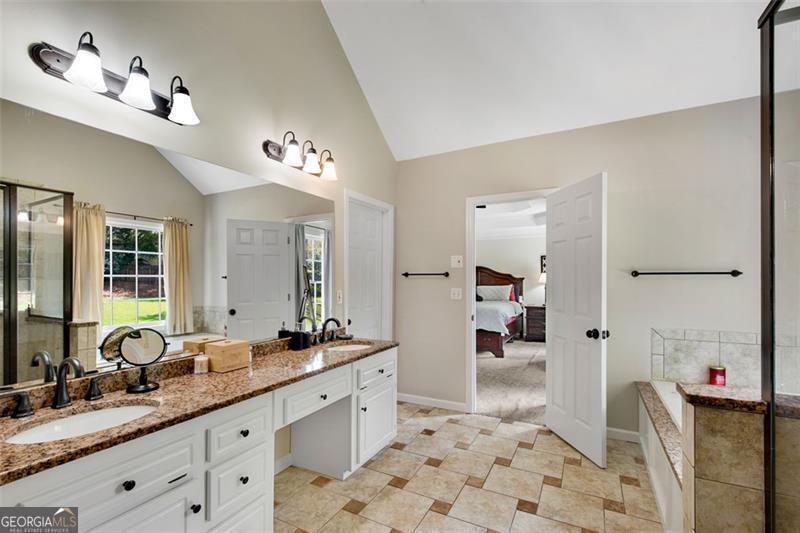- Interior FeaturesDouble Vanity, Two Story Foyer, Soaking Tub, Tile Bath, Tray Ceiling(s), Vaulted Ceiling(s), Separate Shower, Walk-In Closet(s), High Ceilings