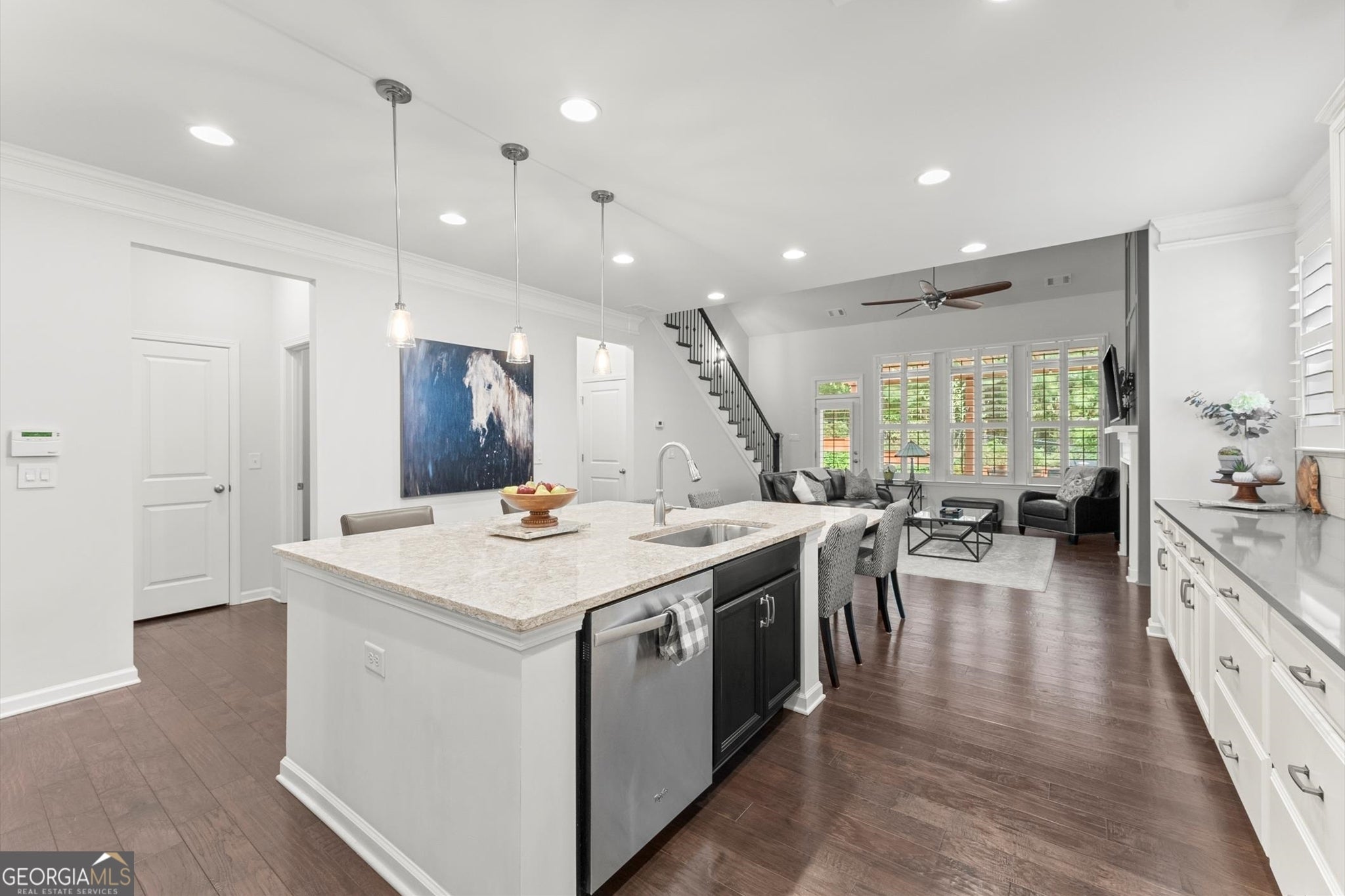 Welcome home to this beautifully updated 4-bedroom, 2.5-bath home in sought-after Stoney Creek! Ideally located just minutes from both vibrant Downtown Woodstock and the booming Downtown Holly Springs, this move-in ready gem offers the perfect blend of comfort, style, and convenience. The spacious main level features a serene primary hard wooded suite with a luxurious en-suite bath with quartz countertops and a custom closet system designed for optimal organization. You'll also find an elegant formal dining room and a gorgeous kitchen with cambira countertops, stainless steel appliances, hardwood floors, and a view to the vaulted fireside family room-perfect for entertaining or everyday living. Beautiful plantation shutters are throughout every window in this home creating elegance throughout. Upstairs, a large loft provides flexible space ideal for a media room, playroom, or home office. Jack and Jill bathroom with quartz countertops and tile floors. The secondary, upstairs bedrooms are large with walk in closets and ample natural light. Step outside to your private, fenced backyard complete with professional landscaping and patio with wooded pergola-perfect for relaxing or hosting guests. Every inch of this home has been thoughtfully updated for modern living. Located in a vibrant community with two pools, a playground, and an active HOA. Don't miss your chance to live in one of Woodstock's most desirable neighborhoods!