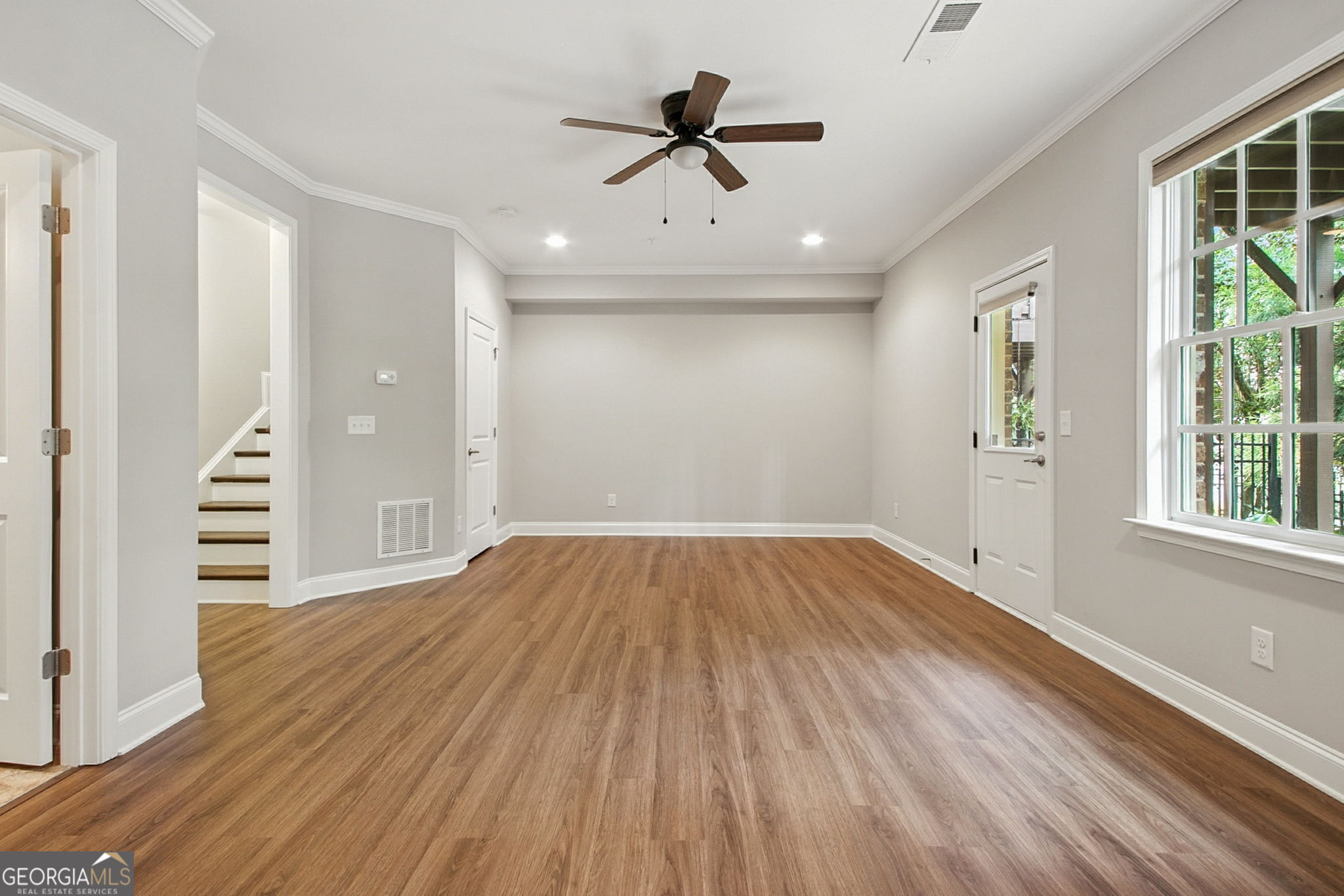 Prime Downtown Alpharetta Location!!! Welcome to 535 Rose Garden Lane in Awesome Alpharetta! Steps away from amazing dining, shopping, the Alpha-Loop Walkway, The Green Downtown Entertaining Area, parks and all of the amazing events this Top Rated city has to offer. This beautiful 4 bedroom, 3 1/2 bath home is located in one of the premier neighborhoods of the downtown district. You'll enjoy plenty of parking with a double garage, double driveway and guest parking. On the main level you'll find a spacious and open entertaining-style living area, dining area and kitchen with a walk-in pantry, soaring ceilings, a fireplace, built-ins and access to your balcony. The spacious primary bedroom is located on the third level with a large walk-in closet and in the primary bathroom you'll find a soaking tub, walk-in shower and a double vanity. Also on this level are 2 comfortably sized guest rooms (one with a walk-in closet), a full bath with a double vanity and a conveniently located laundry room. On the lower level is a large bedroom/den with a full bath and direct access to the cozy and private backyard with fenced room for your fury friends. The wooded lot offers privacy in the rear of the home with no other yard directly behind. New interior paint throughout and 3rd floor hardwood. This beautiful home is located in a very quiet and peaceful section of The Georgian Townhome Community in Alpharetta, consistently ranked as one of the top places in the country to live, work and play. Come see why we call it Awesome Alpharetta!