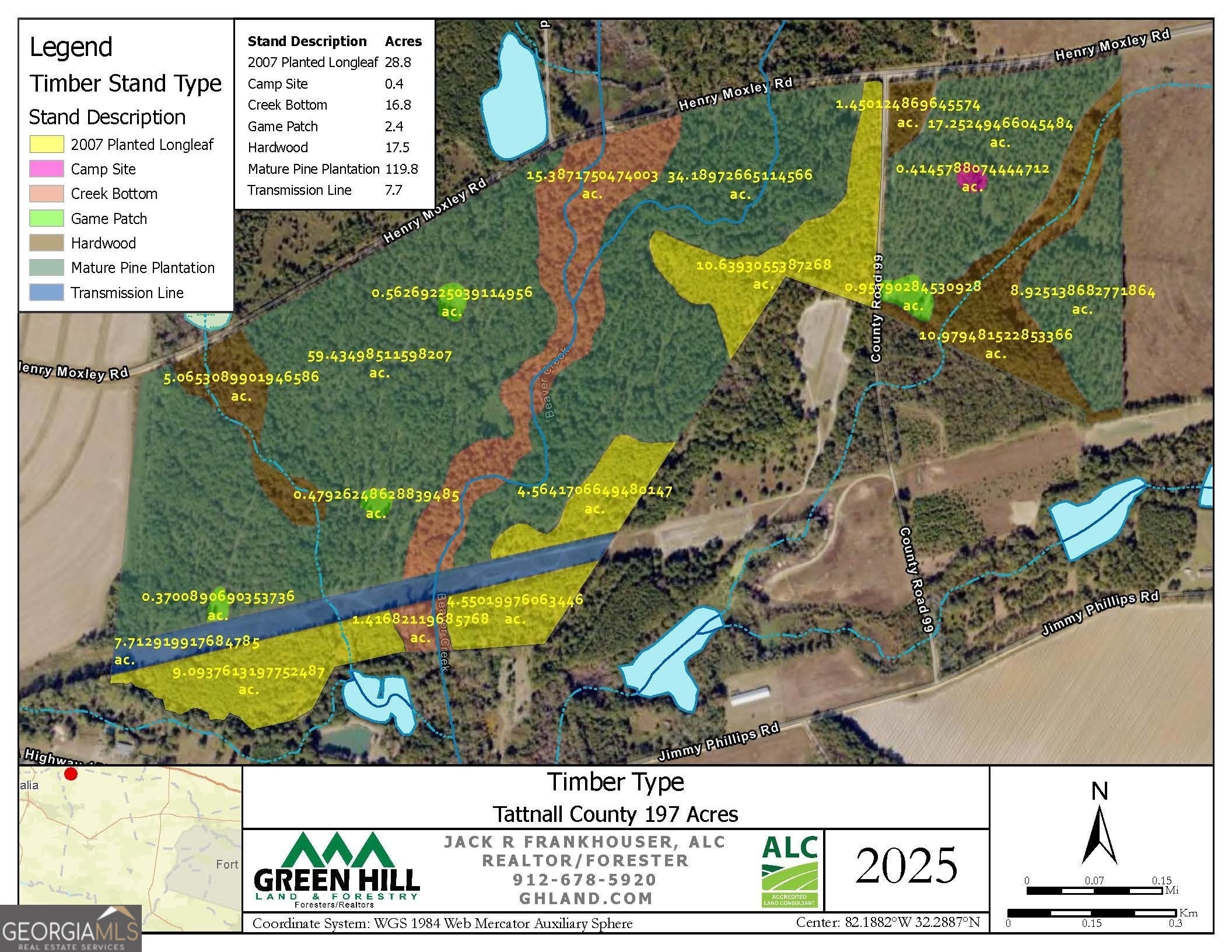 Moxley Farm - 197 Acres | Tattnall County, Georgia Moxley Farm offers 197 acres of prime recreational and timberland in Tattnall County, Georgia. This turn-key property features well-managed pine plantations, diverse hardwood stands, year-round water, and established hunting amenities. For generations, the owners have practiced careful timber management, including thinnings and prescribed burns, resulting in healthy stands and strong investment potential. The property includes 28.8 acres of 2007 planted Longleaf Pine nearing its first thinning, 119.8 acres of mature Loblolly Pine plantation groomed for quality sawtimber, and approximately 34 acres of upland and bottomland hardwoods along Beaver Creek. Beaver Creek, a perennial stream, flows north to south through the tract and is complemented by three seasonal tributaries, providing excellent wildlife habitat and water resources. The property is abundant with deer and turkey, with strategically placed food plots, thinned pines supporting lush understory growth, and an 8-acre transmission line right-of-way offering long-range shooting opportunities. A one-acre campsite is equipped with water and power and is designed for two campers, with room for additional RVs or improvements. Underground power is available along Henry Moxley Road. The gently rolling terrain ranges from 180 feet at the campsite to 160 feet along Beaver Creek, with soils well-suited for continued timber production. The tract offers exceptional access, with 5,200 feet of frontage along Henry Moxley Road, including 1,150 feet paved and the remainder county-maintained dirt road, plus 1,100 feet along County Road 99. There are four gated entrances, providing easy access to all areas of the property. Moxley Farm is located just five minutes from Interstate 16, making it convenient to Statesboro, Macon, Savannah, Atlanta, Jacksonville, and Orlando. This property is ideal for those seeking a productive investment with outstanding recreational opportunities.