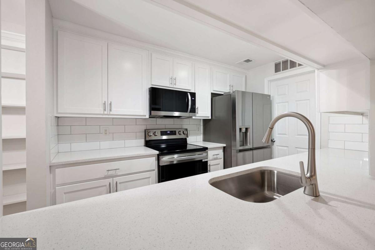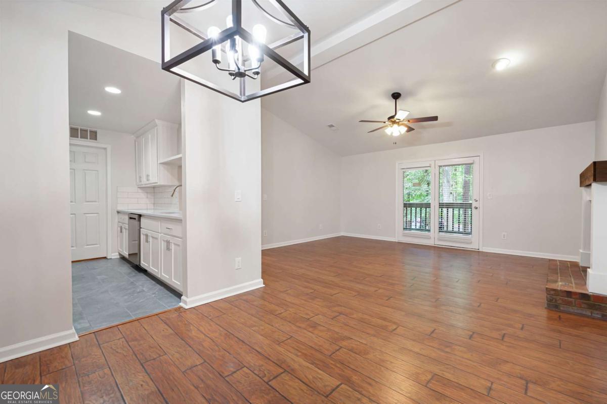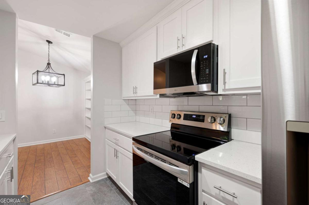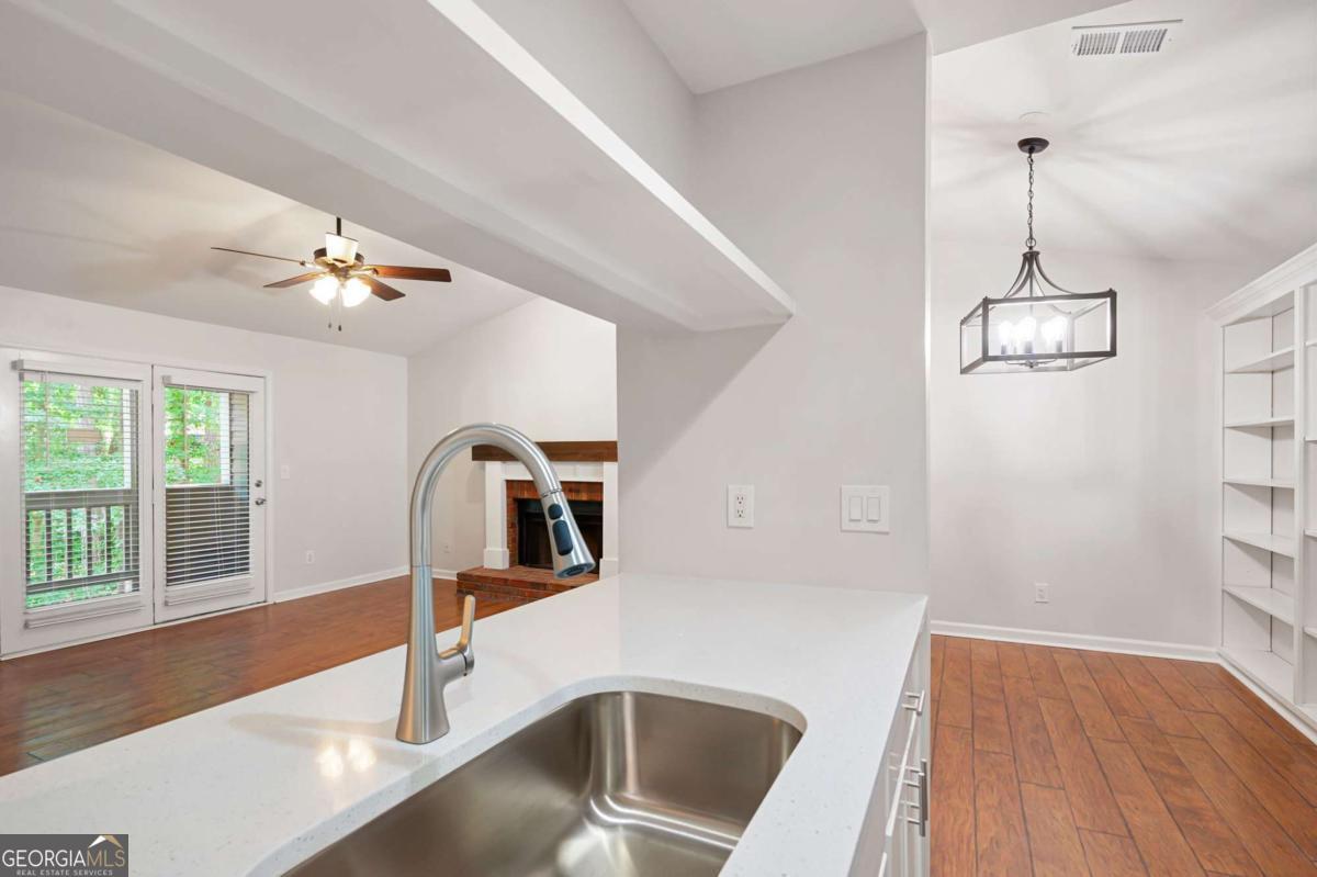 Welcome to this charming condo in the heart of Roswell! This home features 2 full bedrooms, 2 full baths, and a spacious floor plan. Enter in the foyer where you will be greeted with bright neutral paint colors, hardwood floors, and ample natural light. Continue on into the main living quarters where you will find the living room complete with high ceilings and a brick fireplace with wood beam mantle. Continue on into the kitchen where you will enjoy sleek white cabinets, modern black and stainless appliances, a tile backsplash, lots of cabinet & counter space, a pantry, and a view into the family room. The adjoined open concept dining area provides the perfect place for everyday meals or entertaining! Move down the hall to the master bedroom where you will find a spacious room complete with a large walk in closet and en suite bath with updated vanity, fixtures, and a shower/tub combo. The secondary bedroom is also a great size, features a walk in closet with custom shelving and has it's own en suite with shower/tub combo. This charming home also features an in unit laundry room with built in shelving and racks, as well as storage closets for extra space. Enjoy relaxing on the covered balcony or take advantage of the community saltwater pool! This condo offers a convenient parking lot, covered entry, and wooded views all tucked away in a quite community minutes from Downtown Roswell where you can take part in local events & festivals or enjoy the numerous restaurants and shoppes. This property is conveniently located to the Riverwalk Trail system, the Roswell Junction Food Hall, a local amphitheater where you can take in live music, and loads of other parks, shopping, and more. HOA Fees include: maintenance exterior, water, sewer, termite, and trash/recycling! Come take a look and imagine your new home in this vibrant, yet quaint neighborhood.