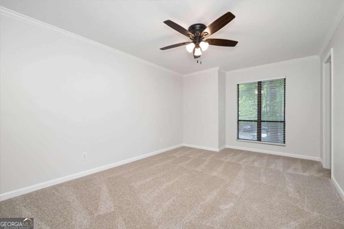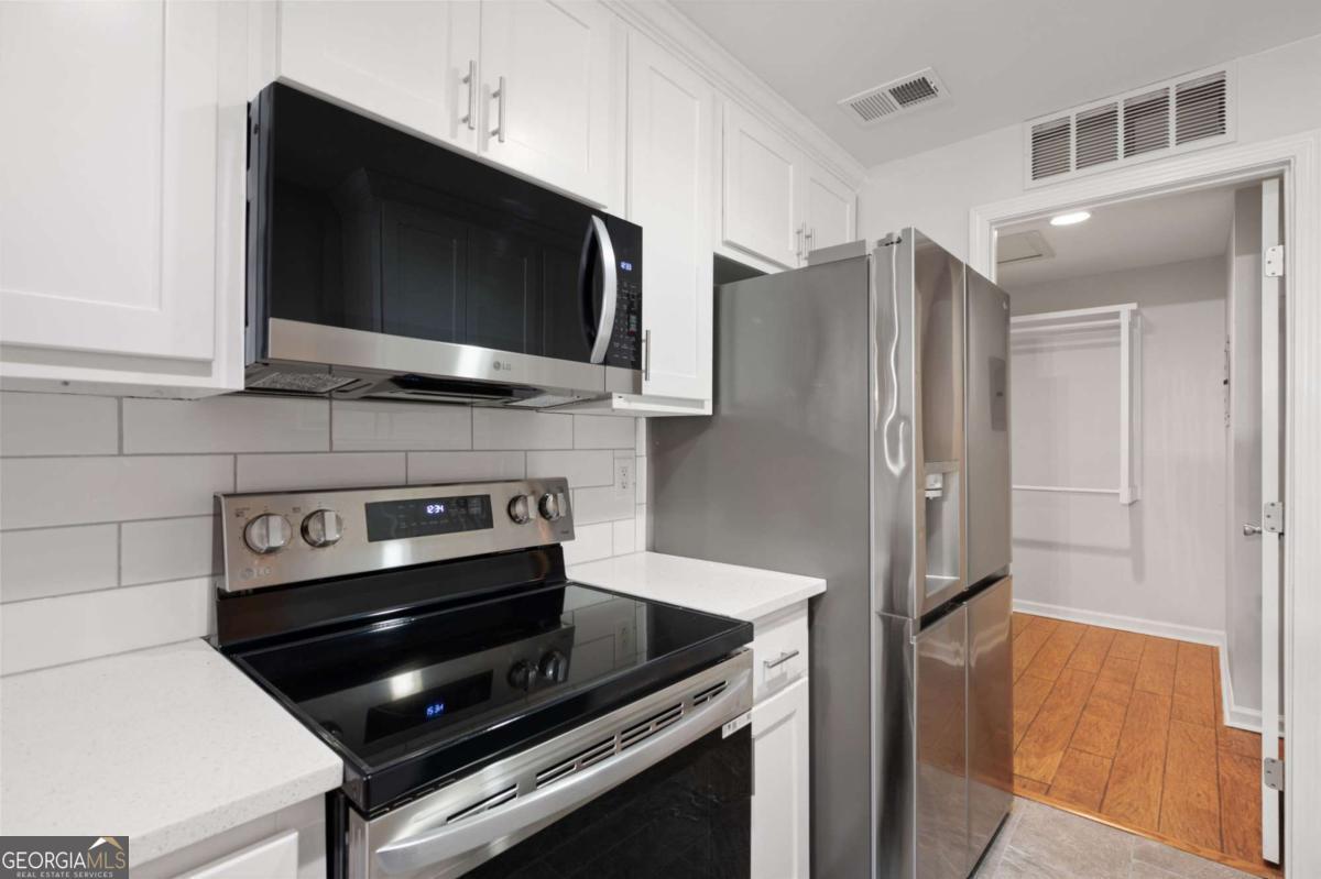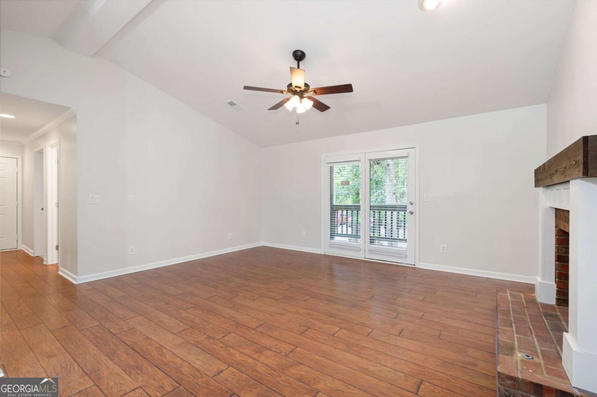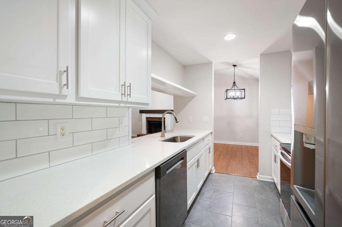 Welcome to this charming condo in the heart of Roswell! This home features 2 full bedrooms, 2 full baths, and a spacious floor plan. Enter in the foyer where you will be greeted with bright neutral paint colors, hardwood floors, and ample natural light. Continue on into the main living quarters where you will find the living room complete with high ceilings and a brick fireplace with wood beam mantle. Continue on into the kitchen where you will enjoy sleek white cabinets, modern black and stainless appliances, a tile backsplash, lots of cabinet & counter space, a pantry, and a view into the family room. The adjoined open concept dining area provides the perfect place for everyday meals or entertaining! Move down the hall to the master bedroom where you will find a spacious room complete with a large walk in closet and en suite bath with updated vanity, fixtures, and a shower/tub combo. The secondary bedroom is also a great size, features a walk in closet with custom shelving and has it's own en suite with shower/tub combo. This charming home also features an in unit laundry room with built in shelving and racks, as well as storage closets for extra space. Enjoy relaxing on the covered balcony or take advantage of the community saltwater pool! This condo offers a convenient parking lot, covered entry, and wooded views all tucked away in a quite community minutes from Downtown Roswell where you can take part in local events & festivals or enjoy the numerous restaurants and shoppes. This property is conveniently located to the Riverwalk Trail system, the Roswell Junction Food Hall, a local amphitheater where you can take in live music, and loads of other parks, shopping, and more. HOA Fees include: maintenance exterior, water, sewer, termite, and trash/recycling! Come take a look and imagine your new home in this vibrant, yet quaint neighborhood.