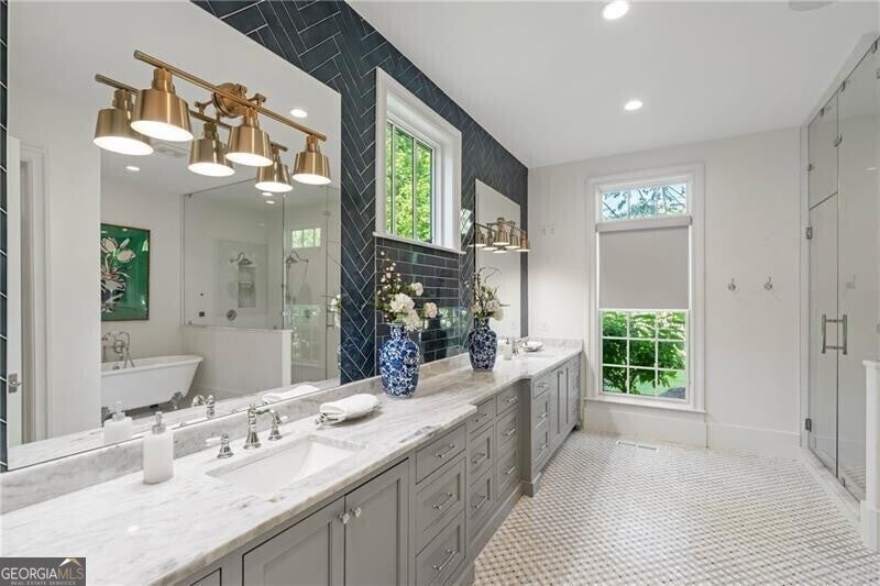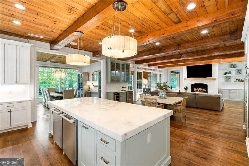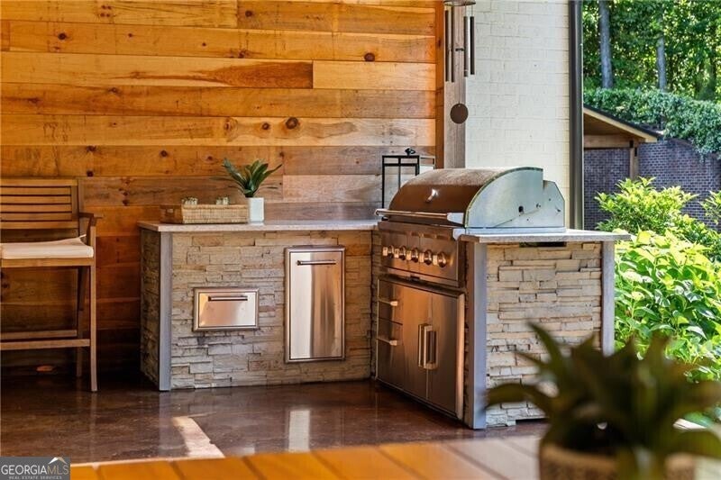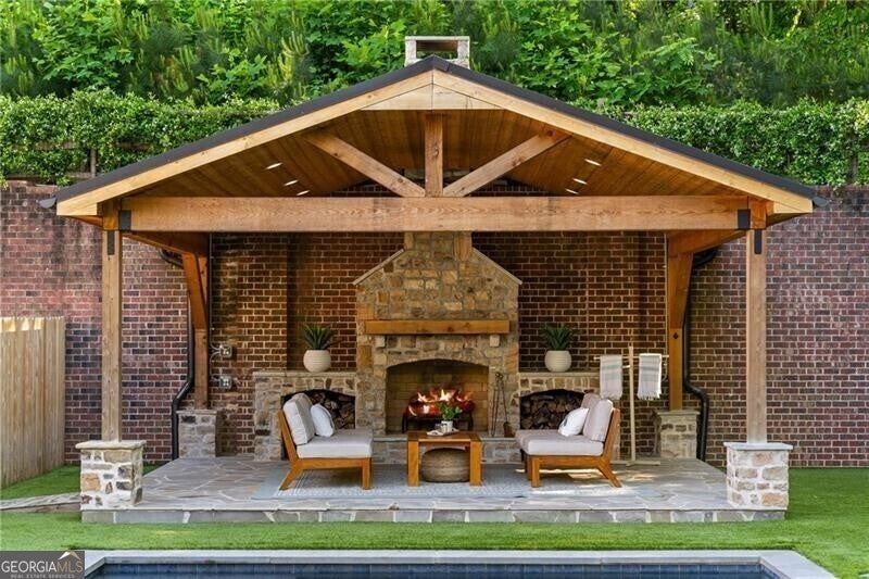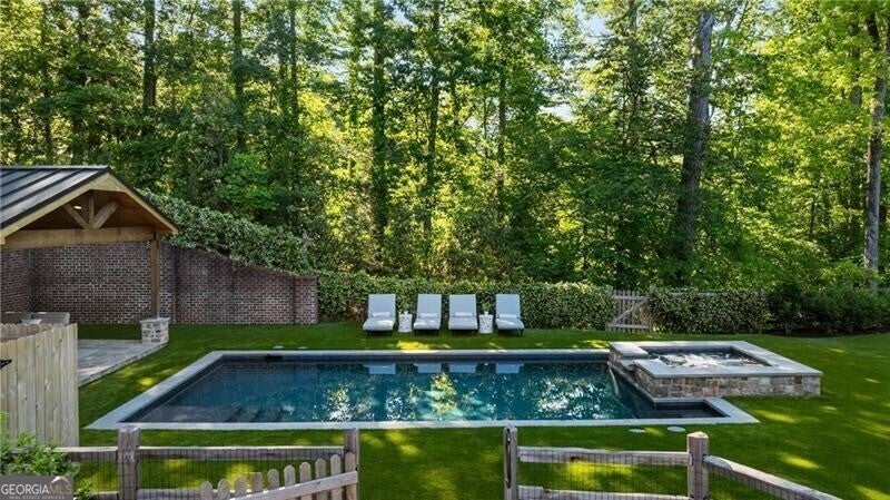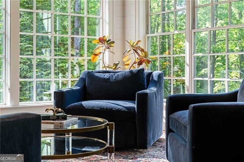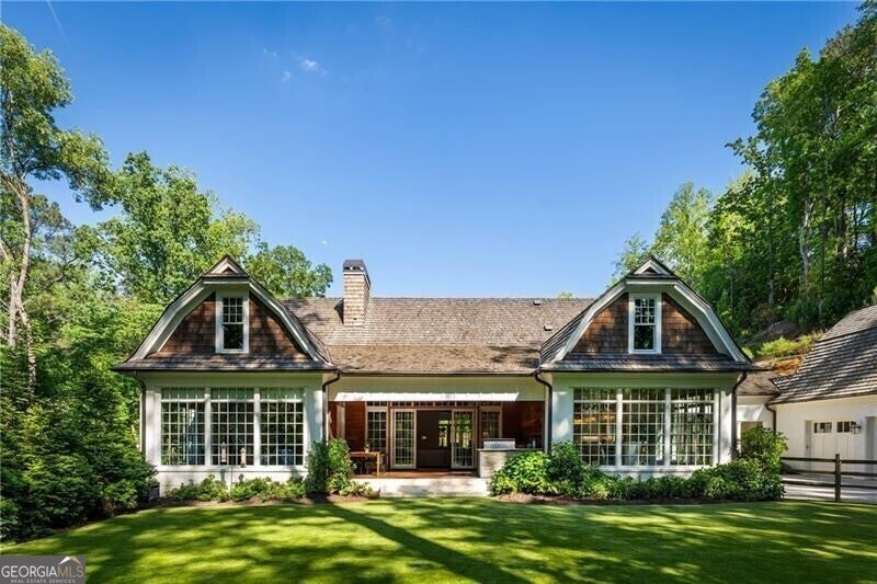 Set within a gated enclave of four custom residences, this newer New England coastal-style home offers rare privacy and luxury in the heart of Sandy Springs, just minutes to Chastain Park, City Springs, and top-rated schools. Tucked 600 feet off the road on over three wooded acres, the home features light-filled living spaces with hand-hewn beams, pine ceilings, and wide-plank hickory floors. The open floor plan is designed for modern living and entertaining, anchored by a chef's kitchen with a Wolf six-burner range, Sub-Zero refrigeration, double ovens, dual dishwashers, two farm sinks, an ice maker, and two walk-in pantries. Sliding doors open from the main-level walk-out to a covered patio with outdoor kitchen, pavilion with wood-burning fireplace, and a heated saltwater pool and spa, creating a seamless indoor-outdoor lifestyle. The main-level primary suite includes a spa bath with steam shower, soaking tub, dual vanities, and a custom closet with center island, plus an adjoining office or sitting room with pocket doors. Upstairs, three ensuite bedrooms surround a central loft ideal for homework, gaming, or lounging. The finished terrace level is built for entertaining with a full bar, glass-enclosed 1,000-bottle wine room, recreation area with three TVs for sports viewing, a home gym, and two ensuite bedrooms perfect for guests, in-laws, or an au pair. Additional highlights include a three-car garage with expandable space above (guest or carriage suite potential), a laundry room with dog wash and dual washer/dryer sets, gas lanterns, shake roof, and layered shiplap and marble finishes. A wall of windows along the rear fills the main level with natural light and wooded views year-round. Located in the sought-after Heards Ferry Elementary and Riverwood International Charter High School district and minutes from Holy Innocents' Episcopal School, this is an ideal location for families wanting proximity to premier public and private schools.