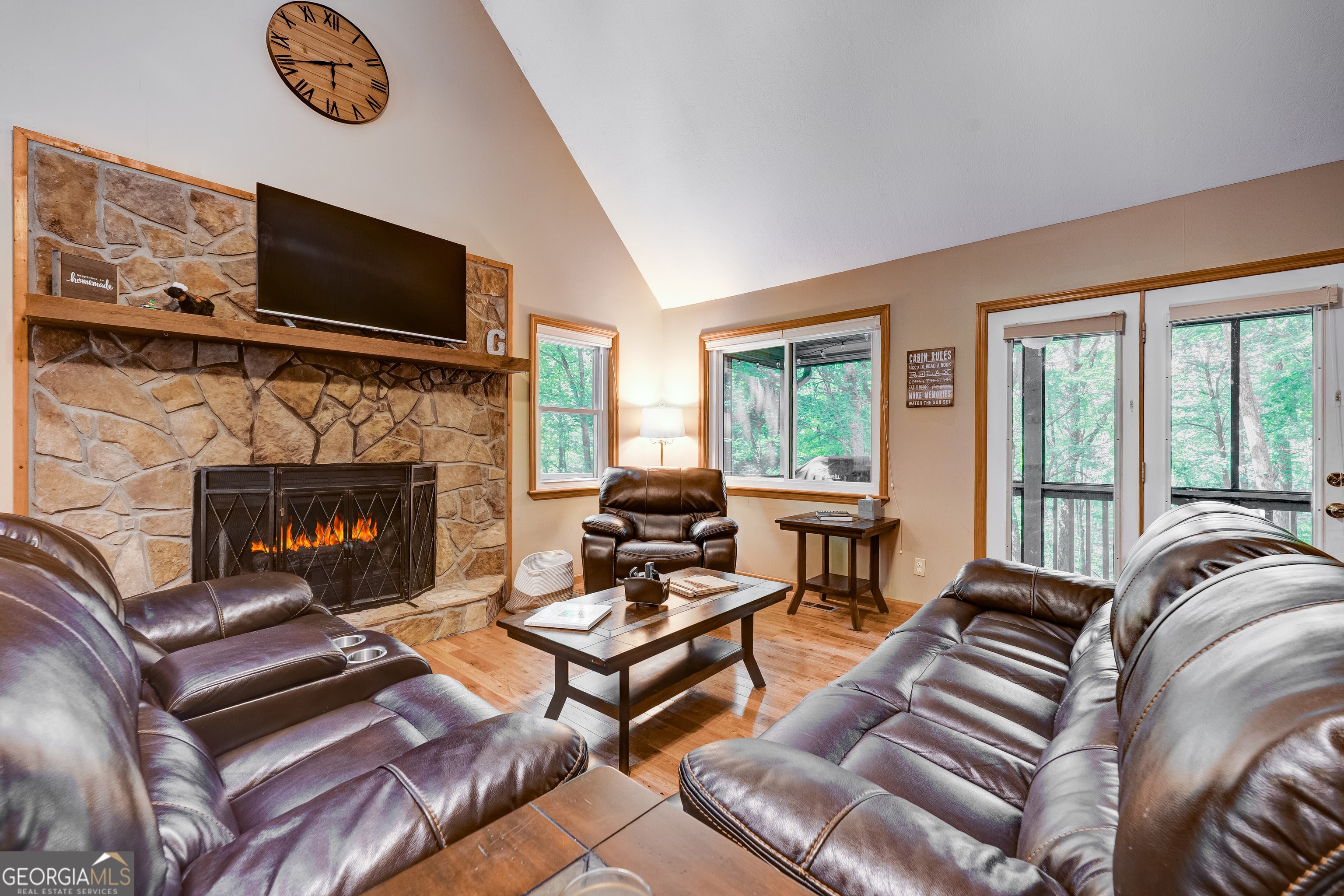 Welcome to 708 Wilson Mountain, Blairsville - Your Serene Mountain Retreat! Tucked into a quiet, leafy enclave of elegant mountain homes, this beautifully remodeled cabin offers both privacy and community charm. Upgrades include premium vinyl siding, a durable metal roof, and stunning hardwood flooring in the expansive great room, highlighted by cathedral ceilings and a welcoming stone fireplace with gas logs-ideal for cozy evenings with loved ones. The bright, open layout features a generous dining area and living space, perfect for hosting friends and family. Both bathrooms have been tastefully updated with new tile floors and walls, complemented by stylish vanities. The spacious master suite shines with its own hardwood floors, roomy walk-in closet, and private bathroom retreat. Step outside to the inviting covered screened porch-picture sipping your morning coffee here as you admire filtered mountain views with just a bit of tree trimming. The finished walk-out basement adds valuable living space, featuring a full bedroom with tile flooring, a versatile family/den room also with tile, and a large mechanical/laundry/workshop area. With a practical layout, this home blends enduring quality with laid-back mountain living. 708 Wilson Mountain is the perfect blend of seclusion, thoughtful upgrades, and turn-key mountain comfort-ready to welcome you home!