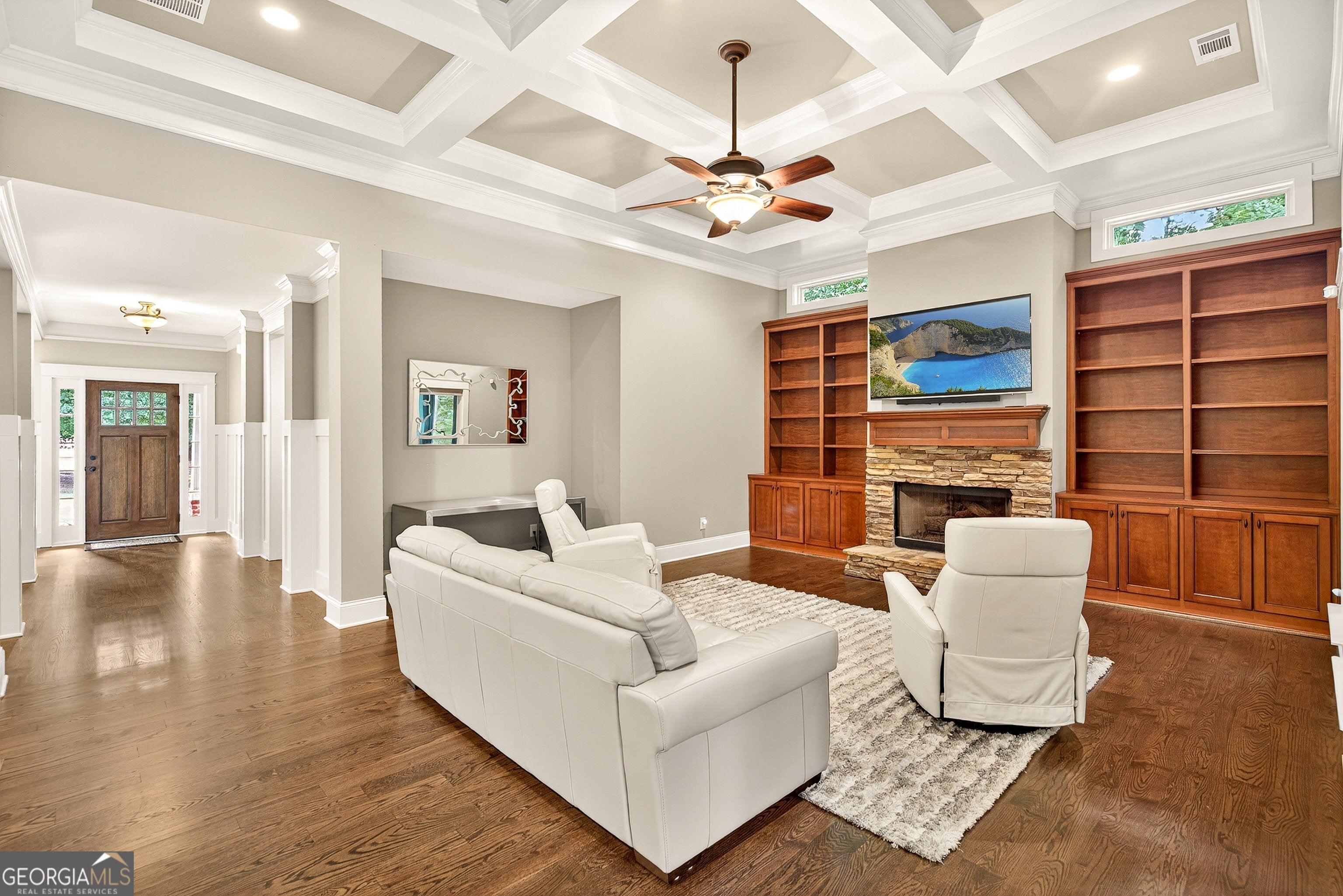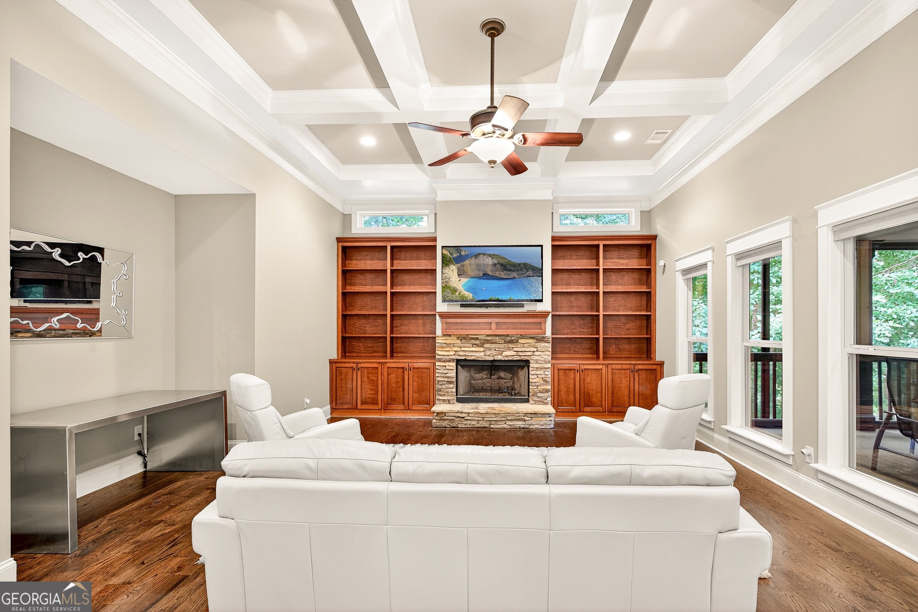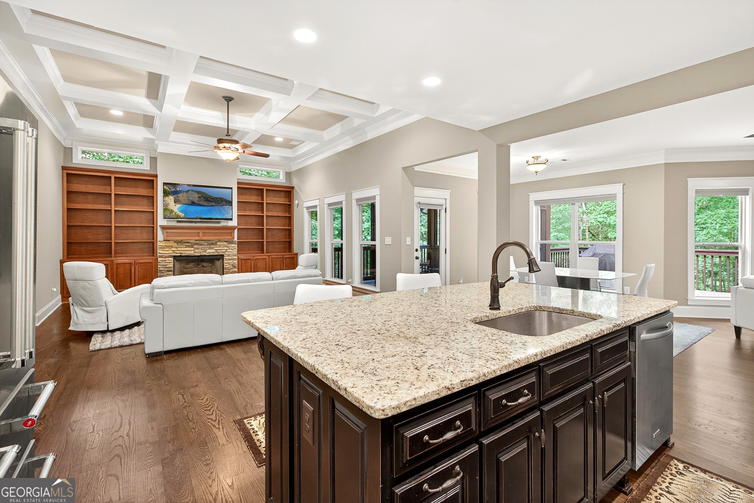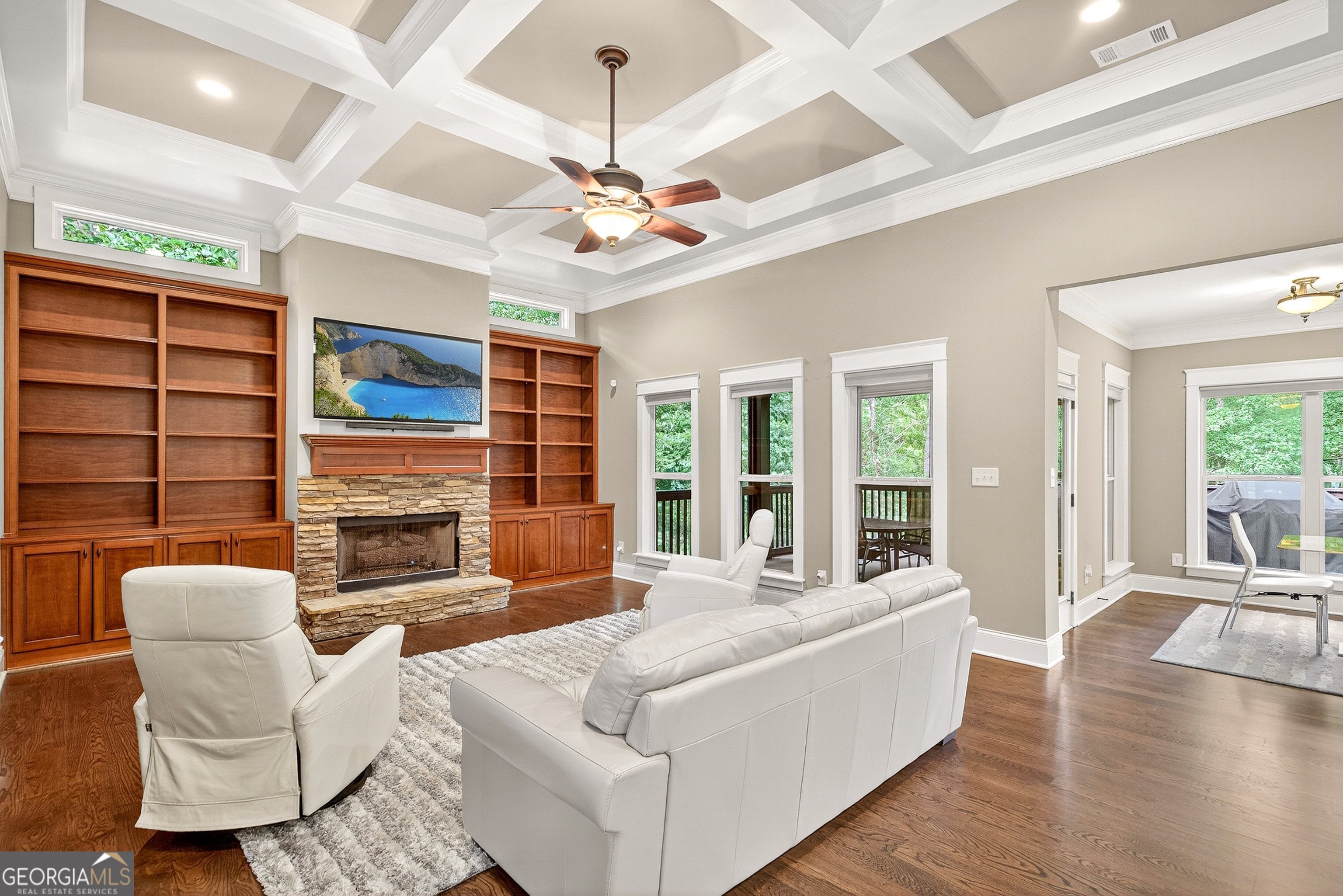Welcome to this exceptional 5-bedroom, 5-bath home perfectly positioned on the lake in the desirable Arbor Springs community. The main level offers a stunning open-concept living room and kitchen, accented by a coffered ceilings and custom built-in shelving in both the living and sitting areas. The gourmet kitchen is a chef's dream with stainless steel appliances, a gas cooktop, a large island, and a spacious walk-in pantry. An additional sitting area off the kitchen provides the perfect spot for casual conversations, while the large dining room is ideal for hosting gatherings. The owner's suite is a true retreat, featuring a tray ceiling with intricate inlaid wood, abundant windows overlooking the lake, and a spa-inspired ensuite. The bathroom boasts dual vanities, a large soaking tub, and an oversized shower with dual shower heads. The expansive walk-in closet includes built-in shelving for optimal organization. A second bedroom and full bath on the main level offer comfort and convenience, along with a screened-in porch where you can relax and enjoy the serene views. Upstairs, you'll find two generously sized bedrooms, each with its own private bath, plus a large bonus room perfect for a media space, office, or playroom. The finished basement expands your living options with a kitchenette, living room, bedroom, full bath, and a versatile flex space that can be used as a gym, hobby room, or additional lounge area. Step outside to the covered lower-level patio, gather around the firepit, or follow the gentle path down to the lake for fishing, kayaking, or simply soaking in the tranquil scenery. Offering a perfect blend of elegance, comfort, and outdoor living, this home delivers the ultimate lakeside lifestyle in one of Newnan's most sought-after neighborhoods just minutes from I-85, 15 minutes to Hartsfield-Jackson International Airport and 20 minutes into Atlanta.