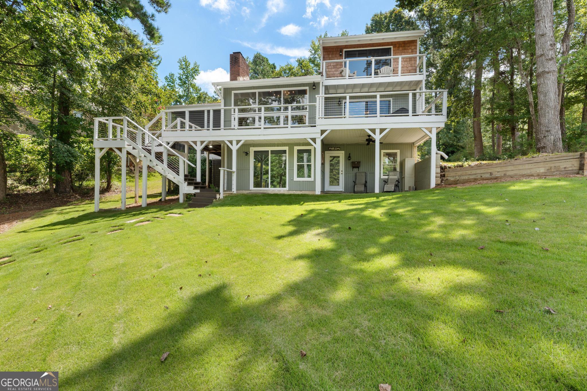 THIS IS THE PERFECT LAKE HOUSE! This deeded lot is located in a quiet cove right off the "big water" on Jackson Lake. Lakefront living at its finest! This home is located in the fun and exciting neighborhood of Turtle Cove. By living in this community, you have access to amenities such as a pool, boat ramps, beaches, pickleball, restaurant, golf and much more. This stunning Jackson Lake home blends comfort, style, and endless recreation. With 4 spacious bedrooms and 3 full baths, there's room for everyone to relax and recharge. Enjoy two cozy fireplaces, perfect for gathering on cool evenings. A warm and modern feel is provided by this home's granite countertops, wooden flooring and tile. This home also has a screened porch, plus expansive deck for year-round indoor-outdoor living. Plenty of storage space inside the house and under the screened in porch, including a 2 car garage that has a charger installed for any EV. Step outside onto a GA Power approved and fixed dock right on the water that has extended space for big groups. This dock is perfect for swimming, fishing, or parking your boat after a day of adventure. Pull your boat right in to a covered and protected space that includes a fully functioning boat lift. This location provides perfect views to full sunsets throughout the year. Professionally designed backyard with beautiful Zoysia sod and large stepping stones as a path from home to lake. Zoysia sod is nurtured by a pump that sources the water from the lake. Over 500 feet of concrete retaining wall for added beauty and protection of the yard. Additional space in the front yard for a boat, trailer, or RV parking. Whether you're entertaining friends, hosting family getaways, or savoring quiet mornings with a view, this home delivers the best of lake life-privacy, convenience, and unforgettable memories waiting to be made.