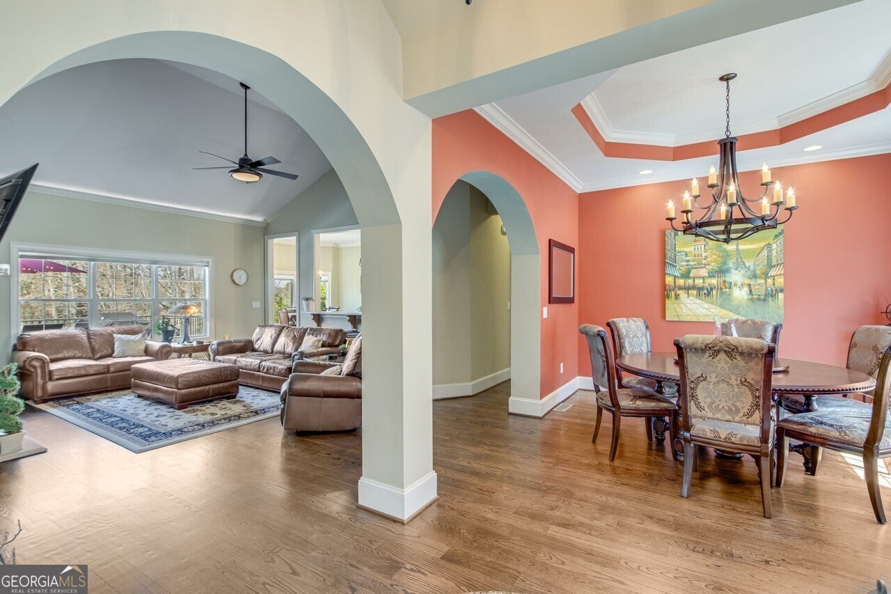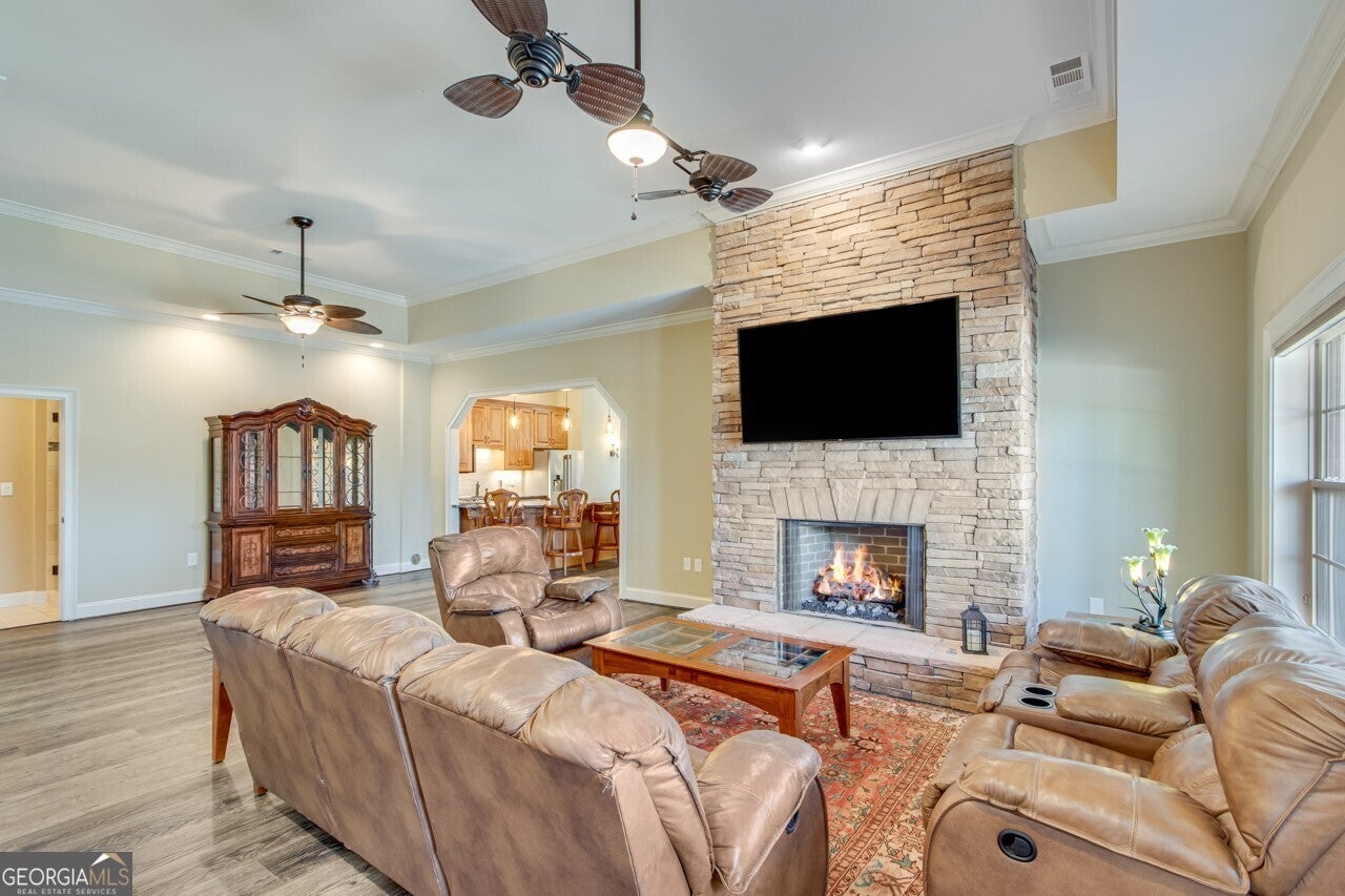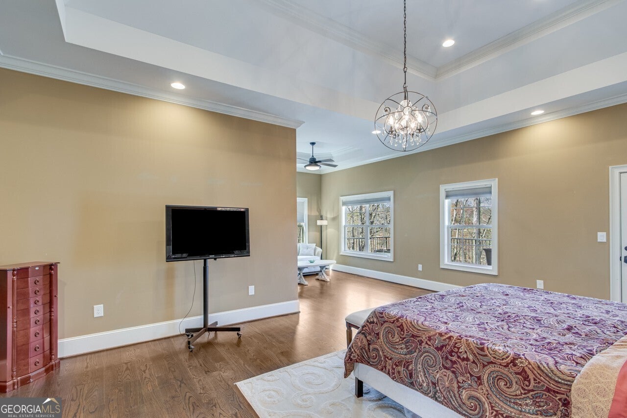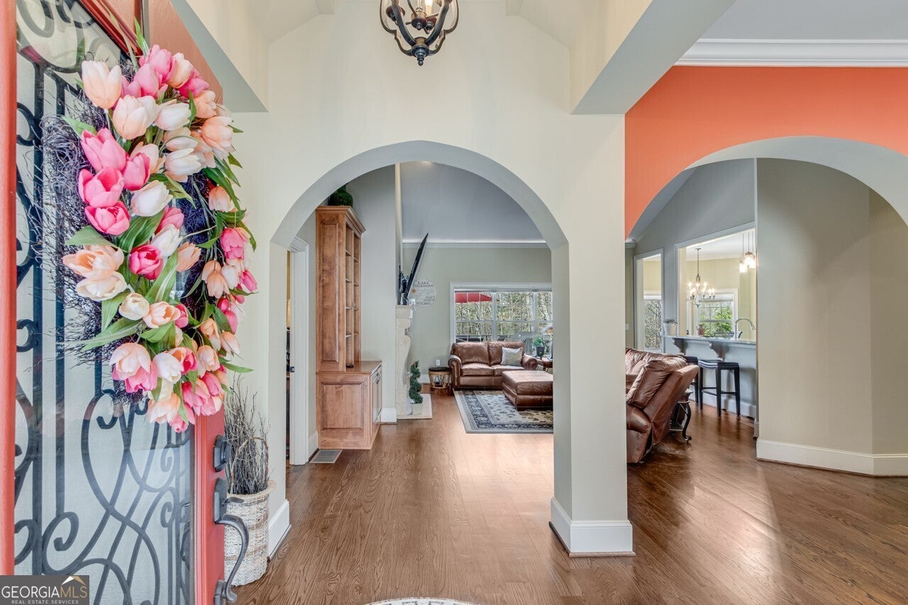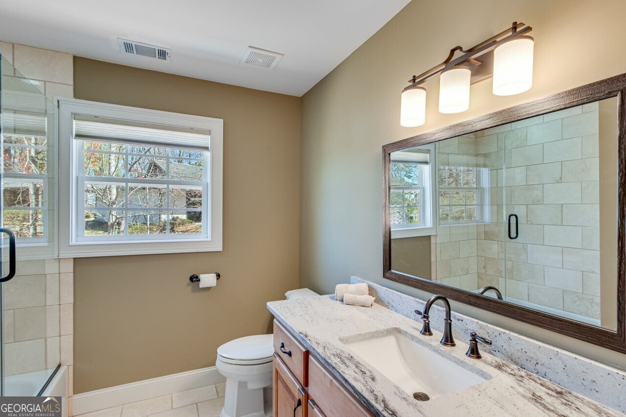 This elegant, traditional Lake Lanier home has everything you need for fine lake living! Conveniently located just 10 minutes from downtown Gainesville, The Rowing Venue, the hospital district, shopping, and restaurants, this home is designed for the ultimate lakefront lifestyle. With stunning lake views from most rooms, it also features a paved path leading to a single-slip party dock in deep, calm, no-wake waters-perfect for lounging and swimming. Situated on a double lot with a low CORPS line, the property offers a circular driveway and abundant parking, along with a drive-around access to the lower-level double garage-ideal for a golf cart, boat toys, a workshop, and extra storage. Inside, the main floor boasts an open layout with all hardwood floors. The great room, featuring a striking stone wood-burning fireplace, flows seamlessly into the kitchen, which includes granite countertops, a double gas range, and high-end Thermador appliances. A dining room and a study/office complete this space. The oversized primary suite is a true retreat, featuring a sitting area, double custom closets (one with a double-stack washer/dryer), heated travertine tile floors, a jacuzzi tub, a spacious shower, and double granite vanities. Additionally, the main level includes a second ensuite bedroom, a powder room, and a large laundry room. Upstairs, you'll find a guest bedroom, a full bath, and a large bonus room over the garage. The beautifully finished terrace level, completed in 2015, offers luxury vinyl flooring, a family room with a second stone wood-burning fireplace, a full kitchen with all appliances, a dining area, a large game room, a full guest bath, and an ensuite with its own private bath-perfect for entertaining or multi-generational living. Every bathroom is equipped with heated travertine tile floors, and the home features only hardwood and luxury vinyl flooring-no carpet. This exceptional Lake Lanier property combines elegance, functionality, and the best in lakeside living!